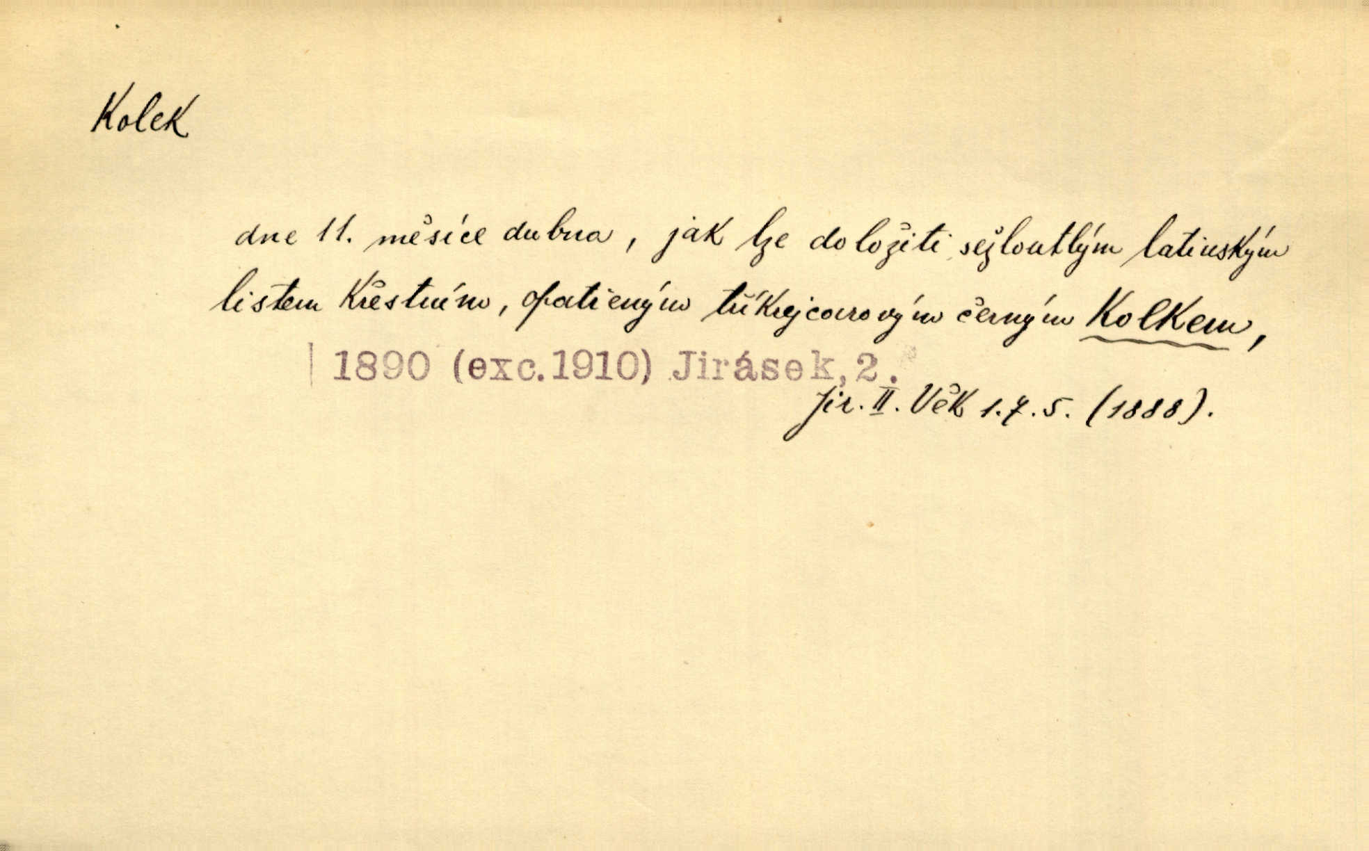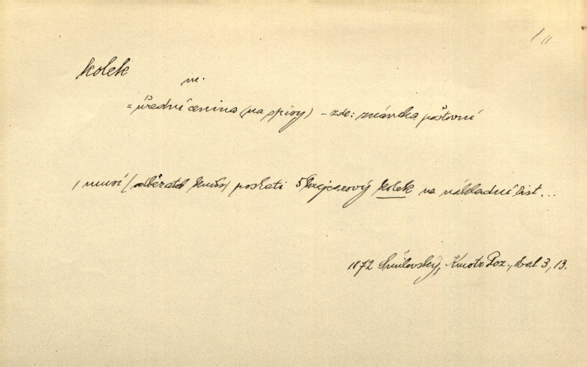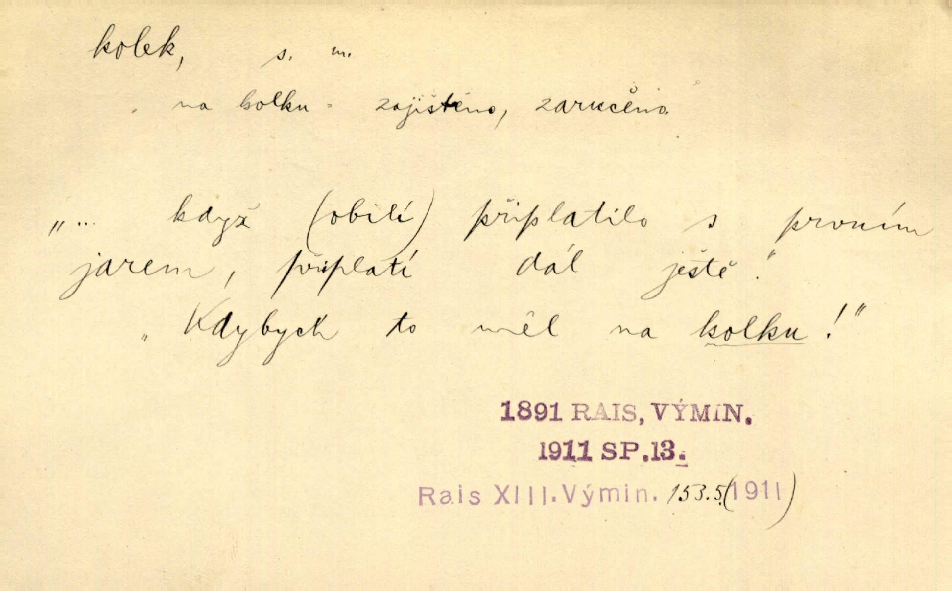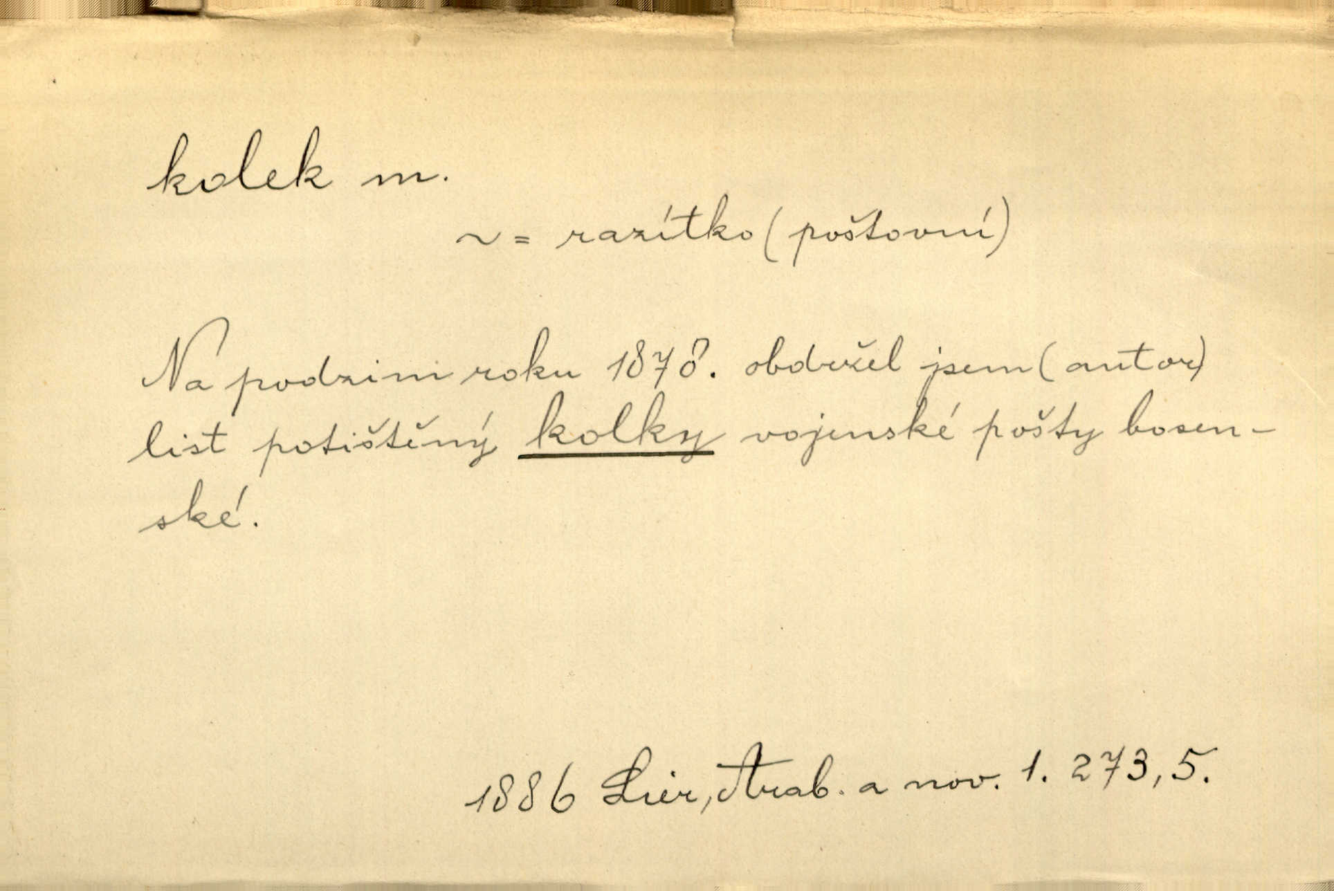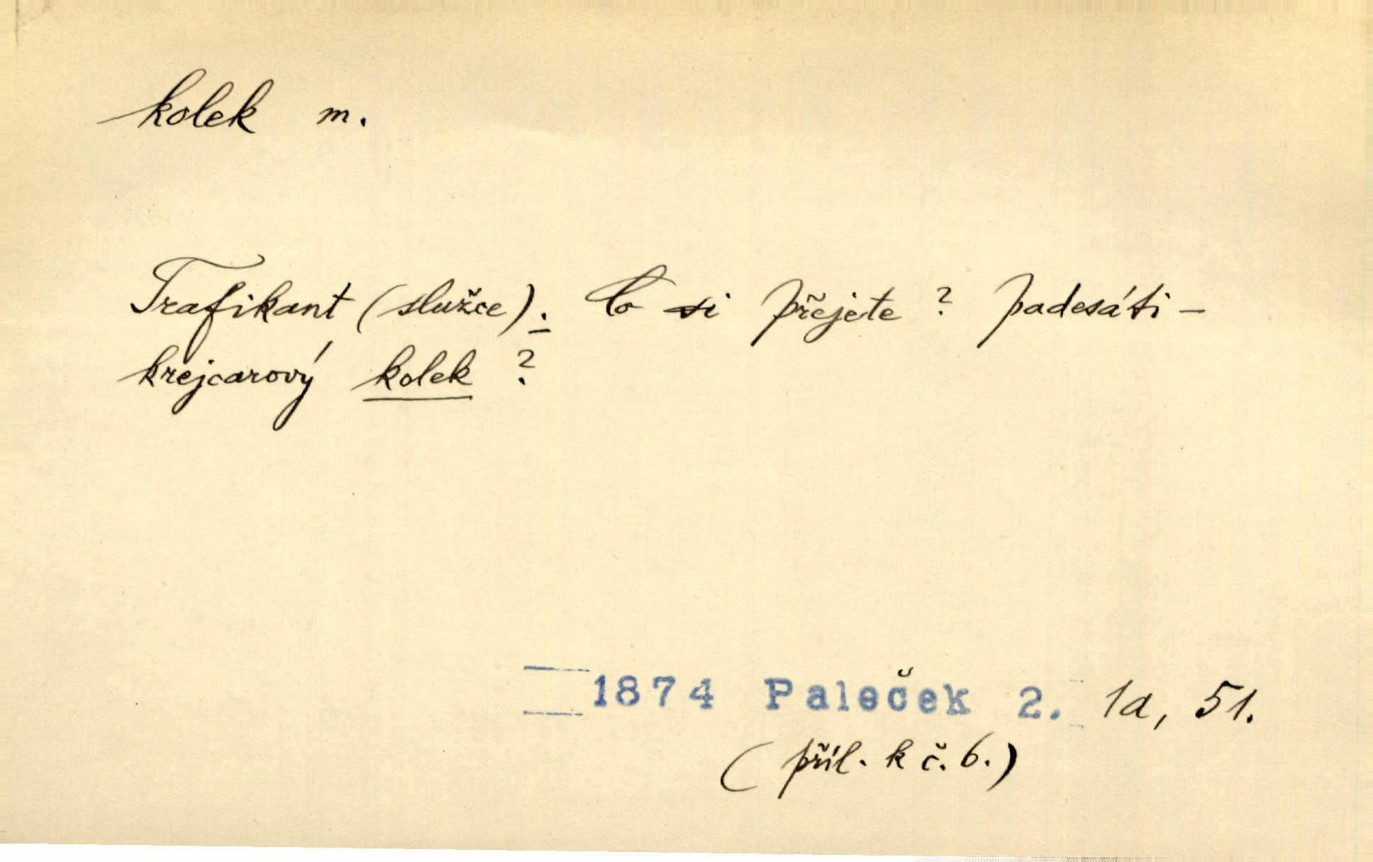 - kolek, -lku m. 1. nalepená známka nebo razítko potvrzující zaplacení poplatku z listiny. Prodej kolků a známek. Nabídl se [pokoutník]‚ že vymůže Bochovi právo chudých; pak že se bude moci soudit bez kolků a poplatků. Staš. Dal jsem mu list křestní, snubní a úmrtní s podpisy na všem a kolky. Mach. Popřával si denně nejlacinějších novin, krejcarových, bez kolku. Herrm. Pan doktor mi řek’, že mi to dá na kolku, že mi nic není! napíše na kolkovanou listinu. Svob. Podání kolku podrobené. D Zříd. razítko vůbec. Přečetl si na pásce [novin] svou adresu, vystřihl z ní známku s kolkem „Praha“. Lier. D Archeol. hřebenový kolek nástroj s vyřezávanými zoubky k otiskování na neolitickou keramiku, t. zv. hřebenovou.