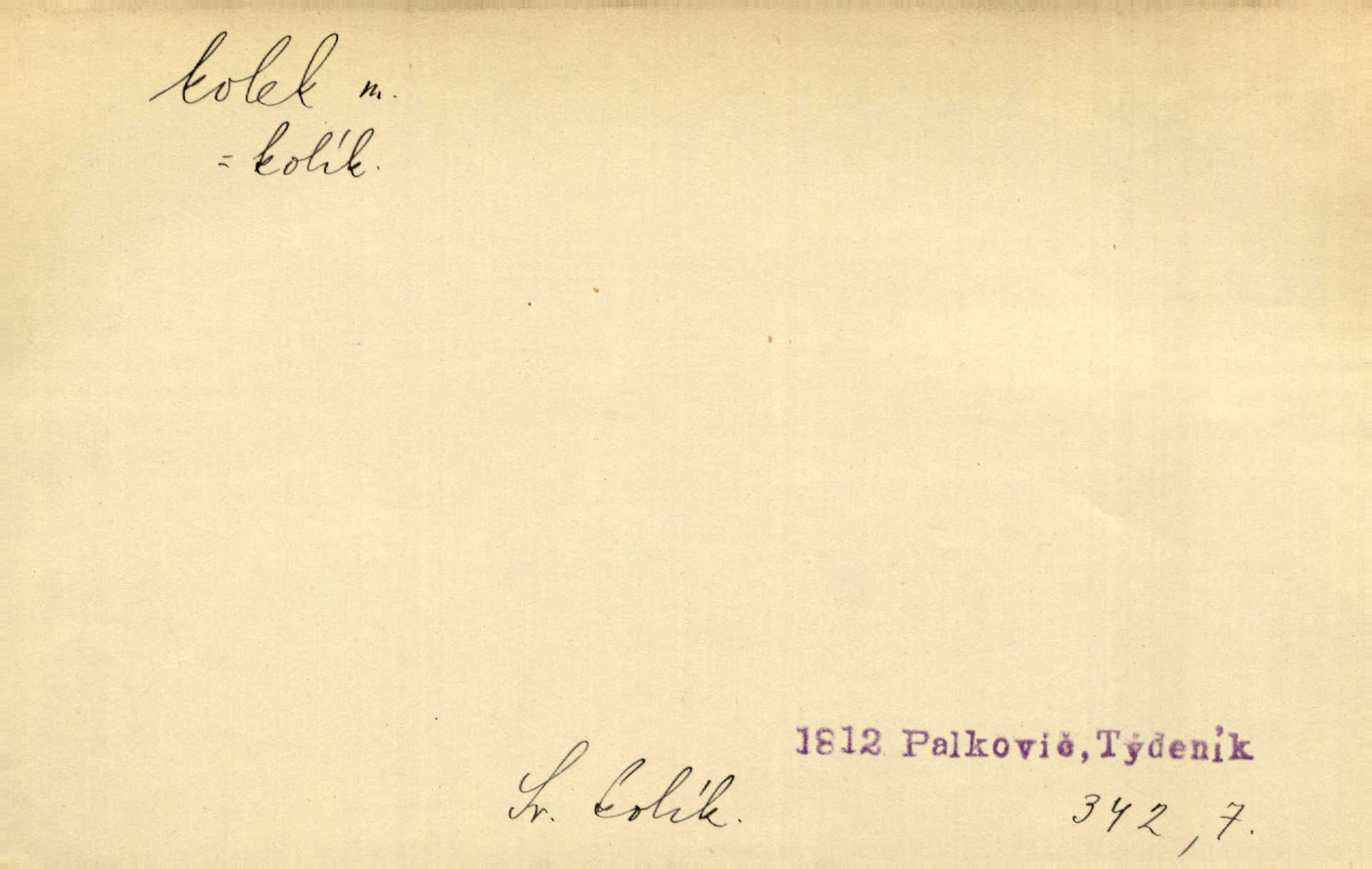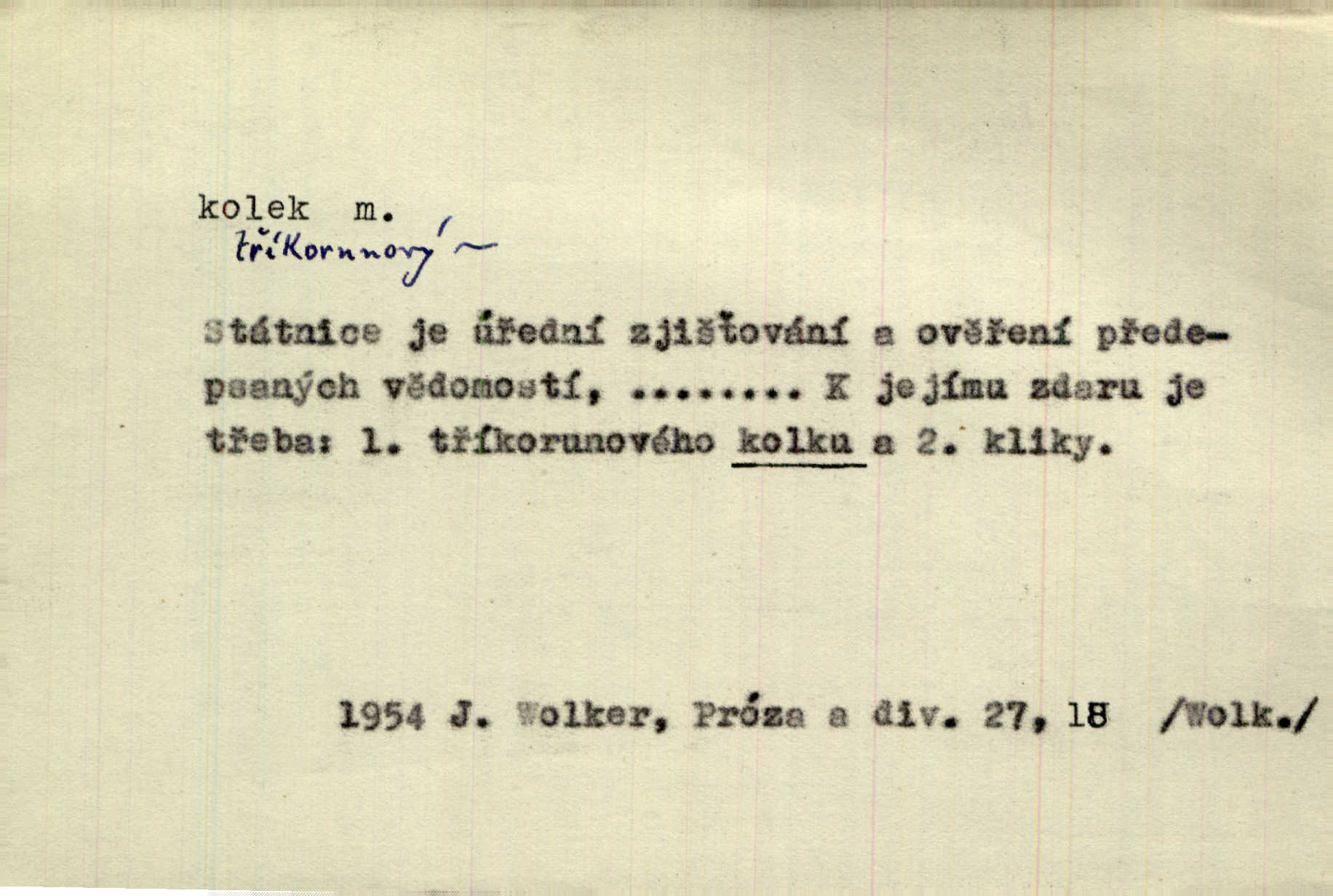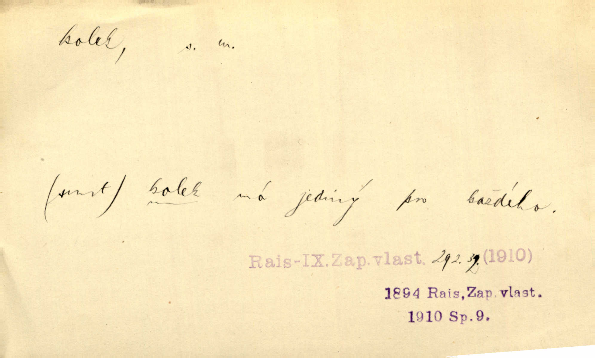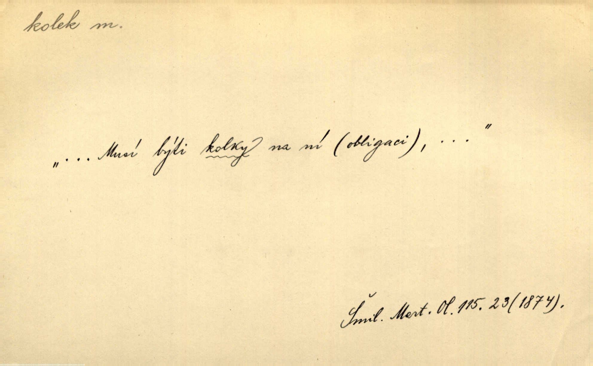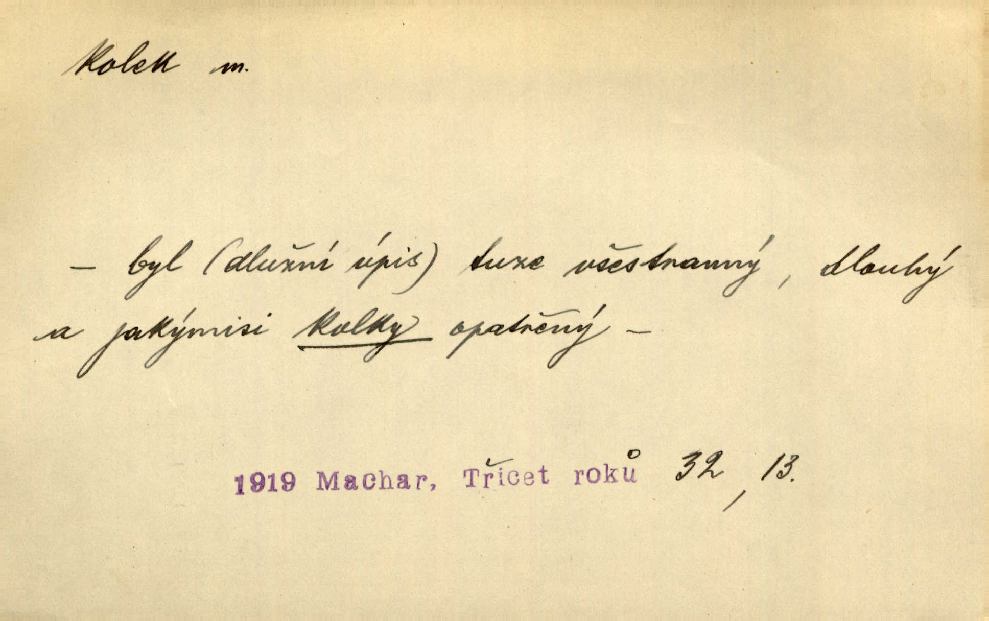 - kolek, -lku m. 1. nalepená známka nebo razítko potvrzující zaplacení poplatku z listiny. Prodej kolků a známek. Nabídl se [pokoutník]‚ že vymůže Bochovi právo chudých; pak že se bude moci soudit bez kolků a poplatků. Staš. Dal jsem mu list křestní, snubní a úmrtní s podpisy na všem a kolky. Mach. Popřával si denně nejlacinějších novin, krejcarových, bez kolku. Herrm. Pan doktor mi řek’, že mi to dá na kolku, že mi nic není! napíše na kolkovanou listinu. Svob. Podání kolku podrobené. D Zříd. razítko vůbec. Přečetl si na pásce [novin] svou adresu, vystřihl z ní známku s kolkem „Praha“. Lier. D Archeol. hřebenový kolek nástroj s vyřezávanými zoubky k otiskování na neolitickou keramiku, t. zv. hřebenovou.