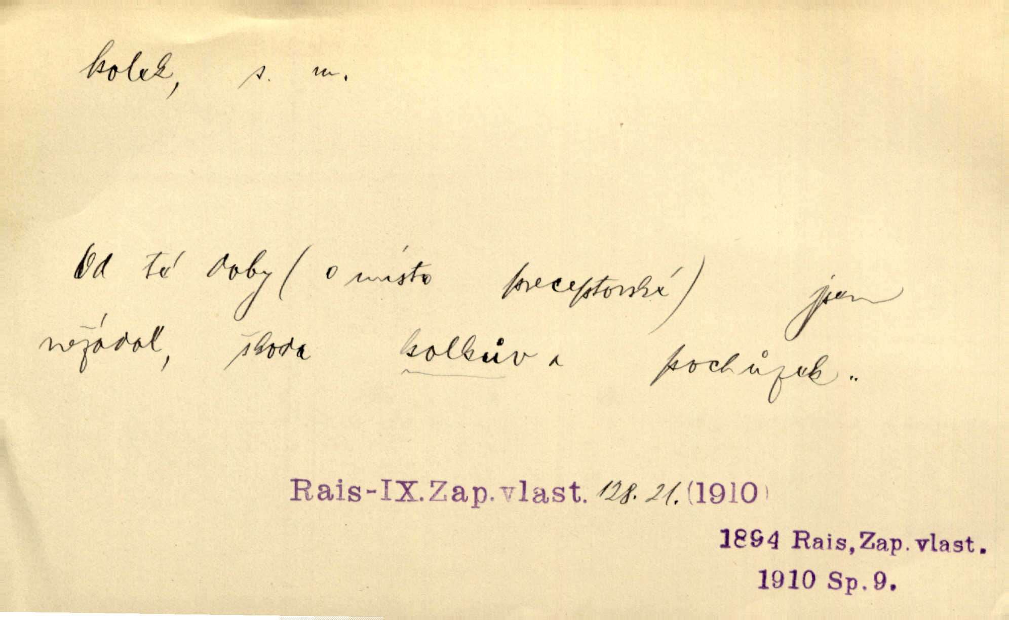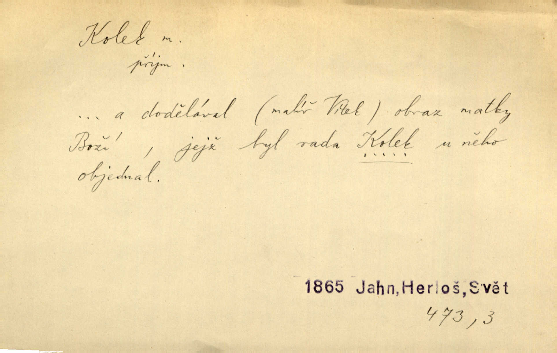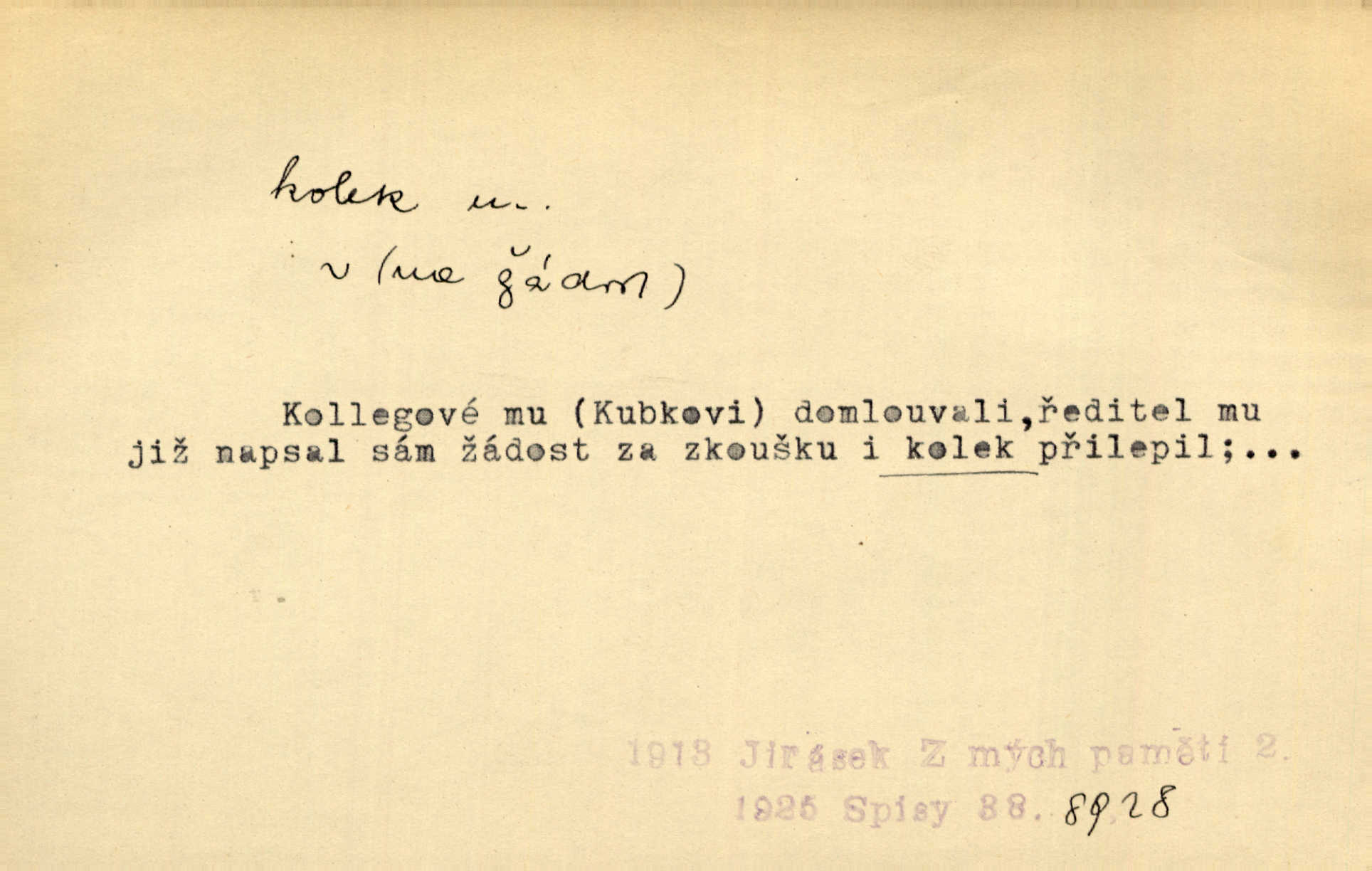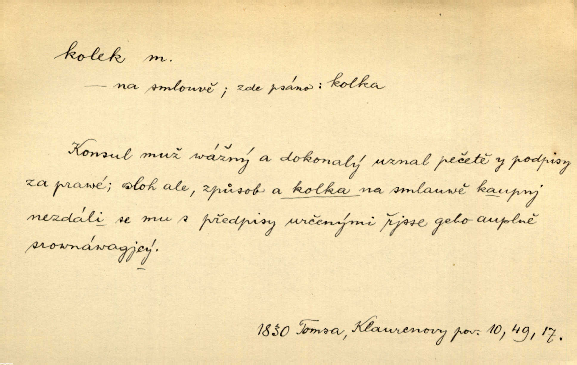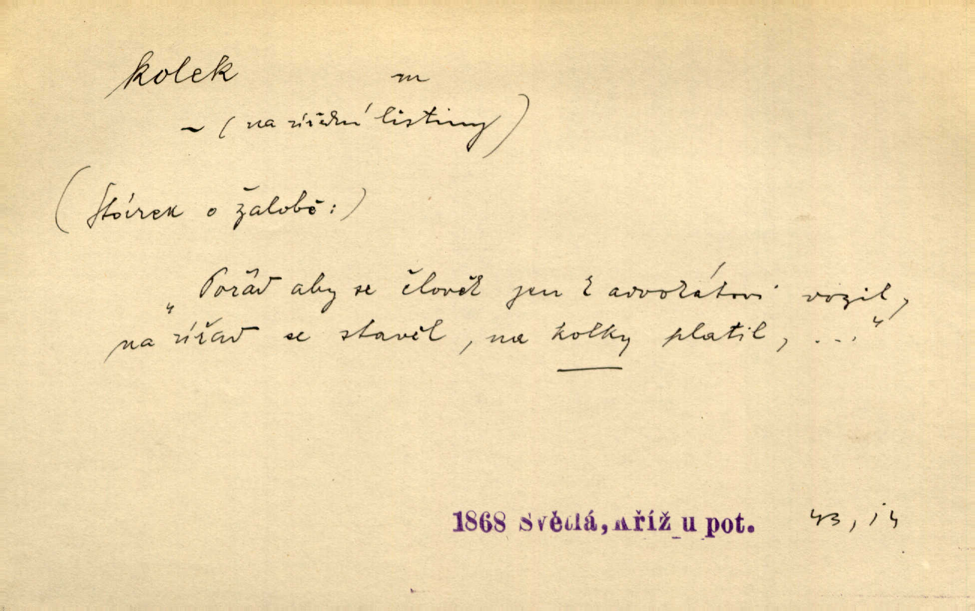 - kolek, -lku m. 1. nalepená známka nebo razítko potvrzující zaplacení poplatku z listiny. Prodej kolků a známek. Nabídl se [pokoutník]‚ že vymůže Bochovi právo chudých; pak že se bude moci soudit bez kolků a poplatků. Staš. Dal jsem mu list křestní, snubní a úmrtní s podpisy na všem a kolky. Mach. Popřával si denně nejlacinějších novin, krejcarových, bez kolku. Herrm. Pan doktor mi řek’, že mi to dá na kolku, že mi nic není! napíše na kolkovanou listinu. Svob. Podání kolku podrobené. D Zříd. razítko vůbec. Přečetl si na pásce [novin] svou adresu, vystřihl z ní známku s kolkem „Praha“. Lier. D Archeol. hřebenový kolek nástroj s vyřezávanými zoubky k otiskování na neolitickou keramiku, t. zv. hřebenovou.