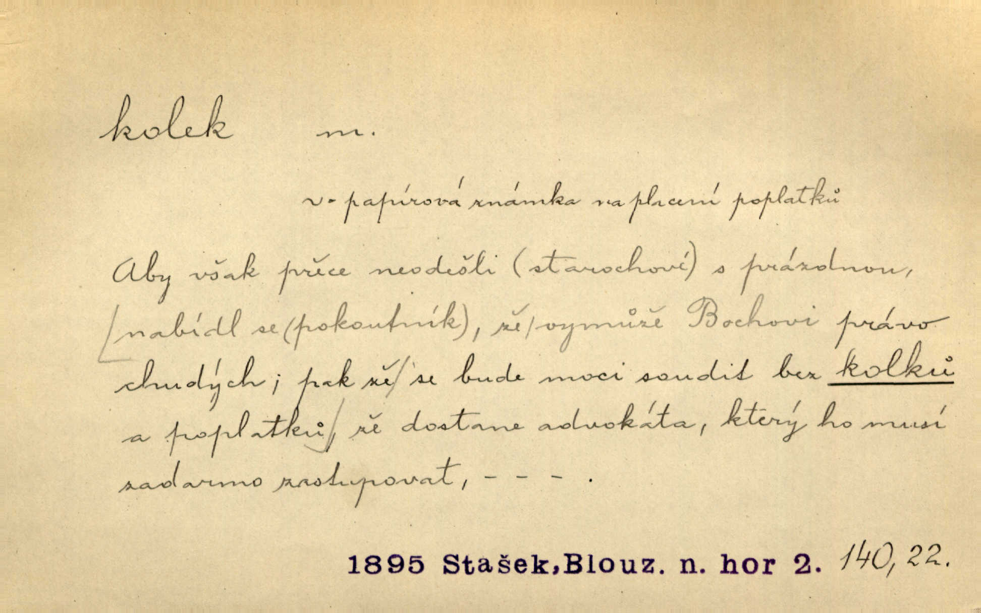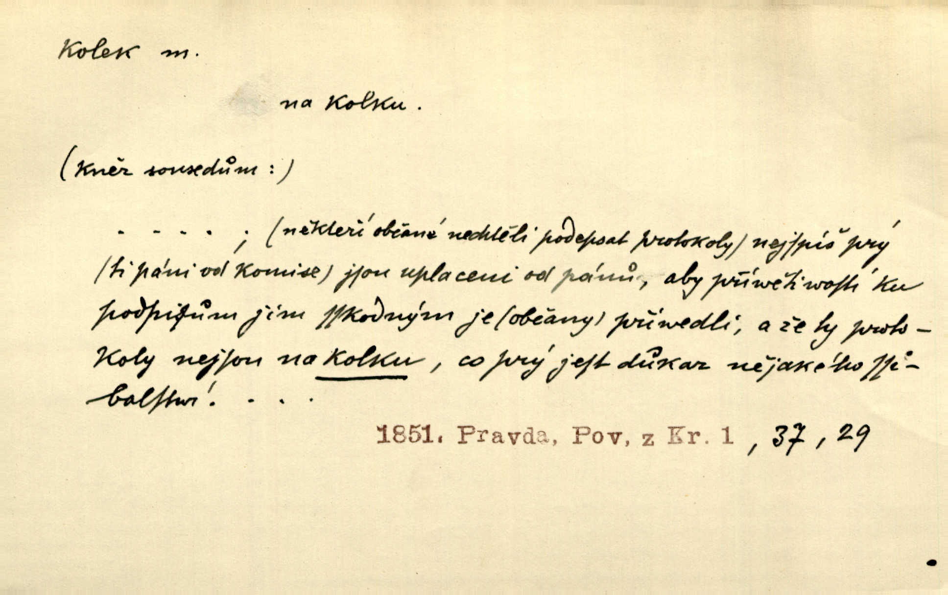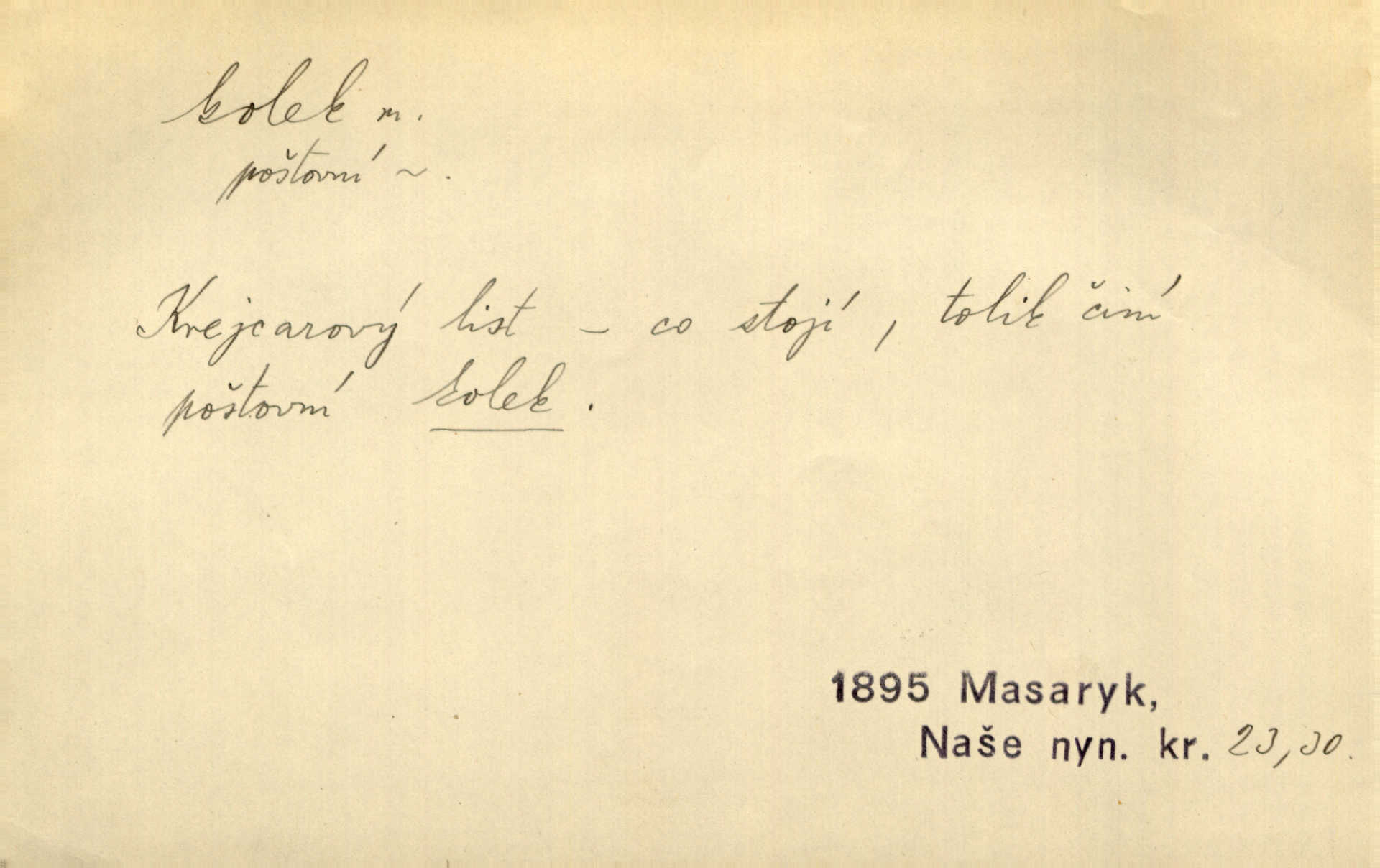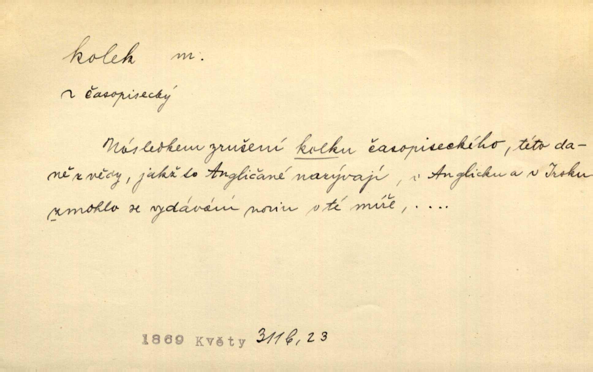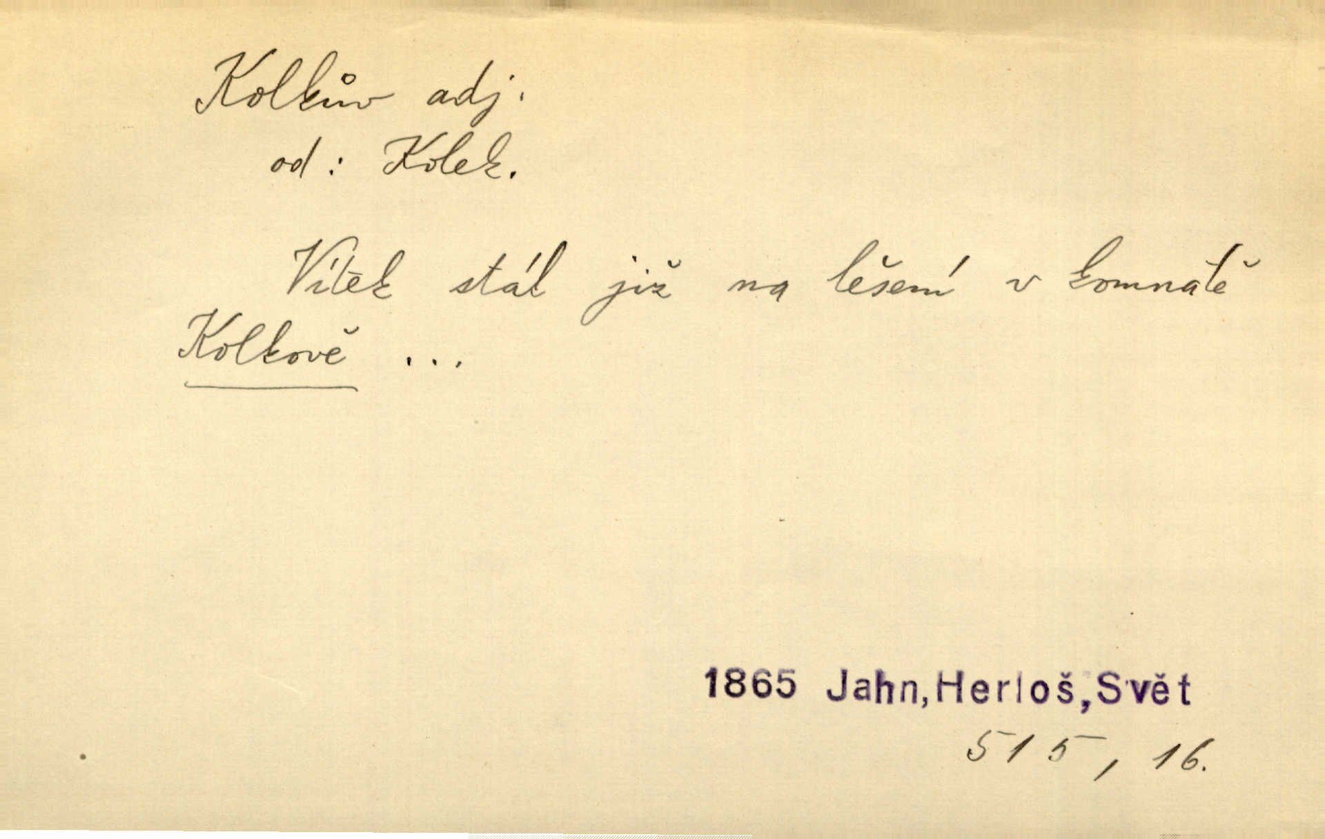 - kolek, -lku m. 1. nalepená známka nebo razítko potvrzující zaplacení poplatku z listiny. Prodej kolků a známek. Nabídl se [pokoutník]‚ že vymůže Bochovi právo chudých; pak že se bude moci soudit bez kolků a poplatků. Staš. Dal jsem mu list křestní, snubní a úmrtní s podpisy na všem a kolky. Mach. Popřával si denně nejlacinějších novin, krejcarových, bez kolku. Herrm. Pan doktor mi řek’, že mi to dá na kolku, že mi nic není! napíše na kolkovanou listinu. Svob. Podání kolku podrobené. D Zříd. razítko vůbec. Přečetl si na pásce [novin] svou adresu, vystřihl z ní známku s kolkem „Praha“. Lier. D Archeol. hřebenový kolek nástroj s vyřezávanými zoubky k otiskování na neolitickou keramiku, t. zv. hřebenovou.