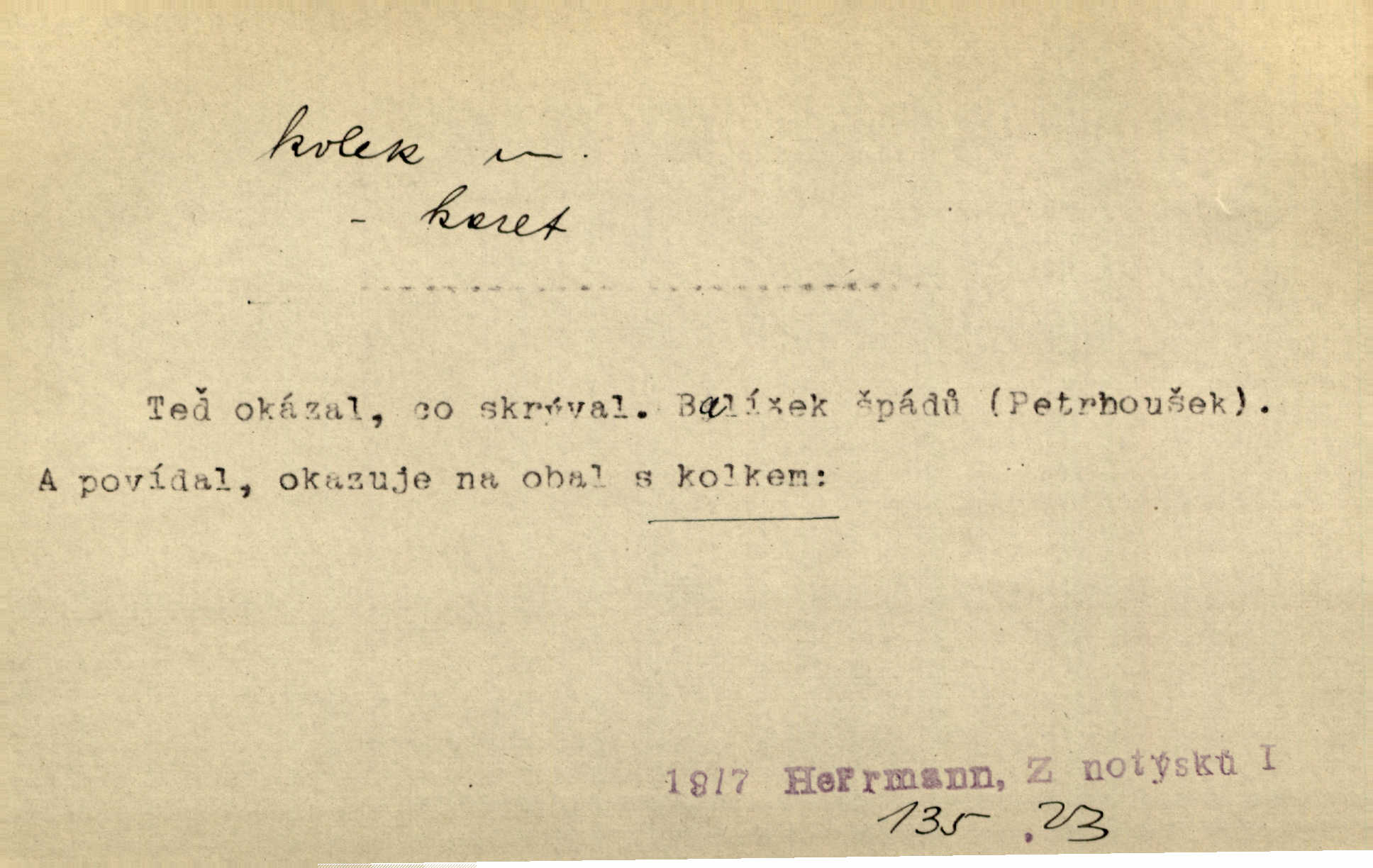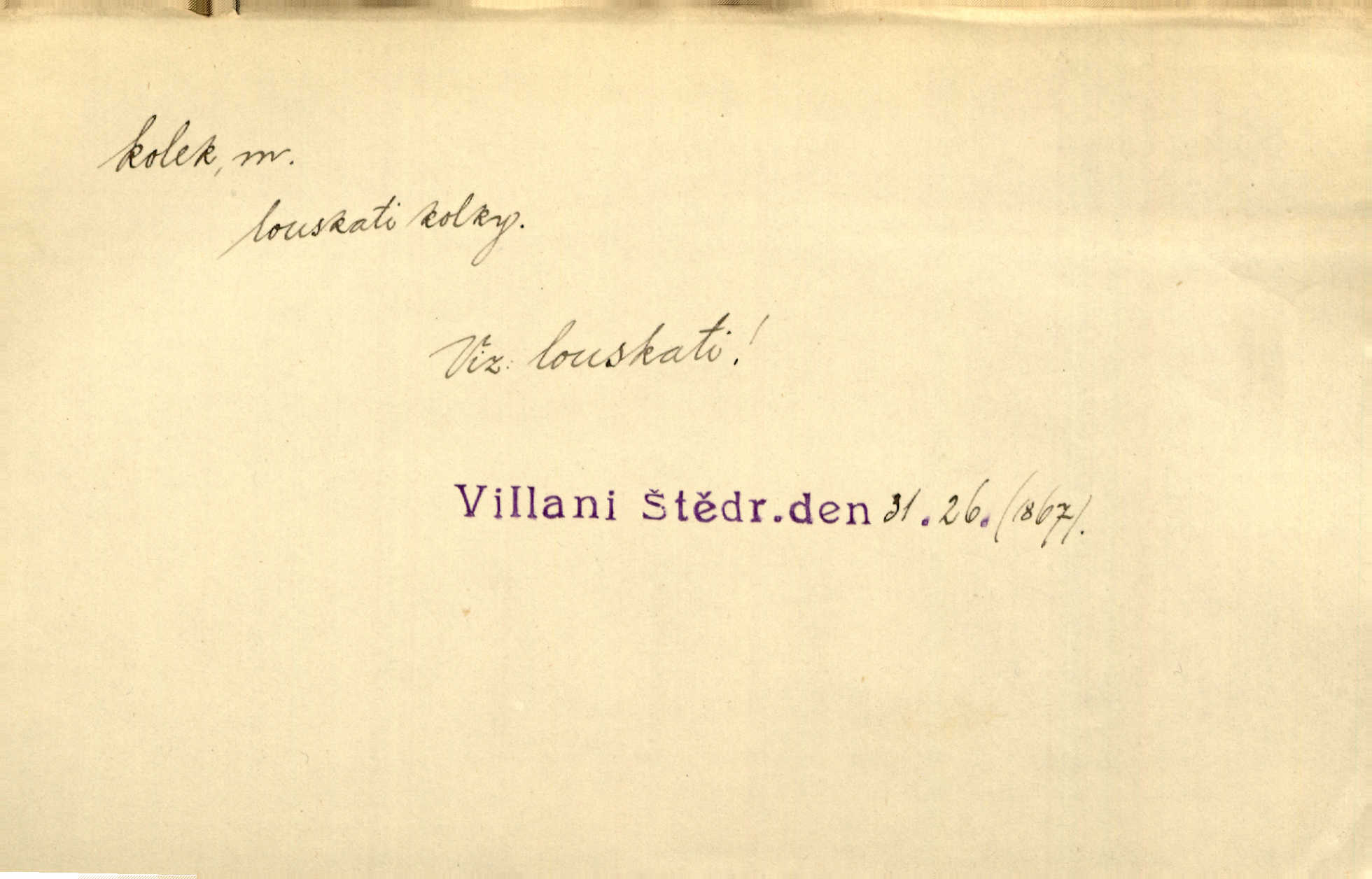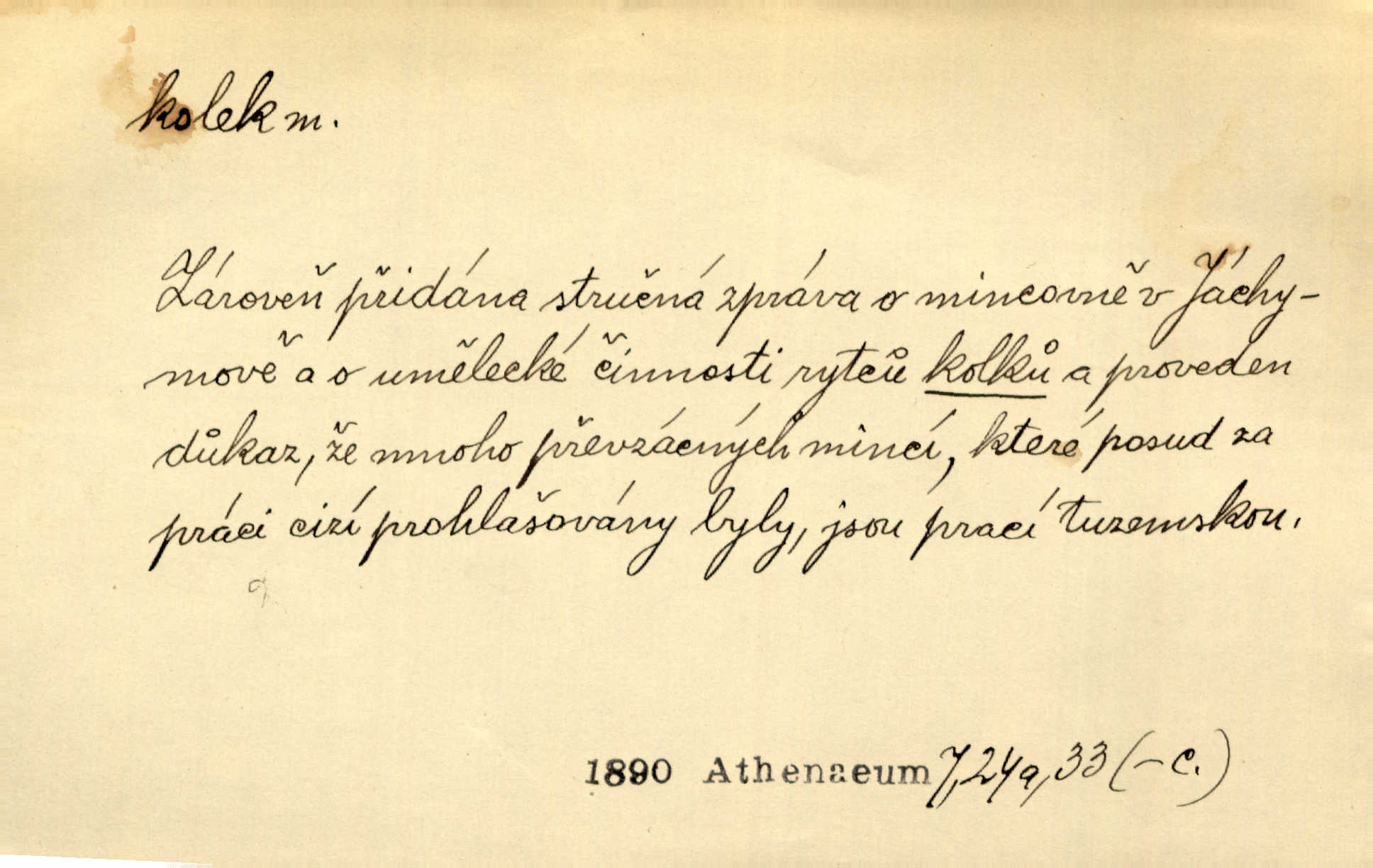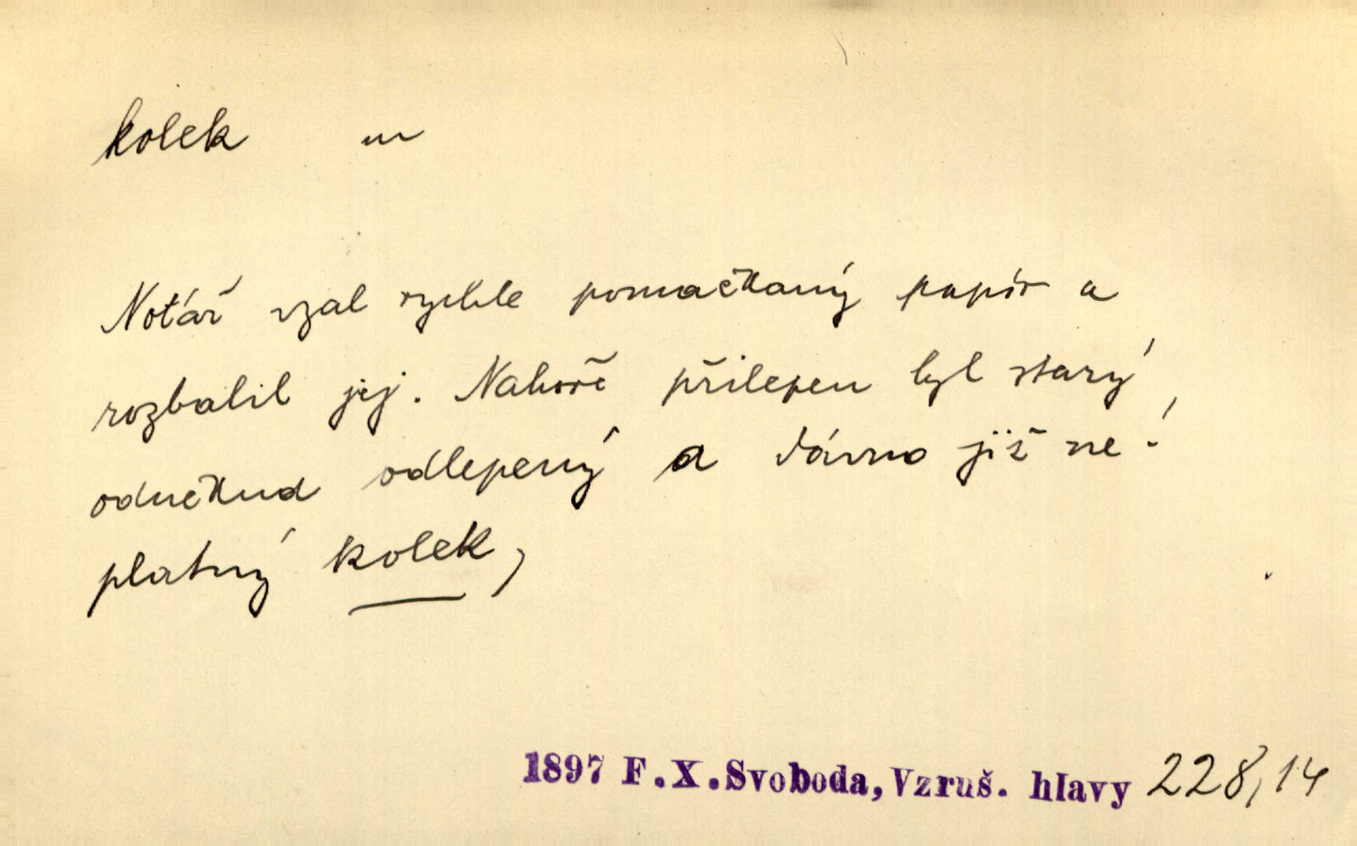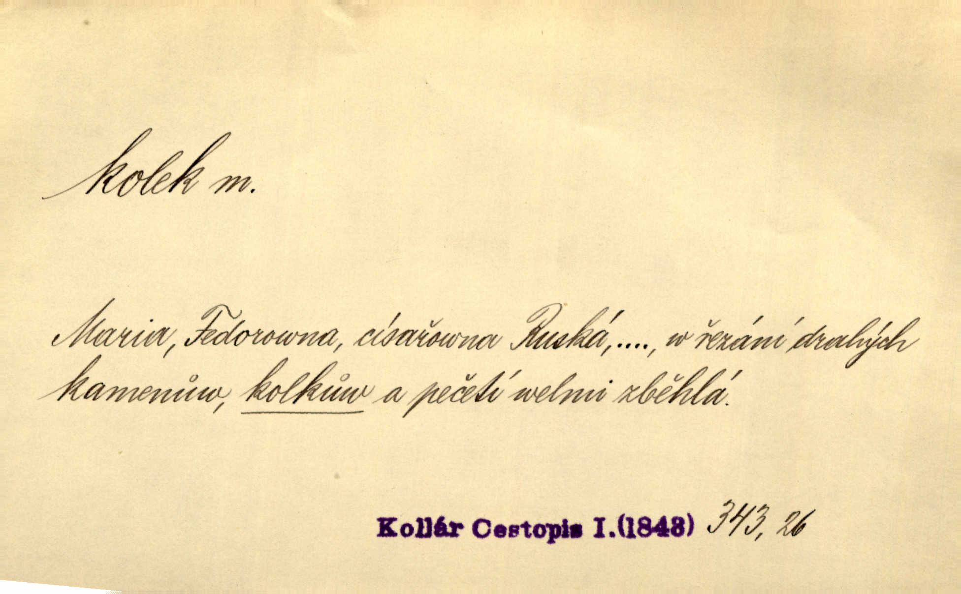 - kolek, -lku m. 1. nalepená známka nebo razítko potvrzující zaplacení poplatku z listiny. Prodej kolků a známek. Nabídl se [pokoutník]‚ že vymůže Bochovi právo chudých; pak že se bude moci soudit bez kolků a poplatků. Staš. Dal jsem mu list křestní, snubní a úmrtní s podpisy na všem a kolky. Mach. Popřával si denně nejlacinějších novin, krejcarových, bez kolku. Herrm. Pan doktor mi řek’, že mi to dá na kolku, že mi nic není! napíše na kolkovanou listinu. Svob. Podání kolku podrobené. D Zříd. razítko vůbec. Přečetl si na pásce [novin] svou adresu, vystřihl z ní známku s kolkem „Praha“. Lier. D Archeol. hřebenový kolek nástroj s vyřezávanými zoubky k otiskování na neolitickou keramiku, t. zv. hřebenovou.