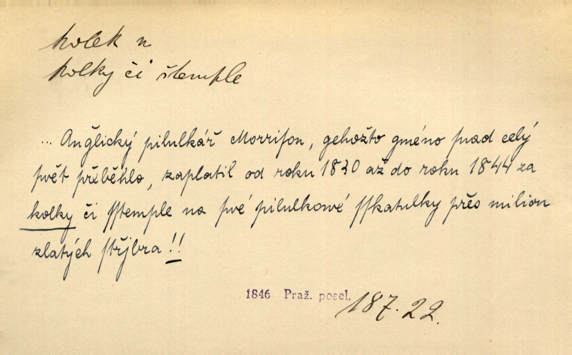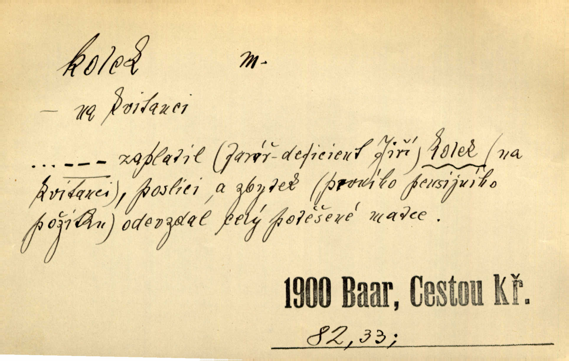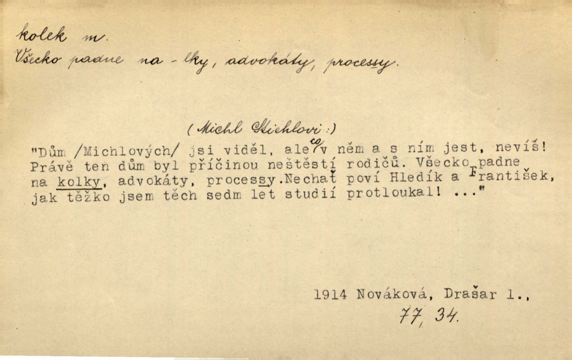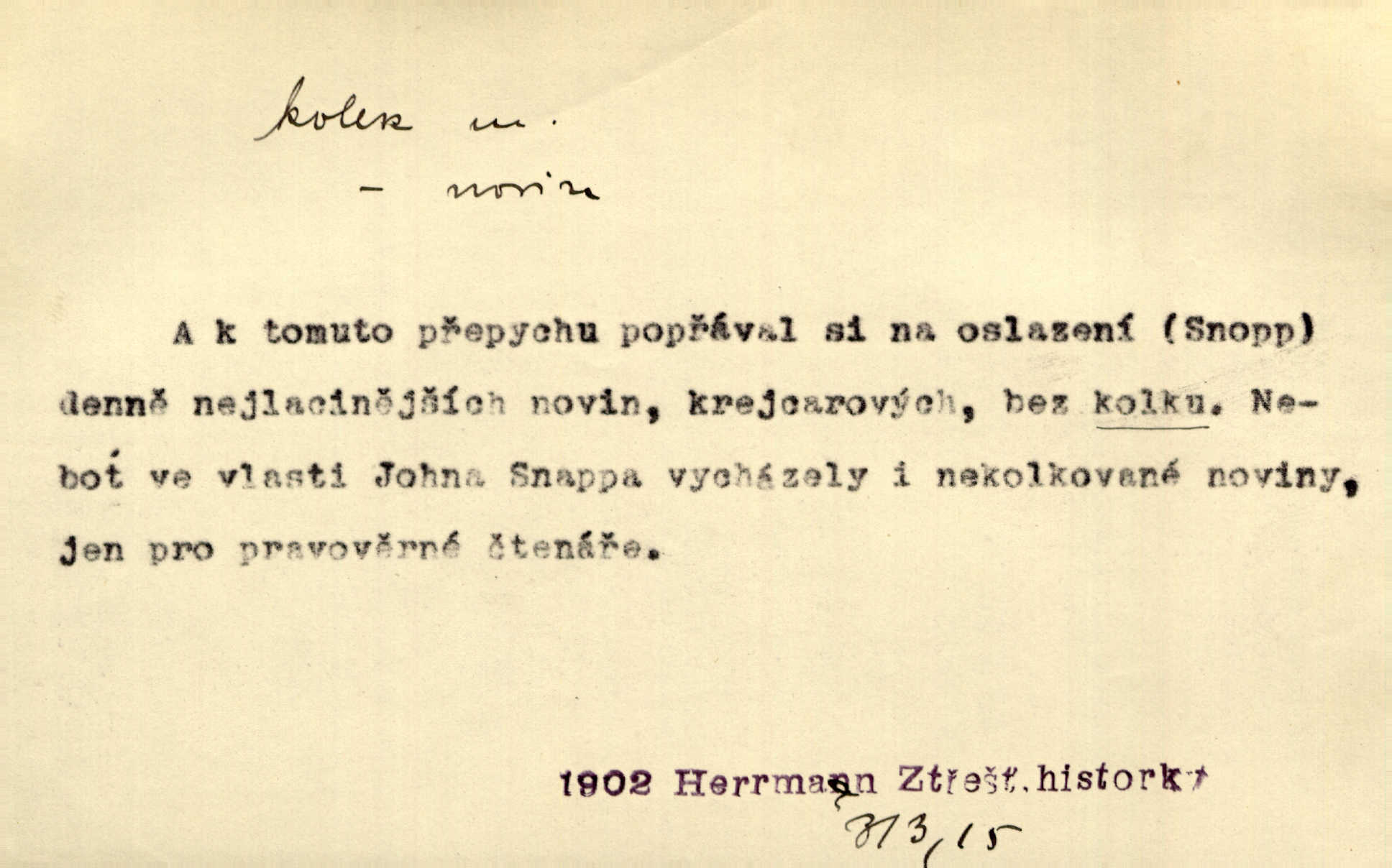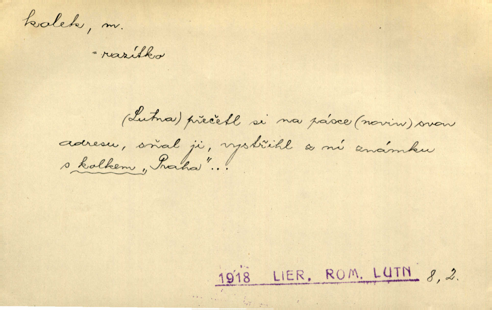 - kolek, -lku m. 1. nalepená známka nebo razítko potvrzující zaplacení poplatku z listiny. Prodej kolků a známek. Nabídl se [pokoutník]‚ že vymůže Bochovi právo chudých; pak že se bude moci soudit bez kolků a poplatků. Staš. Dal jsem mu list křestní, snubní a úmrtní s podpisy na všem a kolky. Mach. Popřával si denně nejlacinějších novin, krejcarových, bez kolku. Herrm. Pan doktor mi řek’, že mi to dá na kolku, že mi nic není! napíše na kolkovanou listinu. Svob. Podání kolku podrobené. D Zříd. razítko vůbec. Přečetl si na pásce [novin] svou adresu, vystřihl z ní známku s kolkem „Praha“. Lier. D Archeol. hřebenový kolek nástroj s vyřezávanými zoubky k otiskování na neolitickou keramiku, t. zv. hřebenovou.