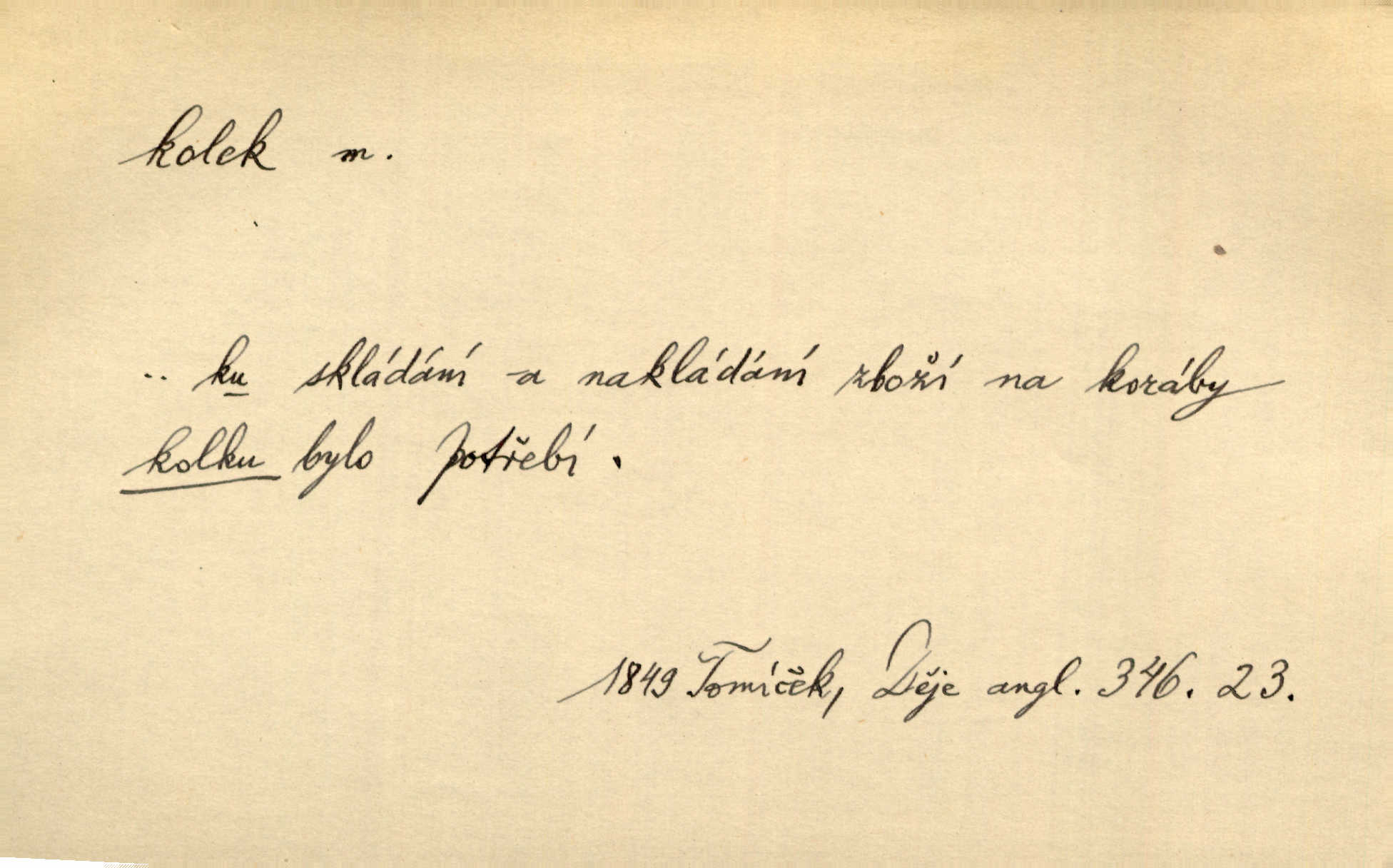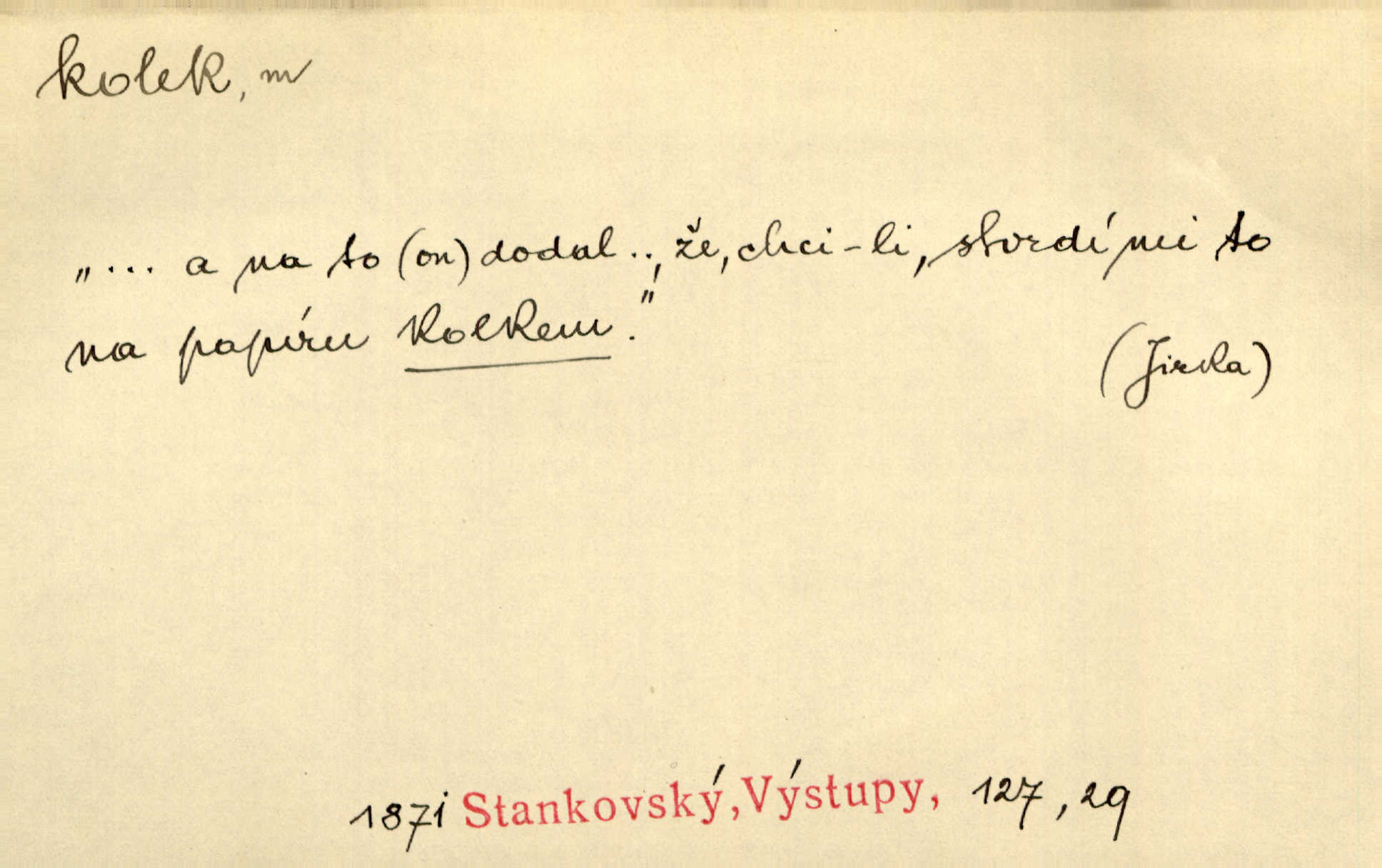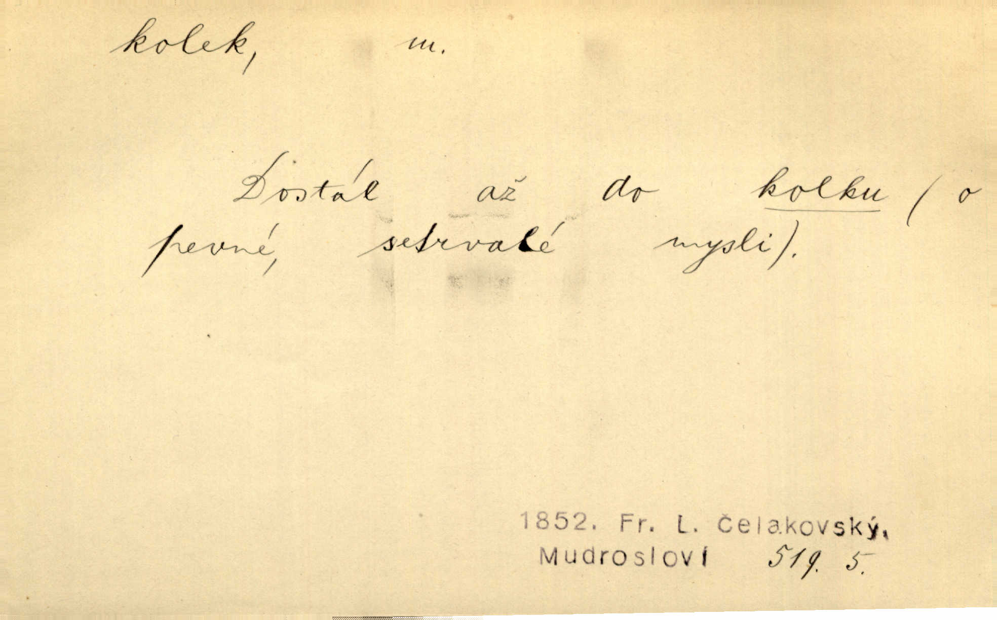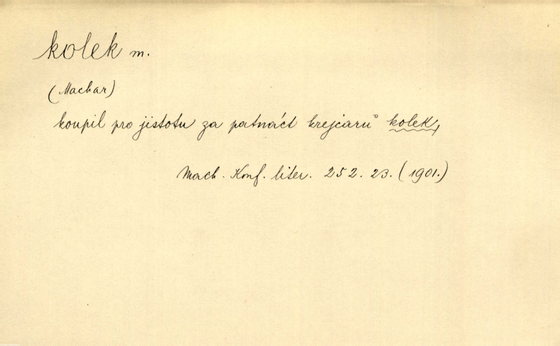 - kolek, -lku m. 2. dial. kolík. Přivázal několik stromků ke kolkům. Kosm. [Běta:] Snad nerostu ke kolku, ale k pacholku. Preis.