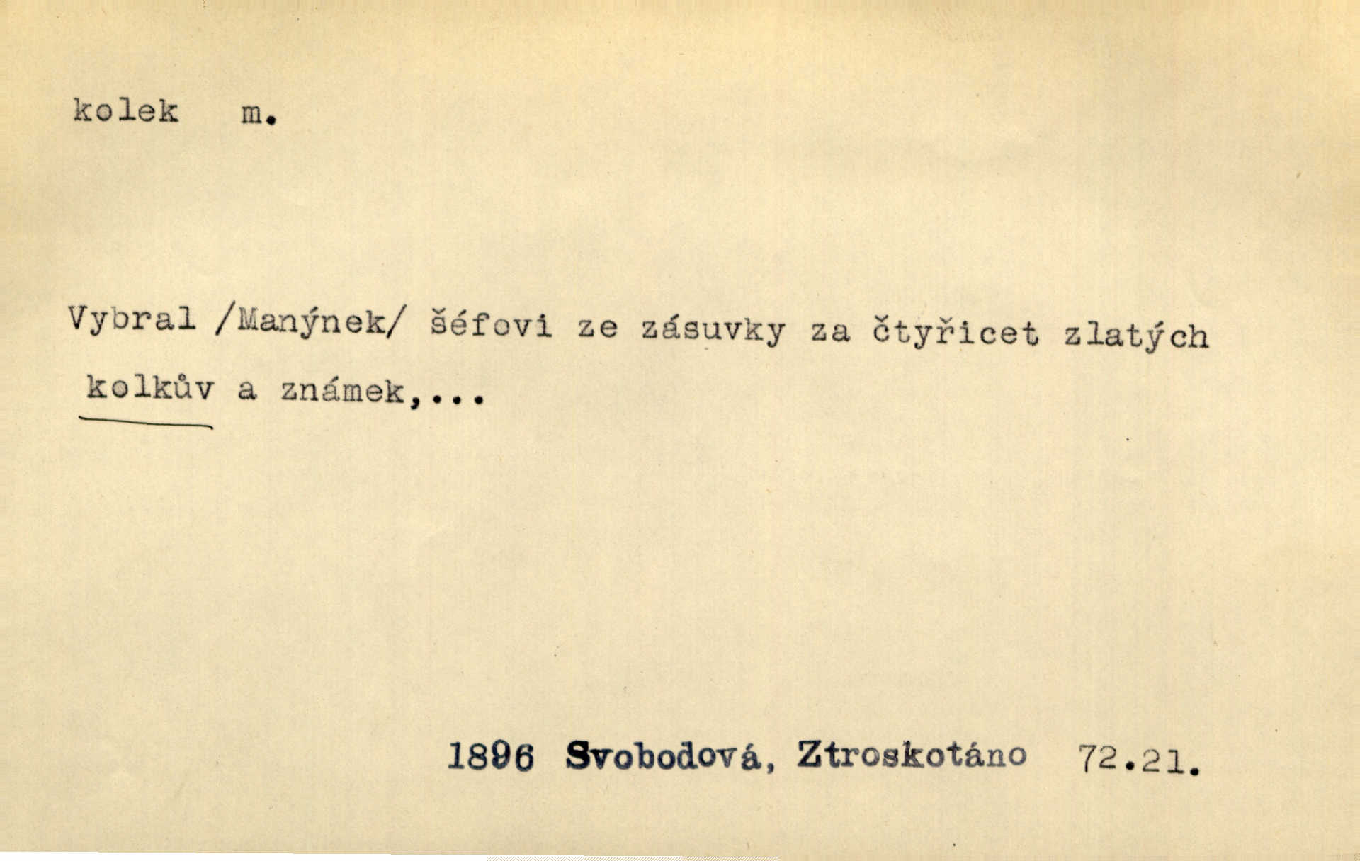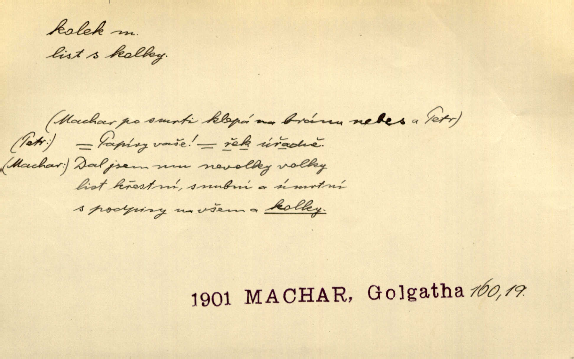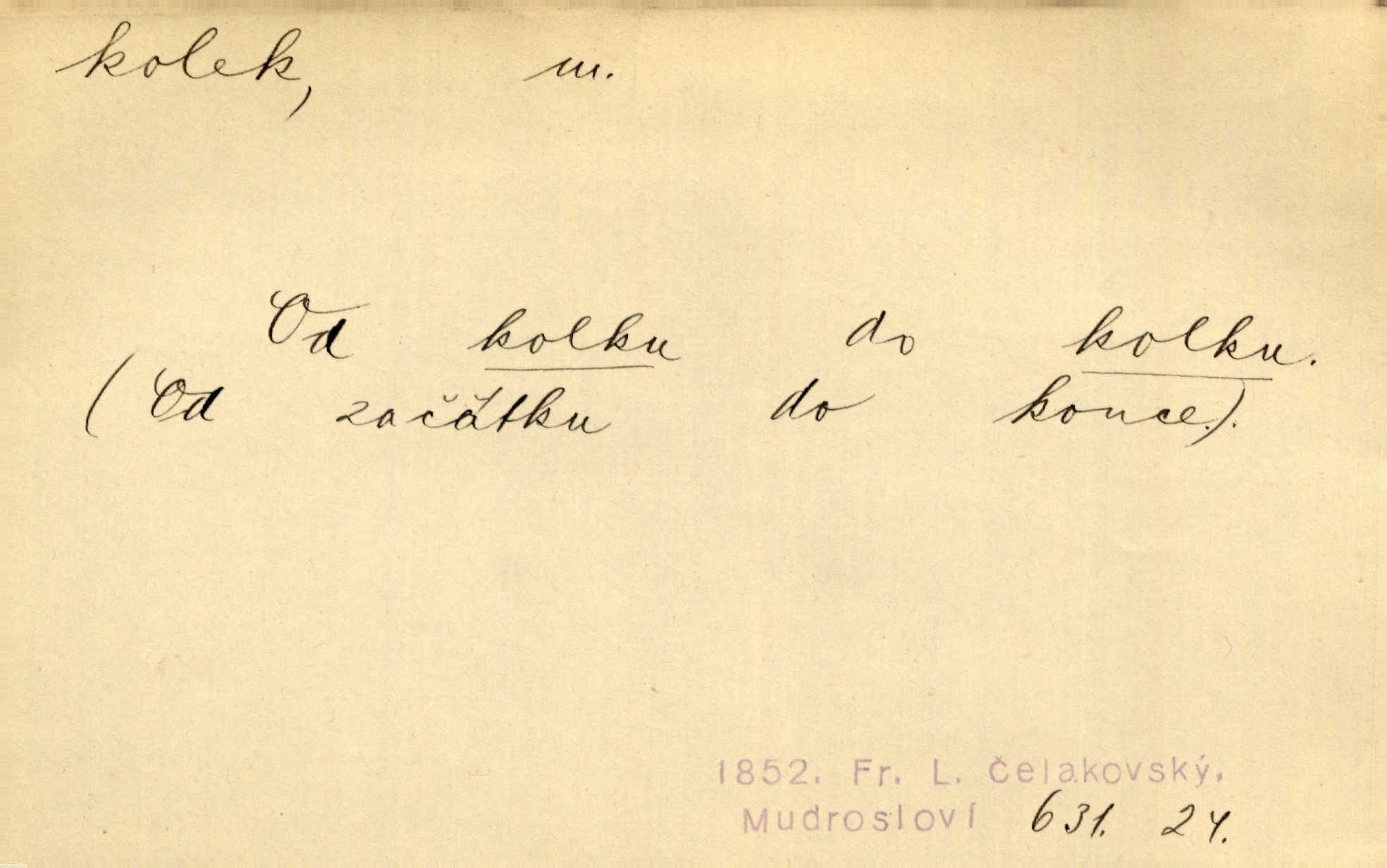 - kolek, -lku m. 2. dial. kolík. Přivázal několik stromků ke kolkům. Kosm. [Běta:] Snad nerostu ke kolku, ale k pacholku. Preis.