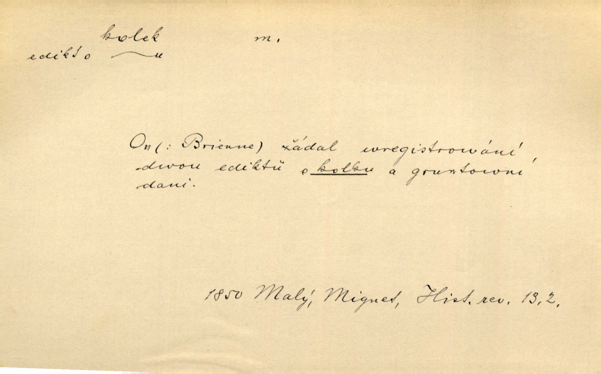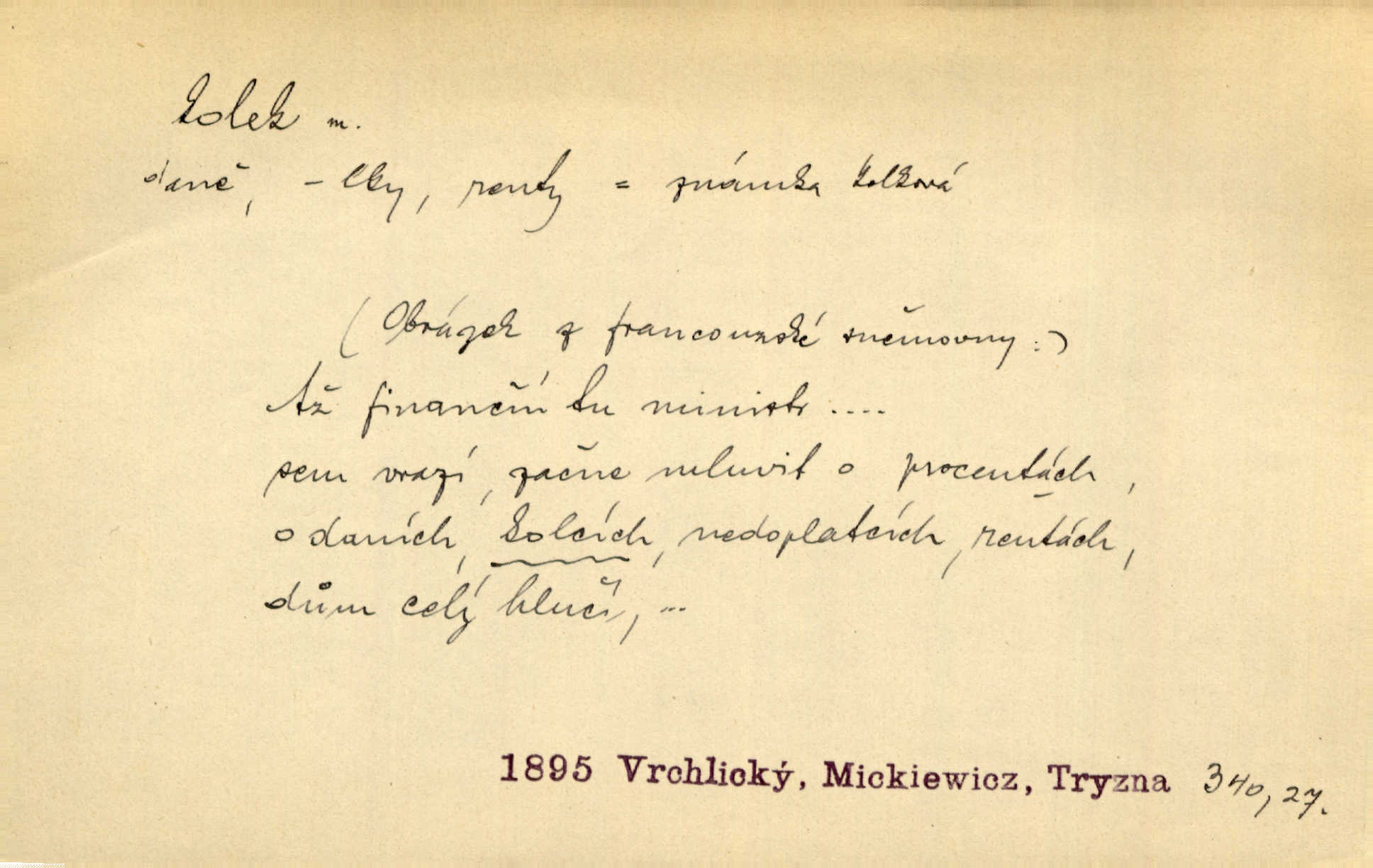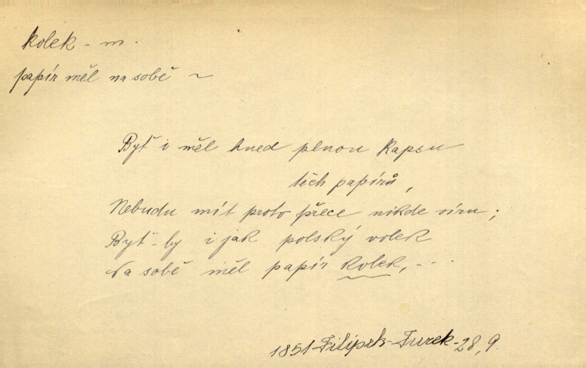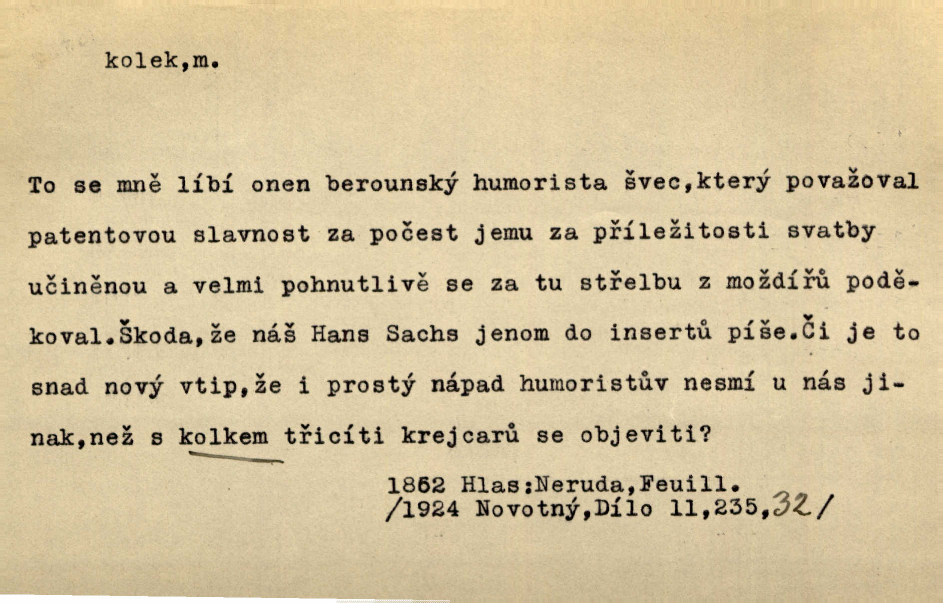 - kolek, -lku m. 2. dial. kolík. Přivázal několik stromků ke kolkům. Kosm. [Běta:] Snad nerostu ke kolku, ale k pacholku. Preis.