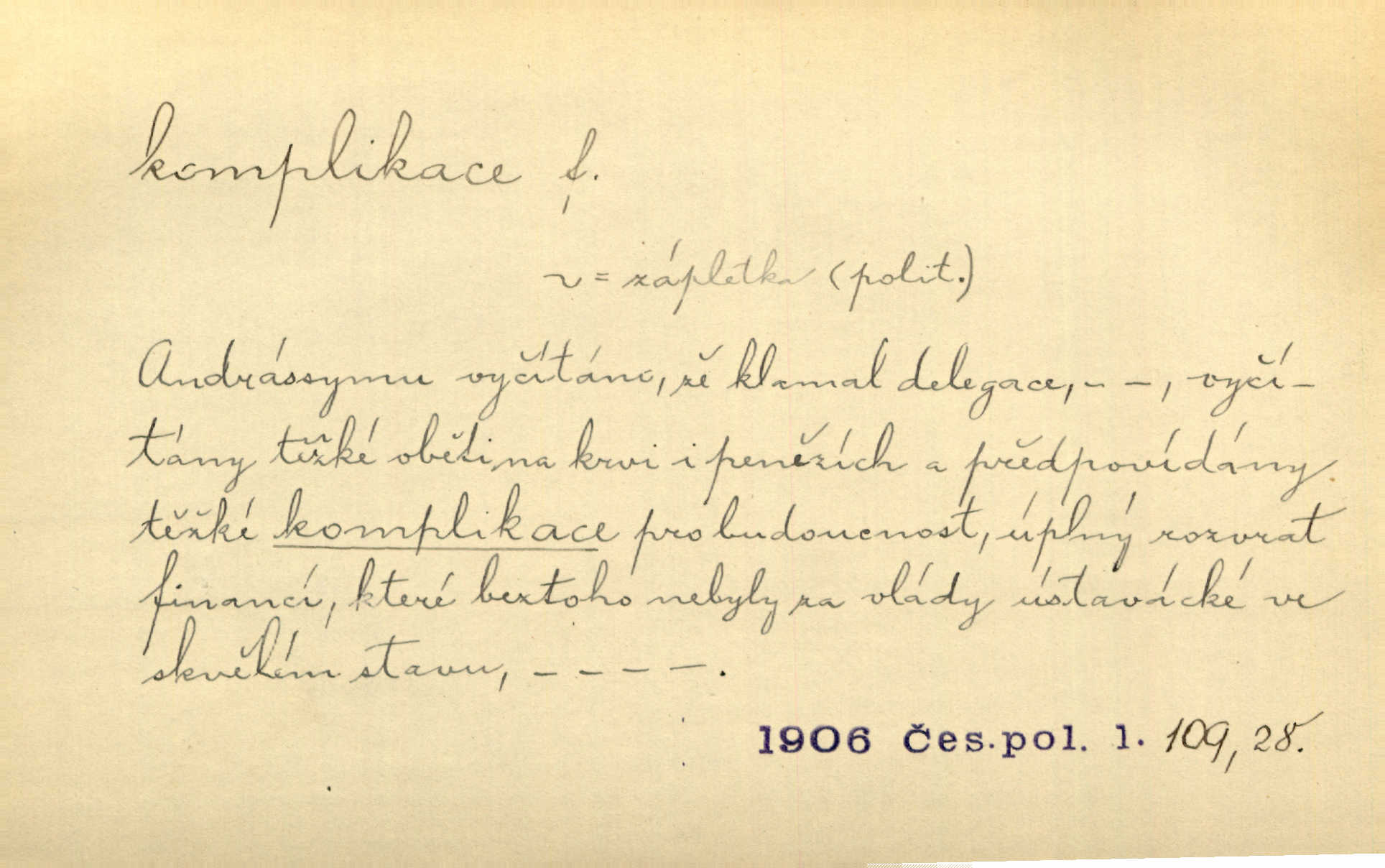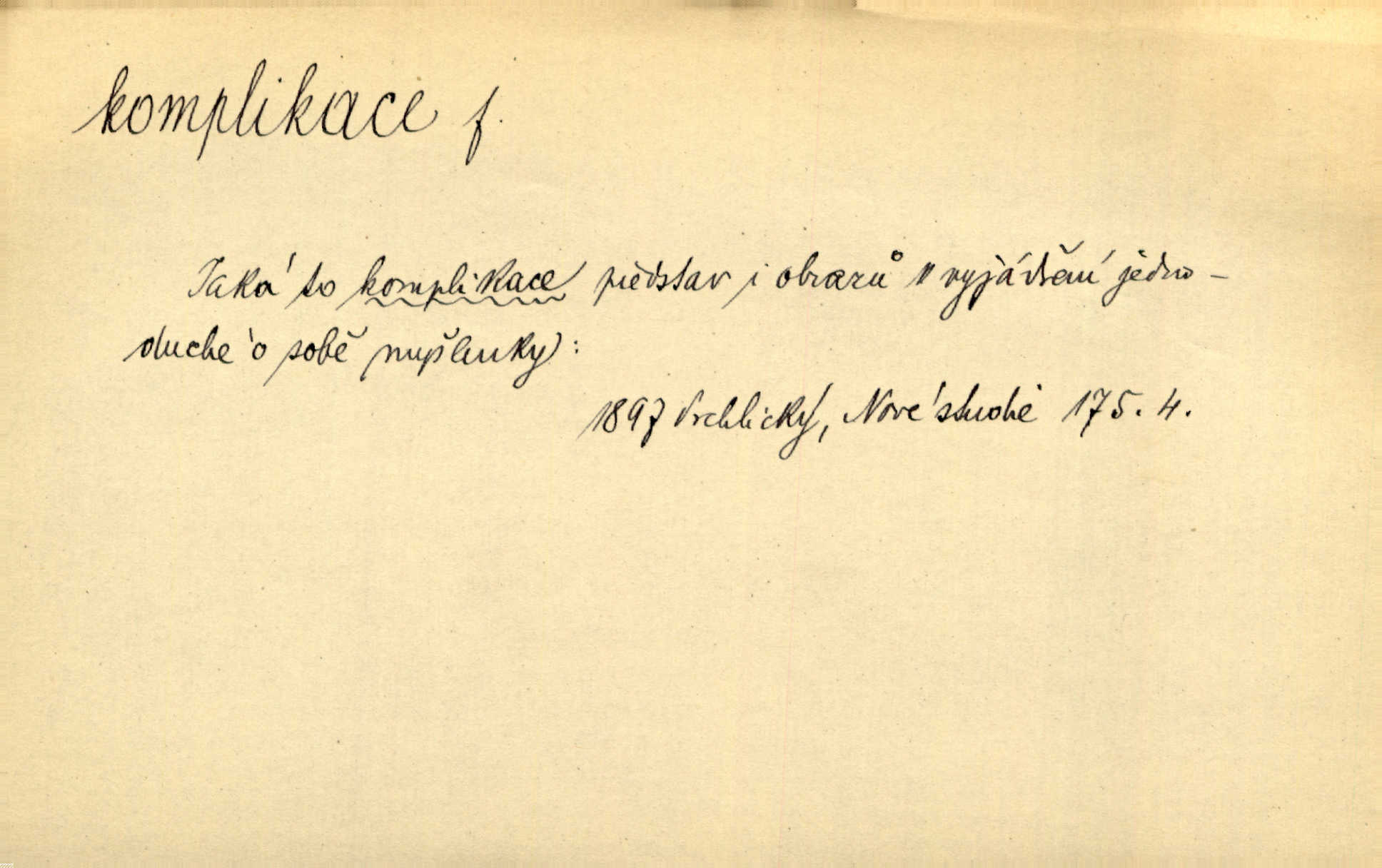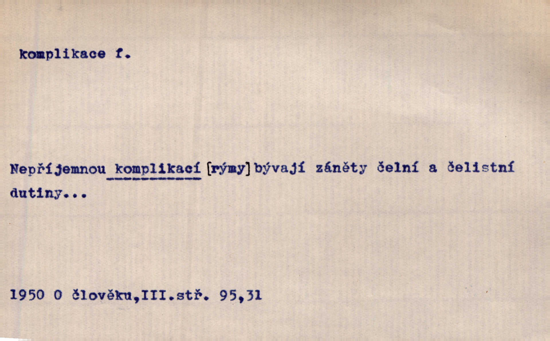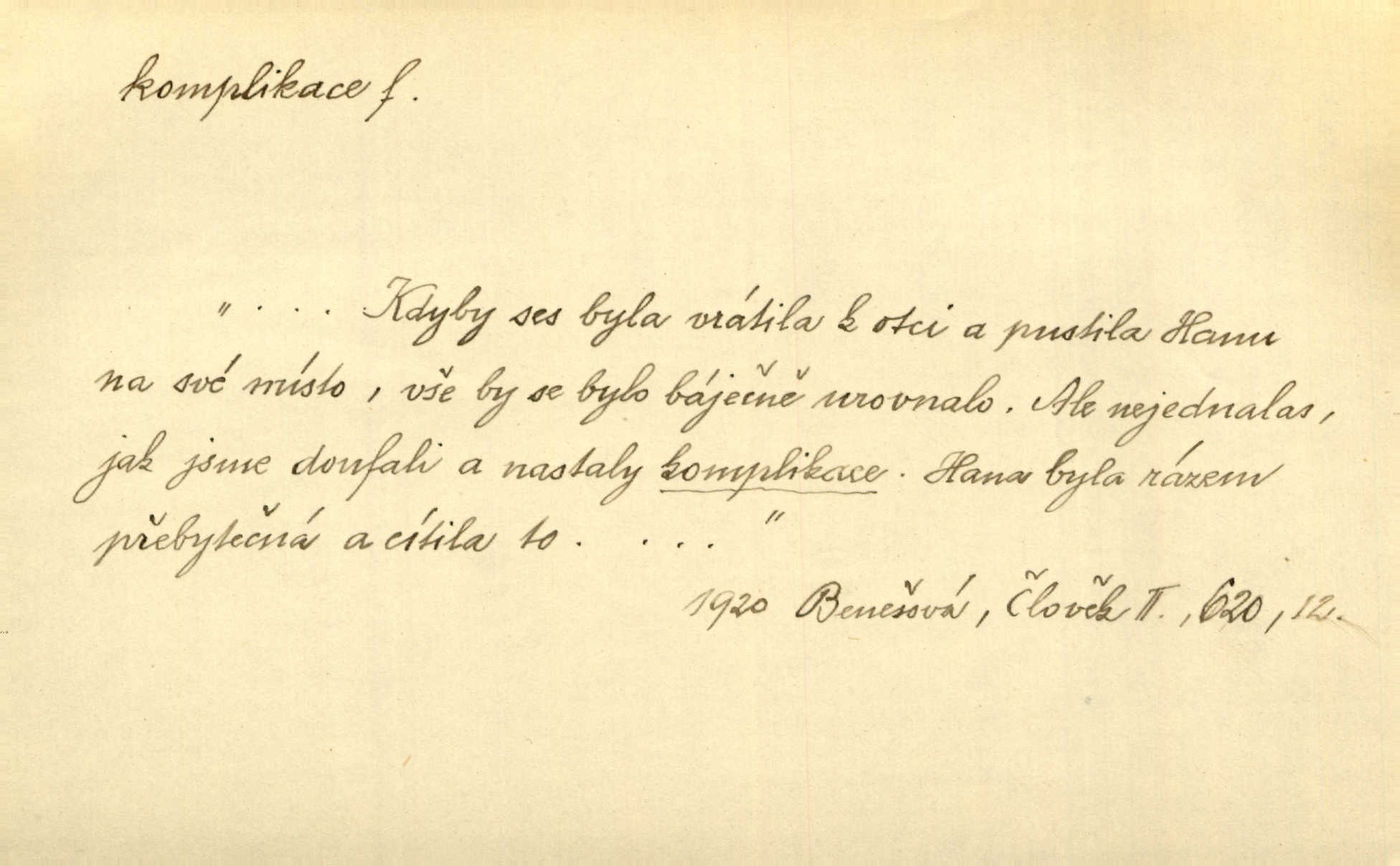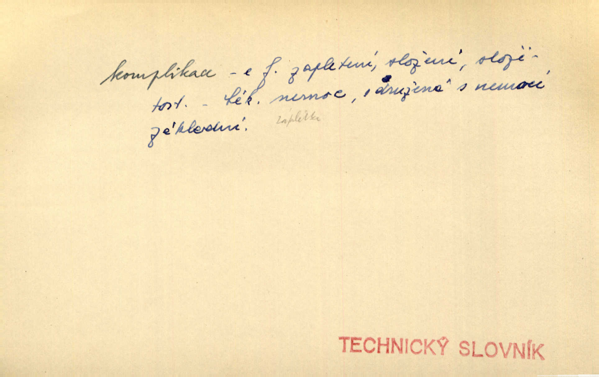 - komplikace, -e f. spleť, složitost, zápletka. Jaká to komplikace představ i obrazů k vyjádření jednoduché o sobě myšlenky! Vrch. Válka se komplikovala — vyhlídka, že potrvá déle. Té komplikaci nasvědčovalo také vzetí Valony Italií. Mas. Lék. nemoc, jež se přidružila k nemoci základní. „Jsou komplikace, nevím, jaké to bude do rána…“ odpověděl lékař. R. Svob.