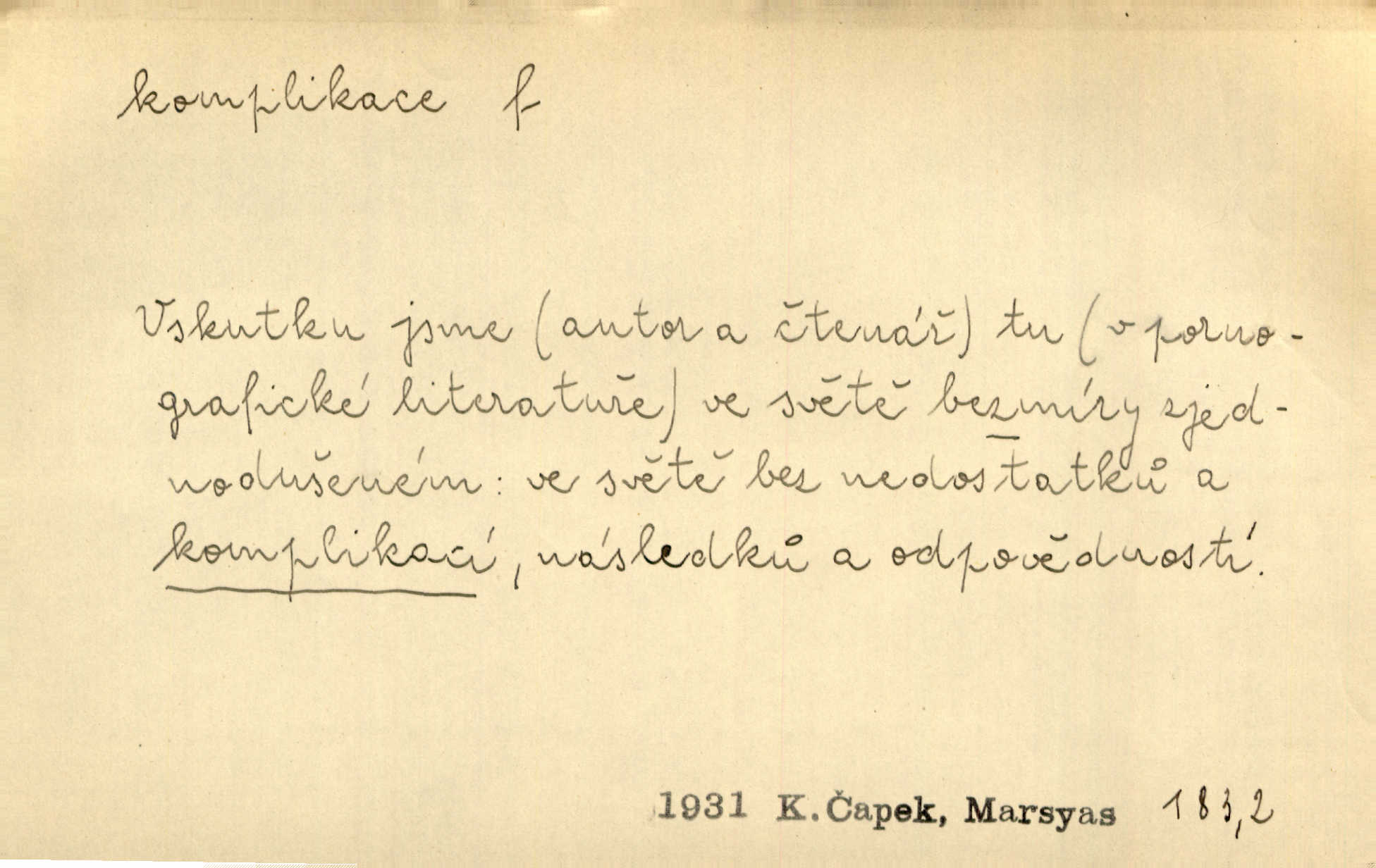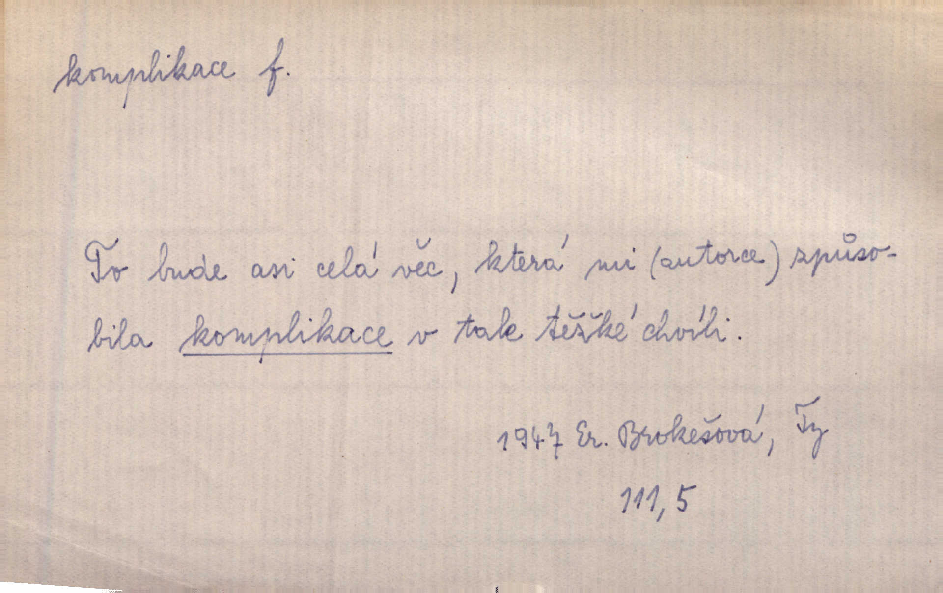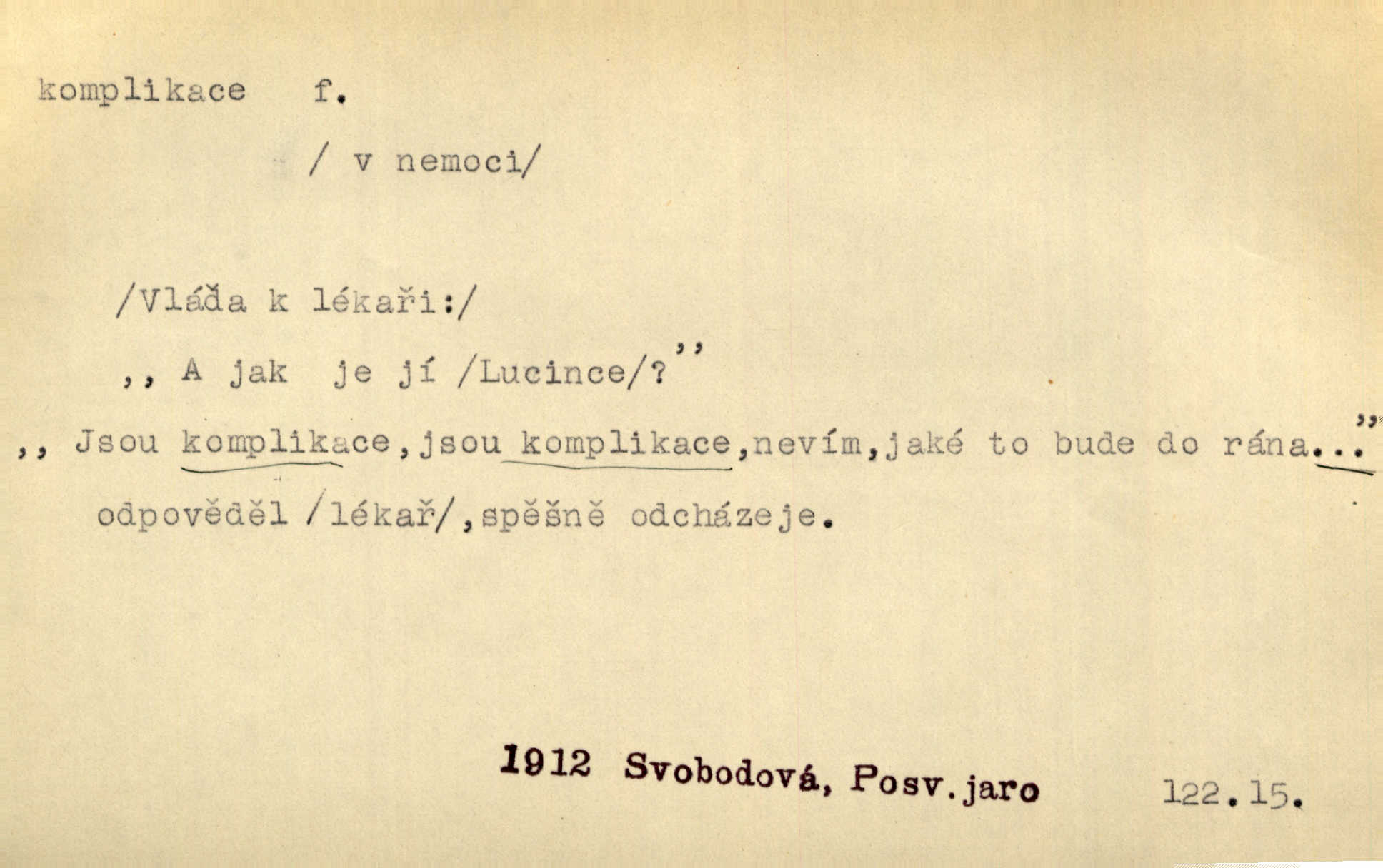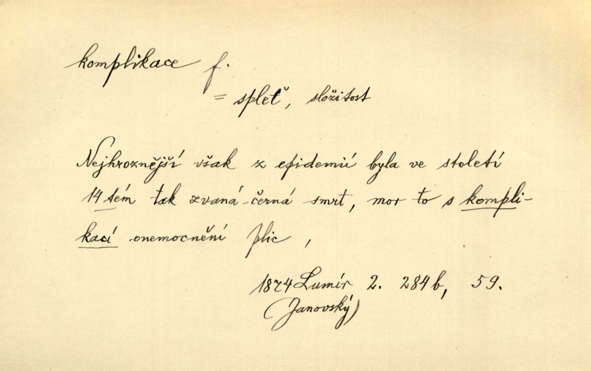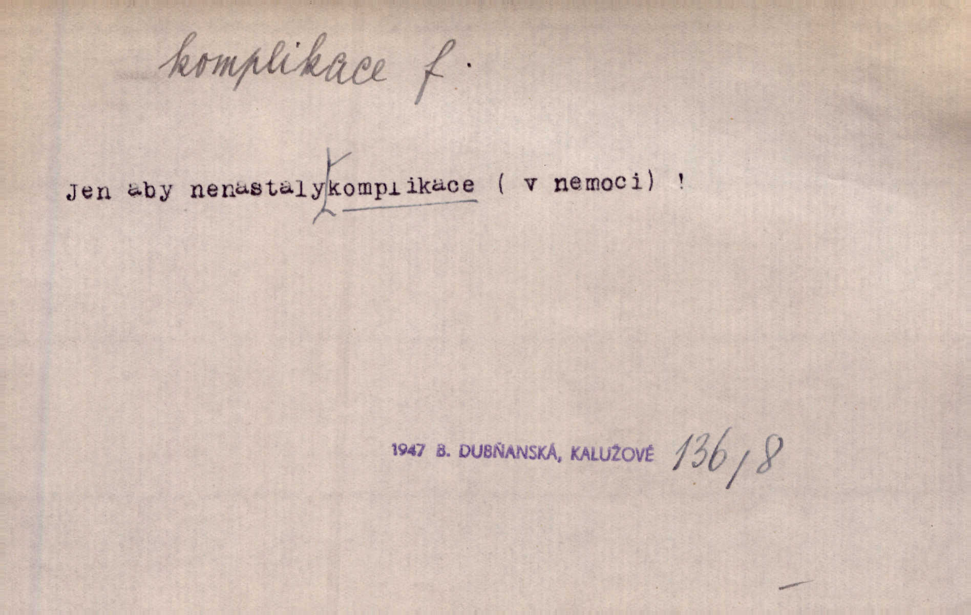 - komplikace, -e f. spleť, složitost, zápletka. Jaká to komplikace představ i obrazů k vyjádření jednoduché o sobě myšlenky! Vrch. Válka se komplikovala — vyhlídka, že potrvá déle. Té komplikaci nasvědčovalo také vzetí Valony Italií. Mas. Lék. nemoc, jež se přidružila k nemoci základní. „Jsou komplikace, nevím, jaké to bude do rána…“ odpověděl lékař. R. Svob.