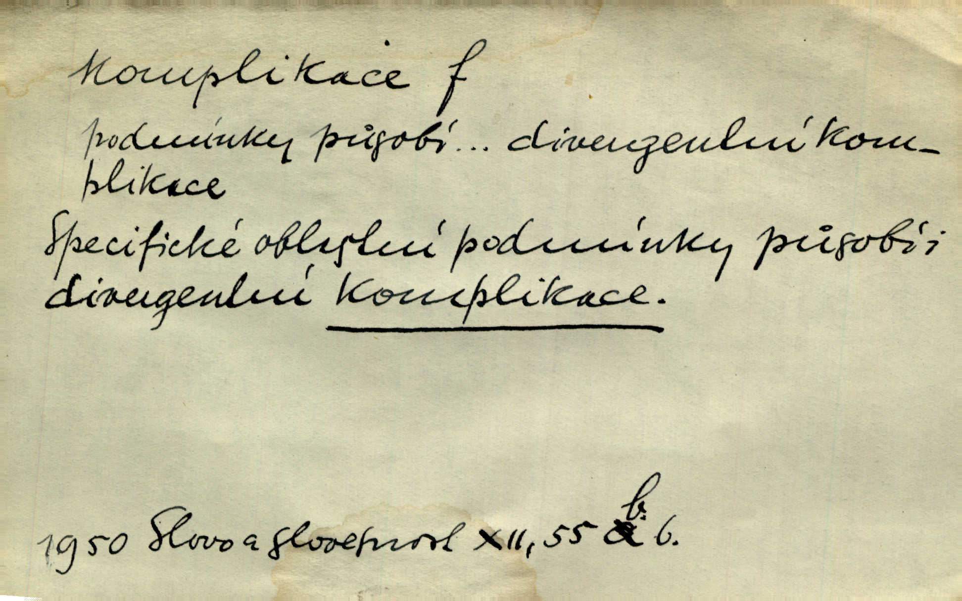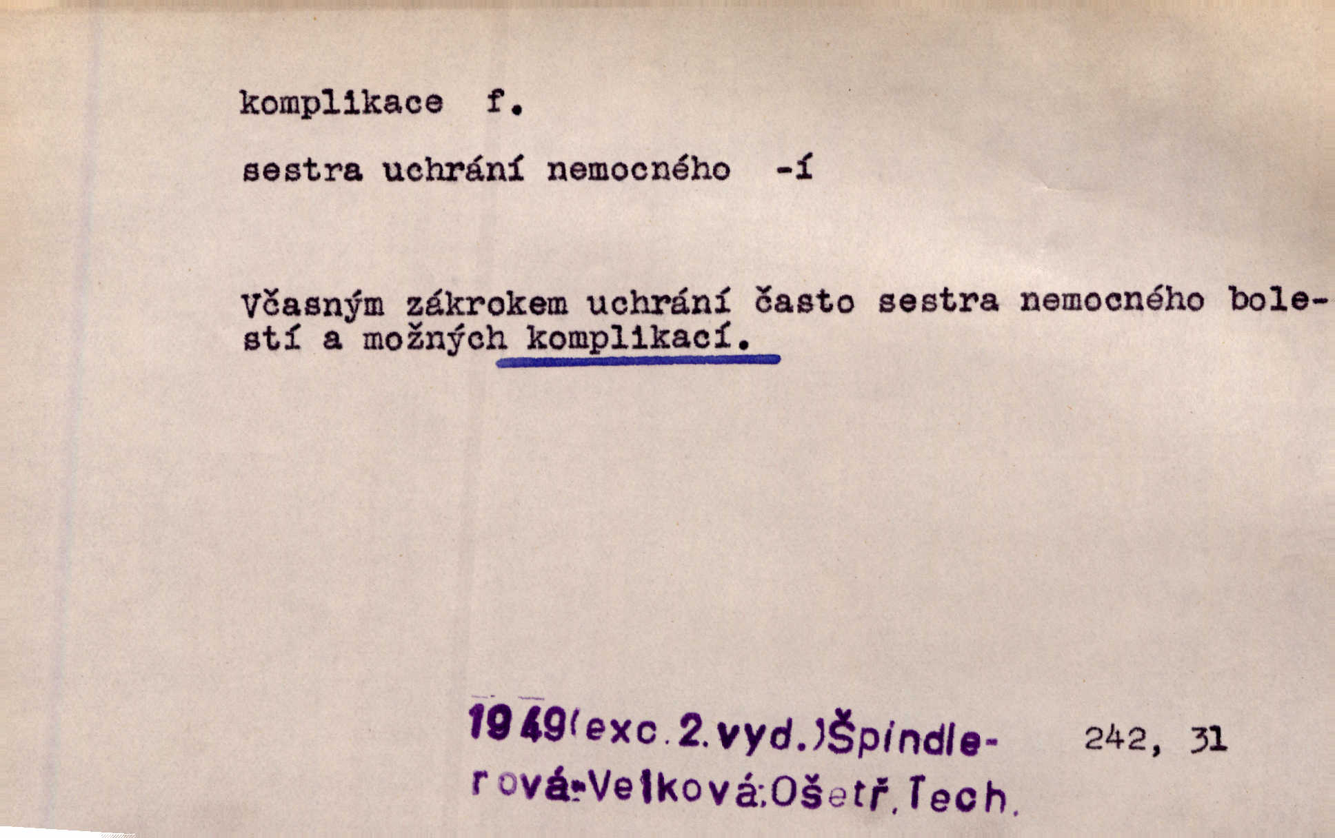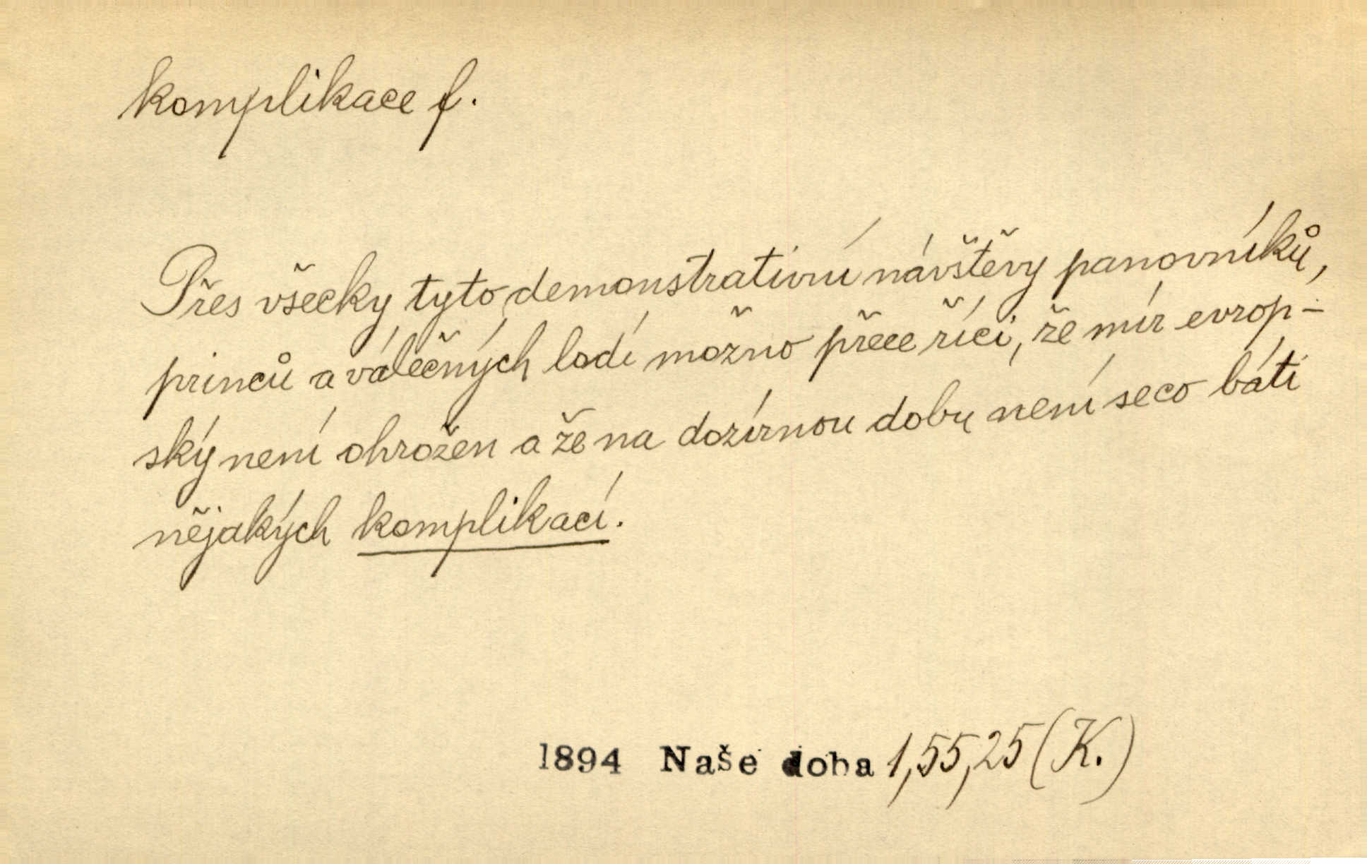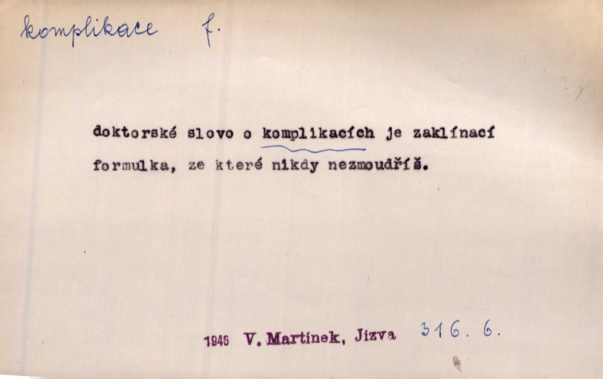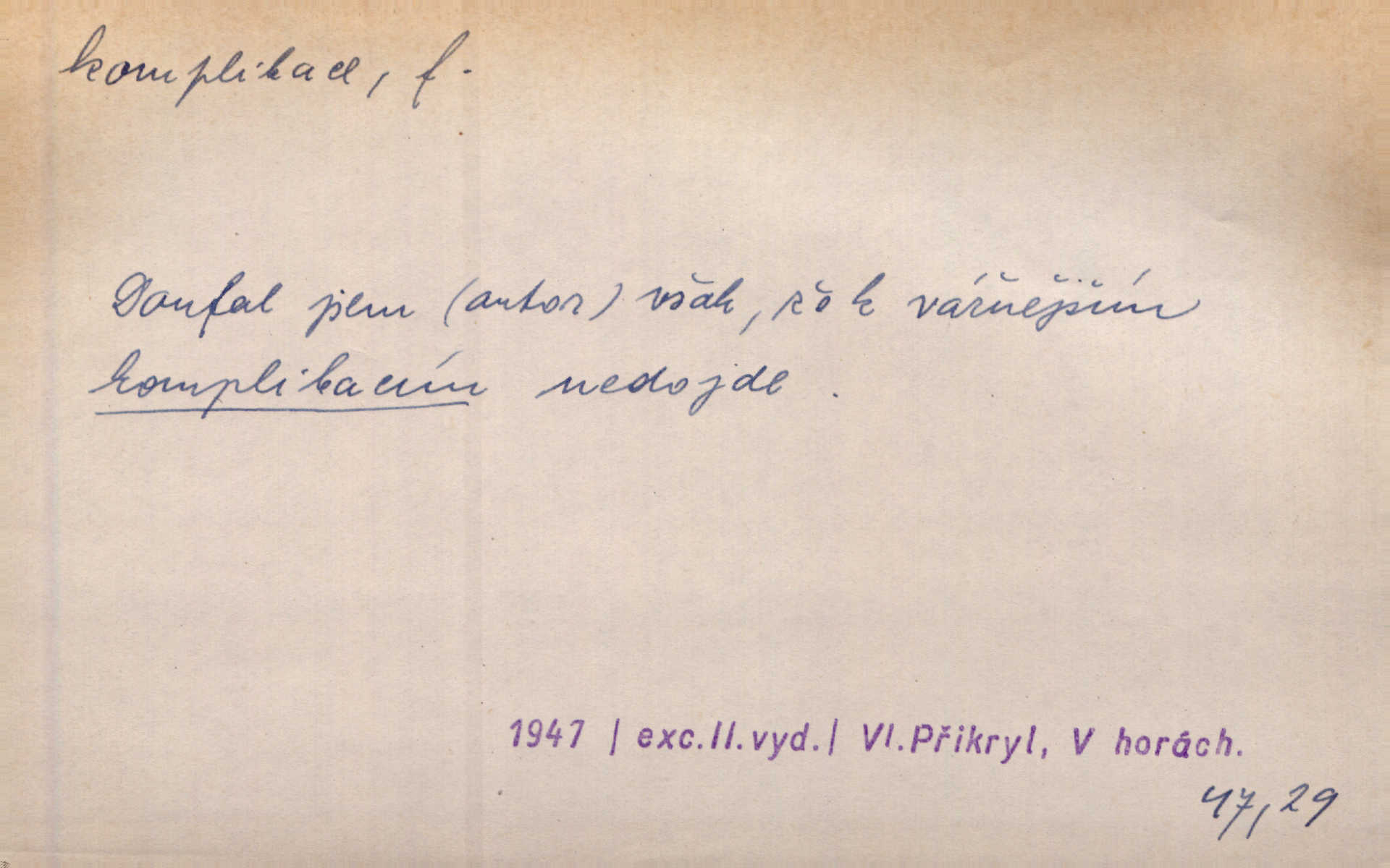 - komplikace, -e f. spleť, složitost, zápletka. Jaká to komplikace představ i obrazů k vyjádření jednoduché o sobě myšlenky! Vrch. Válka se komplikovala — vyhlídka, že potrvá déle. Té komplikaci nasvědčovalo také vzetí Valony Italií. Mas. Lék. nemoc, jež se přidružila k nemoci základní. „Jsou komplikace, nevím, jaké to bude do rána…“ odpověděl lékař. R. Svob.