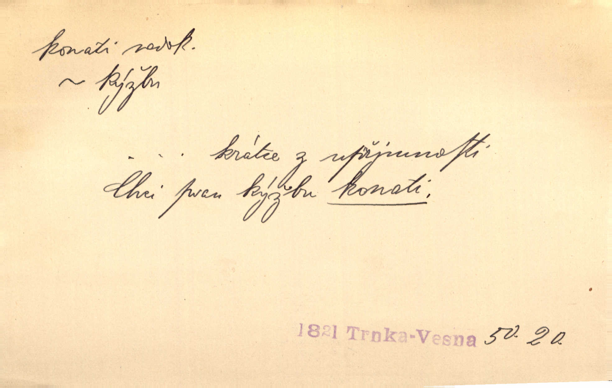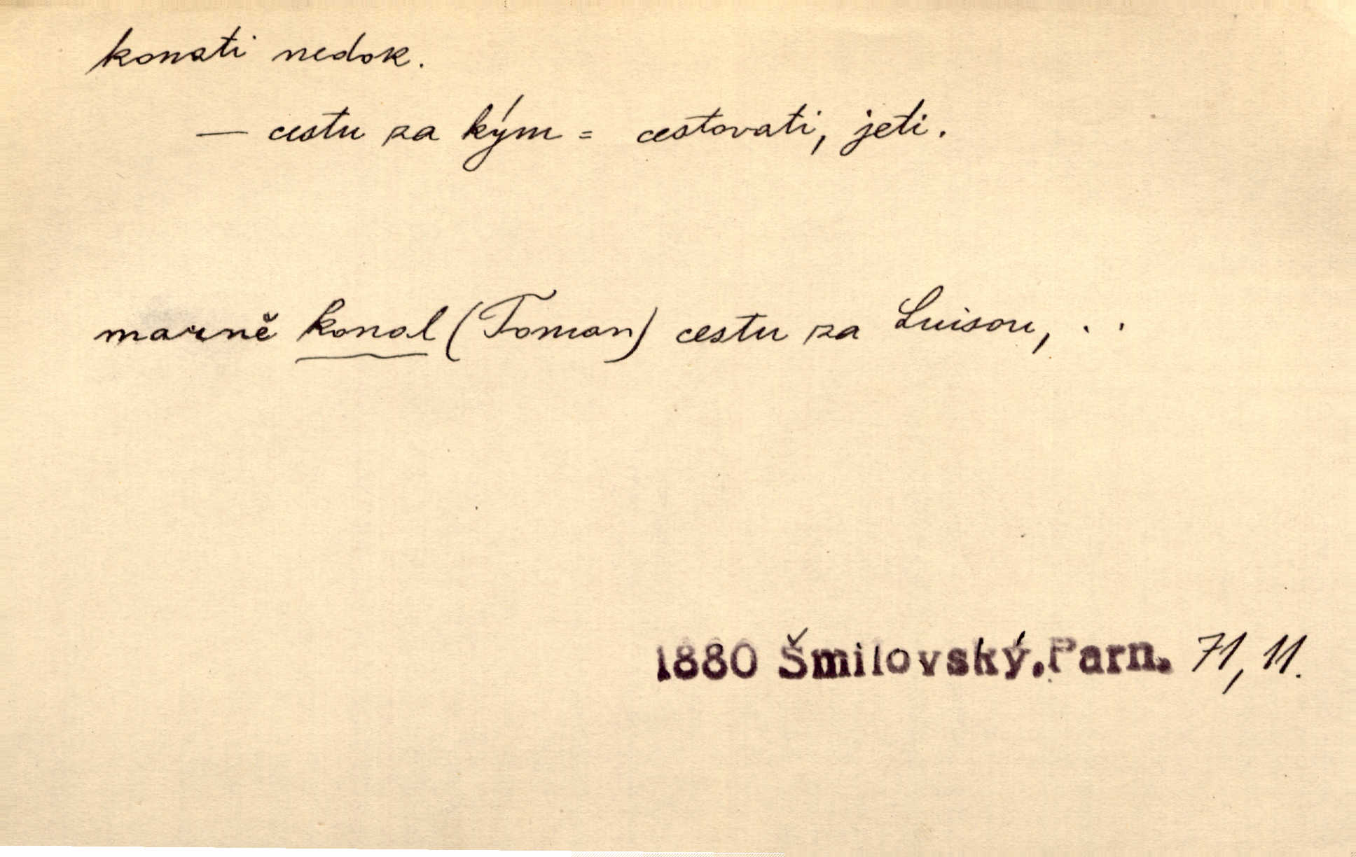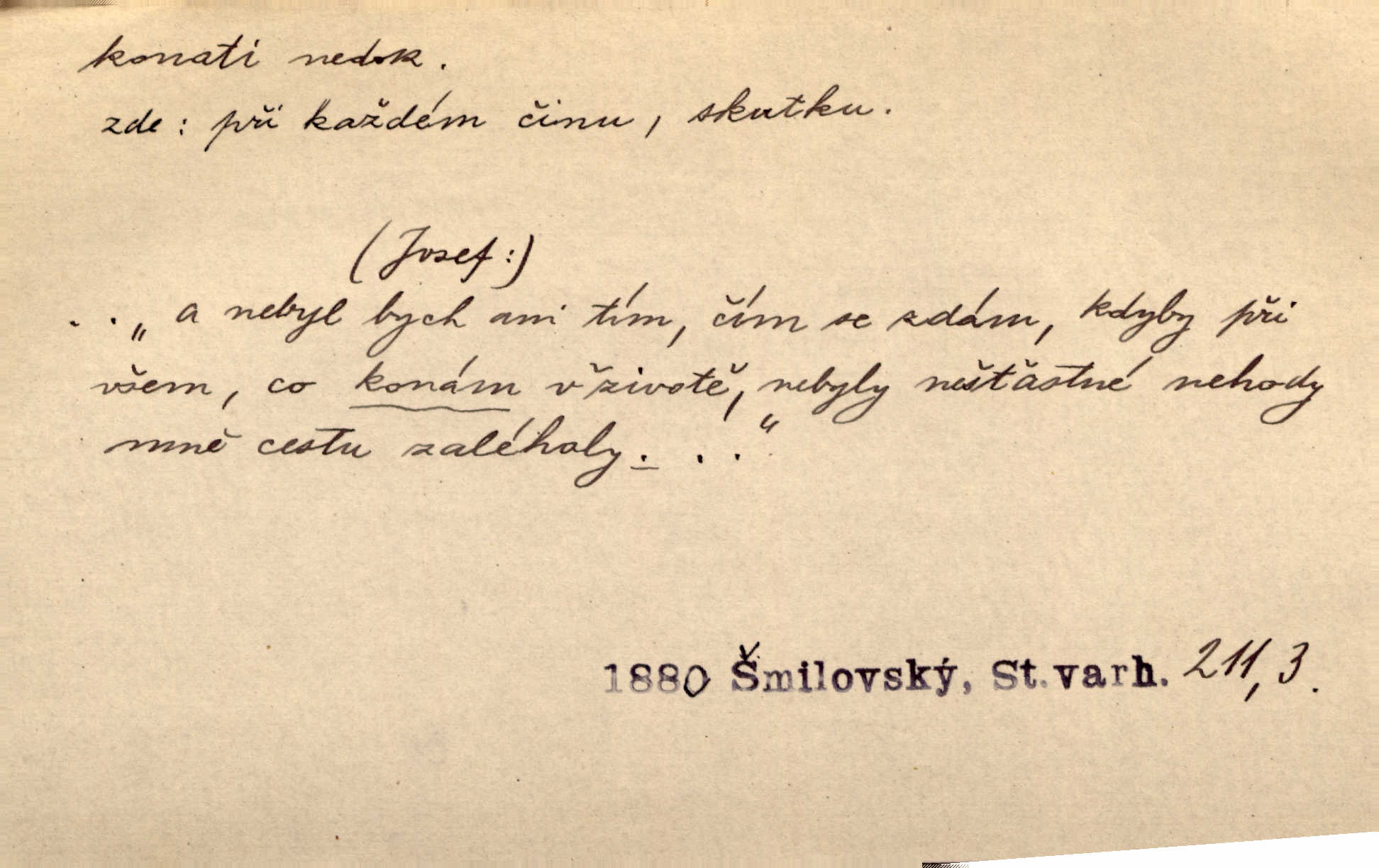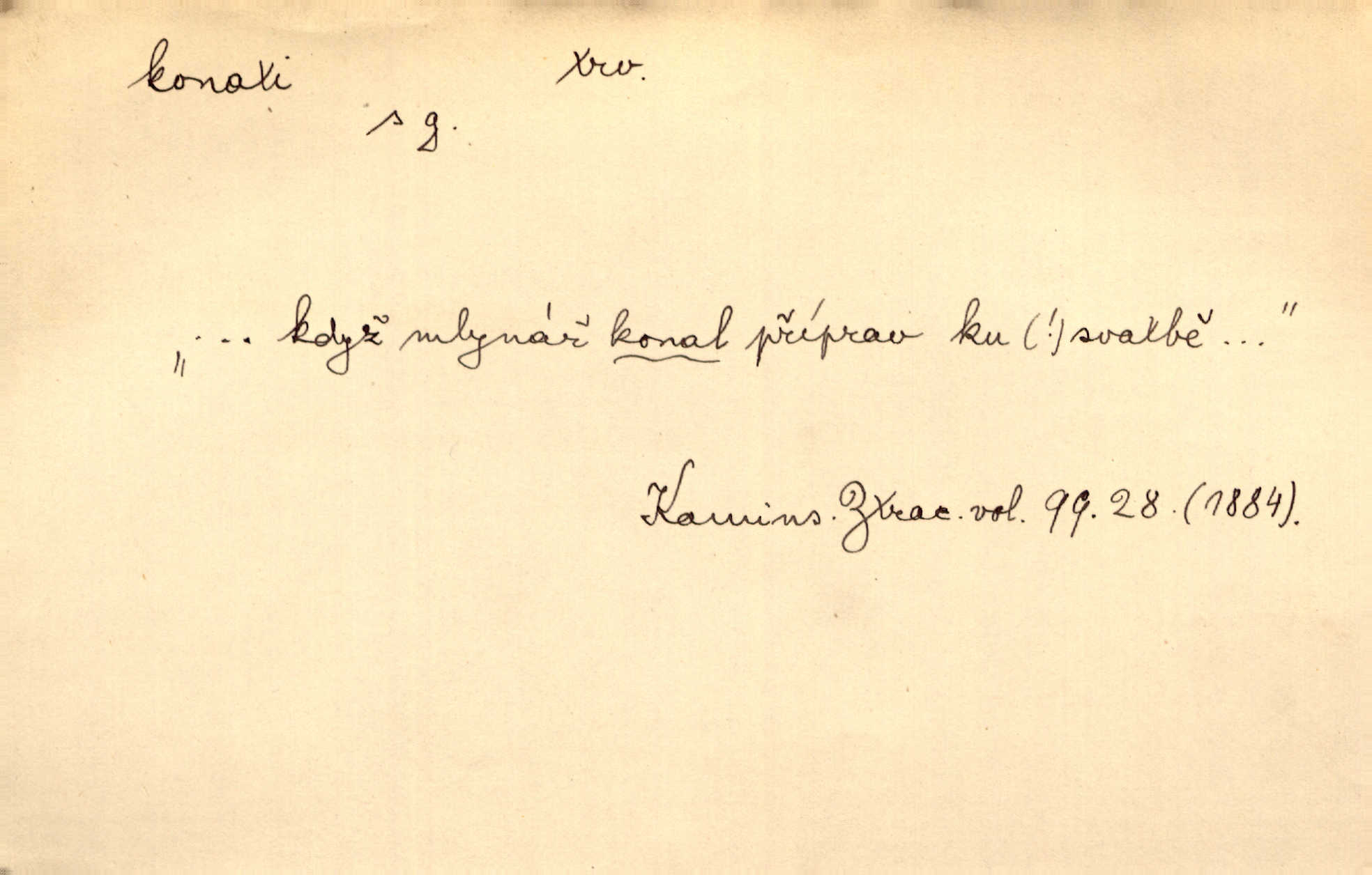 - konati ned. dělati, činiti, prováděti. Konej, co musíš, rád. Něm. Služeb poddanských Chodové nekonali žádných. Jir. Bedlivě konala přípravy. Zey. Budeť nám dalekou cestu dnes konati. Čel. Konali jste svou povinnost řídíce se zákonem. Bozd. Turci konali veřejné modlitby za poděkování Allahovi. Hol. Pochybuji, že by kdy byla zkouška z českého jazyka konána s tak vážnou zevnitrností, jako tato [v Moskvě]. Havl. Konati schůze, přednášky, pokusy, měření a p.