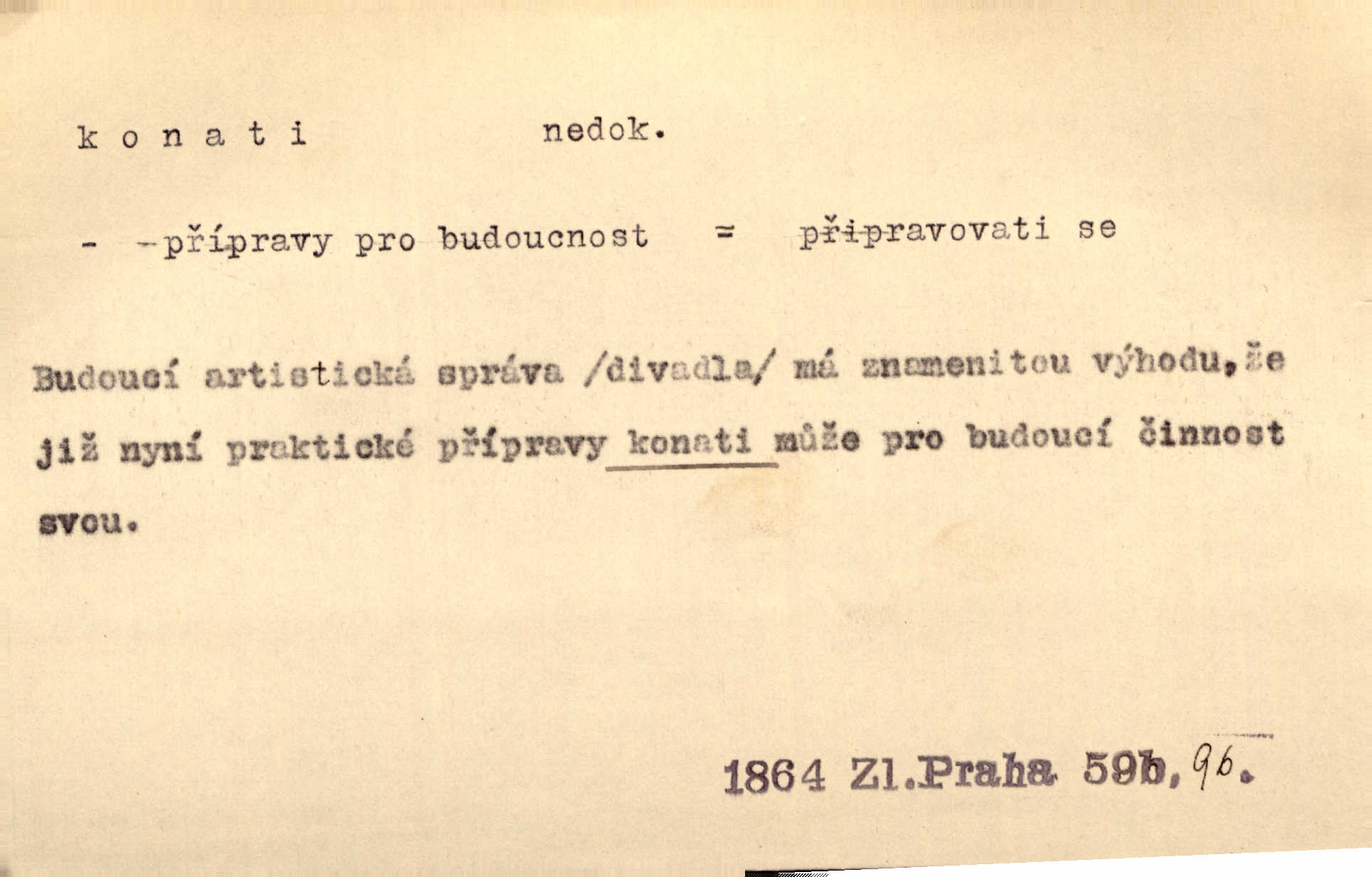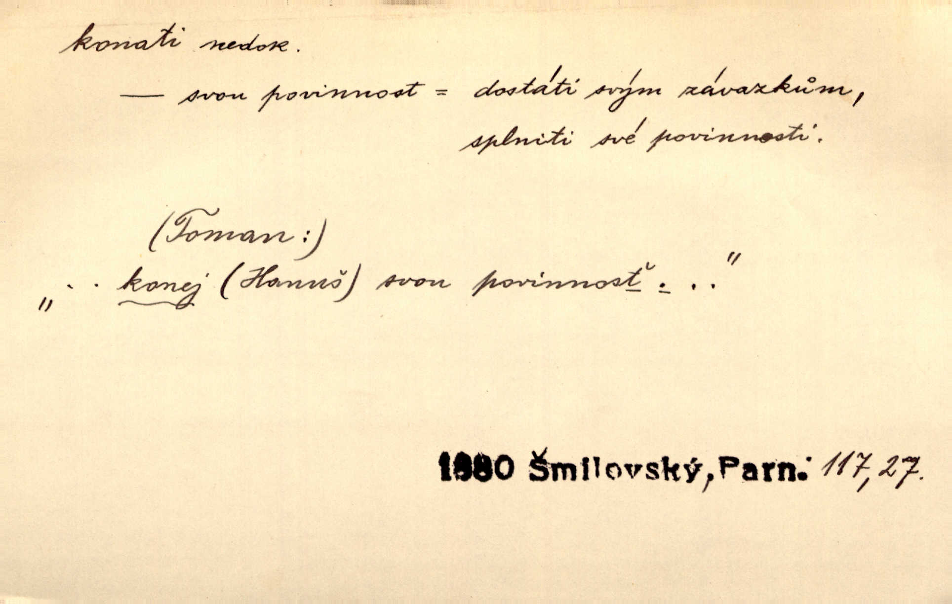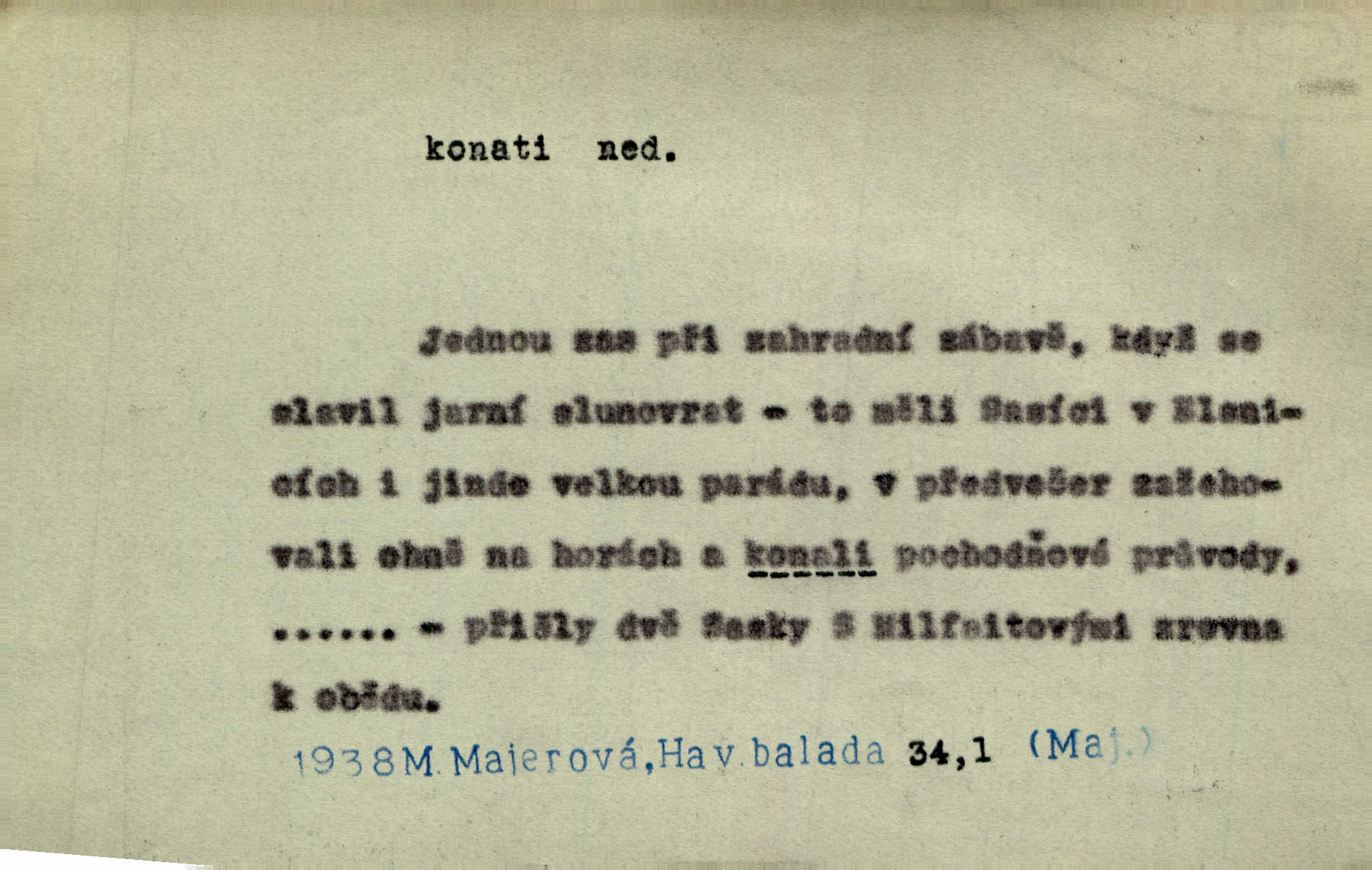 - konati ned. dělati, činiti, prováděti. Konej, co musíš, rád. Něm. Služeb poddanských Chodové nekonali žádných. Jir. Bedlivě konala přípravy. Zey. Budeť nám dalekou cestu dnes konati. Čel. Konali jste svou povinnost řídíce se zákonem. Bozd. Turci konali veřejné modlitby za poděkování Allahovi. Hol. Pochybuji, že by kdy byla zkouška z českého jazyka konána s tak vážnou zevnitrností, jako tato [v Moskvě]. Havl. Konati schůze, přednášky, pokusy, měření a p.