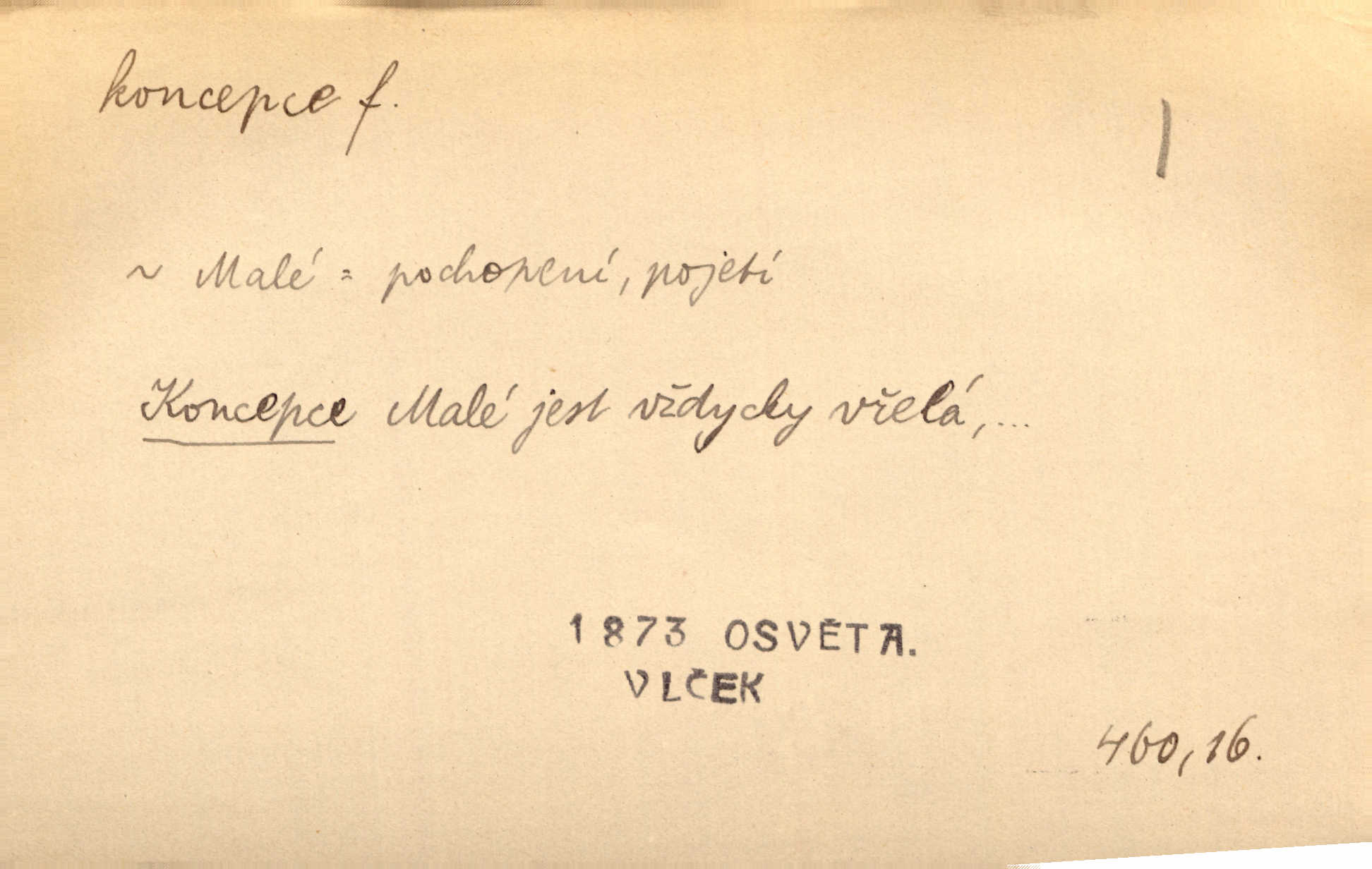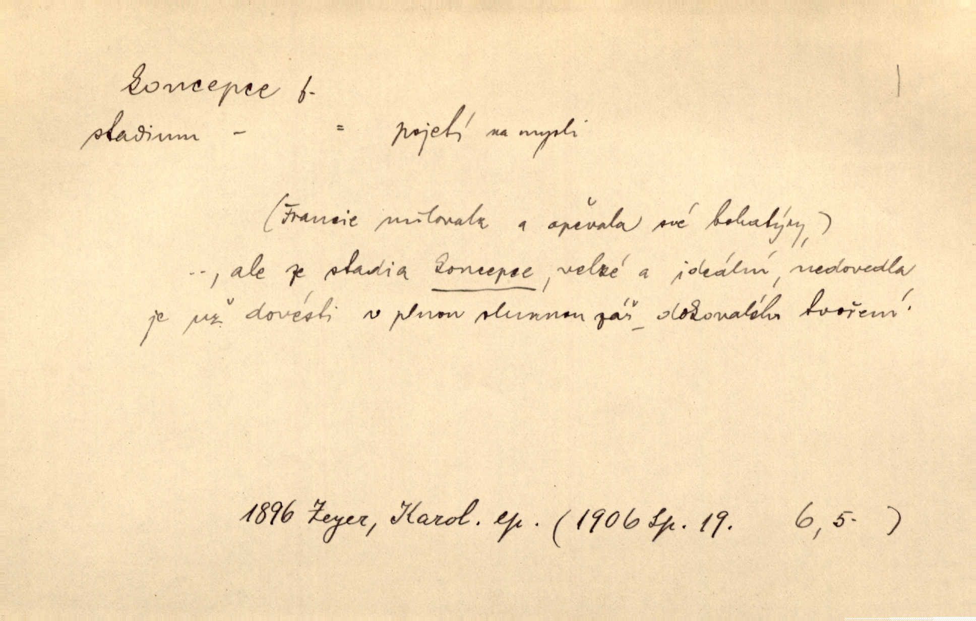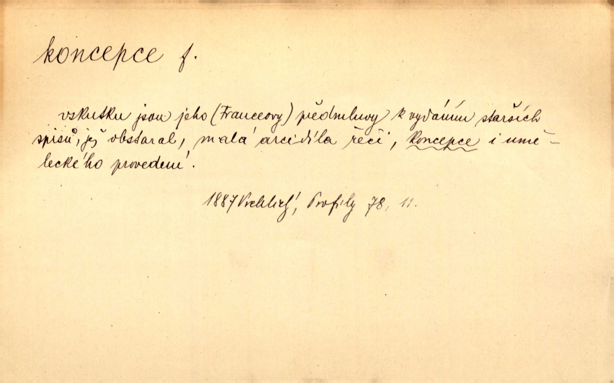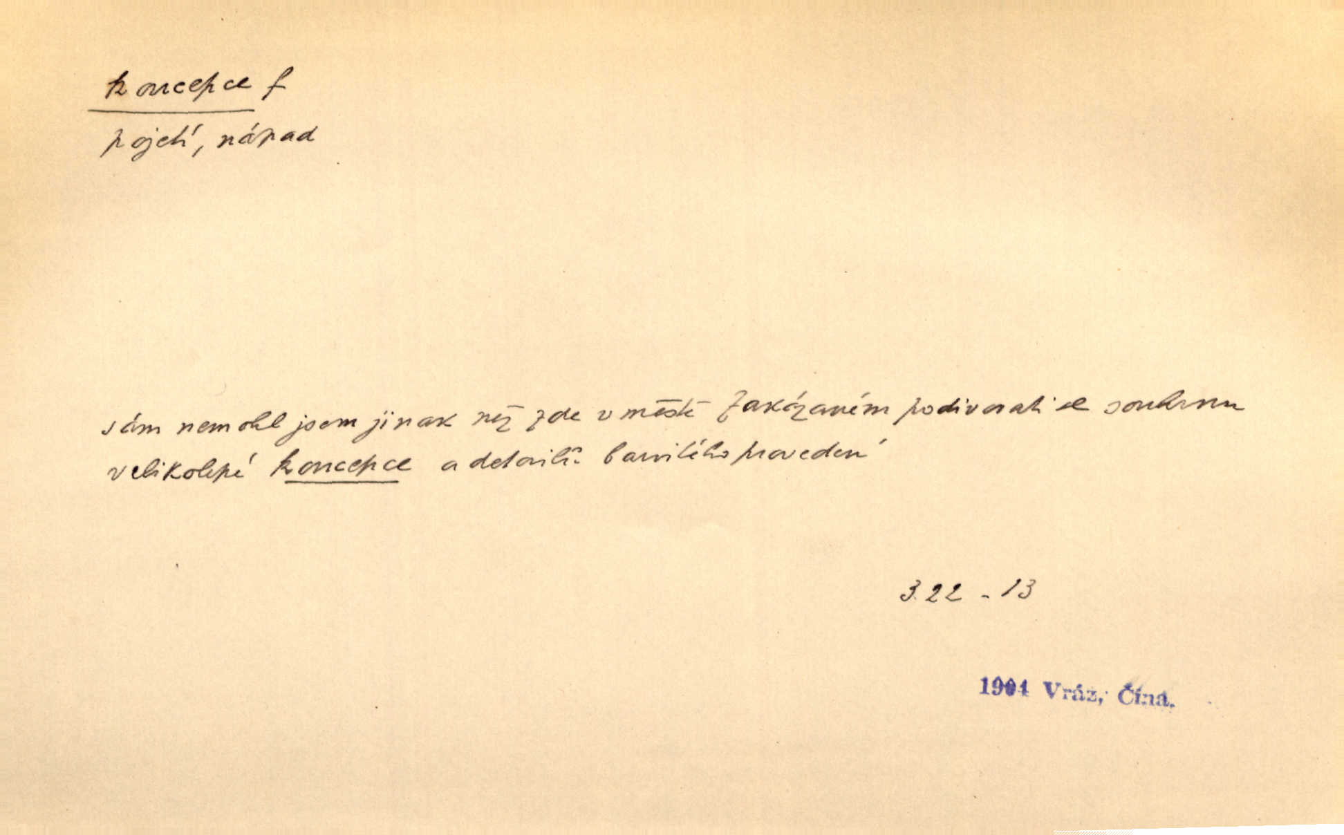 - koncepce, -e f. první rozvrh, plán k vytvoření něčeho, pojetí. Až dotud byl Fábr veliký v sujetu, koncepci a komposici, ale podprostřední kreslíř. Čap. Ch. V koncepci, v tom, co jest dílem sestavovací fantasie, jest obojí [umění a věda] zcela jedno. Durd. To, co navrhl [Valdštejn]‚ byla rebelie, revoluční plán veliké koncepce. Pek. D Biol. početí, vniknutí spermatozoa do vajíčka.