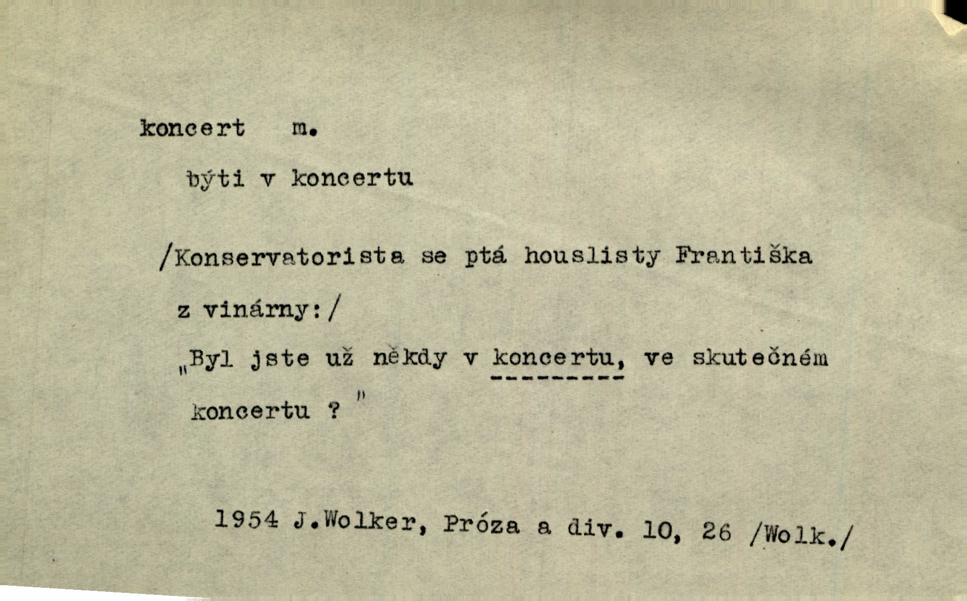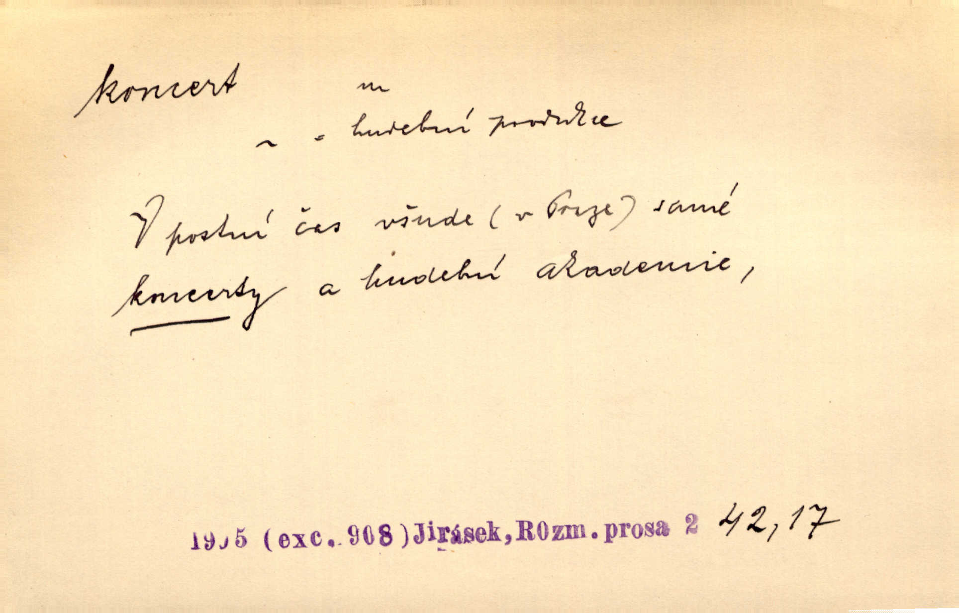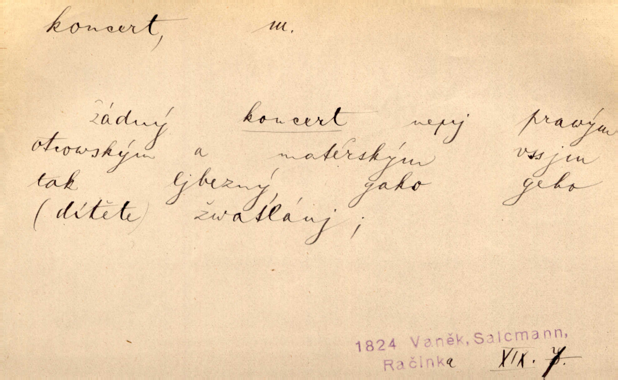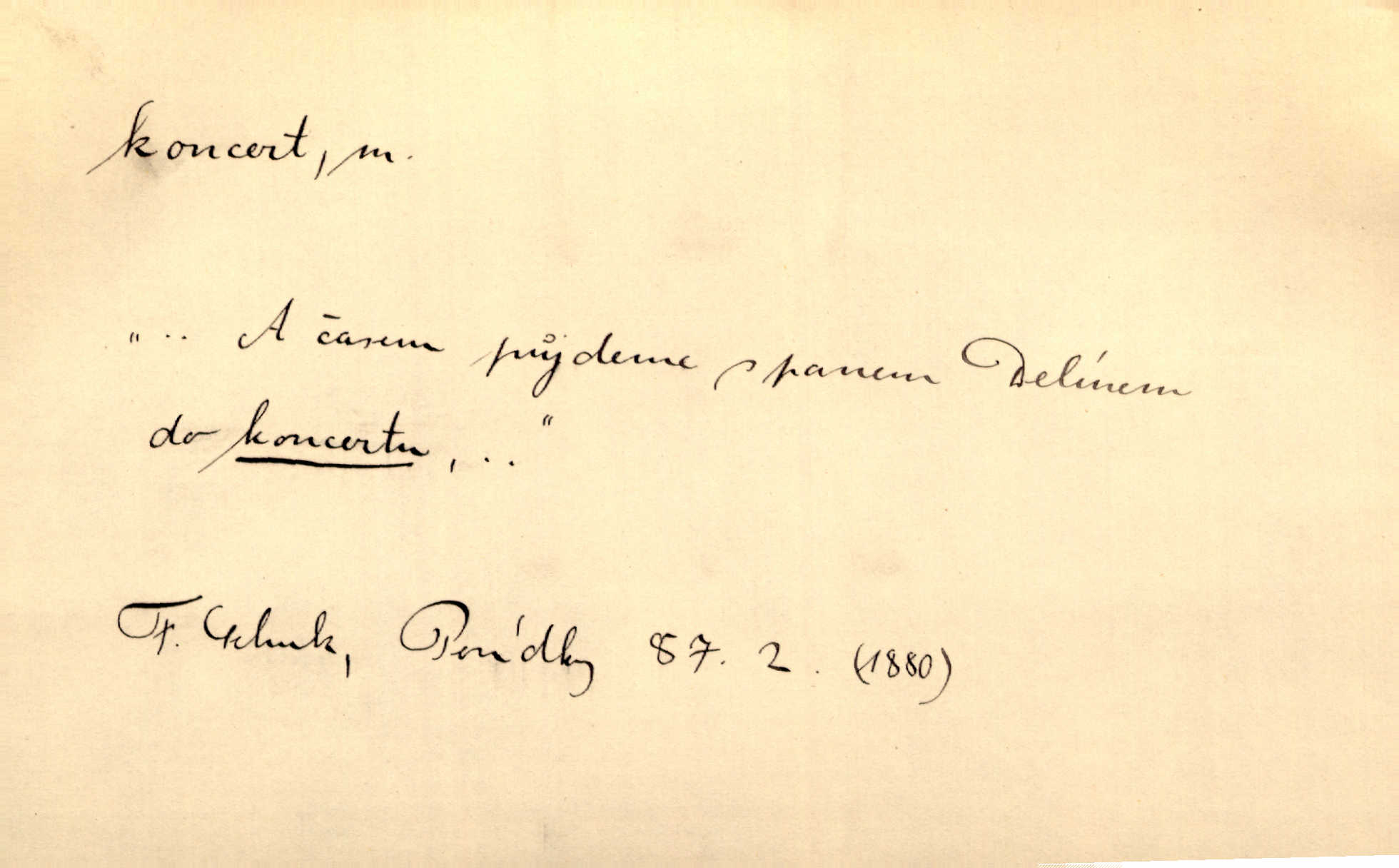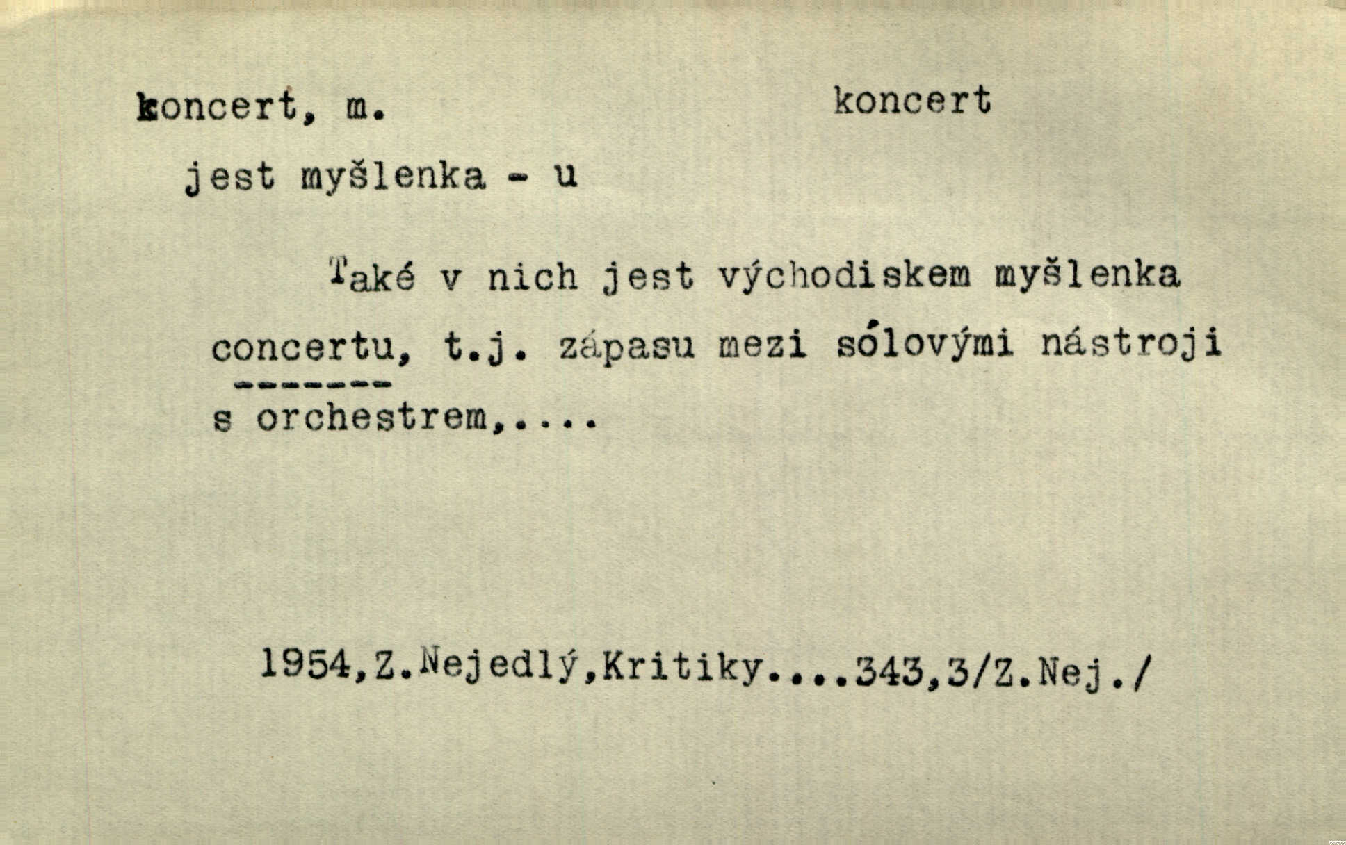 - koncert, -u m. veřejné provozování hudební skladby. Dobročinný koncert „ve prospěch invalidů, jejich vdov a sirotků“. K. Čap. D jakákoli jiná produkce. Drozd spustil nad lesem polední svůj koncert. Rais. Ty ostatní [děti] brečely na postelích. To bývaly koncerty, pro Krista Pána. Kun. Pan Mlacker začal jíst — koncert pro oči, kde kdo se díval. Jedl, mlaskal, olizoval se. Mach. A mosím vám ešče říct, habeste jako stárci drželi pořádek. Ať se nestane nějaké koncert v hospodě rámus, pračka, výtržnost. A. Mrš. On [Úprka] jediný sám syn té země chápe a cítí právě ty nejvyšší koncerty barev, které jsou mu dány. V. Mrš. D větší, technicky nesnadná hudební skladba pro sólový nástroj s doprovodem orchestru. Hrál [Slavík] svůj koncert do A-moll. Obr. živ. D Zř. dohoda. Smlouva se Saskem podmiňovala a předpokládala zároveň smlouvu širší, „koncert“ proti Prusku. Goll.