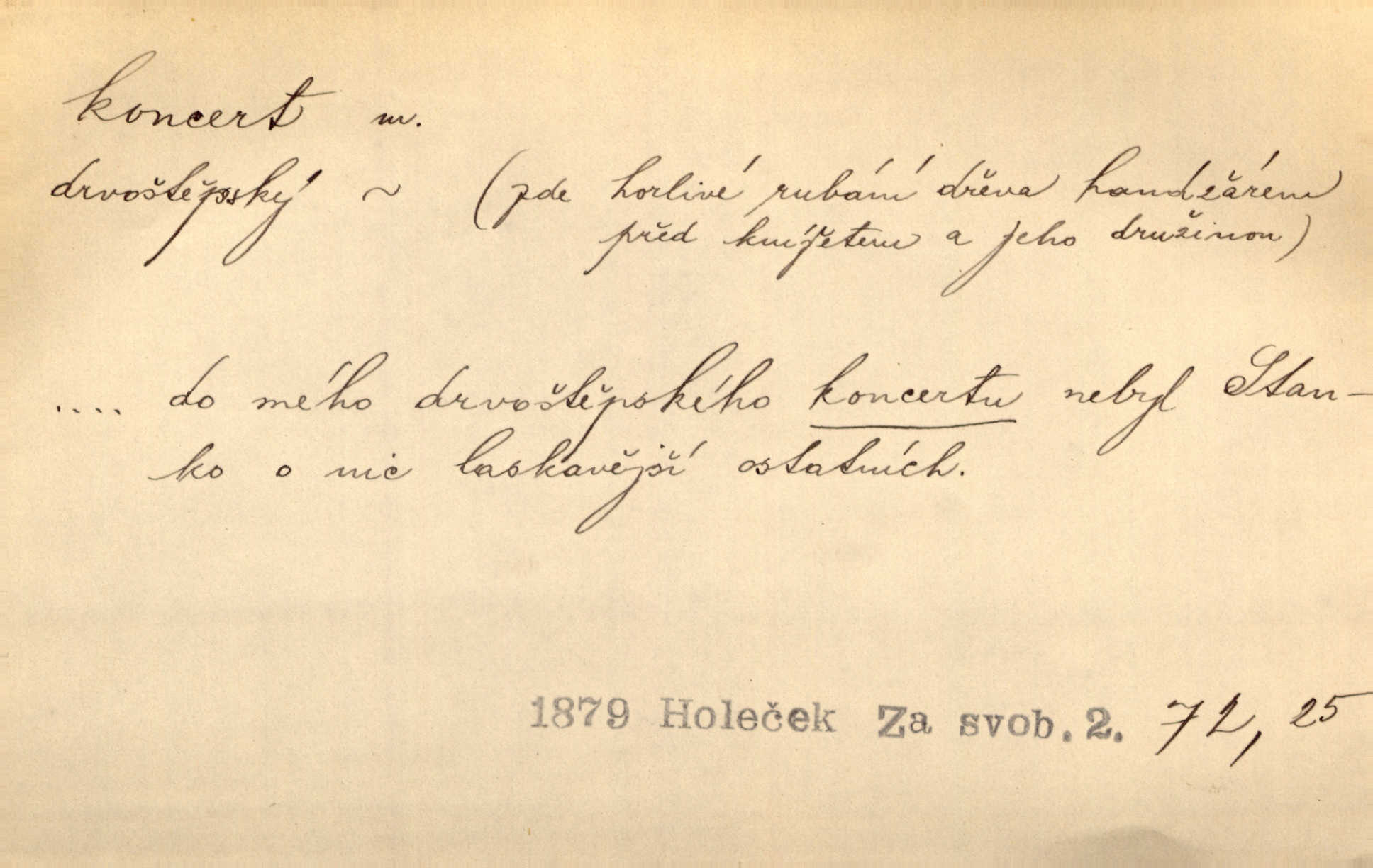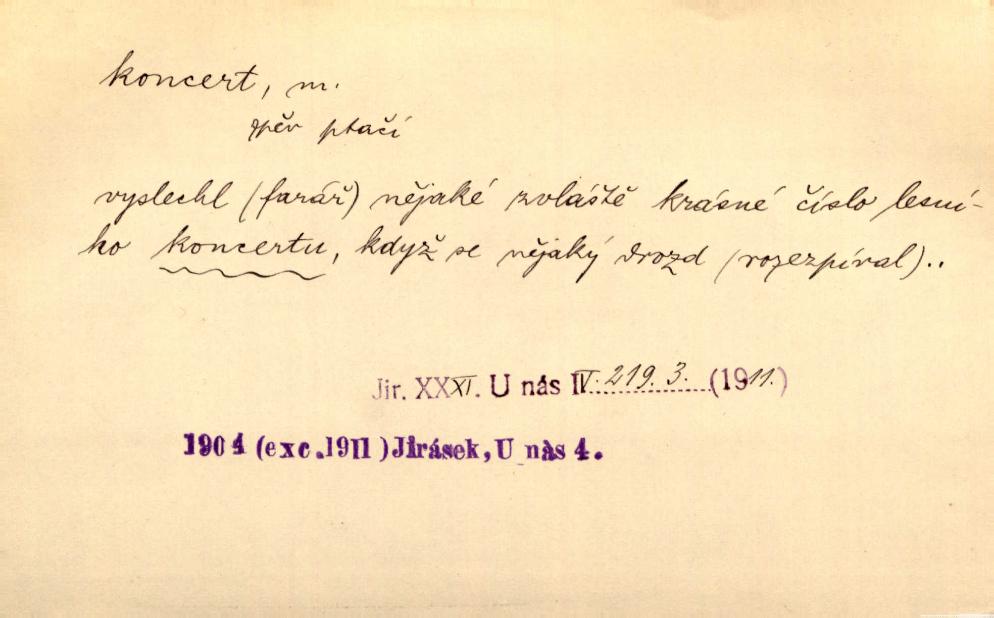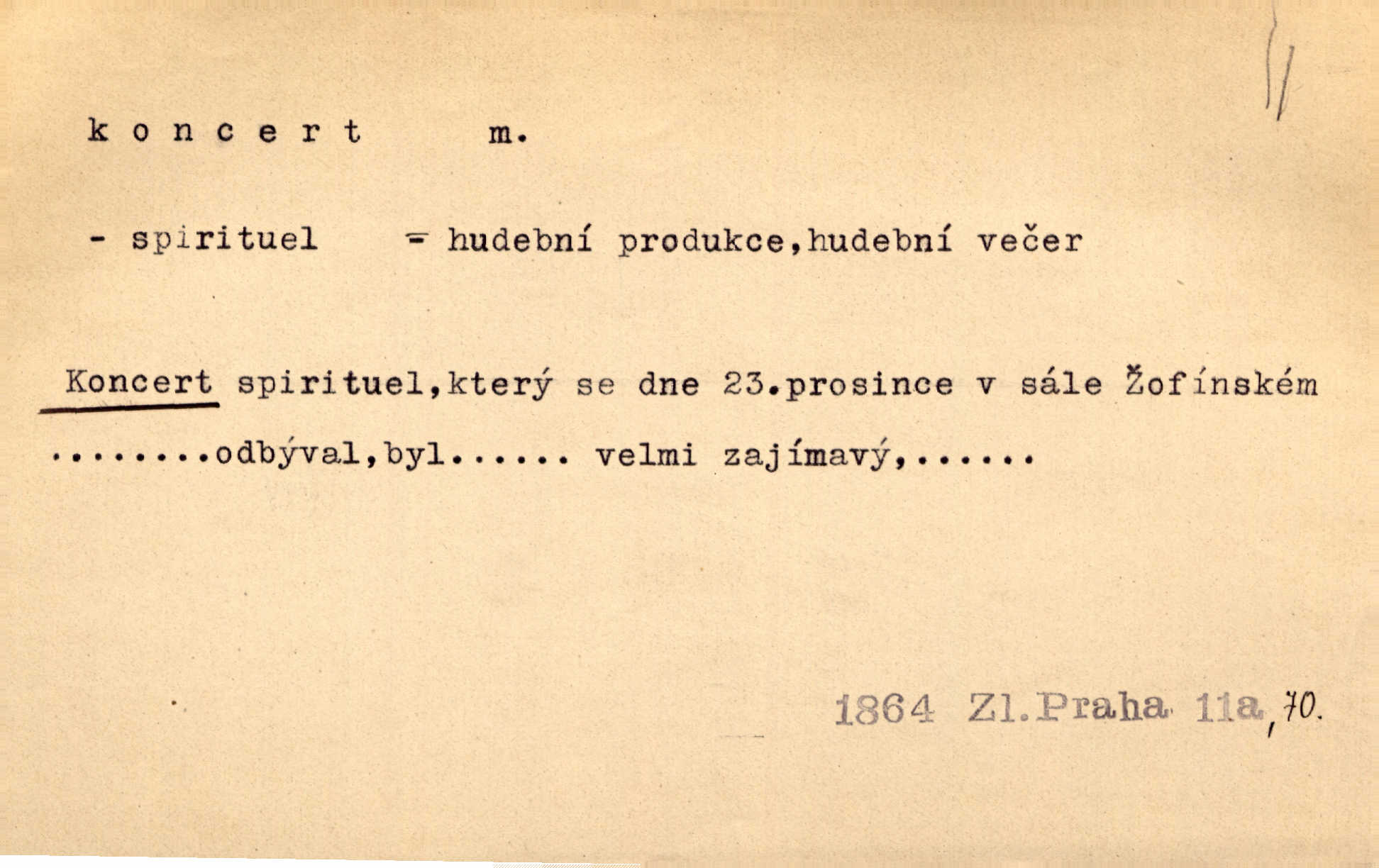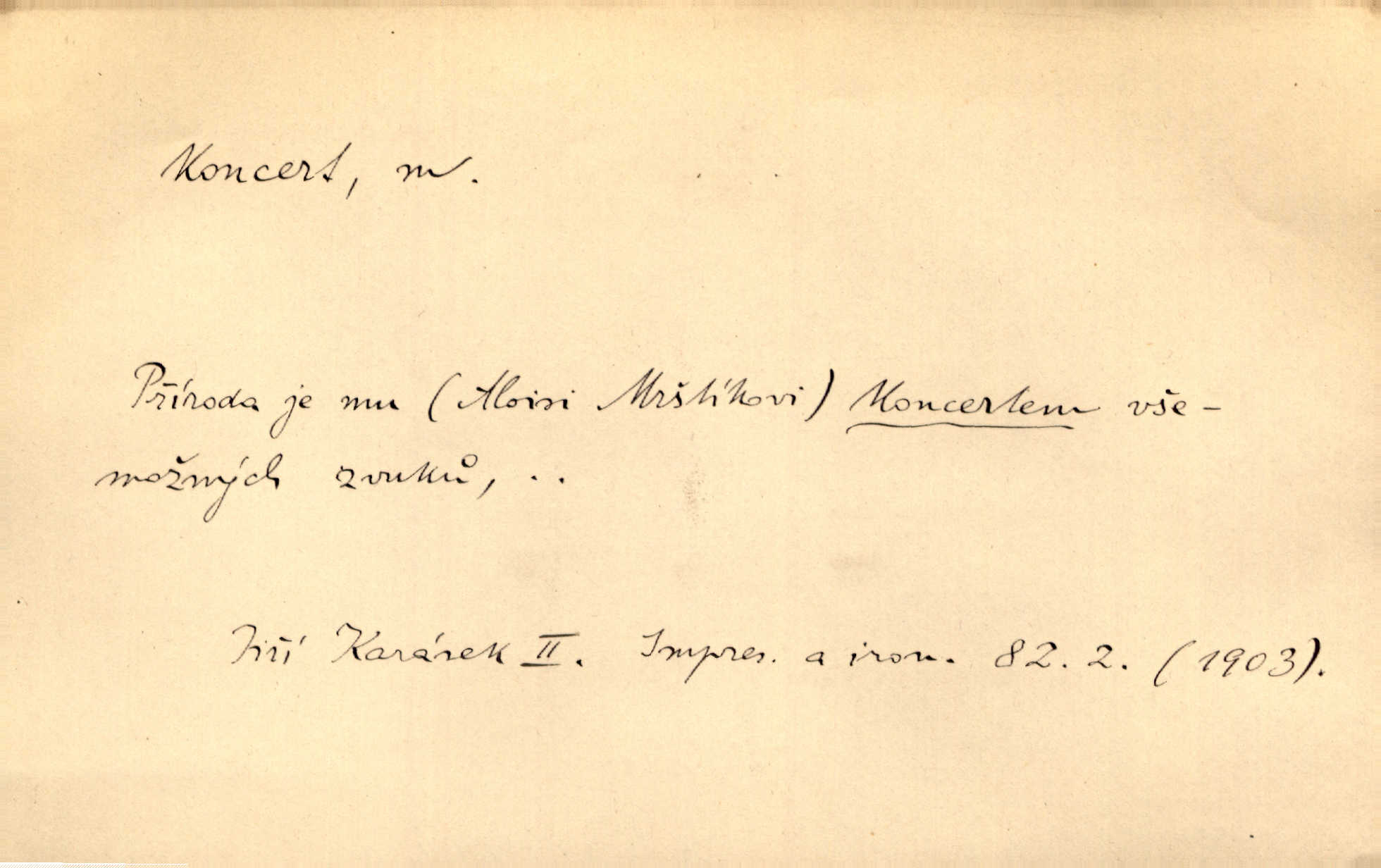 - koncert, -u m. veřejné provozování hudební skladby. Dobročinný koncert „ve prospěch invalidů, jejich vdov a sirotků“. K. Čap. D jakákoli jiná produkce. Drozd spustil nad lesem polední svůj koncert. Rais. Ty ostatní [děti] brečely na postelích. To bývaly koncerty, pro Krista Pána. Kun. Pan Mlacker začal jíst — koncert pro oči, kde kdo se díval. Jedl, mlaskal, olizoval se. Mach. A mosím vám ešče říct, habeste jako stárci drželi pořádek. Ať se nestane nějaké koncert v hospodě rámus, pračka, výtržnost. A. Mrš. On [Úprka] jediný sám syn té země chápe a cítí právě ty nejvyšší koncerty barev, které jsou mu dány. V. Mrš. D větší, technicky nesnadná hudební skladba pro sólový nástroj s doprovodem orchestru. Hrál [Slavík] svůj koncert do A-moll. Obr. živ. D Zř. dohoda. Smlouva se Saskem podmiňovala a předpokládala zároveň smlouvu širší, „koncert“ proti Prusku. Goll.