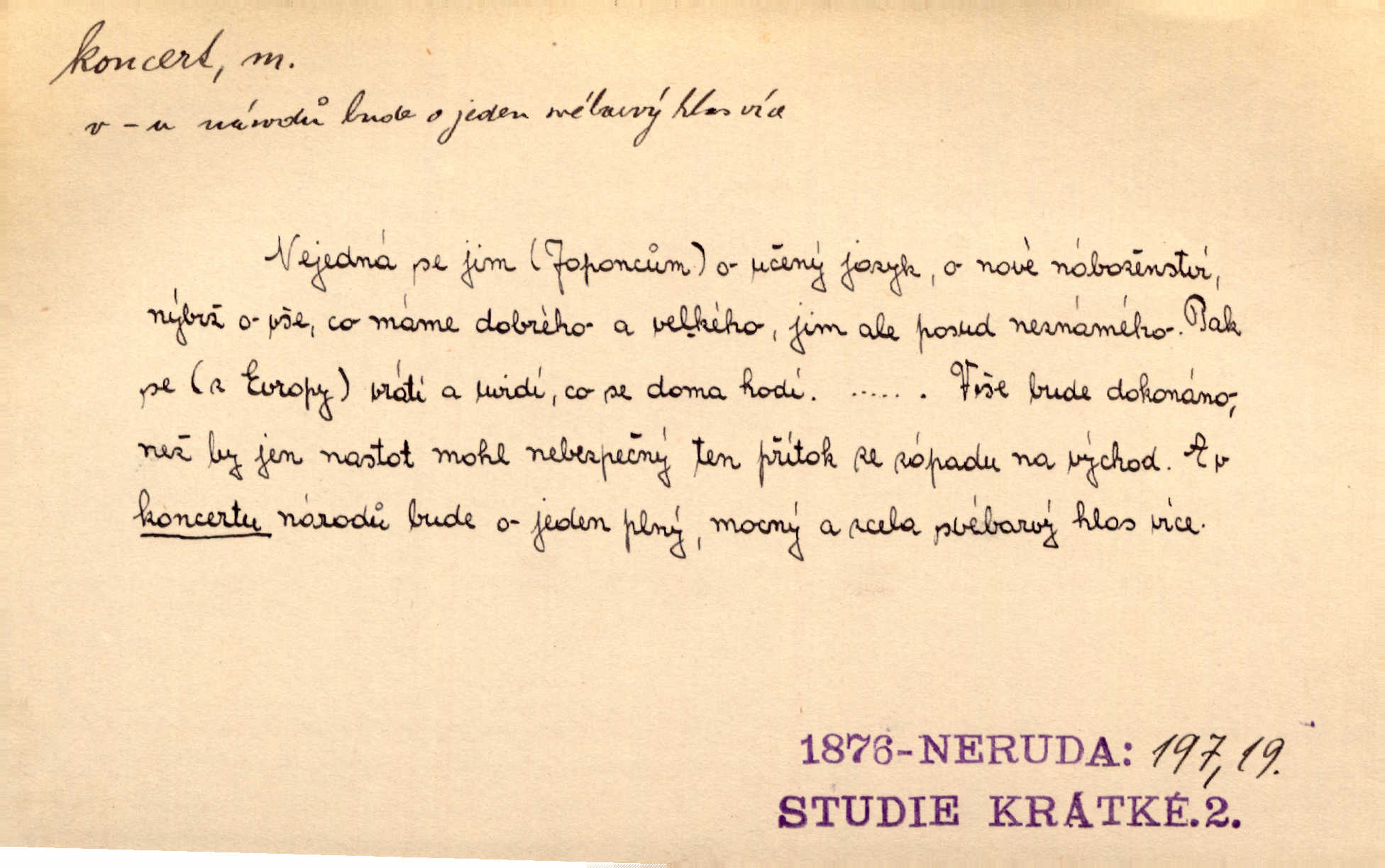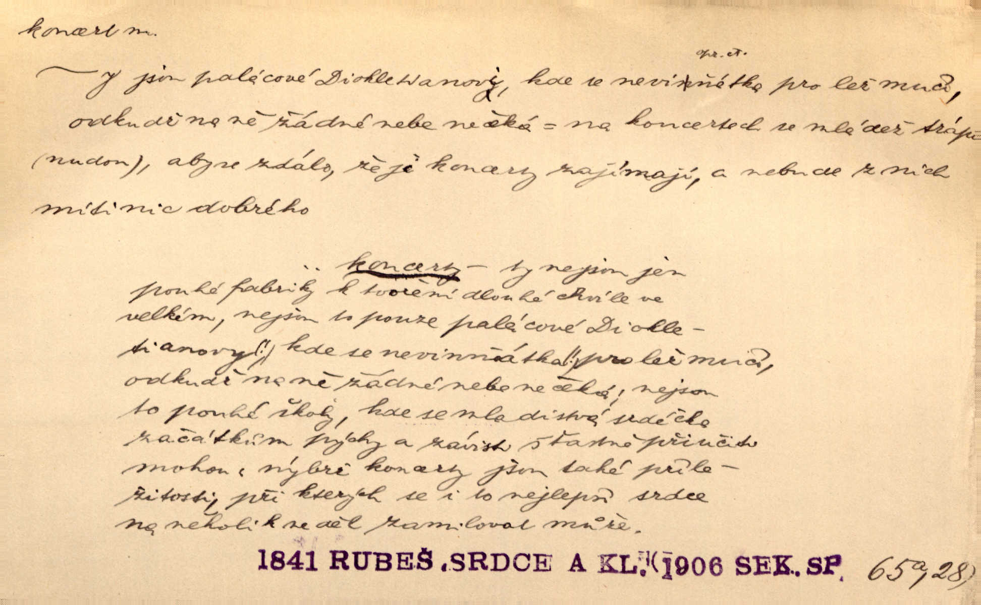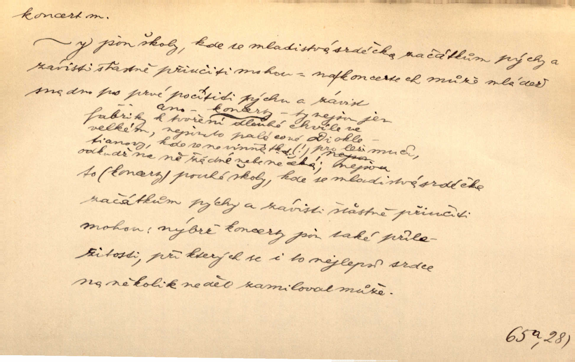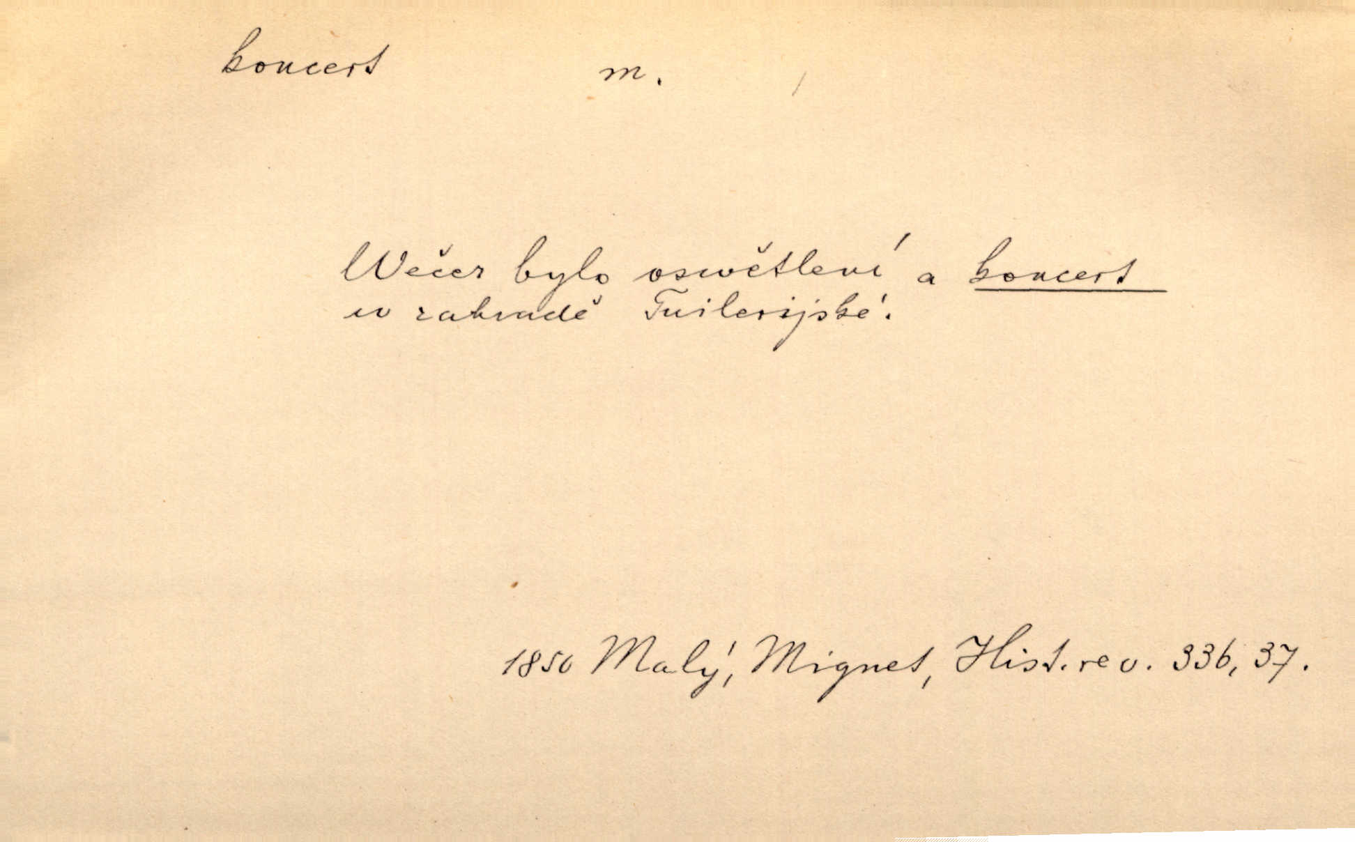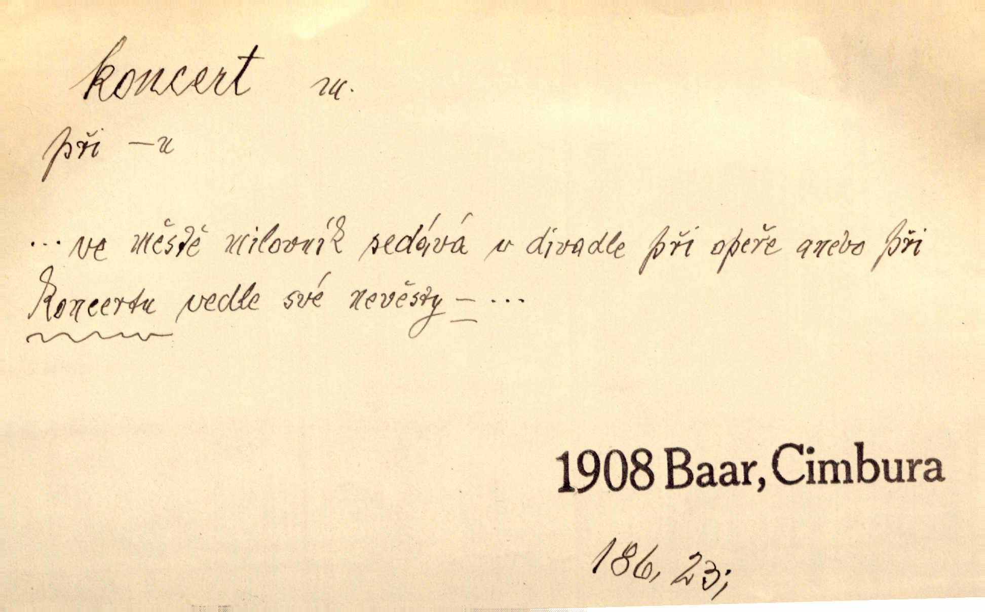 - koncert, -u m. veřejné provozování hudební skladby. Dobročinný koncert „ve prospěch invalidů, jejich vdov a sirotků“. K. Čap. D jakákoli jiná produkce. Drozd spustil nad lesem polední svůj koncert. Rais. Ty ostatní [děti] brečely na postelích. To bývaly koncerty, pro Krista Pána. Kun. Pan Mlacker začal jíst — koncert pro oči, kde kdo se díval. Jedl, mlaskal, olizoval se. Mach. A mosím vám ešče říct, habeste jako stárci drželi pořádek. Ať se nestane nějaké koncert v hospodě rámus, pračka, výtržnost. A. Mrš. On [Úprka] jediný sám syn té země chápe a cítí právě ty nejvyšší koncerty barev, které jsou mu dány. V. Mrš. D větší, technicky nesnadná hudební skladba pro sólový nástroj s doprovodem orchestru. Hrál [Slavík] svůj koncert do A-moll. Obr. živ. D Zř. dohoda. Smlouva se Saskem podmiňovala a předpokládala zároveň smlouvu širší, „koncert“ proti Prusku. Goll.