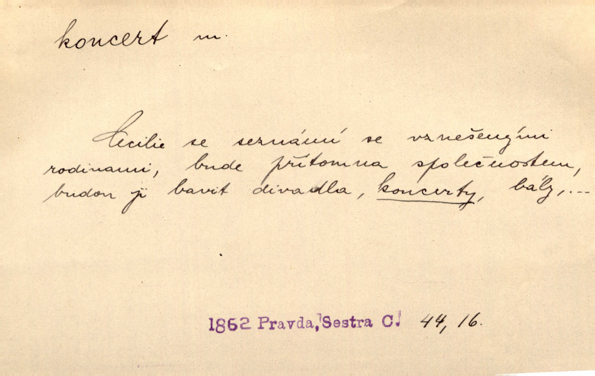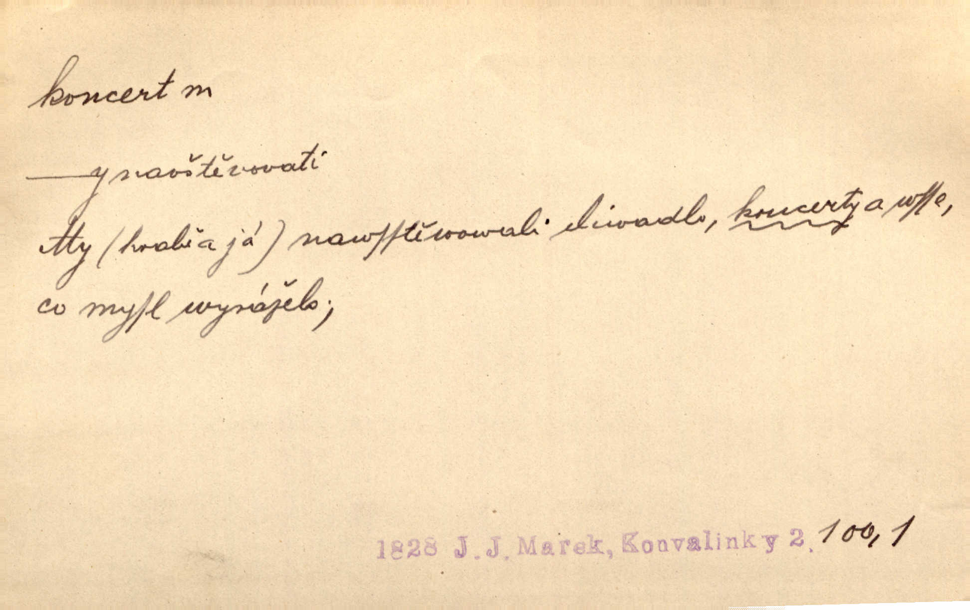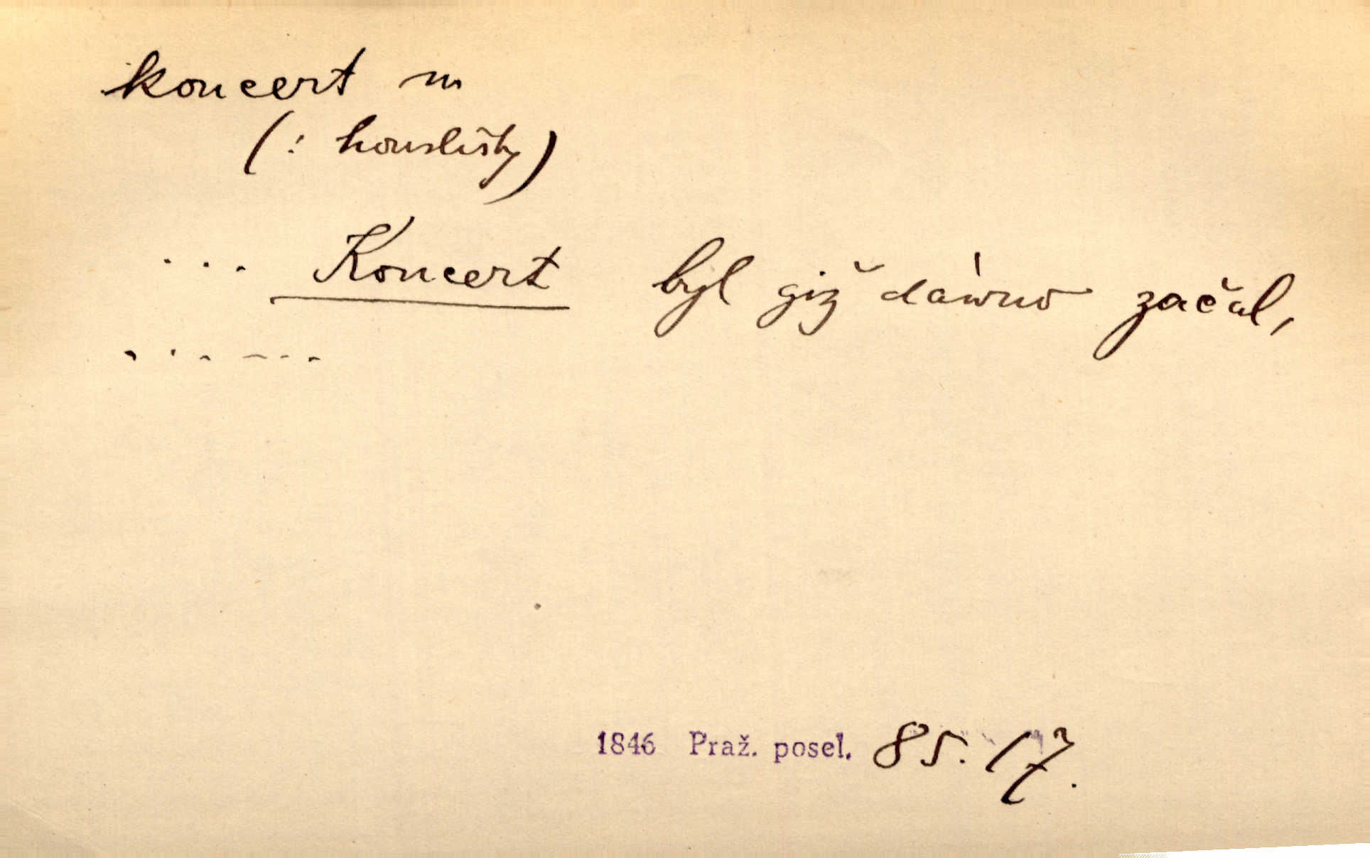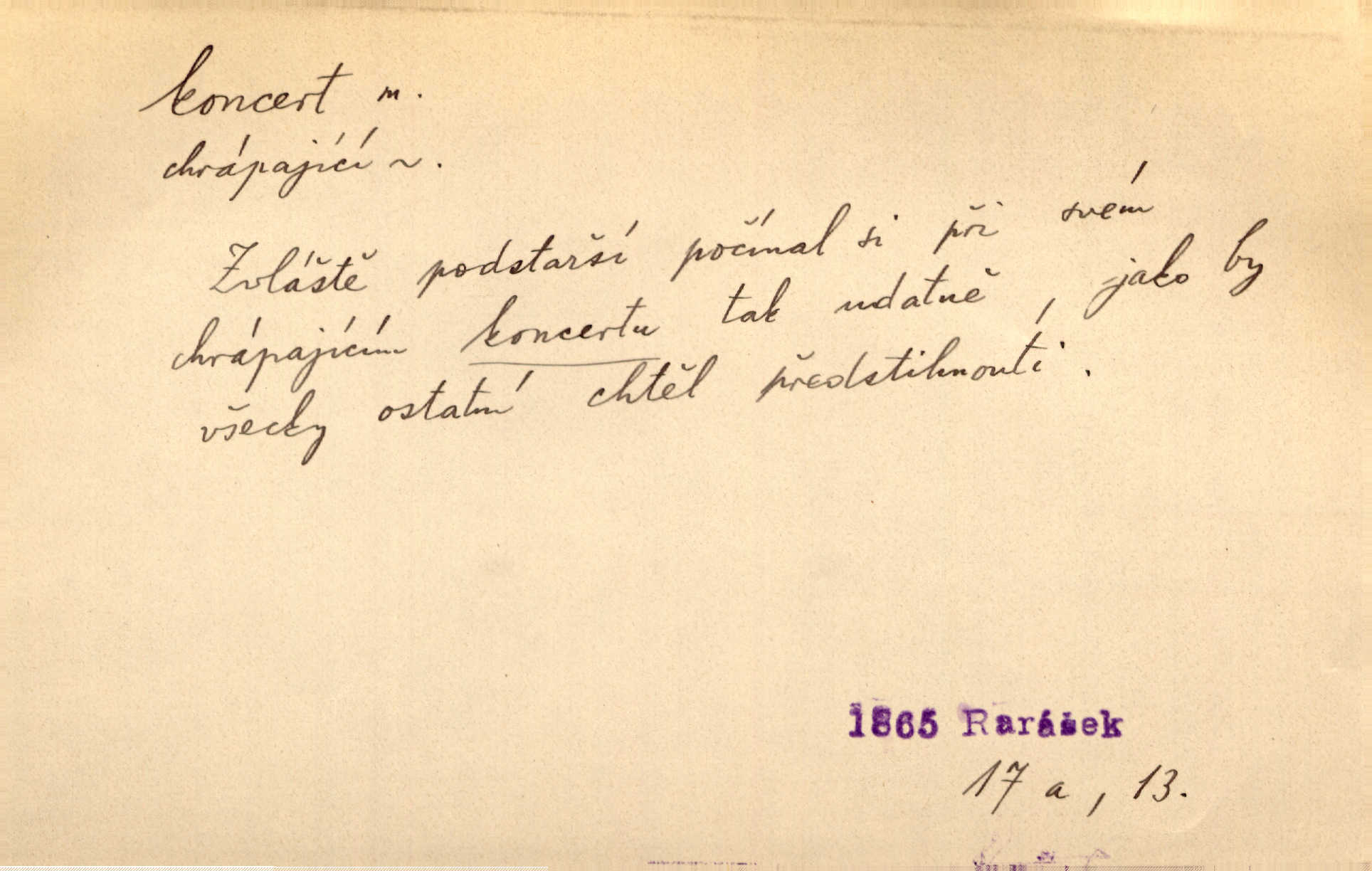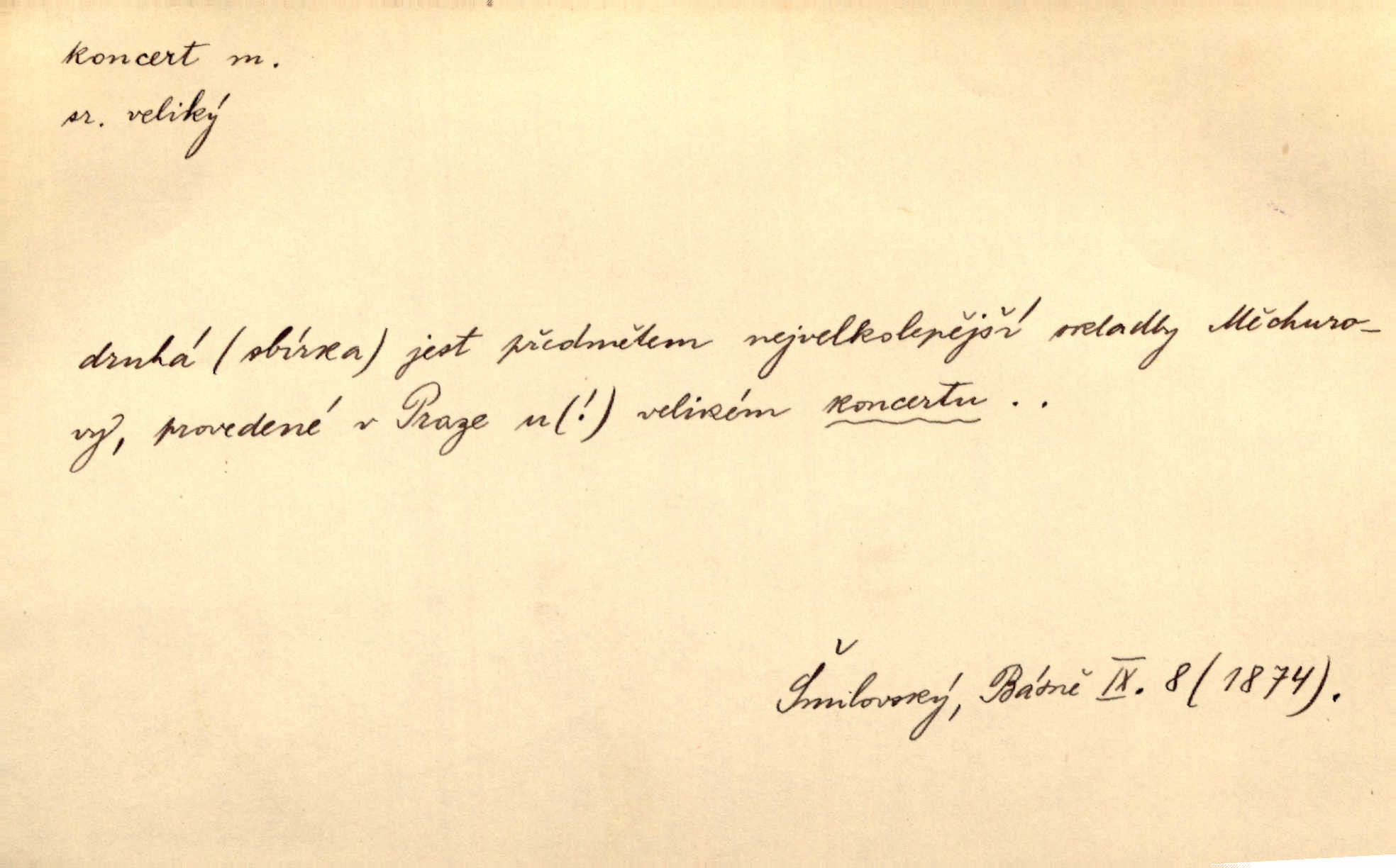 - koncert, -u m. veřejné provozování hudební skladby. Dobročinný koncert „ve prospěch invalidů, jejich vdov a sirotků“. K. Čap. D jakákoli jiná produkce. Drozd spustil nad lesem polední svůj koncert. Rais. Ty ostatní [děti] brečely na postelích. To bývaly koncerty, pro Krista Pána. Kun. Pan Mlacker začal jíst — koncert pro oči, kde kdo se díval. Jedl, mlaskal, olizoval se. Mach. A mosím vám ešče říct, habeste jako stárci drželi pořádek. Ať se nestane nějaké koncert v hospodě rámus, pračka, výtržnost. A. Mrš. On [Úprka] jediný sám syn té země chápe a cítí právě ty nejvyšší koncerty barev, které jsou mu dány. V. Mrš. D větší, technicky nesnadná hudební skladba pro sólový nástroj s doprovodem orchestru. Hrál [Slavík] svůj koncert do A-moll. Obr. živ. D Zř. dohoda. Smlouva se Saskem podmiňovala a předpokládala zároveň smlouvu širší, „koncert“ proti Prusku. Goll.