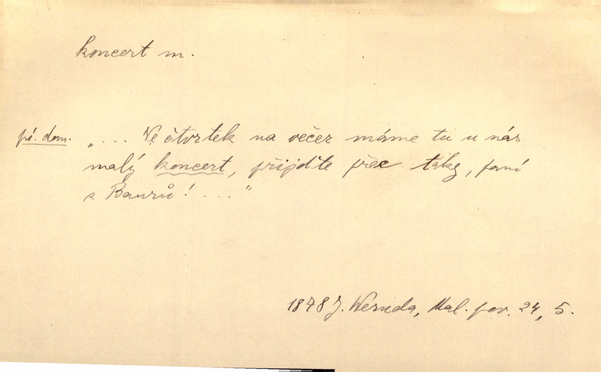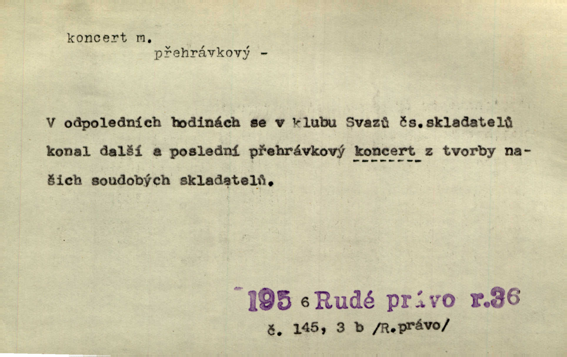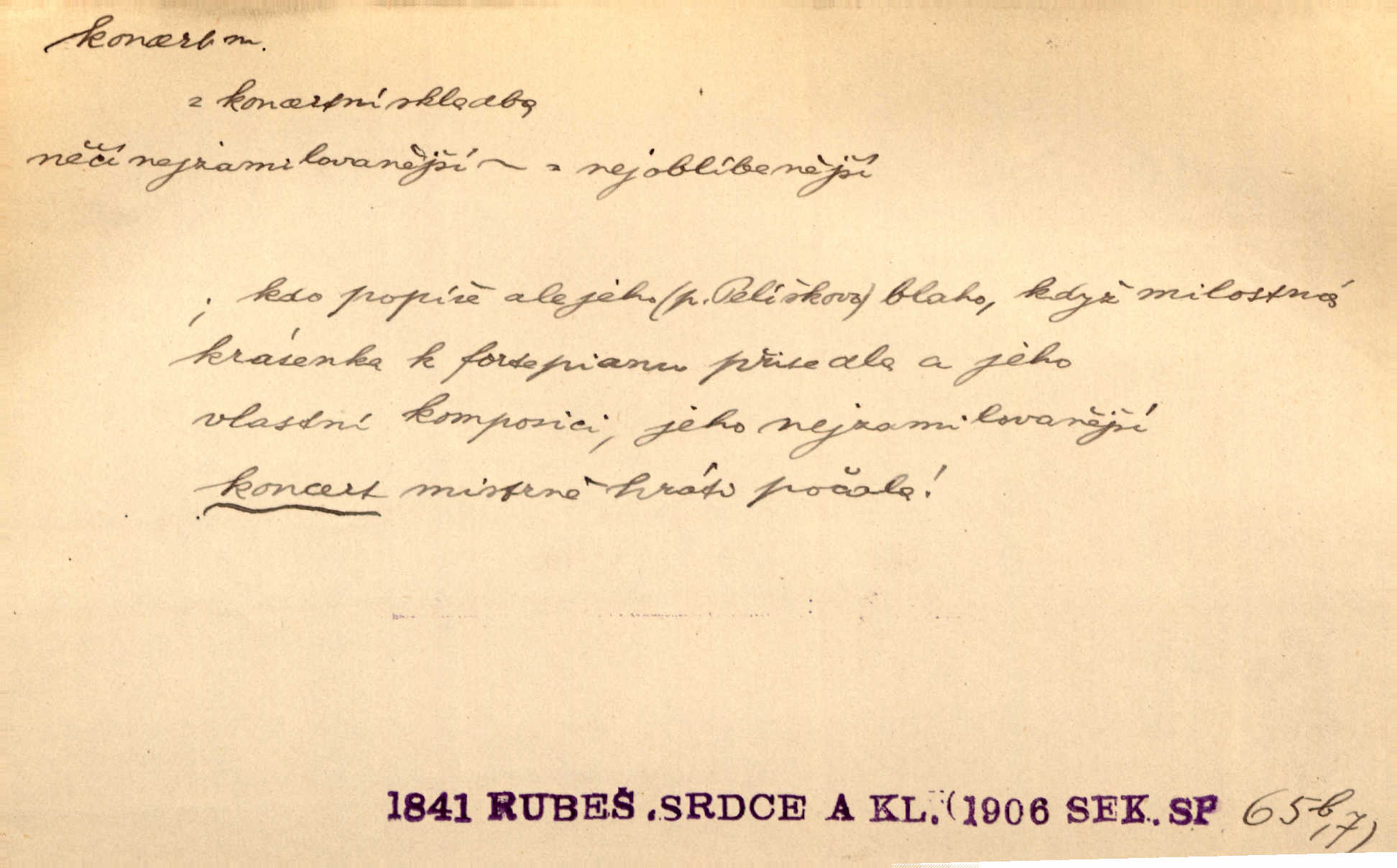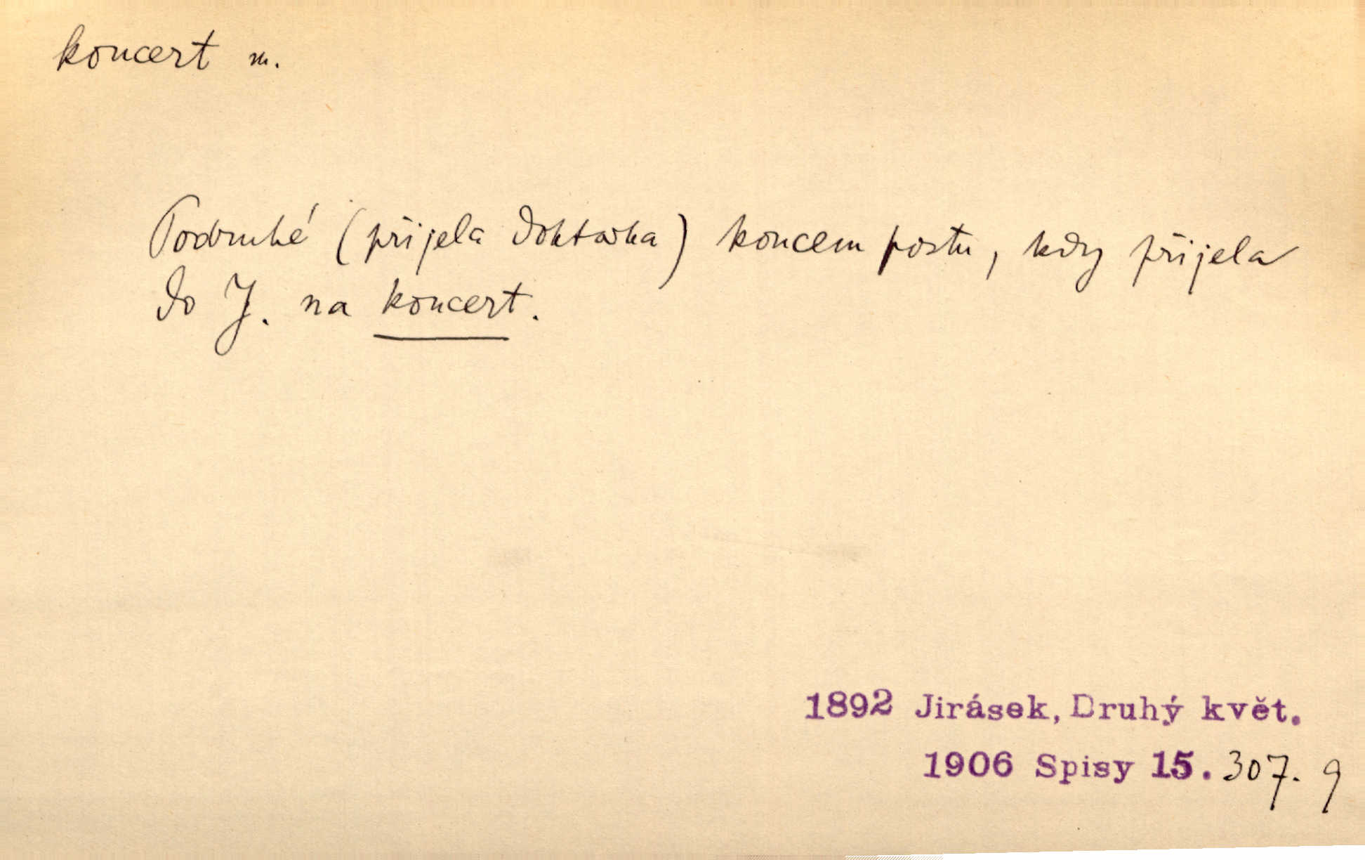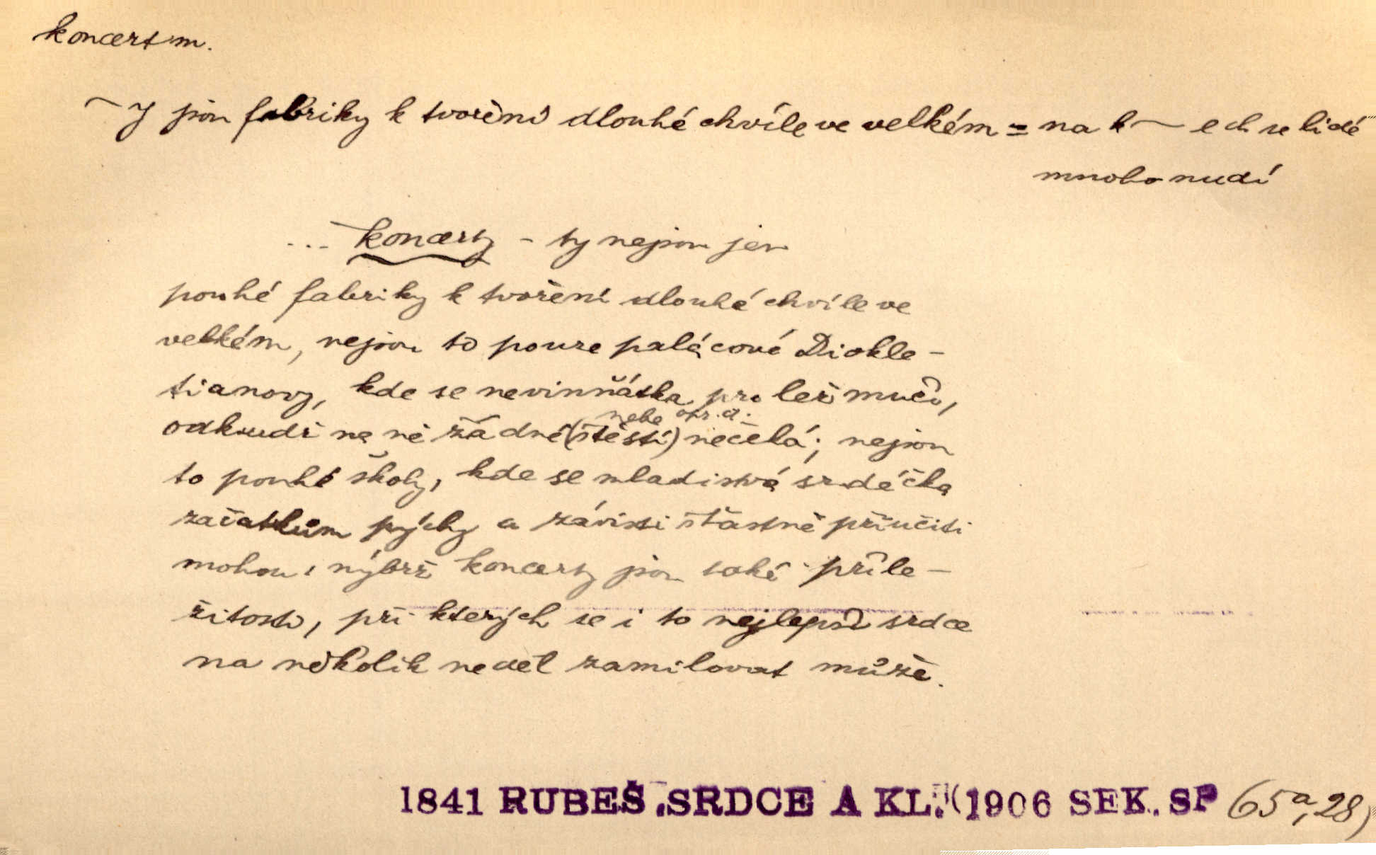 - koncert, -u m. veřejné provozování hudební skladby. Dobročinný koncert „ve prospěch invalidů, jejich vdov a sirotků“. K. Čap. D jakákoli jiná produkce. Drozd spustil nad lesem polední svůj koncert. Rais. Ty ostatní [děti] brečely na postelích. To bývaly koncerty, pro Krista Pána. Kun. Pan Mlacker začal jíst — koncert pro oči, kde kdo se díval. Jedl, mlaskal, olizoval se. Mach. A mosím vám ešče říct, habeste jako stárci drželi pořádek. Ať se nestane nějaké koncert v hospodě rámus, pračka, výtržnost. A. Mrš. On [Úprka] jediný sám syn té země chápe a cítí právě ty nejvyšší koncerty barev, které jsou mu dány. V. Mrš. D větší, technicky nesnadná hudební skladba pro sólový nástroj s doprovodem orchestru. Hrál [Slavík] svůj koncert do A-moll. Obr. živ. D Zř. dohoda. Smlouva se Saskem podmiňovala a předpokládala zároveň smlouvu širší, „koncert“ proti Prusku. Goll.