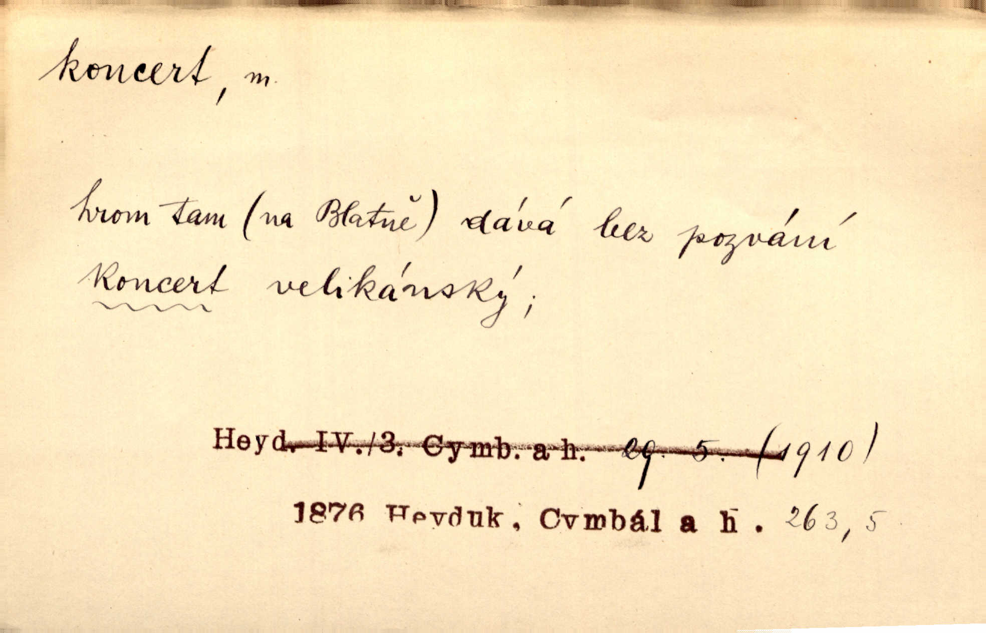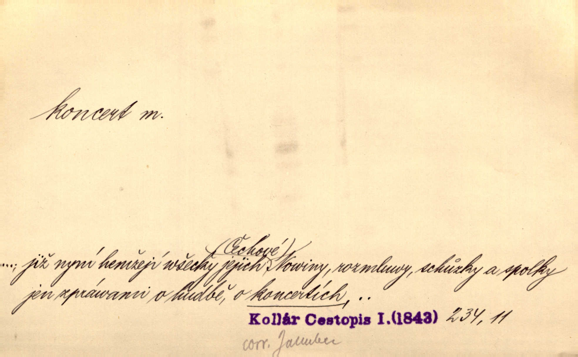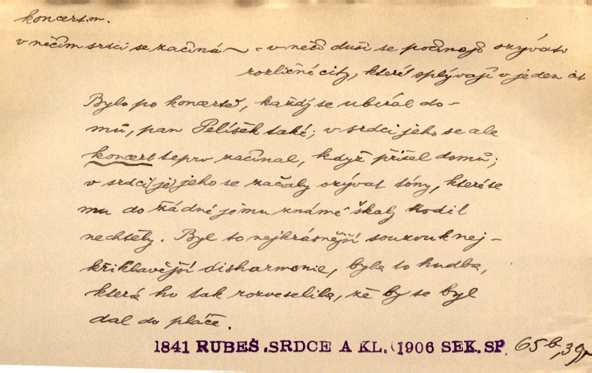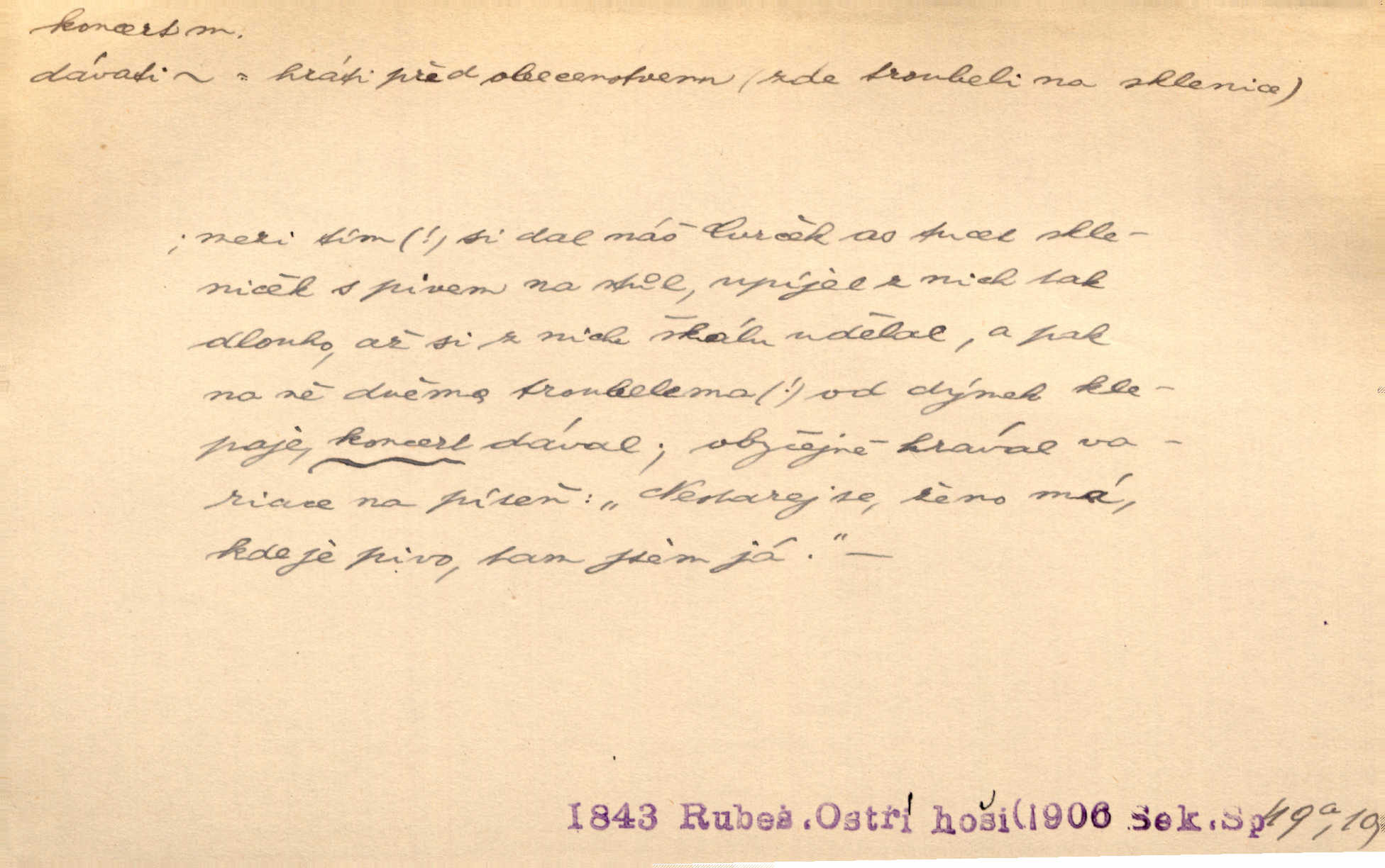 - koncert, -u m. veřejné provozování hudební skladby. Dobročinný koncert „ve prospěch invalidů, jejich vdov a sirotků“. K. Čap. D jakákoli jiná produkce. Drozd spustil nad lesem polední svůj koncert. Rais. Ty ostatní [děti] brečely na postelích. To bývaly koncerty, pro Krista Pána. Kun. Pan Mlacker začal jíst — koncert pro oči, kde kdo se díval. Jedl, mlaskal, olizoval se. Mach. A mosím vám ešče říct, habeste jako stárci drželi pořádek. Ať se nestane nějaké koncert v hospodě rámus, pračka, výtržnost. A. Mrš. On [Úprka] jediný sám syn té země chápe a cítí právě ty nejvyšší koncerty barev, které jsou mu dány. V. Mrš. D větší, technicky nesnadná hudební skladba pro sólový nástroj s doprovodem orchestru. Hrál [Slavík] svůj koncert do A-moll. Obr. živ. D Zř. dohoda. Smlouva se Saskem podmiňovala a předpokládala zároveň smlouvu širší, „koncert“ proti Prusku. Goll.