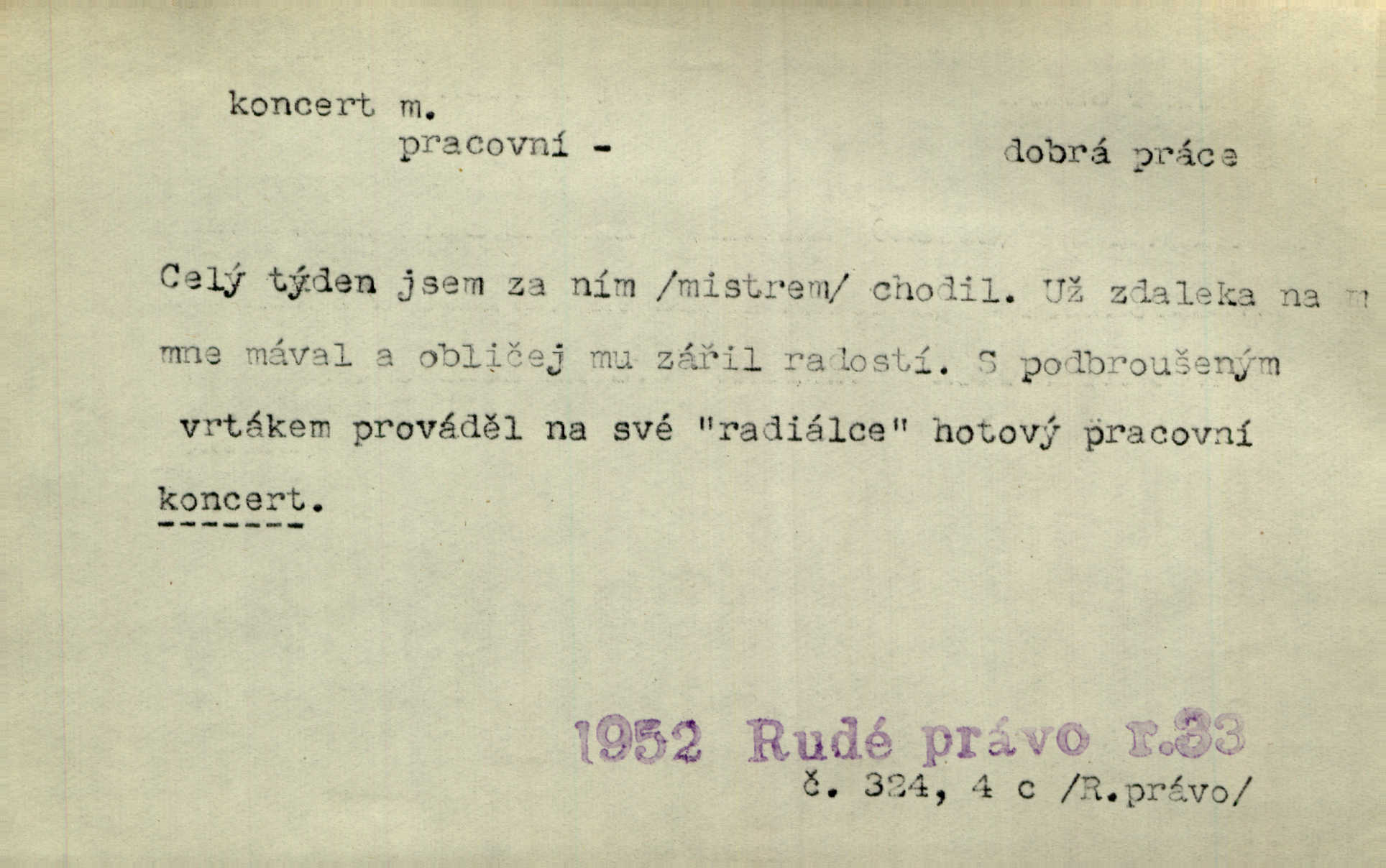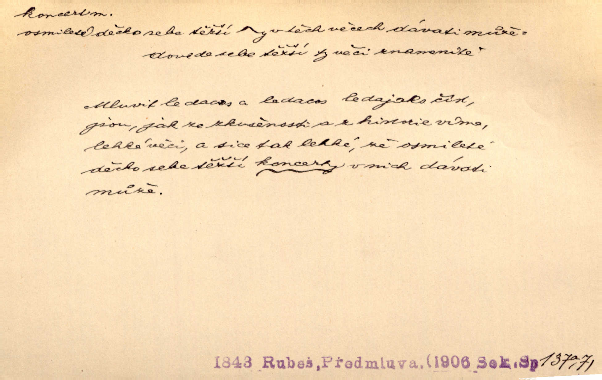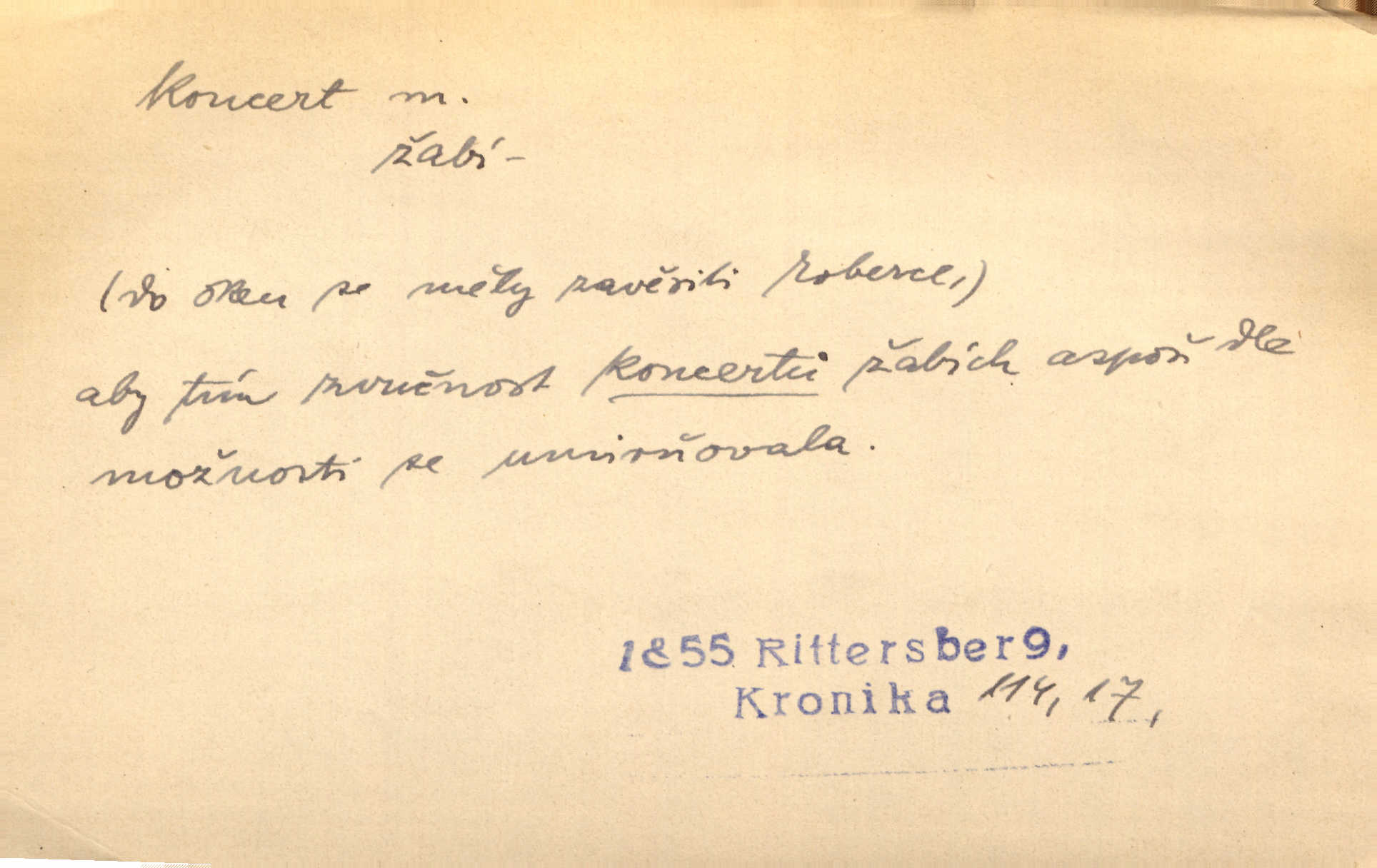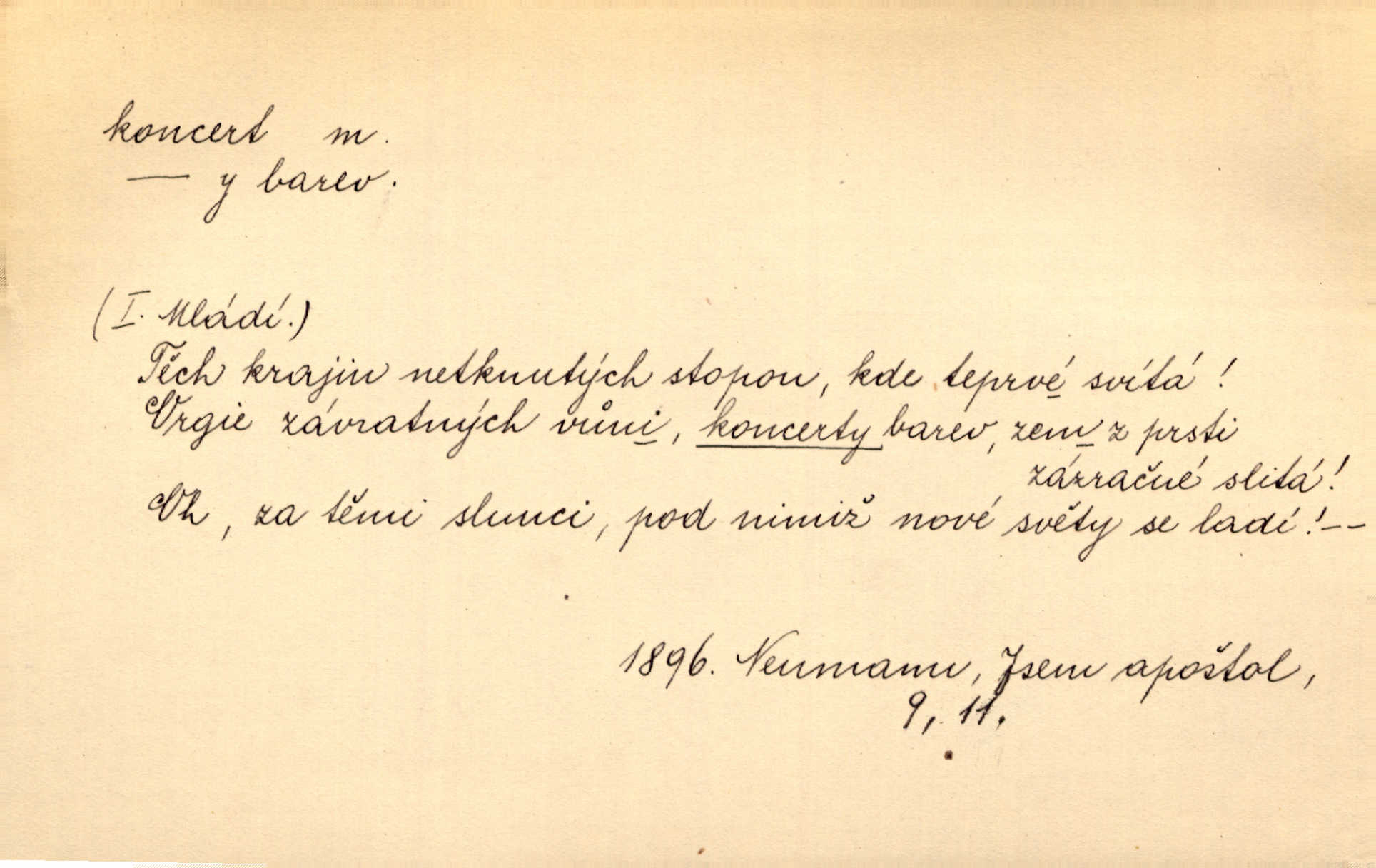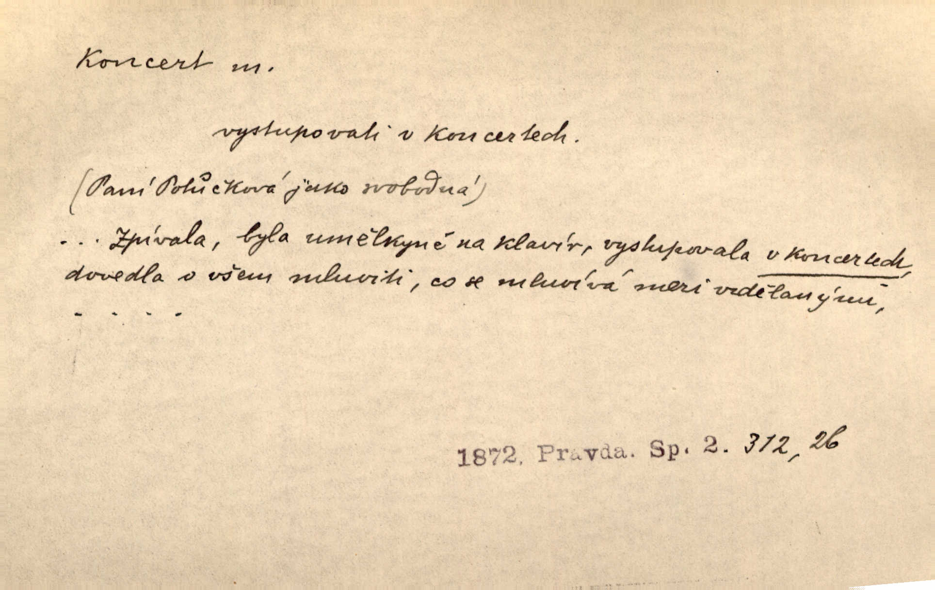 - koncert, -u m. veřejné provozování hudební skladby. Dobročinný koncert „ve prospěch invalidů, jejich vdov a sirotků“. K. Čap. D jakákoli jiná produkce. Drozd spustil nad lesem polední svůj koncert. Rais. Ty ostatní [děti] brečely na postelích. To bývaly koncerty, pro Krista Pána. Kun. Pan Mlacker začal jíst — koncert pro oči, kde kdo se díval. Jedl, mlaskal, olizoval se. Mach. A mosím vám ešče říct, habeste jako stárci drželi pořádek. Ať se nestane nějaké koncert v hospodě rámus, pračka, výtržnost. A. Mrš. On [Úprka] jediný sám syn té země chápe a cítí právě ty nejvyšší koncerty barev, které jsou mu dány. V. Mrš. D větší, technicky nesnadná hudební skladba pro sólový nástroj s doprovodem orchestru. Hrál [Slavík] svůj koncert do A-moll. Obr. živ. D Zř. dohoda. Smlouva se Saskem podmiňovala a předpokládala zároveň smlouvu širší, „koncert“ proti Prusku. Goll.