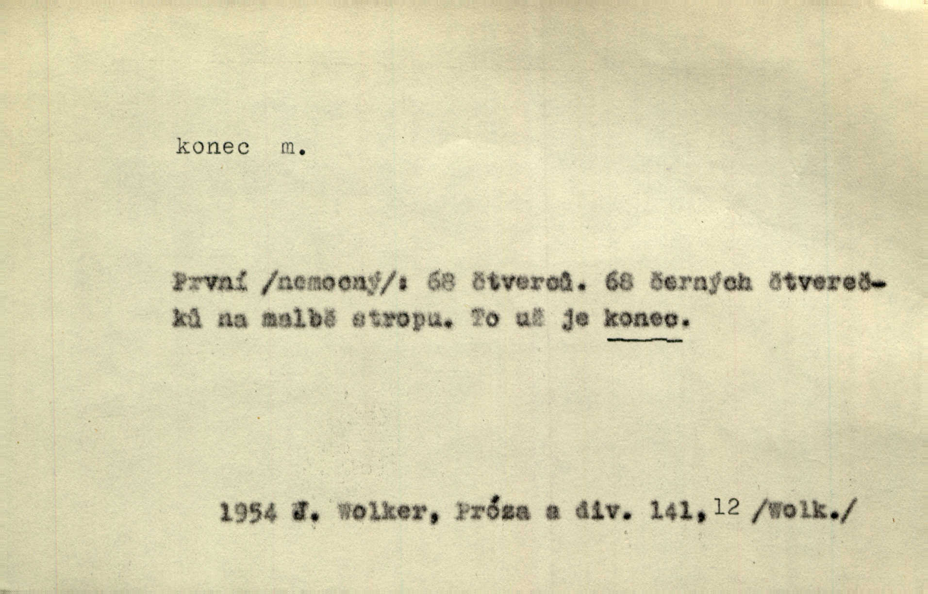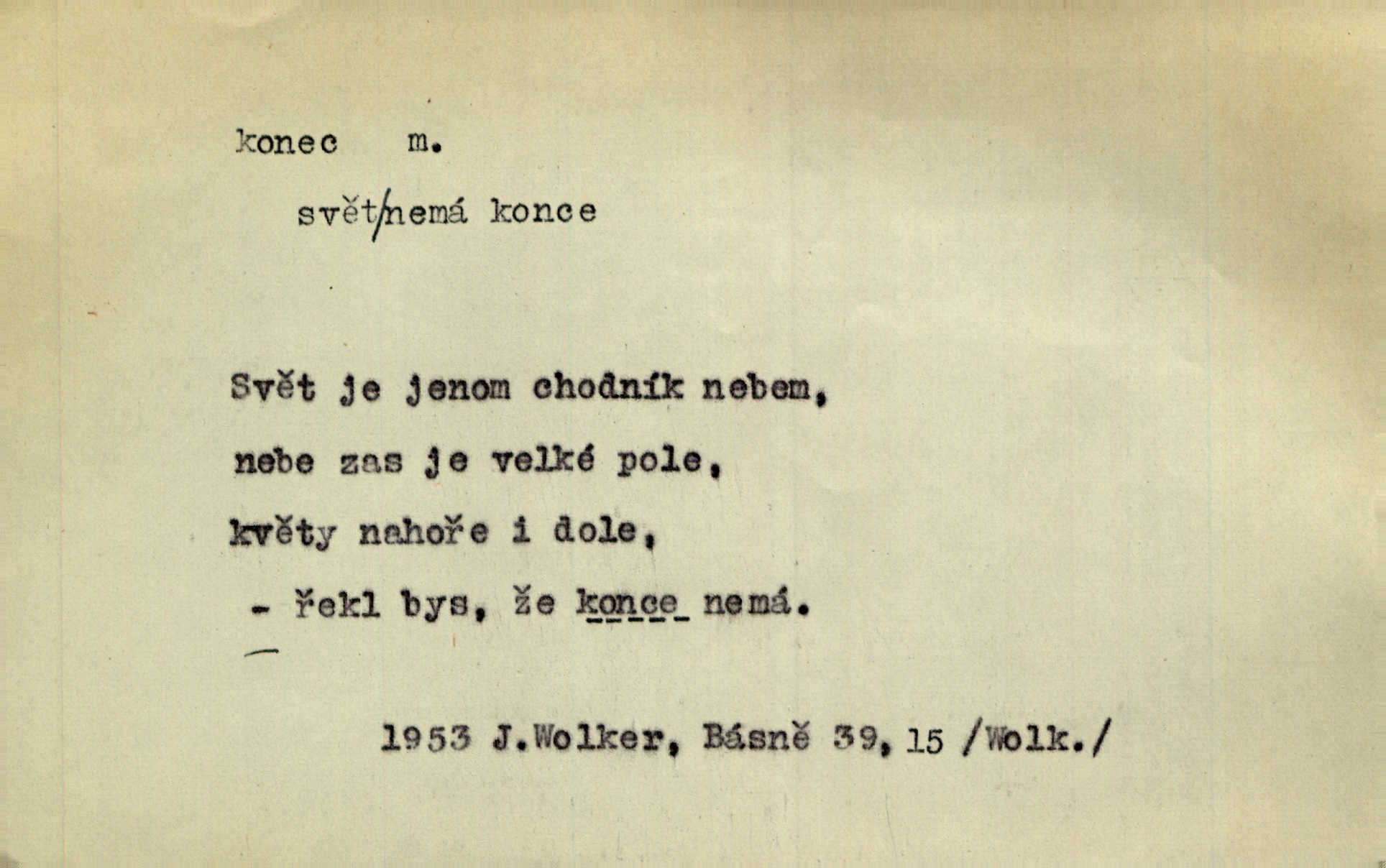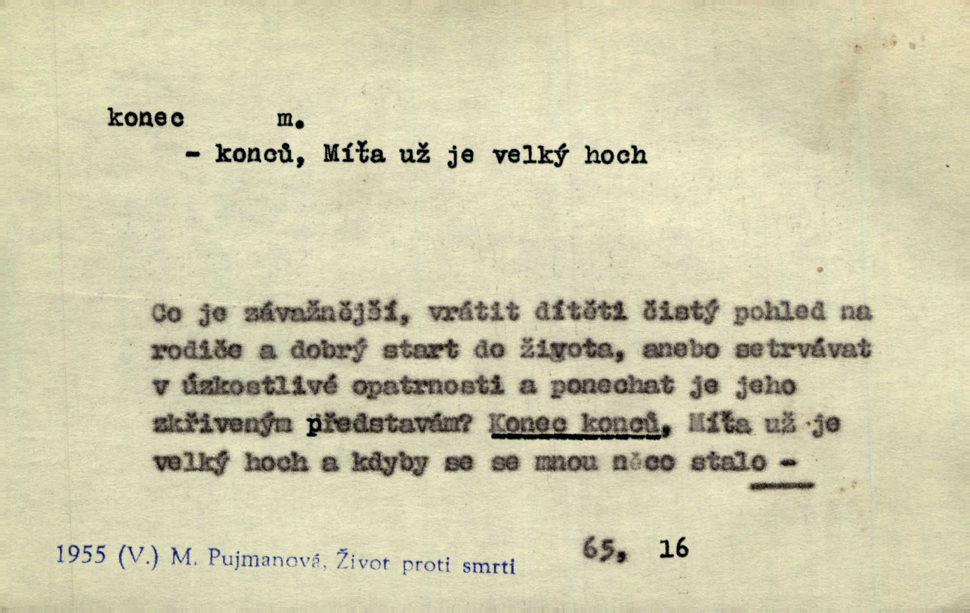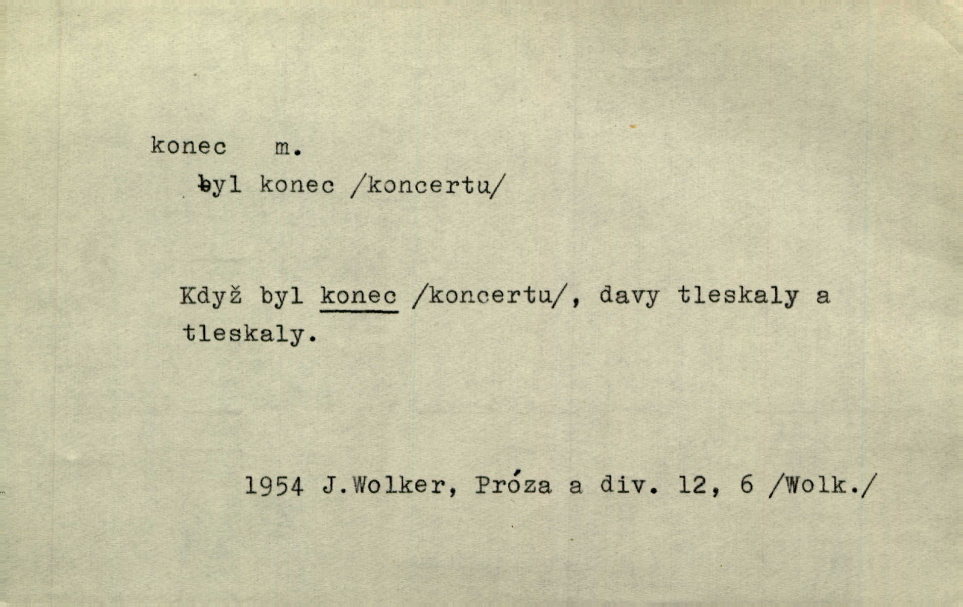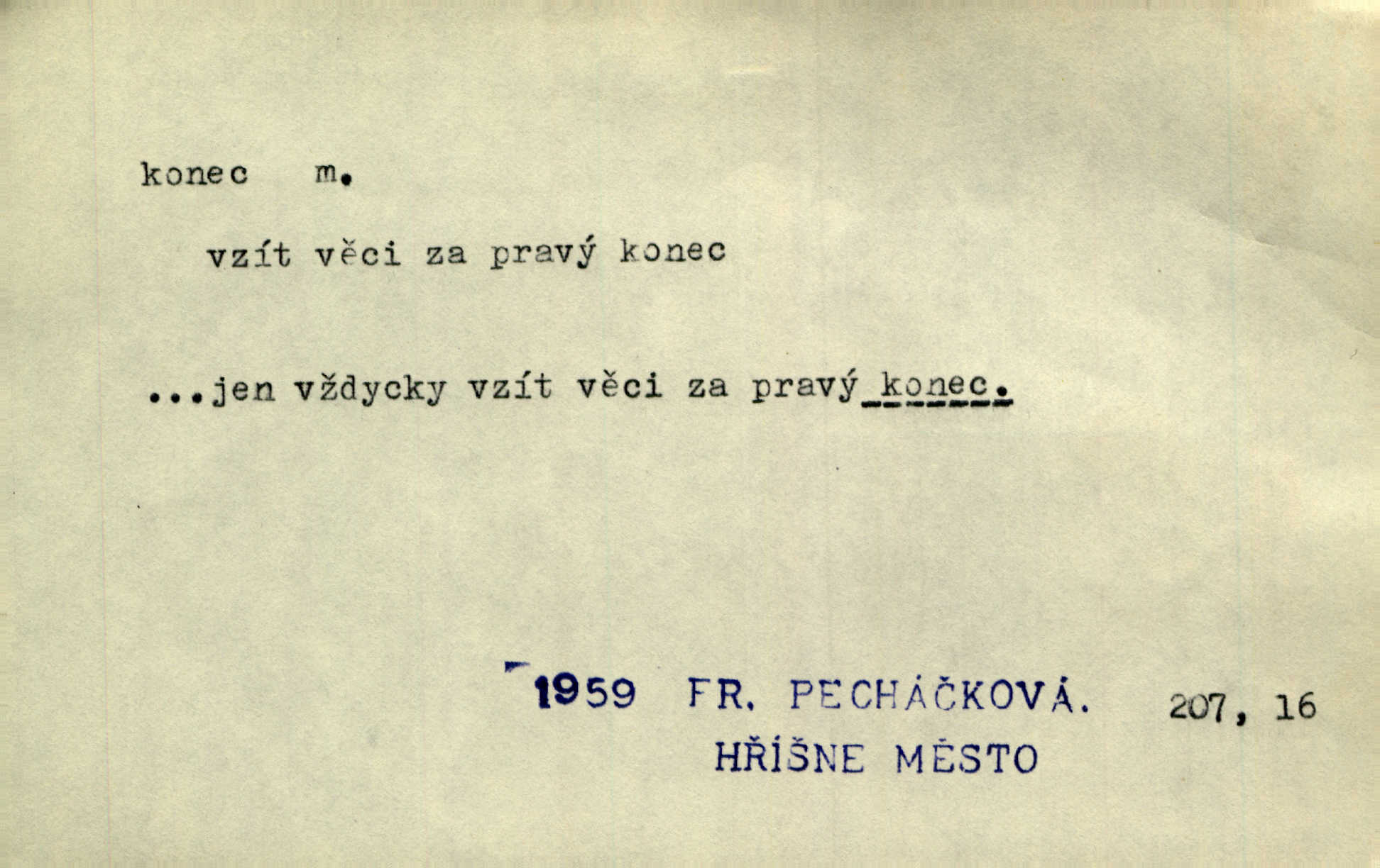 - konec, -nce m. kraj, mez, kde se věc začíná n. přestává. Hůl má dva konce. Změřiti něco od jednoho konce k druhému. Všecko má svůj konec. Dolní konec vsi. Z Čech až na konec světa. Jir. Svěřila své děti podivným, ze všech konců přivandrovalým cizozemkám končin. R. Svob. Zvali se hosté, vařilo se v kuchyni již kolik dní, jakož se i tisíc jiných radovánek chystalo na všech koncích. Něm. Držela [Atala] konec provazce. Jg. Jde tu o věc, ve které my lidé máme držet za jeden konec býti zajedno. K. Čap. Všecko ihned pochopovala, každého díla se chápala za pravý konec volila vhodný prostředek. Hol. Vždy levý konec všeho uchopí nesprávně začne. Vrch. Zaslechl jsem něco o křížových válkách a nevím tomu ani konce ani zvonce nemám o tom ponětí. Herb. Ztratil jsem konec zamotal jsem se (na př. ve vypravování). Bez míry, bez konce jest milost boží. Erb. D Zř. předl. Konec cesty v lese, kamenité, šedivý hrad v širou dálku hledí. Heyd. D (o čase) poslední doba, (o činnosti) ustání, přestání, výsledek. Byloť koncem dubna. Jir. Koncem sedmileté války došla klamná zpráva. Jir. V tom konci století, v těch zájmů vřavě zříš v dálku mizet onu Kaina kletbu. Vrch. Kdo pak je ta Mančinka a Cilka a Václav? ptala se kněžna, ráda chtíc věděti všemu konec i začátek všecko zevrubně. Něm. Zahradník vypravoval všecko od začátku až do konce. Pfleg. Již nehádali se více o francouzskou revoluci, aniž rozumovali o konci světa. Jir. Pamatujte si, že jsem vám to řekla, a dosť a konec! víc nemluvím. Kosm. Konec jest velikému carátu ruskému. Med. Nastala zima dlouhá a trapná; nebylo jí konce. Klost. Jeníku, kde je tě konec? kam ses poděl. Svět. Panímáma hleděla si domácnosti, a kde pantáty konec — nikdo nevěděl. Herrm. Pátral, kde je mu konec. Sez. Bůh ví kde mu bylo konce. Ehrenb. Jisté úkony [instinktivní] musejí následovati po sobě, porušíte-li jejich ustálený sled, je instinkt v koncích bezmocný. K. Čap. Je s jměním v koncích, nyní si pořád vypůjčuje. Prav. Ať si kdo chce chválí vynálezy a současnou vzdělanost, my pravíme, že je svět v koncích nemůže dál. Vanč. Kdo má kozla zahradníkem a Kaču za sousedku, ten je s ajnmolancem(sic!) v koncích nedopočítá se. Kosm. Jsem již [s vypravováním] u konce. Rub. Síly jeho byly u konce neměl sil. Svět. Byl se svou trpělivostí u konce došla mu trpělivost. Svět. A i kdyby teď dělali [sousedé] kdo ví co, mezi nimi a námi je navždy konec nebudeme nikdy přáteli. Svět. Je-li konec zpěvu jeho, s národem celým konec jest veta po něm. Vrch. Odtud až potud a každá písnička má svůj konec a ta Roblova skončila ohavně. Baar. Doufám, že přijdeme k dobrému konci shodneme se. Šmil. Dá bůh, že to všecko vezme dobrý a šťastný konec šťastně skončí. Šmil. Však jsem byla včera na Lhotce u strejce, aby to vzalo nějaký konec skončilo se. Rais. [Jahelková] povídala o nemocích, nemohla přijíti k žádnému konci. Prav. Arnulf dokoná, co nemohli Ludvíkové ke konci přivésti. Hurb. Udělej tomu [známosti]‚ holka, konec ukonči to. Staš. Já toho všivého života mám dost a umínil jsem si, že tomu udělám konec, čemu se říká konec s kalafunou. Klost. Já kdybych se rozstonal, udělám tomu krátkej konec. Udělám si smrť. Herb. Národy různých jazyků, mravů a zvyků nepřivedeš pod jeden klobouk. Proto došlo to s Josefem [císařem] do smutných konců! smutně to skončilo, dopadlo. Šmil. Ale tvou vinou došlo do těchto konců tak to dopadlo. Klost. Ale na konec stará synovi přece povolila konečně. Jir. Na konci však mně i žena, kmet i dítě sevšední konečně. Vrch. Koncem rád jsi, když jen život chráníš konečně. Vrch. Konec konců každá chudoba je zaviněná konečně, ostatně. Vach. Řidč. v konci konců, konec (s) koncem, konec ke konci. Všecko možné podnikáme a v konci konců výsledky našeho úsilí jsou přece nepatrné. Hol. Ještě jsem mu hodně vyčtla a konec koncem bylo, že jsem mu vypověděla. Něm. Avšak konec s koncem „Němci zase prý jen Němcům přejí“. Rez. Já že bych snad konec ke konci měl ještě jíti k nim? Třeb. D smrt. Když však ulehl a pořád scházel, nezapírali si, že to s ním jde ku konci. Prav. Sestárlý orel zimomřivý na sněti sedí sám a sám, stesk konce hled mu mlží sivý. Mach. Mrtvola Horáčkova byla s jinými mrtvolami z obecné kaple vyvezena — „jaký život, taký konec,“ pravil pan provisor. Ner. D účel, cíl. Obyvatelé [městečka] měli pěstovati řemesla a handle. K tomu konci nadáni byli od počátku právem týdeních trhů. Pek. Nejsouť zde tyto odchylky vylíčeny k tomu konci, abychom škodolibě vlastní přednosti své měřili. Durd.