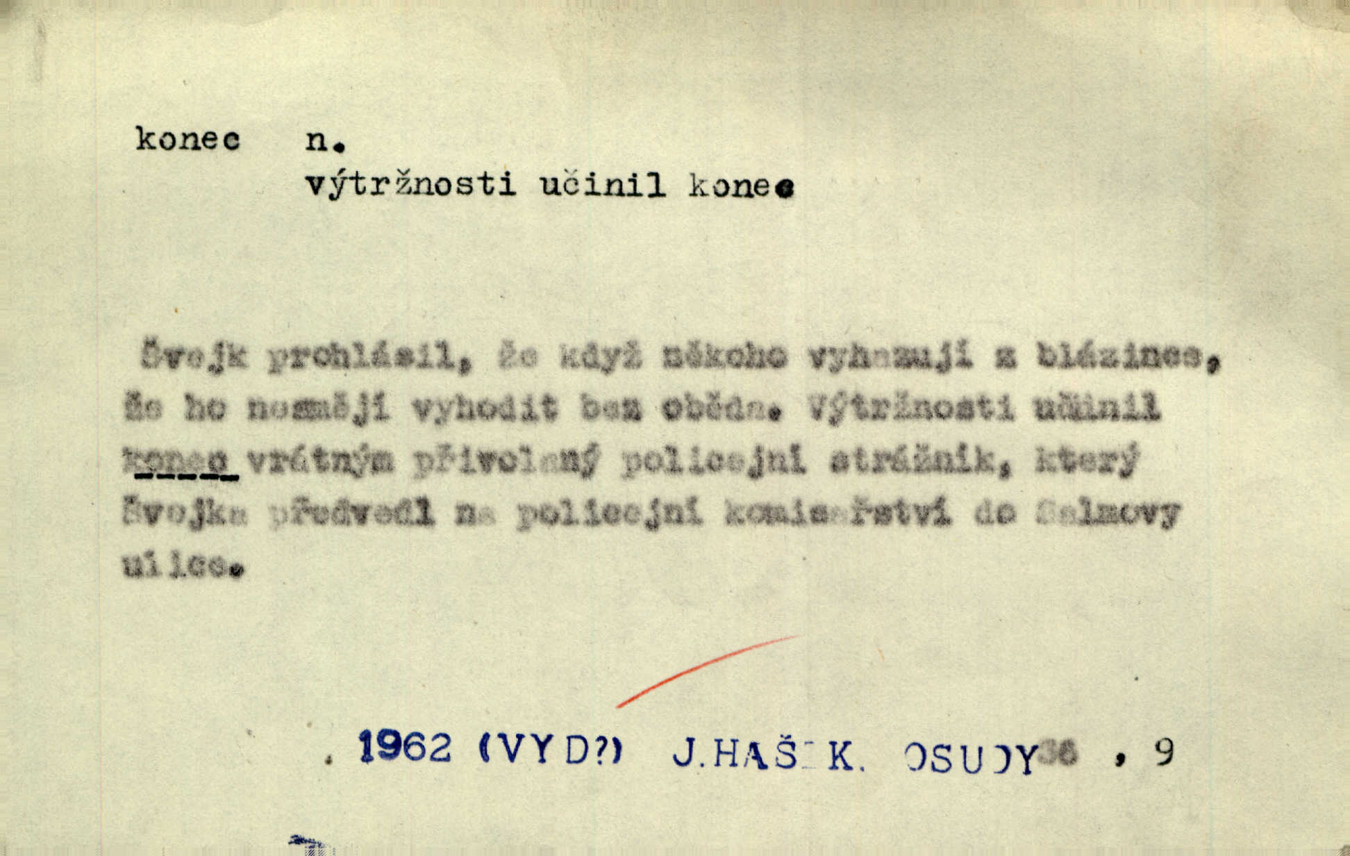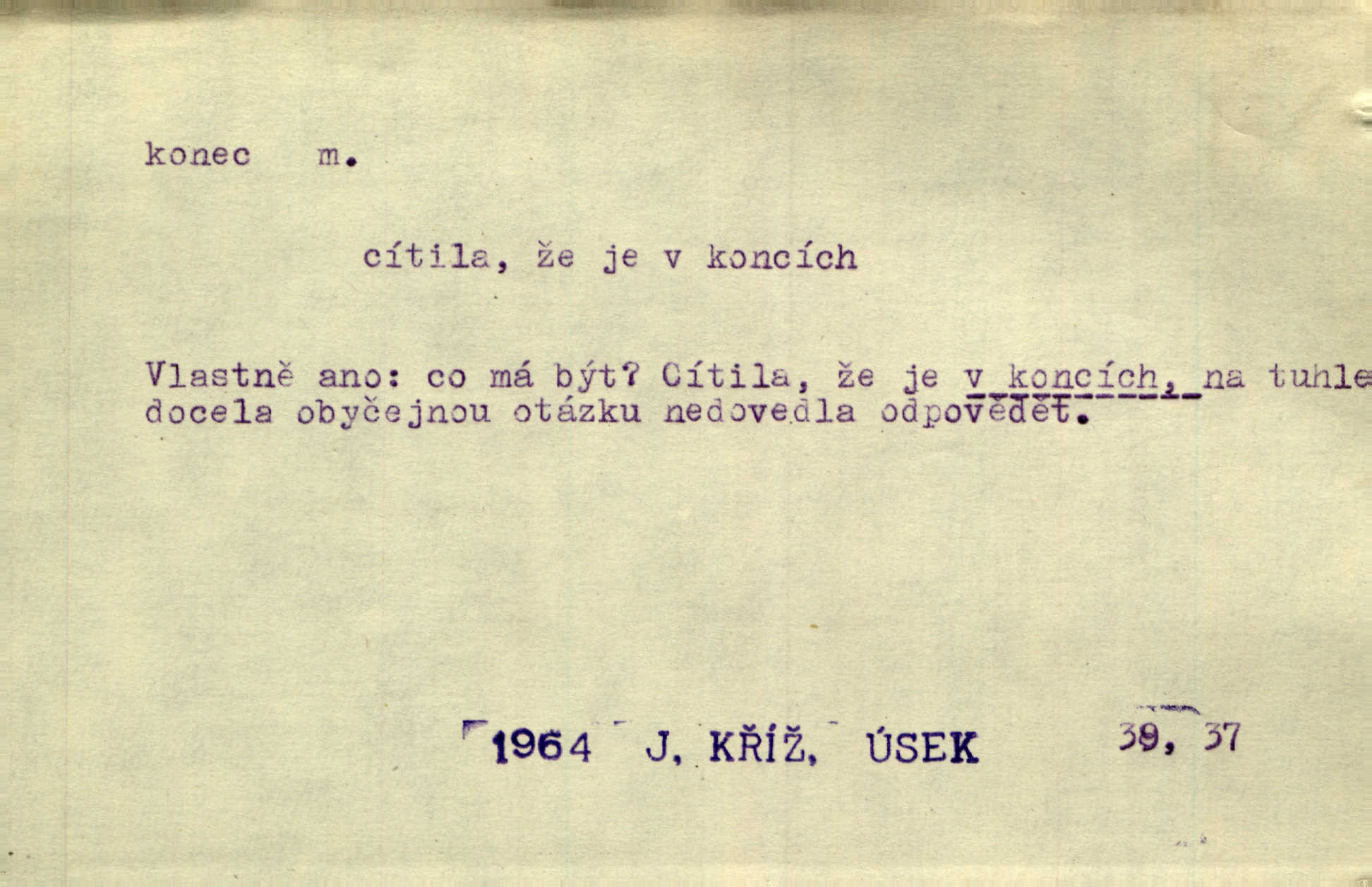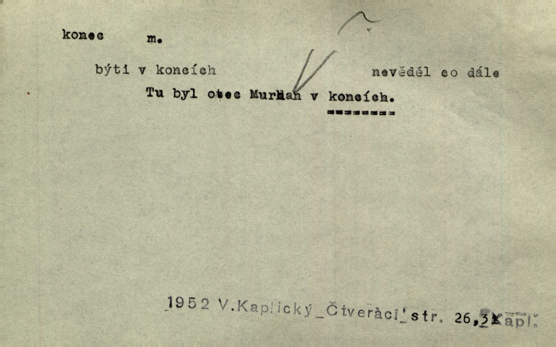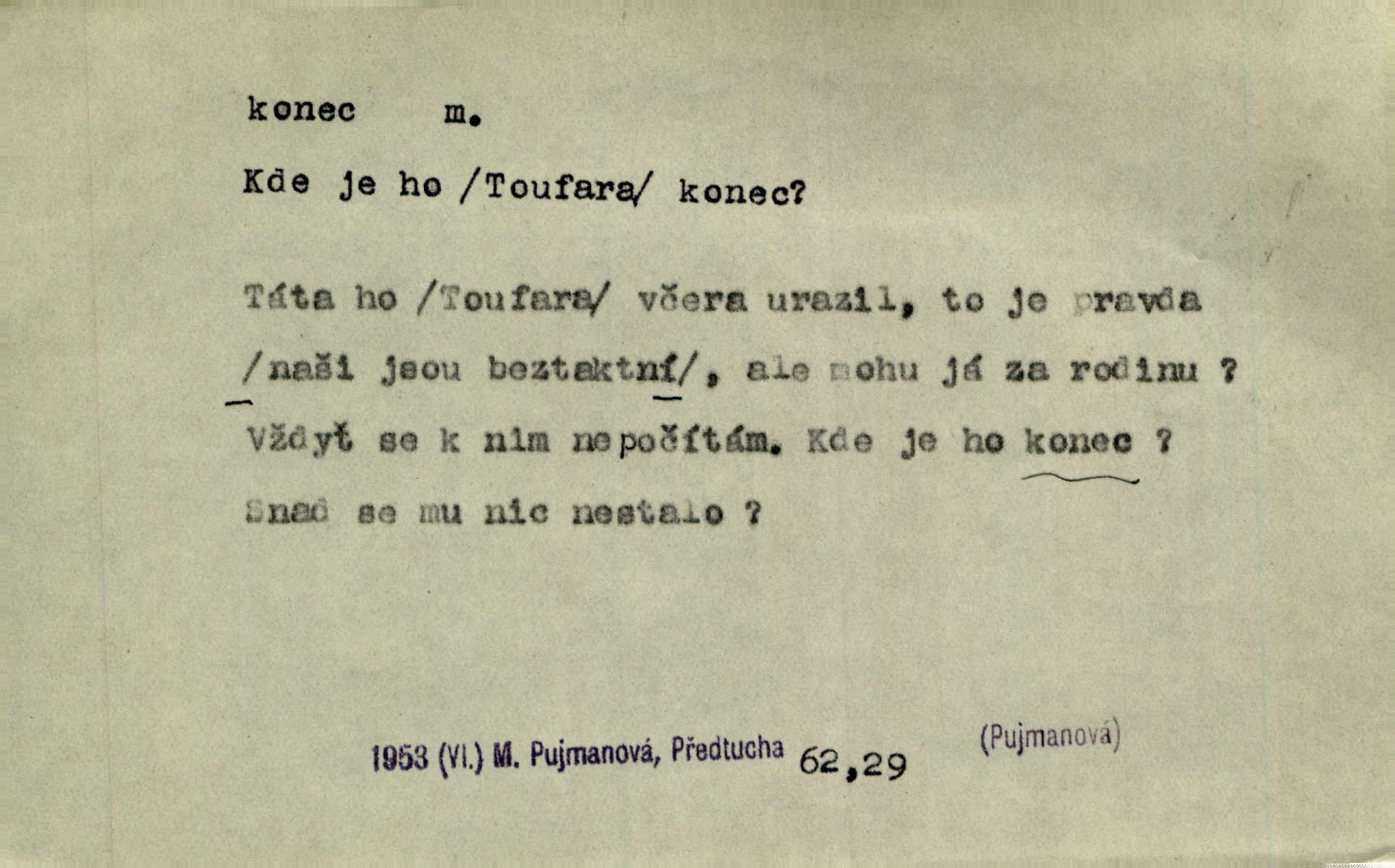 - konec, -nce m. kraj, mez, kde se věc začíná n. přestává. Hůl má dva konce. Změřiti něco od jednoho konce k druhému. Všecko má svůj konec. Dolní konec vsi. Z Čech až na konec světa. Jir. Svěřila své děti podivným, ze všech konců přivandrovalým cizozemkám končin. R. Svob. Zvali se hosté, vařilo se v kuchyni již kolik dní, jakož se i tisíc jiných radovánek chystalo na všech koncích. Něm. Držela [Atala] konec provazce. Jg. Jde tu o věc, ve které my lidé máme držet za jeden konec býti zajedno. K. Čap. Všecko ihned pochopovala, každého díla se chápala za pravý konec volila vhodný prostředek. Hol. Vždy levý konec všeho uchopí nesprávně začne. Vrch. Zaslechl jsem něco o křížových válkách a nevím tomu ani konce ani zvonce nemám o tom ponětí. Herb. Ztratil jsem konec zamotal jsem se (na př. ve vypravování). Bez míry, bez konce jest milost boží. Erb. D Zř. předl. Konec cesty v lese, kamenité, šedivý hrad v širou dálku hledí. Heyd. D (o čase) poslední doba, (o činnosti) ustání, přestání, výsledek. Byloť koncem dubna. Jir. Koncem sedmileté války došla klamná zpráva. Jir. V tom konci století, v těch zájmů vřavě zříš v dálku mizet onu Kaina kletbu. Vrch. Kdo pak je ta Mančinka a Cilka a Václav? ptala se kněžna, ráda chtíc věděti všemu konec i začátek všecko zevrubně. Něm. Zahradník vypravoval všecko od začátku až do konce. Pfleg. Již nehádali se více o francouzskou revoluci, aniž rozumovali o konci světa. Jir. Pamatujte si, že jsem vám to řekla, a dosť a konec! víc nemluvím. Kosm. Konec jest velikému carátu ruskému. Med. Nastala zima dlouhá a trapná; nebylo jí konce. Klost. Jeníku, kde je tě konec? kam ses poděl. Svět. Panímáma hleděla si domácnosti, a kde pantáty konec — nikdo nevěděl. Herrm. Pátral, kde je mu konec. Sez. Bůh ví kde mu bylo konce. Ehrenb. Jisté úkony [instinktivní] musejí následovati po sobě, porušíte-li jejich ustálený sled, je instinkt v koncích bezmocný. K. Čap. Je s jměním v koncích, nyní si pořád vypůjčuje. Prav. Ať si kdo chce chválí vynálezy a současnou vzdělanost, my pravíme, že je svět v koncích nemůže dál. Vanč. Kdo má kozla zahradníkem a Kaču za sousedku, ten je s ajnmolancem(sic!) v koncích nedopočítá se. Kosm. Jsem již [s vypravováním] u konce. Rub. Síly jeho byly u konce neměl sil. Svět. Byl se svou trpělivostí u konce došla mu trpělivost. Svět. A i kdyby teď dělali [sousedé] kdo ví co, mezi nimi a námi je navždy konec nebudeme nikdy přáteli. Svět. Je-li konec zpěvu jeho, s národem celým konec jest veta po něm. Vrch. Odtud až potud a každá písnička má svůj konec a ta Roblova skončila ohavně. Baar. Doufám, že přijdeme k dobrému konci shodneme se. Šmil. Dá bůh, že to všecko vezme dobrý a šťastný konec šťastně skončí. Šmil. Však jsem byla včera na Lhotce u strejce, aby to vzalo nějaký konec skončilo se. Rais. [Jahelková] povídala o nemocích, nemohla přijíti k žádnému konci. Prav. Arnulf dokoná, co nemohli Ludvíkové ke konci přivésti. Hurb. Udělej tomu [známosti]‚ holka, konec ukonči to. Staš. Já toho všivého života mám dost a umínil jsem si, že tomu udělám konec, čemu se říká konec s kalafunou. Klost. Já kdybych se rozstonal, udělám tomu krátkej konec. Udělám si smrť. Herb. Národy různých jazyků, mravů a zvyků nepřivedeš pod jeden klobouk. Proto došlo to s Josefem [císařem] do smutných konců! smutně to skončilo, dopadlo. Šmil. Ale tvou vinou došlo do těchto konců tak to dopadlo. Klost. Ale na konec stará synovi přece povolila konečně. Jir. Na konci však mně i žena, kmet i dítě sevšední konečně. Vrch. Koncem rád jsi, když jen život chráníš konečně. Vrch. Konec konců každá chudoba je zaviněná konečně, ostatně. Vach. Řidč. v konci konců, konec (s) koncem, konec ke konci. Všecko možné podnikáme a v konci konců výsledky našeho úsilí jsou přece nepatrné. Hol. Ještě jsem mu hodně vyčtla a konec koncem bylo, že jsem mu vypověděla. Něm. Avšak konec s koncem „Němci zase prý jen Němcům přejí“. Rez. Já že bych snad konec ke konci měl ještě jíti k nim? Třeb. D smrt. Když však ulehl a pořád scházel, nezapírali si, že to s ním jde ku konci. Prav. Sestárlý orel zimomřivý na sněti sedí sám a sám, stesk konce hled mu mlží sivý. Mach. Mrtvola Horáčkova byla s jinými mrtvolami z obecné kaple vyvezena — „jaký život, taký konec,“ pravil pan provisor. Ner. D účel, cíl. Obyvatelé [městečka] měli pěstovati řemesla a handle. K tomu konci nadáni byli od počátku právem týdeních trhů. Pek. Nejsouť zde tyto odchylky vylíčeny k tomu konci, abychom škodolibě vlastní přednosti své měřili. Durd.