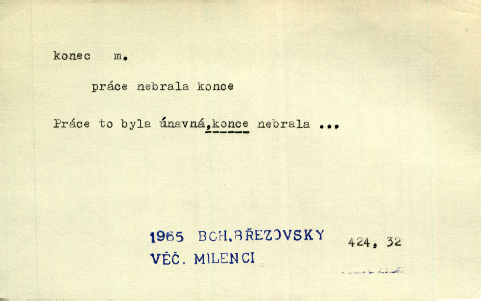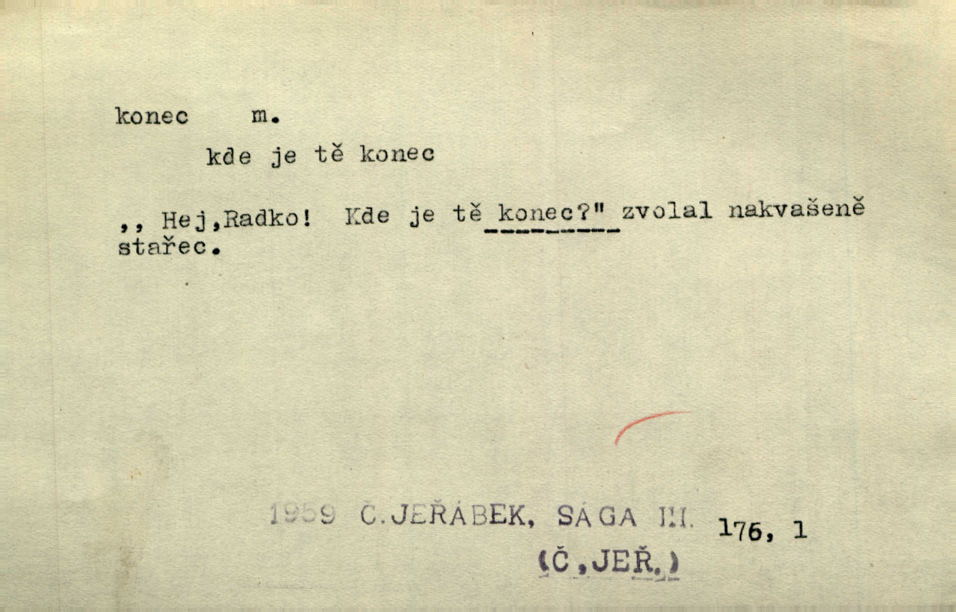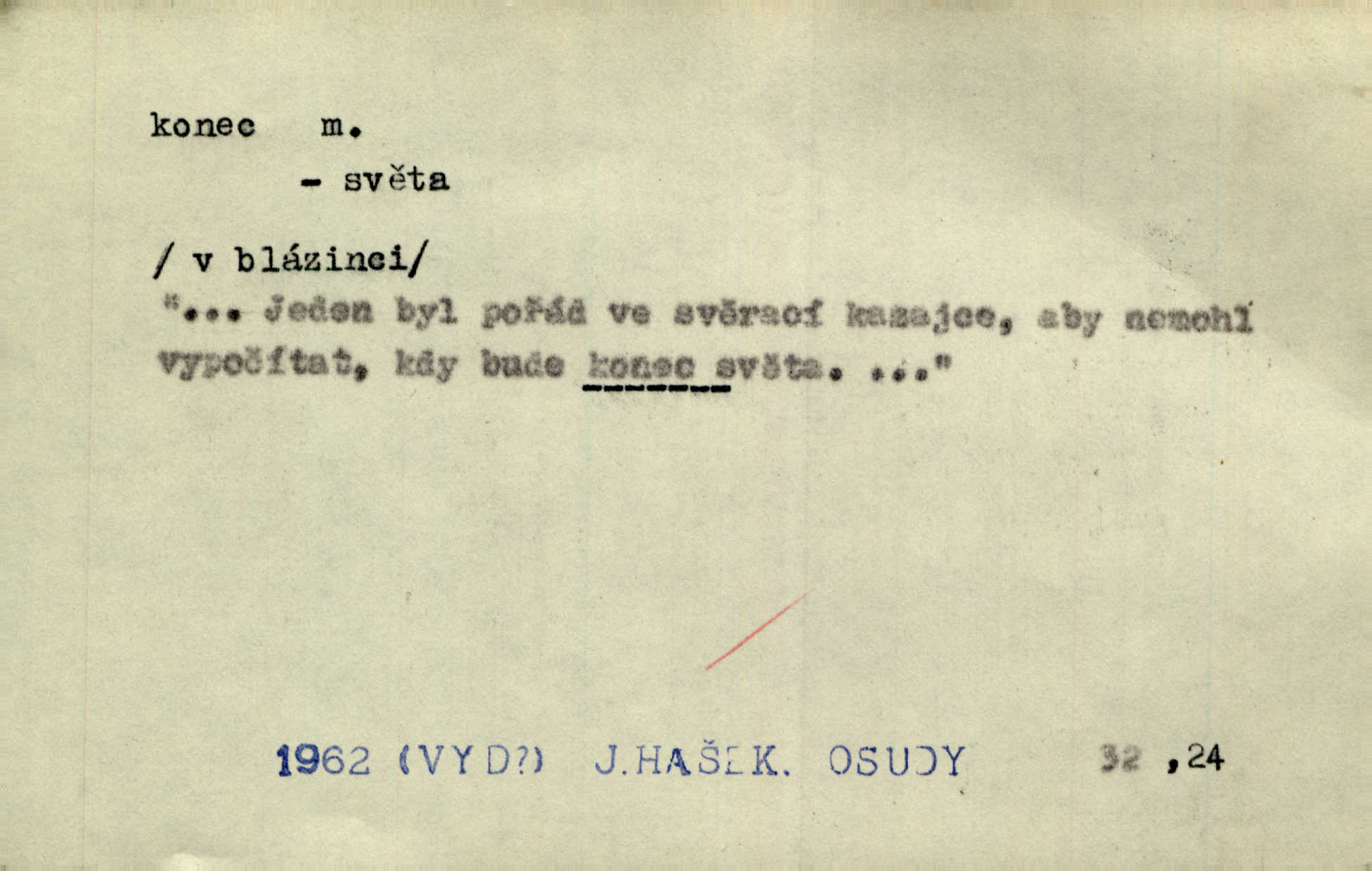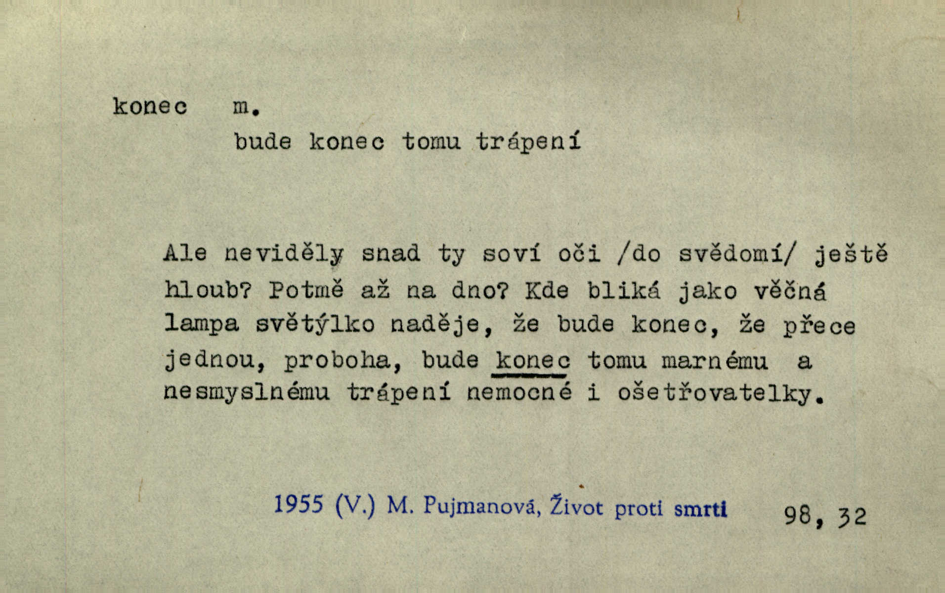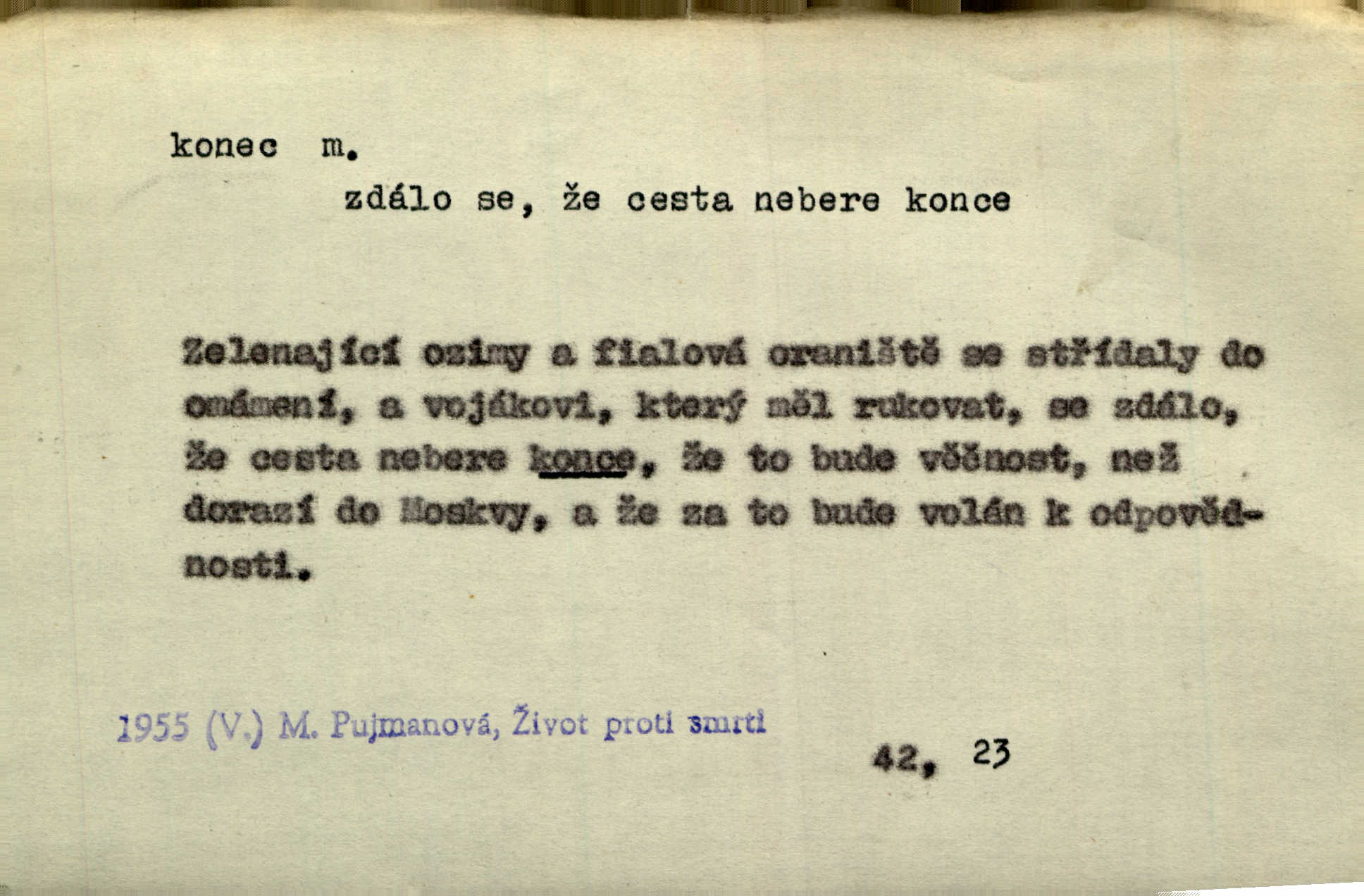 - konec, -nce m. kraj, mez, kde se věc začíná n. přestává. Hůl má dva konce. Změřiti něco od jednoho konce k druhému. Všecko má svůj konec. Dolní konec vsi. Z Čech až na konec světa. Jir. Svěřila své děti podivným, ze všech konců přivandrovalým cizozemkám končin. R. Svob. Zvali se hosté, vařilo se v kuchyni již kolik dní, jakož se i tisíc jiných radovánek chystalo na všech koncích. Něm. Držela [Atala] konec provazce. Jg. Jde tu o věc, ve které my lidé máme držet za jeden konec býti zajedno. K. Čap. Všecko ihned pochopovala, každého díla se chápala za pravý konec volila vhodný prostředek. Hol. Vždy levý konec všeho uchopí nesprávně začne. Vrch. Zaslechl jsem něco o křížových válkách a nevím tomu ani konce ani zvonce nemám o tom ponětí. Herb. Ztratil jsem konec zamotal jsem se (na př. ve vypravování). Bez míry, bez konce jest milost boží. Erb. D Zř. předl. Konec cesty v lese, kamenité, šedivý hrad v širou dálku hledí. Heyd. D (o čase) poslední doba, (o činnosti) ustání, přestání, výsledek. Byloť koncem dubna. Jir. Koncem sedmileté války došla klamná zpráva. Jir. V tom konci století, v těch zájmů vřavě zříš v dálku mizet onu Kaina kletbu. Vrch. Kdo pak je ta Mančinka a Cilka a Václav? ptala se kněžna, ráda chtíc věděti všemu konec i začátek všecko zevrubně. Něm. Zahradník vypravoval všecko od začátku až do konce. Pfleg. Již nehádali se více o francouzskou revoluci, aniž rozumovali o konci světa. Jir. Pamatujte si, že jsem vám to řekla, a dosť a konec! víc nemluvím. Kosm. Konec jest velikému carátu ruskému. Med. Nastala zima dlouhá a trapná; nebylo jí konce. Klost. Jeníku, kde je tě konec? kam ses poděl. Svět. Panímáma hleděla si domácnosti, a kde pantáty konec — nikdo nevěděl. Herrm. Pátral, kde je mu konec. Sez. Bůh ví kde mu bylo konce. Ehrenb. Jisté úkony [instinktivní] musejí následovati po sobě, porušíte-li jejich ustálený sled, je instinkt v koncích bezmocný. K. Čap. Je s jměním v koncích, nyní si pořád vypůjčuje. Prav. Ať si kdo chce chválí vynálezy a současnou vzdělanost, my pravíme, že je svět v koncích nemůže dál. Vanč. Kdo má kozla zahradníkem a Kaču za sousedku, ten je s ajnmolancem(sic!) v koncích nedopočítá se. Kosm. Jsem již [s vypravováním] u konce. Rub. Síly jeho byly u konce neměl sil. Svět. Byl se svou trpělivostí u konce došla mu trpělivost. Svět. A i kdyby teď dělali [sousedé] kdo ví co, mezi nimi a námi je navždy konec nebudeme nikdy přáteli. Svět. Je-li konec zpěvu jeho, s národem celým konec jest veta po něm. Vrch. Odtud až potud a každá písnička má svůj konec a ta Roblova skončila ohavně. Baar. Doufám, že přijdeme k dobrému konci shodneme se. Šmil. Dá bůh, že to všecko vezme dobrý a šťastný konec šťastně skončí. Šmil. Však jsem byla včera na Lhotce u strejce, aby to vzalo nějaký konec skončilo se. Rais. [Jahelková] povídala o nemocích, nemohla přijíti k žádnému konci. Prav. Arnulf dokoná, co nemohli Ludvíkové ke konci přivésti. Hurb. Udělej tomu [známosti]‚ holka, konec ukonči to. Staš. Já toho všivého života mám dost a umínil jsem si, že tomu udělám konec, čemu se říká konec s kalafunou. Klost. Já kdybych se rozstonal, udělám tomu krátkej konec. Udělám si smrť. Herb. Národy různých jazyků, mravů a zvyků nepřivedeš pod jeden klobouk. Proto došlo to s Josefem [císařem] do smutných konců! smutně to skončilo, dopadlo. Šmil. Ale tvou vinou došlo do těchto konců tak to dopadlo. Klost. Ale na konec stará synovi přece povolila konečně. Jir. Na konci však mně i žena, kmet i dítě sevšední konečně. Vrch. Koncem rád jsi, když jen život chráníš konečně. Vrch. Konec konců každá chudoba je zaviněná konečně, ostatně. Vach. Řidč. v konci konců, konec (s) koncem, konec ke konci. Všecko možné podnikáme a v konci konců výsledky našeho úsilí jsou přece nepatrné. Hol. Ještě jsem mu hodně vyčtla a konec koncem bylo, že jsem mu vypověděla. Něm. Avšak konec s koncem „Němci zase prý jen Němcům přejí“. Rez. Já že bych snad konec ke konci měl ještě jíti k nim? Třeb. D smrt. Když však ulehl a pořád scházel, nezapírali si, že to s ním jde ku konci. Prav. Sestárlý orel zimomřivý na sněti sedí sám a sám, stesk konce hled mu mlží sivý. Mach. Mrtvola Horáčkova byla s jinými mrtvolami z obecné kaple vyvezena — „jaký život, taký konec,“ pravil pan provisor. Ner. D účel, cíl. Obyvatelé [městečka] měli pěstovati řemesla a handle. K tomu konci nadáni byli od počátku právem týdeních trhů. Pek. Nejsouť zde tyto odchylky vylíčeny k tomu konci, abychom škodolibě vlastní přednosti své měřili. Durd.