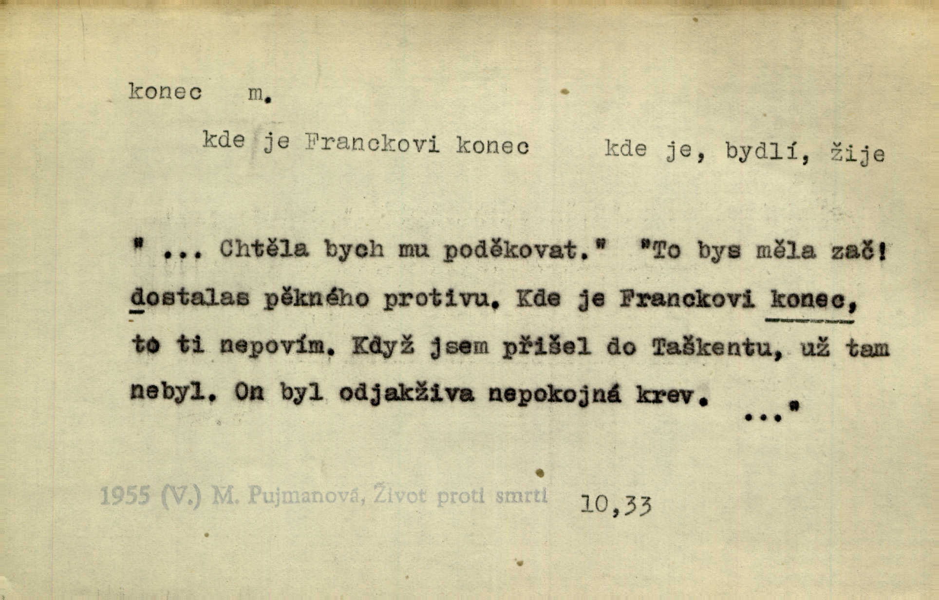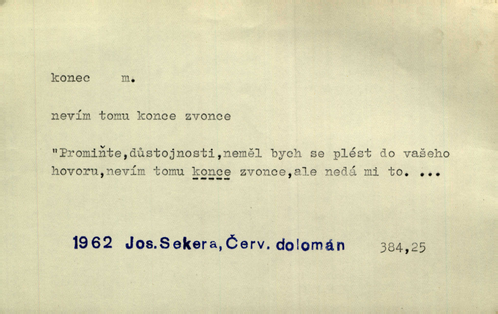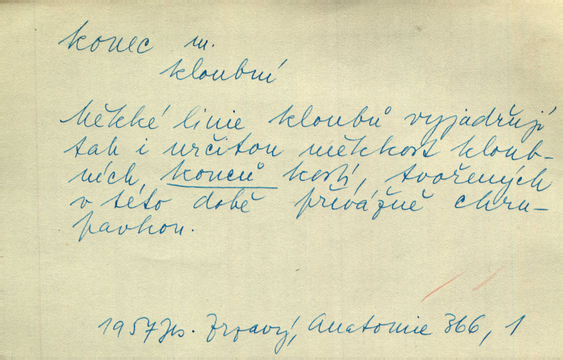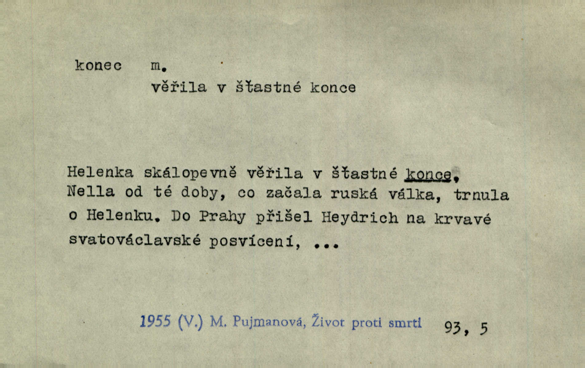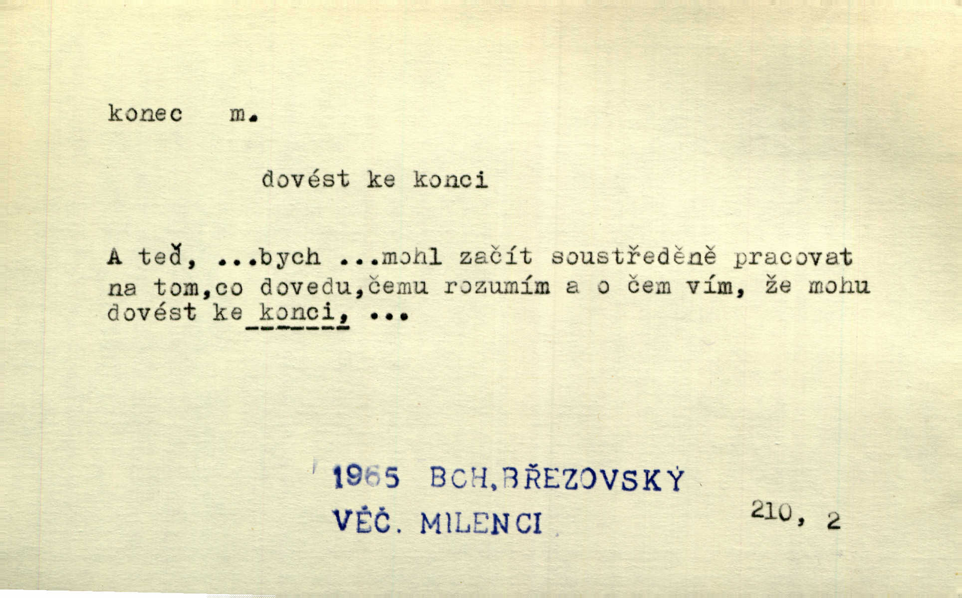 - konec, -nce m. kraj, mez, kde se věc začíná n. přestává. Hůl má dva konce. Změřiti něco od jednoho konce k druhému. Všecko má svůj konec. Dolní konec vsi. Z Čech až na konec světa. Jir. Svěřila své děti podivným, ze všech konců přivandrovalým cizozemkám končin. R. Svob. Zvali se hosté, vařilo se v kuchyni již kolik dní, jakož se i tisíc jiných radovánek chystalo na všech koncích. Něm. Držela [Atala] konec provazce. Jg. Jde tu o věc, ve které my lidé máme držet za jeden konec býti zajedno. K. Čap. Všecko ihned pochopovala, každého díla se chápala za pravý konec volila vhodný prostředek. Hol. Vždy levý konec všeho uchopí nesprávně začne. Vrch. Zaslechl jsem něco o křížových válkách a nevím tomu ani konce ani zvonce nemám o tom ponětí. Herb. Ztratil jsem konec zamotal jsem se (na př. ve vypravování). Bez míry, bez konce jest milost boží. Erb. D Zř. předl. Konec cesty v lese, kamenité, šedivý hrad v širou dálku hledí. Heyd. D (o čase) poslední doba, (o činnosti) ustání, přestání, výsledek. Byloť koncem dubna. Jir. Koncem sedmileté války došla klamná zpráva. Jir. V tom konci století, v těch zájmů vřavě zříš v dálku mizet onu Kaina kletbu. Vrch. Kdo pak je ta Mančinka a Cilka a Václav? ptala se kněžna, ráda chtíc věděti všemu konec i začátek všecko zevrubně. Něm. Zahradník vypravoval všecko od začátku až do konce. Pfleg. Již nehádali se více o francouzskou revoluci, aniž rozumovali o konci světa. Jir. Pamatujte si, že jsem vám to řekla, a dosť a konec! víc nemluvím. Kosm. Konec jest velikému carátu ruskému. Med. Nastala zima dlouhá a trapná; nebylo jí konce. Klost. Jeníku, kde je tě konec? kam ses poděl. Svět. Panímáma hleděla si domácnosti, a kde pantáty konec — nikdo nevěděl. Herrm. Pátral, kde je mu konec. Sez. Bůh ví kde mu bylo konce. Ehrenb. Jisté úkony [instinktivní] musejí následovati po sobě, porušíte-li jejich ustálený sled, je instinkt v koncích bezmocný. K. Čap. Je s jměním v koncích, nyní si pořád vypůjčuje. Prav. Ať si kdo chce chválí vynálezy a současnou vzdělanost, my pravíme, že je svět v koncích nemůže dál. Vanč. Kdo má kozla zahradníkem a Kaču za sousedku, ten je s ajnmolancem(sic!) v koncích nedopočítá se. Kosm. Jsem již [s vypravováním] u konce. Rub. Síly jeho byly u konce neměl sil. Svět. Byl se svou trpělivostí u konce došla mu trpělivost. Svět. A i kdyby teď dělali [sousedé] kdo ví co, mezi nimi a námi je navždy konec nebudeme nikdy přáteli. Svět. Je-li konec zpěvu jeho, s národem celým konec jest veta po něm. Vrch. Odtud až potud a každá písnička má svůj konec a ta Roblova skončila ohavně. Baar. Doufám, že přijdeme k dobrému konci shodneme se. Šmil. Dá bůh, že to všecko vezme dobrý a šťastný konec šťastně skončí. Šmil. Však jsem byla včera na Lhotce u strejce, aby to vzalo nějaký konec skončilo se. Rais. [Jahelková] povídala o nemocích, nemohla přijíti k žádnému konci. Prav. Arnulf dokoná, co nemohli Ludvíkové ke konci přivésti. Hurb. Udělej tomu [známosti]‚ holka, konec ukonči to. Staš. Já toho všivého života mám dost a umínil jsem si, že tomu udělám konec, čemu se říká konec s kalafunou. Klost. Já kdybych se rozstonal, udělám tomu krátkej konec. Udělám si smrť. Herb. Národy různých jazyků, mravů a zvyků nepřivedeš pod jeden klobouk. Proto došlo to s Josefem [císařem] do smutných konců! smutně to skončilo, dopadlo. Šmil. Ale tvou vinou došlo do těchto konců tak to dopadlo. Klost. Ale na konec stará synovi přece povolila konečně. Jir. Na konci však mně i žena, kmet i dítě sevšední konečně. Vrch. Koncem rád jsi, když jen život chráníš konečně. Vrch. Konec konců každá chudoba je zaviněná konečně, ostatně. Vach. Řidč. v konci konců, konec (s) koncem, konec ke konci. Všecko možné podnikáme a v konci konců výsledky našeho úsilí jsou přece nepatrné. Hol. Ještě jsem mu hodně vyčtla a konec koncem bylo, že jsem mu vypověděla. Něm. Avšak konec s koncem „Němci zase prý jen Němcům přejí“. Rez. Já že bych snad konec ke konci měl ještě jíti k nim? Třeb. D smrt. Když však ulehl a pořád scházel, nezapírali si, že to s ním jde ku konci. Prav. Sestárlý orel zimomřivý na sněti sedí sám a sám, stesk konce hled mu mlží sivý. Mach. Mrtvola Horáčkova byla s jinými mrtvolami z obecné kaple vyvezena — „jaký život, taký konec,“ pravil pan provisor. Ner. D účel, cíl. Obyvatelé [městečka] měli pěstovati řemesla a handle. K tomu konci nadáni byli od počátku právem týdeních trhů. Pek. Nejsouť zde tyto odchylky vylíčeny k tomu konci, abychom škodolibě vlastní přednosti své měřili. Durd.