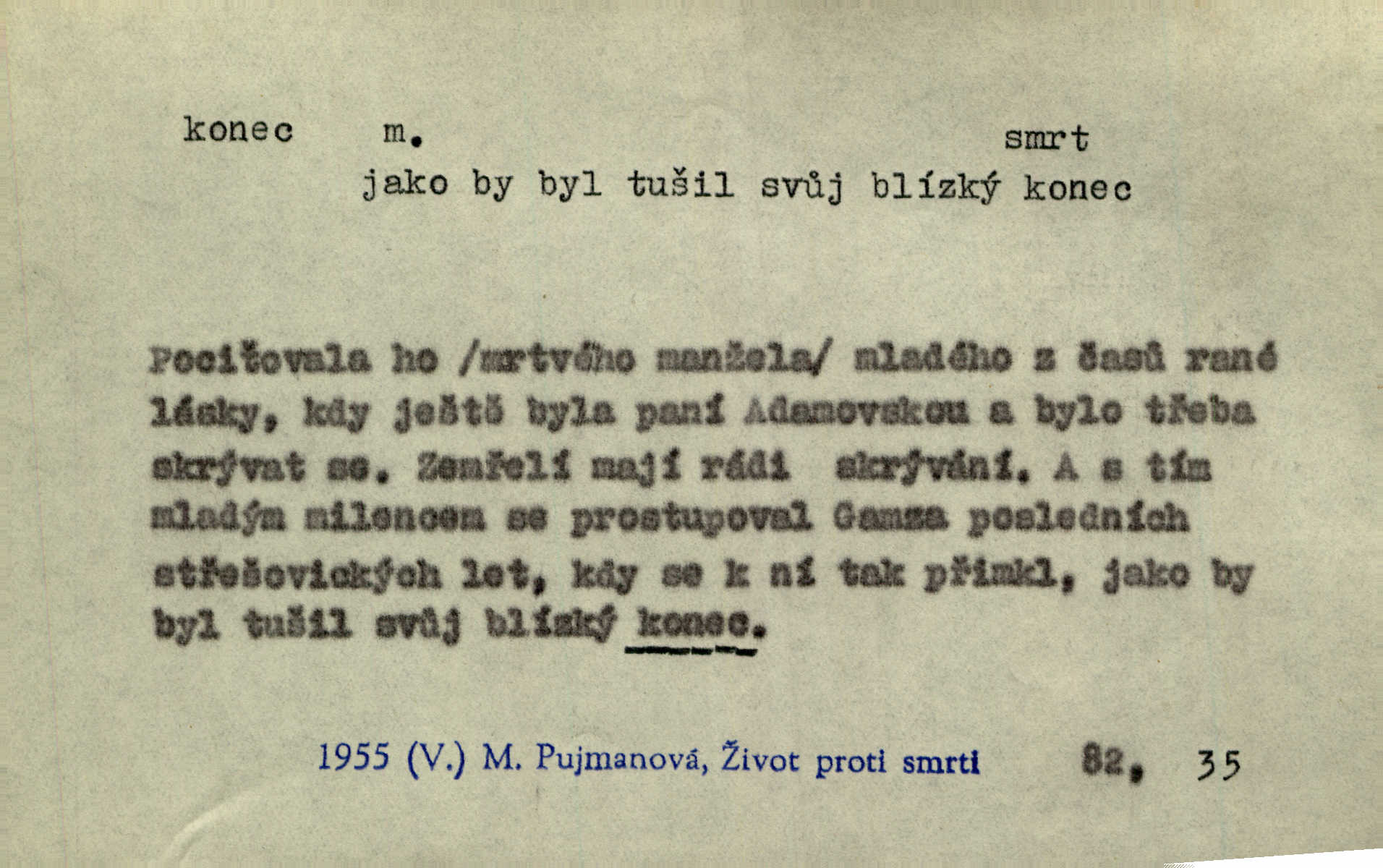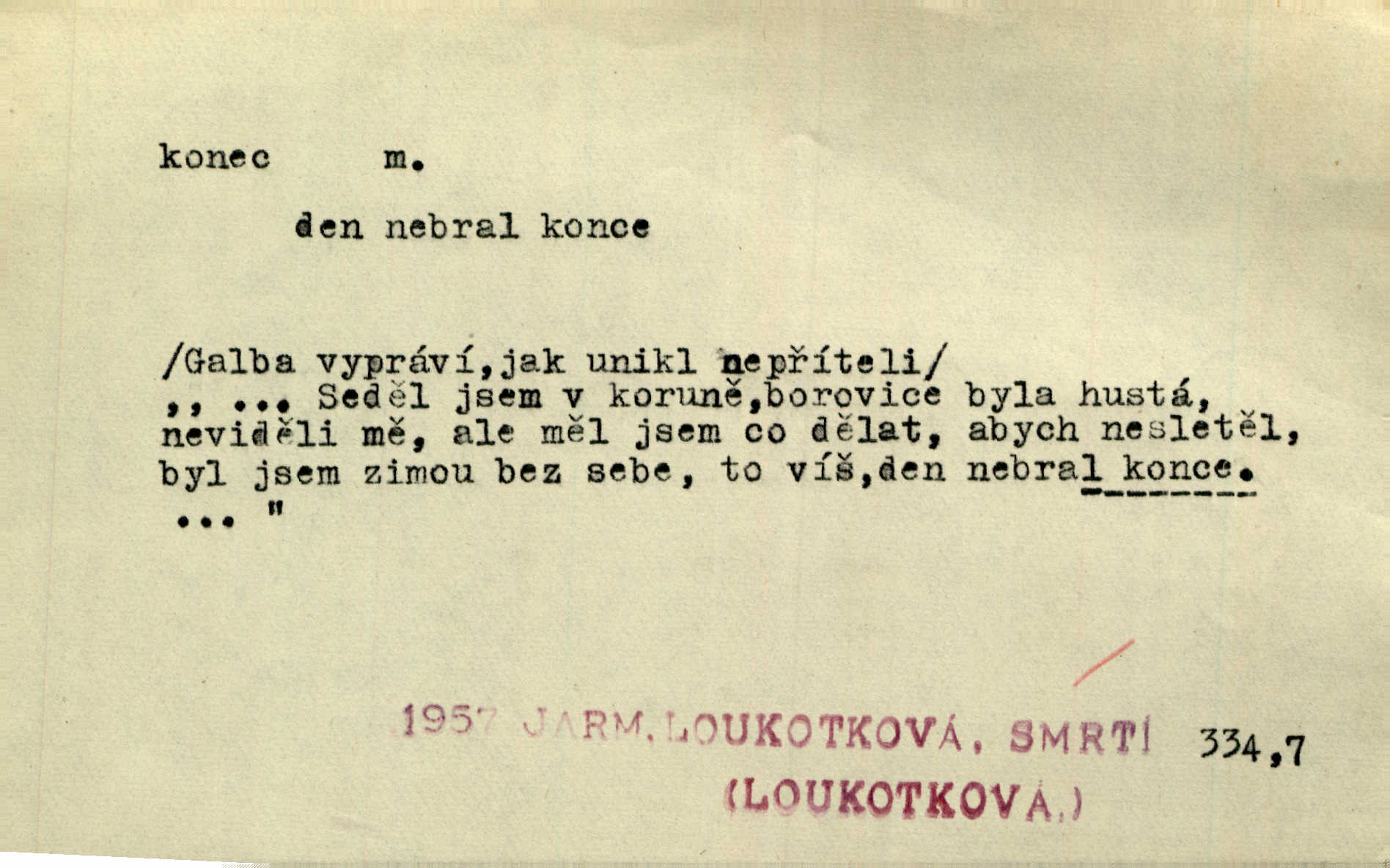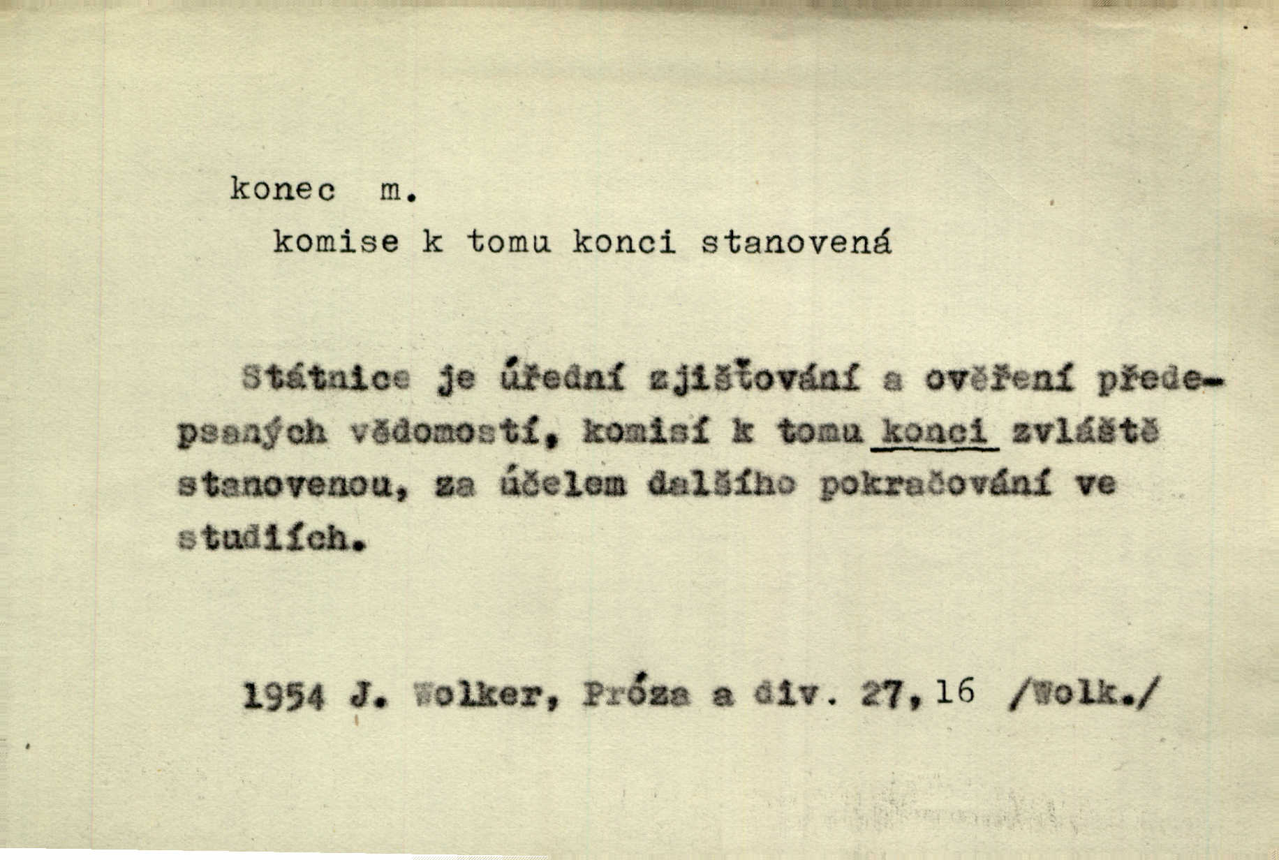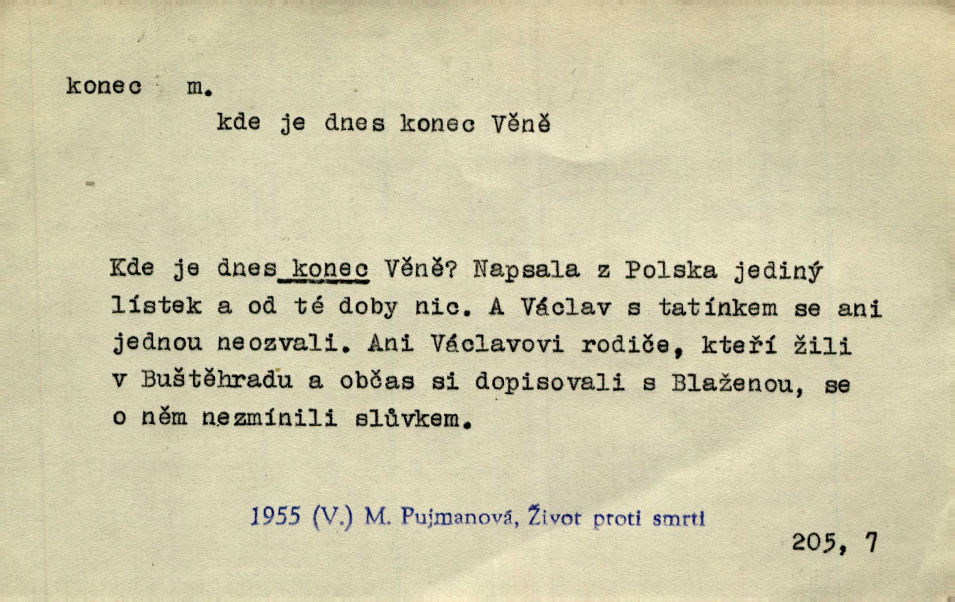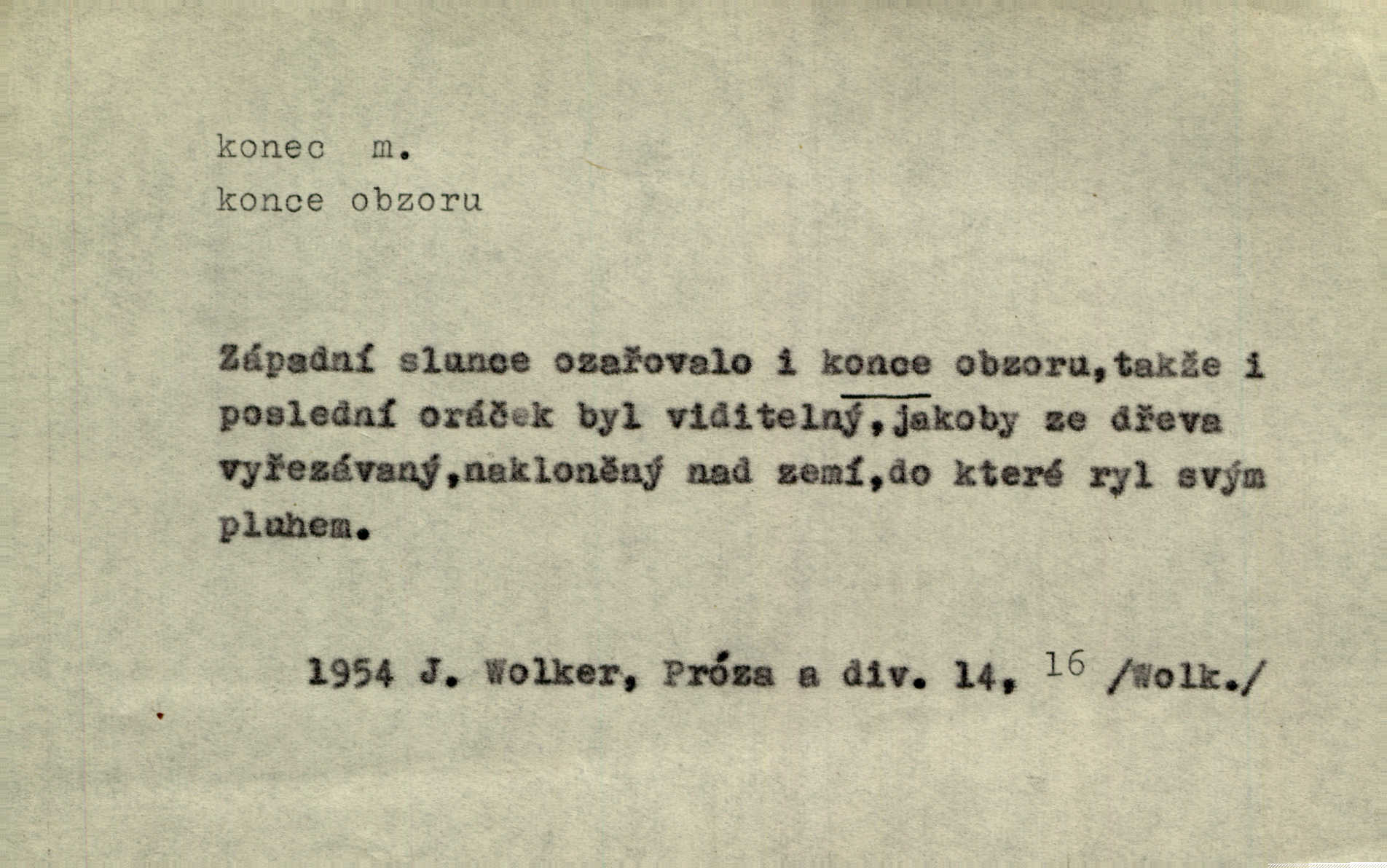 - konec, -nce m. kraj, mez, kde se věc začíná n. přestává. Hůl má dva konce. Změřiti něco od jednoho konce k druhému. Všecko má svůj konec. Dolní konec vsi. Z Čech až na konec světa. Jir. Svěřila své děti podivným, ze všech konců přivandrovalým cizozemkám končin. R. Svob. Zvali se hosté, vařilo se v kuchyni již kolik dní, jakož se i tisíc jiných radovánek chystalo na všech koncích. Něm. Držela [Atala] konec provazce. Jg. Jde tu o věc, ve které my lidé máme držet za jeden konec býti zajedno. K. Čap. Všecko ihned pochopovala, každého díla se chápala za pravý konec volila vhodný prostředek. Hol. Vždy levý konec všeho uchopí nesprávně začne. Vrch. Zaslechl jsem něco o křížových válkách a nevím tomu ani konce ani zvonce nemám o tom ponětí. Herb. Ztratil jsem konec zamotal jsem se (na př. ve vypravování). Bez míry, bez konce jest milost boží. Erb. D Zř. předl. Konec cesty v lese, kamenité, šedivý hrad v širou dálku hledí. Heyd. D (o čase) poslední doba, (o činnosti) ustání, přestání, výsledek. Byloť koncem dubna. Jir. Koncem sedmileté války došla klamná zpráva. Jir. V tom konci století, v těch zájmů vřavě zříš v dálku mizet onu Kaina kletbu. Vrch. Kdo pak je ta Mančinka a Cilka a Václav? ptala se kněžna, ráda chtíc věděti všemu konec i začátek všecko zevrubně. Něm. Zahradník vypravoval všecko od začátku až do konce. Pfleg. Již nehádali se více o francouzskou revoluci, aniž rozumovali o konci světa. Jir. Pamatujte si, že jsem vám to řekla, a dosť a konec! víc nemluvím. Kosm. Konec jest velikému carátu ruskému. Med. Nastala zima dlouhá a trapná; nebylo jí konce. Klost. Jeníku, kde je tě konec? kam ses poděl. Svět. Panímáma hleděla si domácnosti, a kde pantáty konec — nikdo nevěděl. Herrm. Pátral, kde je mu konec. Sez. Bůh ví kde mu bylo konce. Ehrenb. Jisté úkony [instinktivní] musejí následovati po sobě, porušíte-li jejich ustálený sled, je instinkt v koncích bezmocný. K. Čap. Je s jměním v koncích, nyní si pořád vypůjčuje. Prav. Ať si kdo chce chválí vynálezy a současnou vzdělanost, my pravíme, že je svět v koncích nemůže dál. Vanč. Kdo má kozla zahradníkem a Kaču za sousedku, ten je s ajnmolancem(sic!) v koncích nedopočítá se. Kosm. Jsem již [s vypravováním] u konce. Rub. Síly jeho byly u konce neměl sil. Svět. Byl se svou trpělivostí u konce došla mu trpělivost. Svět. A i kdyby teď dělali [sousedé] kdo ví co, mezi nimi a námi je navždy konec nebudeme nikdy přáteli. Svět. Je-li konec zpěvu jeho, s národem celým konec jest veta po něm. Vrch. Odtud až potud a každá písnička má svůj konec a ta Roblova skončila ohavně. Baar. Doufám, že přijdeme k dobrému konci shodneme se. Šmil. Dá bůh, že to všecko vezme dobrý a šťastný konec šťastně skončí. Šmil. Však jsem byla včera na Lhotce u strejce, aby to vzalo nějaký konec skončilo se. Rais. [Jahelková] povídala o nemocích, nemohla přijíti k žádnému konci. Prav. Arnulf dokoná, co nemohli Ludvíkové ke konci přivésti. Hurb. Udělej tomu [známosti]‚ holka, konec ukonči to. Staš. Já toho všivého života mám dost a umínil jsem si, že tomu udělám konec, čemu se říká konec s kalafunou. Klost. Já kdybych se rozstonal, udělám tomu krátkej konec. Udělám si smrť. Herb. Národy různých jazyků, mravů a zvyků nepřivedeš pod jeden klobouk. Proto došlo to s Josefem [císařem] do smutných konců! smutně to skončilo, dopadlo. Šmil. Ale tvou vinou došlo do těchto konců tak to dopadlo. Klost. Ale na konec stará synovi přece povolila konečně. Jir. Na konci však mně i žena, kmet i dítě sevšední konečně. Vrch. Koncem rád jsi, když jen život chráníš konečně. Vrch. Konec konců každá chudoba je zaviněná konečně, ostatně. Vach. Řidč. v konci konců, konec (s) koncem, konec ke konci. Všecko možné podnikáme a v konci konců výsledky našeho úsilí jsou přece nepatrné. Hol. Ještě jsem mu hodně vyčtla a konec koncem bylo, že jsem mu vypověděla. Něm. Avšak konec s koncem „Němci zase prý jen Němcům přejí“. Rez. Já že bych snad konec ke konci měl ještě jíti k nim? Třeb. D smrt. Když však ulehl a pořád scházel, nezapírali si, že to s ním jde ku konci. Prav. Sestárlý orel zimomřivý na sněti sedí sám a sám, stesk konce hled mu mlží sivý. Mach. Mrtvola Horáčkova byla s jinými mrtvolami z obecné kaple vyvezena — „jaký život, taký konec,“ pravil pan provisor. Ner. D účel, cíl. Obyvatelé [městečka] měli pěstovati řemesla a handle. K tomu konci nadáni byli od počátku právem týdeních trhů. Pek. Nejsouť zde tyto odchylky vylíčeny k tomu konci, abychom škodolibě vlastní přednosti své měřili. Durd.