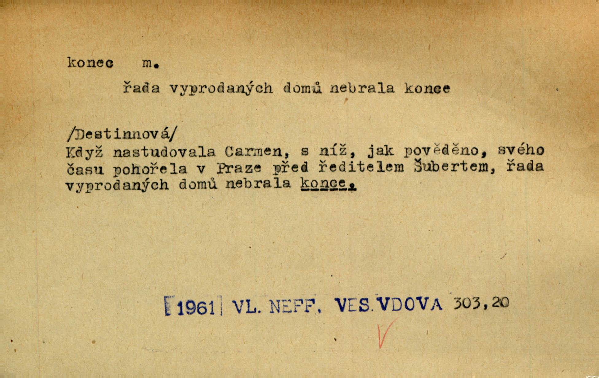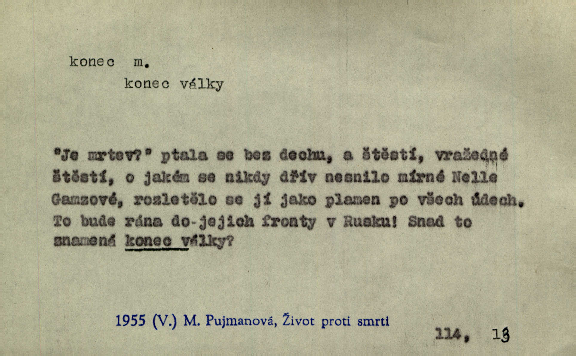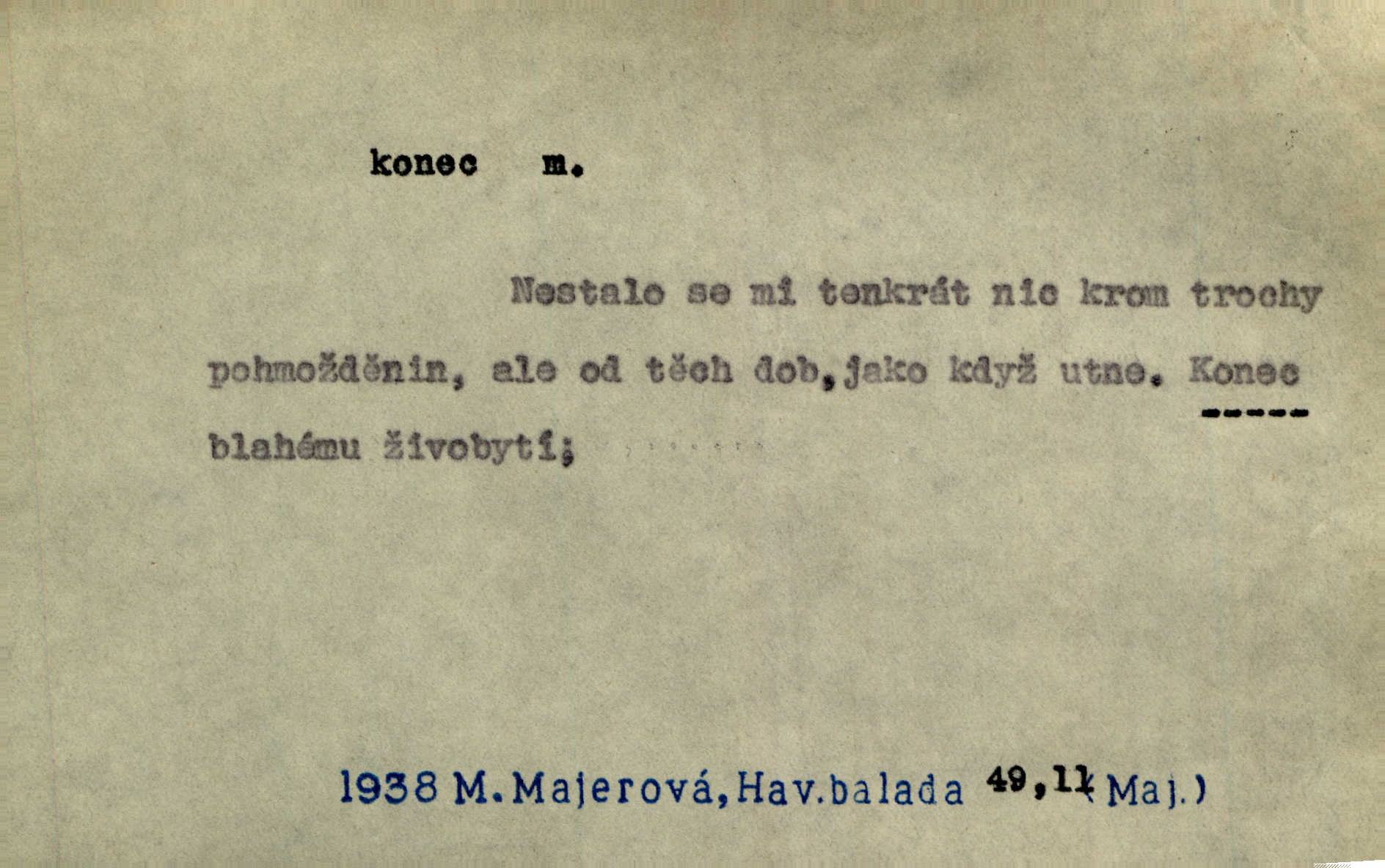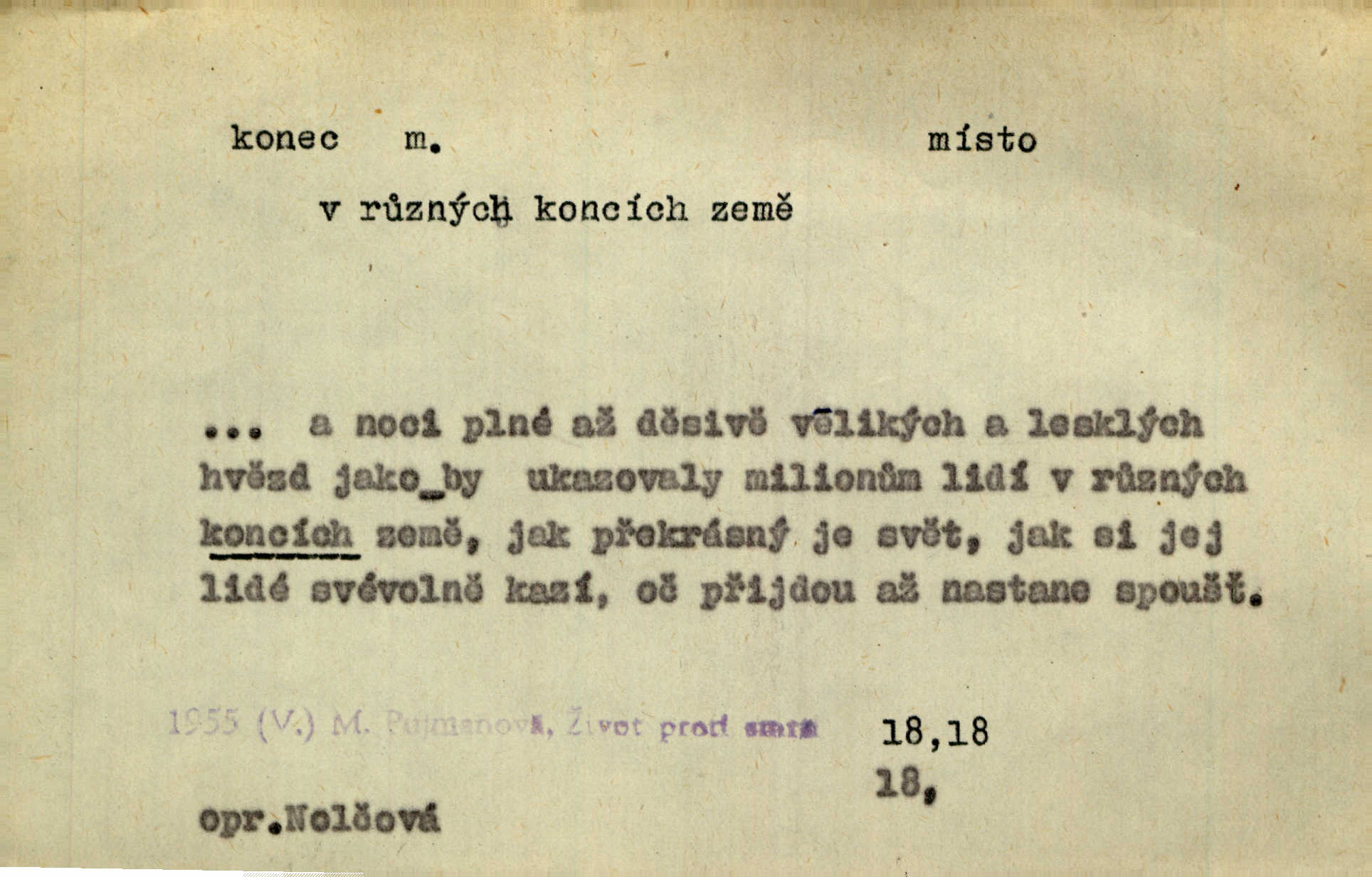 - konec, -nce m. kraj, mez, kde se věc začíná n. přestává. Hůl má dva konce. Změřiti něco od jednoho konce k druhému. Všecko má svůj konec. Dolní konec vsi. Z Čech až na konec světa. Jir. Svěřila své děti podivným, ze všech konců přivandrovalým cizozemkám končin. R. Svob. Zvali se hosté, vařilo se v kuchyni již kolik dní, jakož se i tisíc jiných radovánek chystalo na všech koncích. Něm. Držela [Atala] konec provazce. Jg. Jde tu o věc, ve které my lidé máme držet za jeden konec býti zajedno. K. Čap. Všecko ihned pochopovala, každého díla se chápala za pravý konec volila vhodný prostředek. Hol. Vždy levý konec všeho uchopí nesprávně začne. Vrch. Zaslechl jsem něco o křížových válkách a nevím tomu ani konce ani zvonce nemám o tom ponětí. Herb. Ztratil jsem konec zamotal jsem se (na př. ve vypravování). Bez míry, bez konce jest milost boží. Erb. D Zř. předl. Konec cesty v lese, kamenité, šedivý hrad v širou dálku hledí. Heyd. D (o čase) poslední doba, (o činnosti) ustání, přestání, výsledek. Byloť koncem dubna. Jir. Koncem sedmileté války došla klamná zpráva. Jir. V tom konci století, v těch zájmů vřavě zříš v dálku mizet onu Kaina kletbu. Vrch. Kdo pak je ta Mančinka a Cilka a Václav? ptala se kněžna, ráda chtíc věděti všemu konec i začátek všecko zevrubně. Něm. Zahradník vypravoval všecko od začátku až do konce. Pfleg. Již nehádali se více o francouzskou revoluci, aniž rozumovali o konci světa. Jir. Pamatujte si, že jsem vám to řekla, a dosť a konec! víc nemluvím. Kosm. Konec jest velikému carátu ruskému. Med. Nastala zima dlouhá a trapná; nebylo jí konce. Klost. Jeníku, kde je tě konec? kam ses poděl. Svět. Panímáma hleděla si domácnosti, a kde pantáty konec — nikdo nevěděl. Herrm. Pátral, kde je mu konec. Sez. Bůh ví kde mu bylo konce. Ehrenb. Jisté úkony [instinktivní] musejí následovati po sobě, porušíte-li jejich ustálený sled, je instinkt v koncích bezmocný. K. Čap. Je s jměním v koncích, nyní si pořád vypůjčuje. Prav. Ať si kdo chce chválí vynálezy a současnou vzdělanost, my pravíme, že je svět v koncích nemůže dál. Vanč. Kdo má kozla zahradníkem a Kaču za sousedku, ten je s ajnmolancem(sic!) v koncích nedopočítá se. Kosm. Jsem již [s vypravováním] u konce. Rub. Síly jeho byly u konce neměl sil. Svět. Byl se svou trpělivostí u konce došla mu trpělivost. Svět. A i kdyby teď dělali [sousedé] kdo ví co, mezi nimi a námi je navždy konec nebudeme nikdy přáteli. Svět. Je-li konec zpěvu jeho, s národem celým konec jest veta po něm. Vrch. Odtud až potud a každá písnička má svůj konec a ta Roblova skončila ohavně. Baar. Doufám, že přijdeme k dobrému konci shodneme se. Šmil. Dá bůh, že to všecko vezme dobrý a šťastný konec šťastně skončí. Šmil. Však jsem byla včera na Lhotce u strejce, aby to vzalo nějaký konec skončilo se. Rais. [Jahelková] povídala o nemocích, nemohla přijíti k žádnému konci. Prav. Arnulf dokoná, co nemohli Ludvíkové ke konci přivésti. Hurb. Udělej tomu [známosti]‚ holka, konec ukonči to. Staš. Já toho všivého života mám dost a umínil jsem si, že tomu udělám konec, čemu se říká konec s kalafunou. Klost. Já kdybych se rozstonal, udělám tomu krátkej konec. Udělám si smrť. Herb. Národy různých jazyků, mravů a zvyků nepřivedeš pod jeden klobouk. Proto došlo to s Josefem [císařem] do smutných konců! smutně to skončilo, dopadlo. Šmil. Ale tvou vinou došlo do těchto konců tak to dopadlo. Klost. Ale na konec stará synovi přece povolila konečně. Jir. Na konci však mně i žena, kmet i dítě sevšední konečně. Vrch. Koncem rád jsi, když jen život chráníš konečně. Vrch. Konec konců každá chudoba je zaviněná konečně, ostatně. Vach. Řidč. v konci konců, konec (s) koncem, konec ke konci. Všecko možné podnikáme a v konci konců výsledky našeho úsilí jsou přece nepatrné. Hol. Ještě jsem mu hodně vyčtla a konec koncem bylo, že jsem mu vypověděla. Něm. Avšak konec s koncem „Němci zase prý jen Němcům přejí“. Rez. Já že bych snad konec ke konci měl ještě jíti k nim? Třeb. D smrt. Když však ulehl a pořád scházel, nezapírali si, že to s ním jde ku konci. Prav. Sestárlý orel zimomřivý na sněti sedí sám a sám, stesk konce hled mu mlží sivý. Mach. Mrtvola Horáčkova byla s jinými mrtvolami z obecné kaple vyvezena — „jaký život, taký konec,“ pravil pan provisor. Ner. D účel, cíl. Obyvatelé [městečka] měli pěstovati řemesla a handle. K tomu konci nadáni byli od počátku právem týdeních trhů. Pek. Nejsouť zde tyto odchylky vylíčeny k tomu konci, abychom škodolibě vlastní přednosti své měřili. Durd.