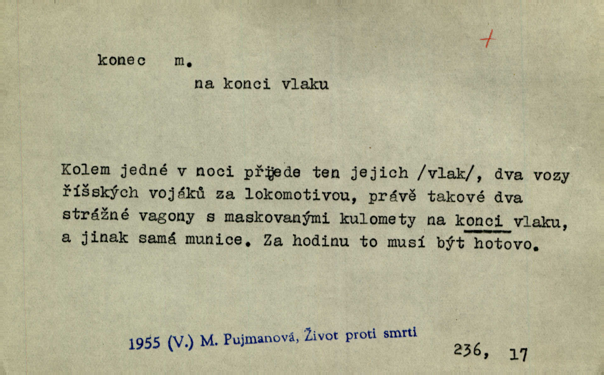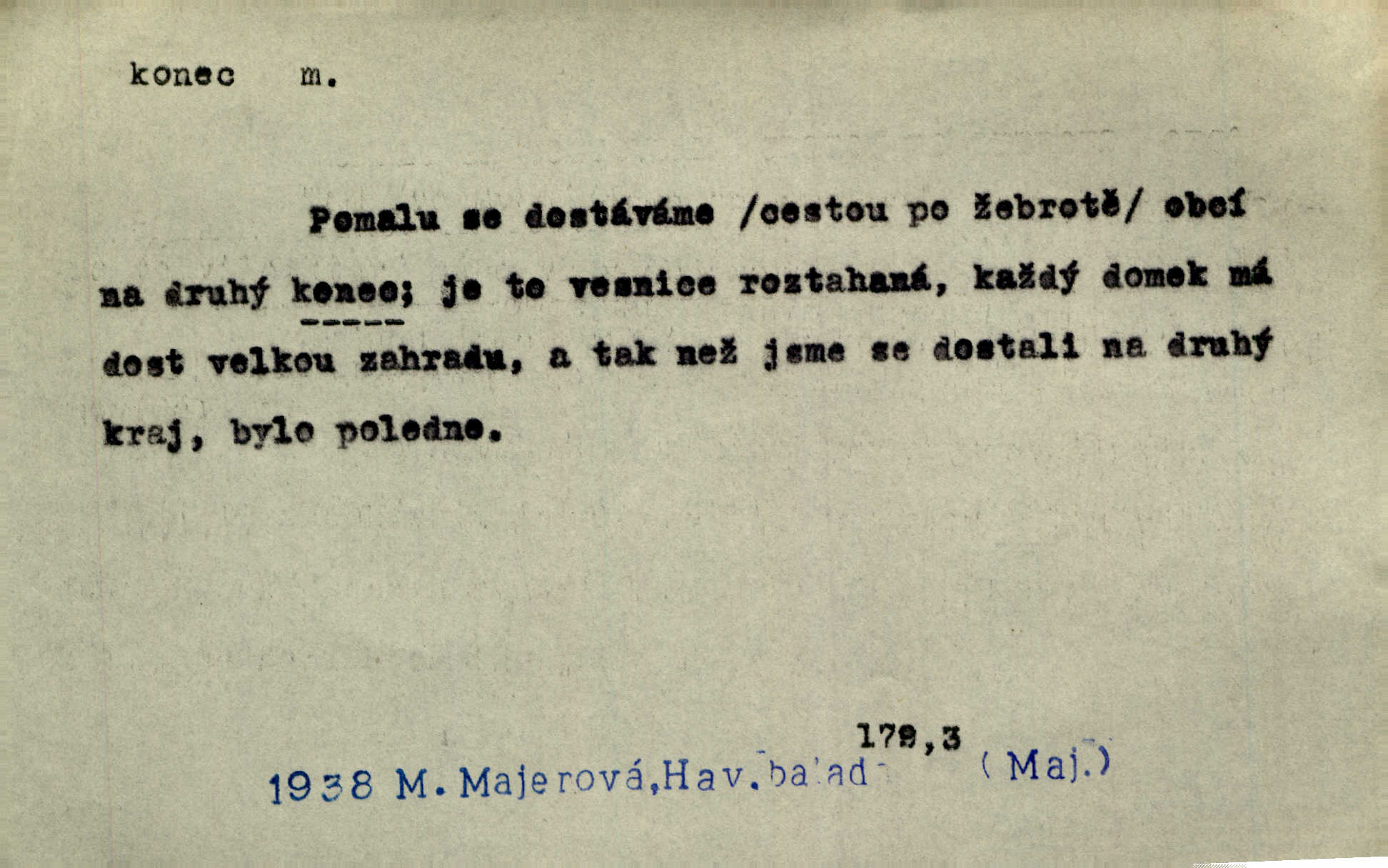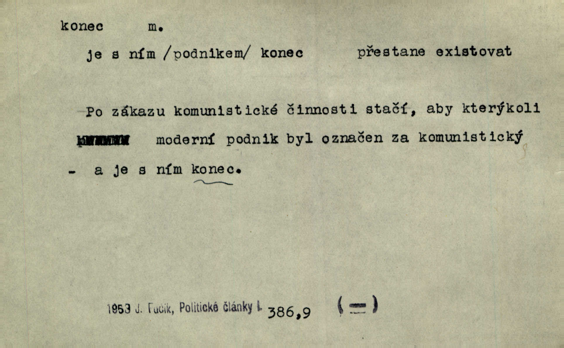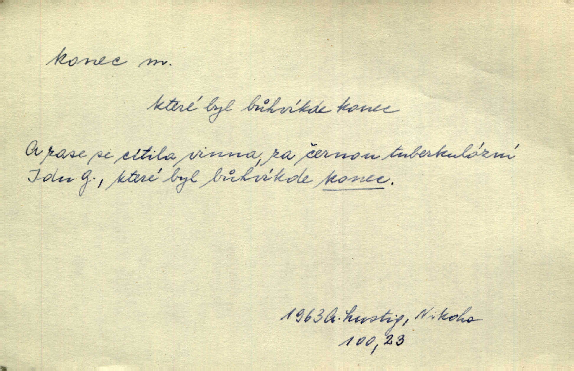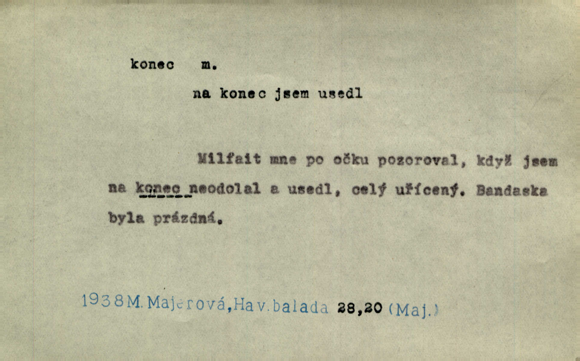 - konec, -nce m. kraj, mez, kde se věc začíná n. přestává. Hůl má dva konce. Změřiti něco od jednoho konce k druhému. Všecko má svůj konec. Dolní konec vsi. Z Čech až na konec světa. Jir. Svěřila své děti podivným, ze všech konců přivandrovalým cizozemkám končin. R. Svob. Zvali se hosté, vařilo se v kuchyni již kolik dní, jakož se i tisíc jiných radovánek chystalo na všech koncích. Něm. Držela [Atala] konec provazce. Jg. Jde tu o věc, ve které my lidé máme držet za jeden konec býti zajedno. K. Čap. Všecko ihned pochopovala, každého díla se chápala za pravý konec volila vhodný prostředek. Hol. Vždy levý konec všeho uchopí nesprávně začne. Vrch. Zaslechl jsem něco o křížových válkách a nevím tomu ani konce ani zvonce nemám o tom ponětí. Herb. Ztratil jsem konec zamotal jsem se (na př. ve vypravování). Bez míry, bez konce jest milost boží. Erb. D Zř. předl. Konec cesty v lese, kamenité, šedivý hrad v širou dálku hledí. Heyd. D (o čase) poslední doba, (o činnosti) ustání, přestání, výsledek. Byloť koncem dubna. Jir. Koncem sedmileté války došla klamná zpráva. Jir. V tom konci století, v těch zájmů vřavě zříš v dálku mizet onu Kaina kletbu. Vrch. Kdo pak je ta Mančinka a Cilka a Václav? ptala se kněžna, ráda chtíc věděti všemu konec i začátek všecko zevrubně. Něm. Zahradník vypravoval všecko od začátku až do konce. Pfleg. Již nehádali se více o francouzskou revoluci, aniž rozumovali o konci světa. Jir. Pamatujte si, že jsem vám to řekla, a dosť a konec! víc nemluvím. Kosm. Konec jest velikému carátu ruskému. Med. Nastala zima dlouhá a trapná; nebylo jí konce. Klost. Jeníku, kde je tě konec? kam ses poděl. Svět. Panímáma hleděla si domácnosti, a kde pantáty konec — nikdo nevěděl. Herrm. Pátral, kde je mu konec. Sez. Bůh ví kde mu bylo konce. Ehrenb. Jisté úkony [instinktivní] musejí následovati po sobě, porušíte-li jejich ustálený sled, je instinkt v koncích bezmocný. K. Čap. Je s jměním v koncích, nyní si pořád vypůjčuje. Prav. Ať si kdo chce chválí vynálezy a současnou vzdělanost, my pravíme, že je svět v koncích nemůže dál. Vanč. Kdo má kozla zahradníkem a Kaču za sousedku, ten je s ajnmolancem(sic!) v koncích nedopočítá se. Kosm. Jsem již [s vypravováním] u konce. Rub. Síly jeho byly u konce neměl sil. Svět. Byl se svou trpělivostí u konce došla mu trpělivost. Svět. A i kdyby teď dělali [sousedé] kdo ví co, mezi nimi a námi je navždy konec nebudeme nikdy přáteli. Svět. Je-li konec zpěvu jeho, s národem celým konec jest veta po něm. Vrch. Odtud až potud a každá písnička má svůj konec a ta Roblova skončila ohavně. Baar. Doufám, že přijdeme k dobrému konci shodneme se. Šmil. Dá bůh, že to všecko vezme dobrý a šťastný konec šťastně skončí. Šmil. Však jsem byla včera na Lhotce u strejce, aby to vzalo nějaký konec skončilo se. Rais. [Jahelková] povídala o nemocích, nemohla přijíti k žádnému konci. Prav. Arnulf dokoná, co nemohli Ludvíkové ke konci přivésti. Hurb. Udělej tomu [známosti]‚ holka, konec ukonči to. Staš. Já toho všivého života mám dost a umínil jsem si, že tomu udělám konec, čemu se říká konec s kalafunou. Klost. Já kdybych se rozstonal, udělám tomu krátkej konec. Udělám si smrť. Herb. Národy různých jazyků, mravů a zvyků nepřivedeš pod jeden klobouk. Proto došlo to s Josefem [císařem] do smutných konců! smutně to skončilo, dopadlo. Šmil. Ale tvou vinou došlo do těchto konců tak to dopadlo. Klost. Ale na konec stará synovi přece povolila konečně. Jir. Na konci však mně i žena, kmet i dítě sevšední konečně. Vrch. Koncem rád jsi, když jen život chráníš konečně. Vrch. Konec konců každá chudoba je zaviněná konečně, ostatně. Vach. Řidč. v konci konců, konec (s) koncem, konec ke konci. Všecko možné podnikáme a v konci konců výsledky našeho úsilí jsou přece nepatrné. Hol. Ještě jsem mu hodně vyčtla a konec koncem bylo, že jsem mu vypověděla. Něm. Avšak konec s koncem „Němci zase prý jen Němcům přejí“. Rez. Já že bych snad konec ke konci měl ještě jíti k nim? Třeb. D smrt. Když však ulehl a pořád scházel, nezapírali si, že to s ním jde ku konci. Prav. Sestárlý orel zimomřivý na sněti sedí sám a sám, stesk konce hled mu mlží sivý. Mach. Mrtvola Horáčkova byla s jinými mrtvolami z obecné kaple vyvezena — „jaký život, taký konec,“ pravil pan provisor. Ner. D účel, cíl. Obyvatelé [městečka] měli pěstovati řemesla a handle. K tomu konci nadáni byli od počátku právem týdeních trhů. Pek. Nejsouť zde tyto odchylky vylíčeny k tomu konci, abychom škodolibě vlastní přednosti své měřili. Durd.
