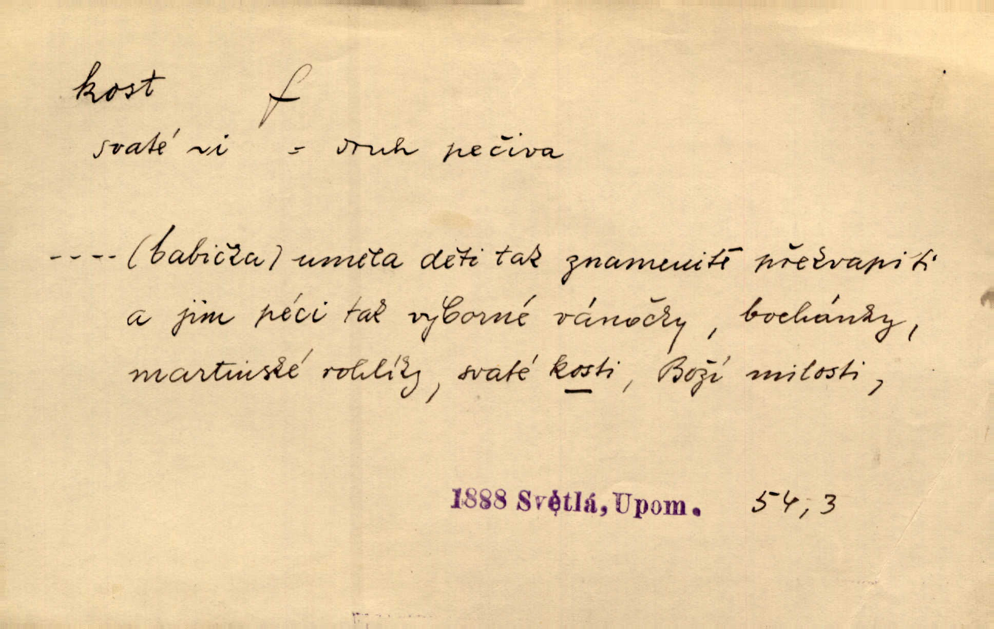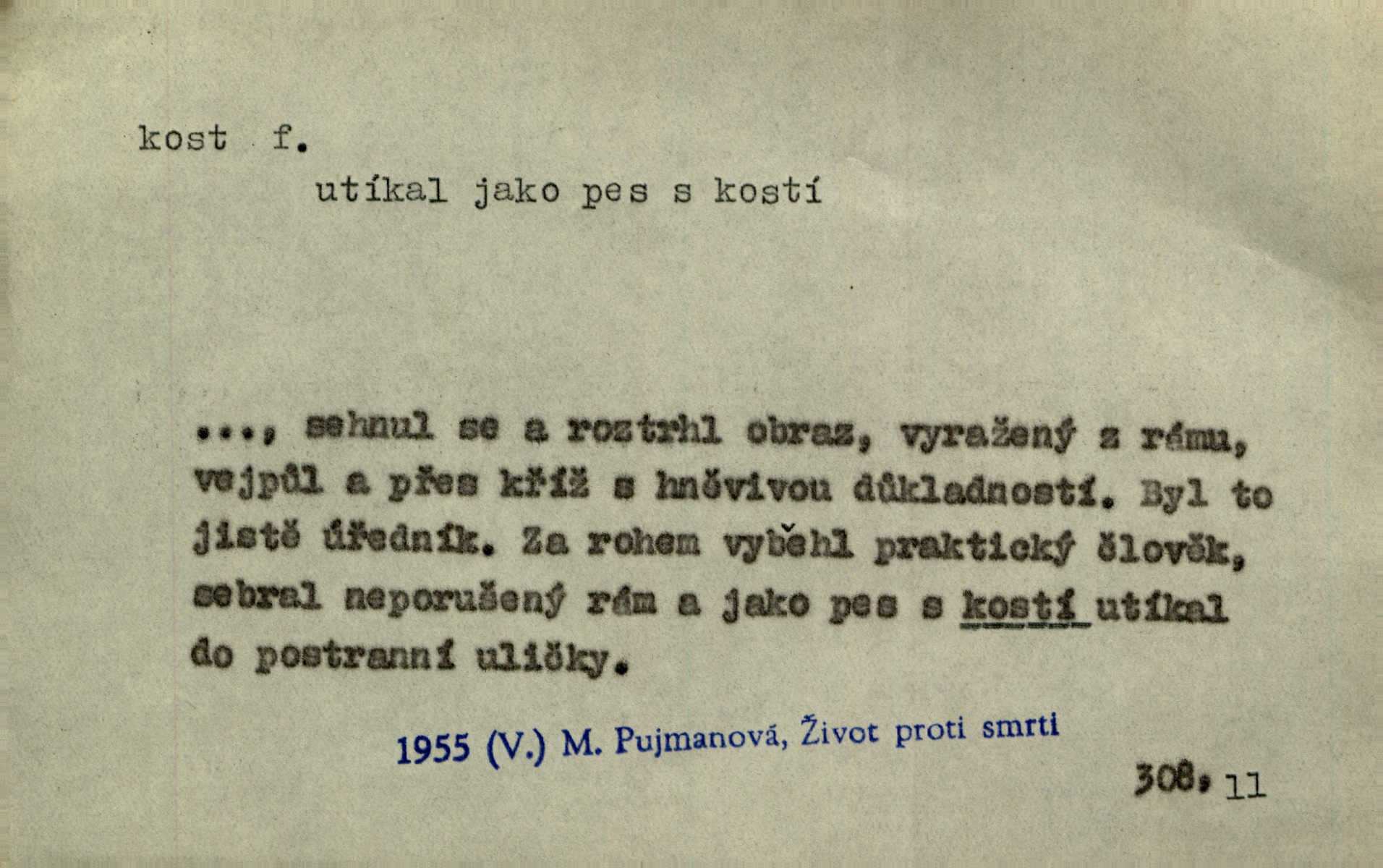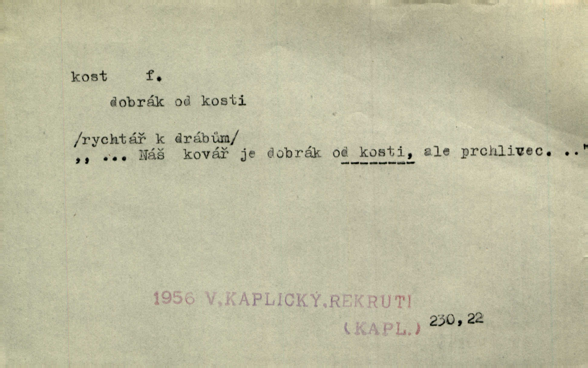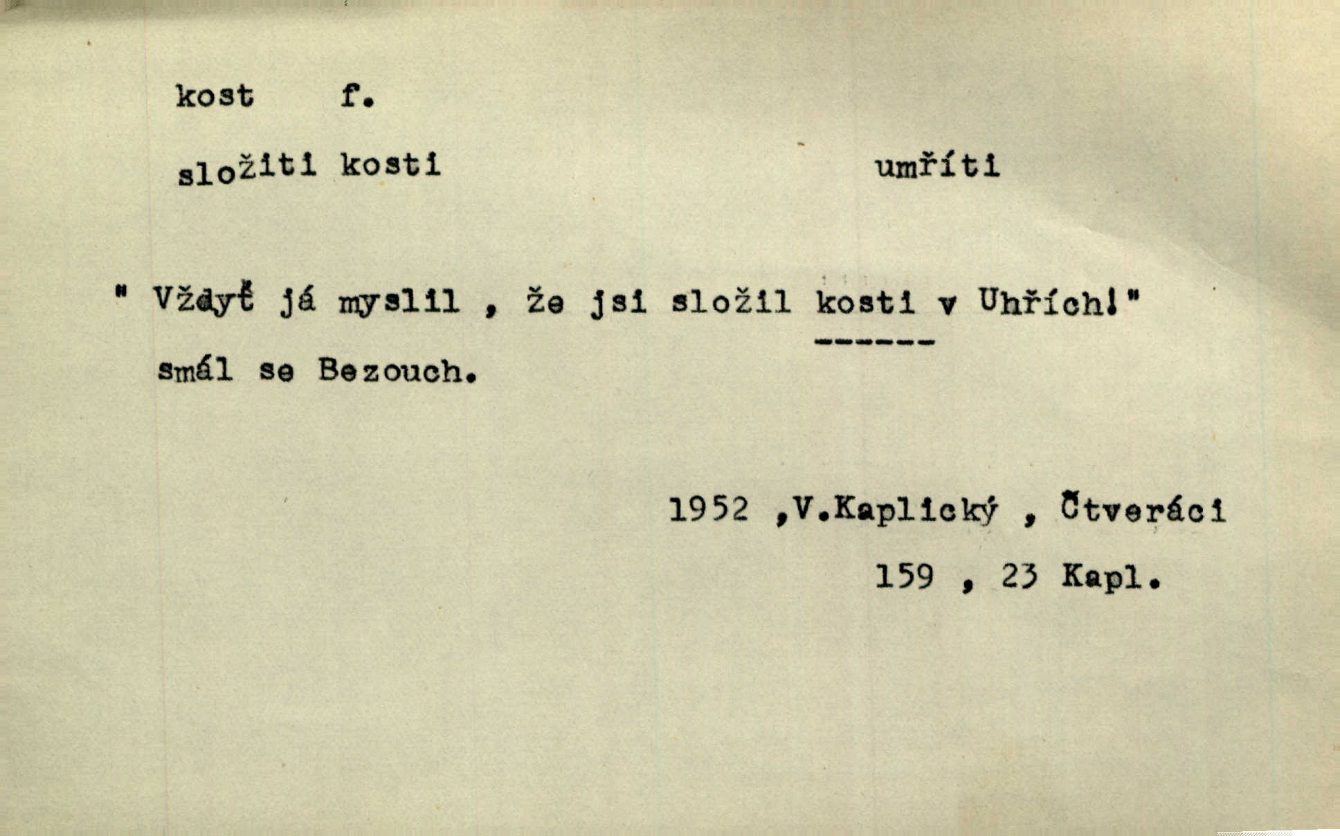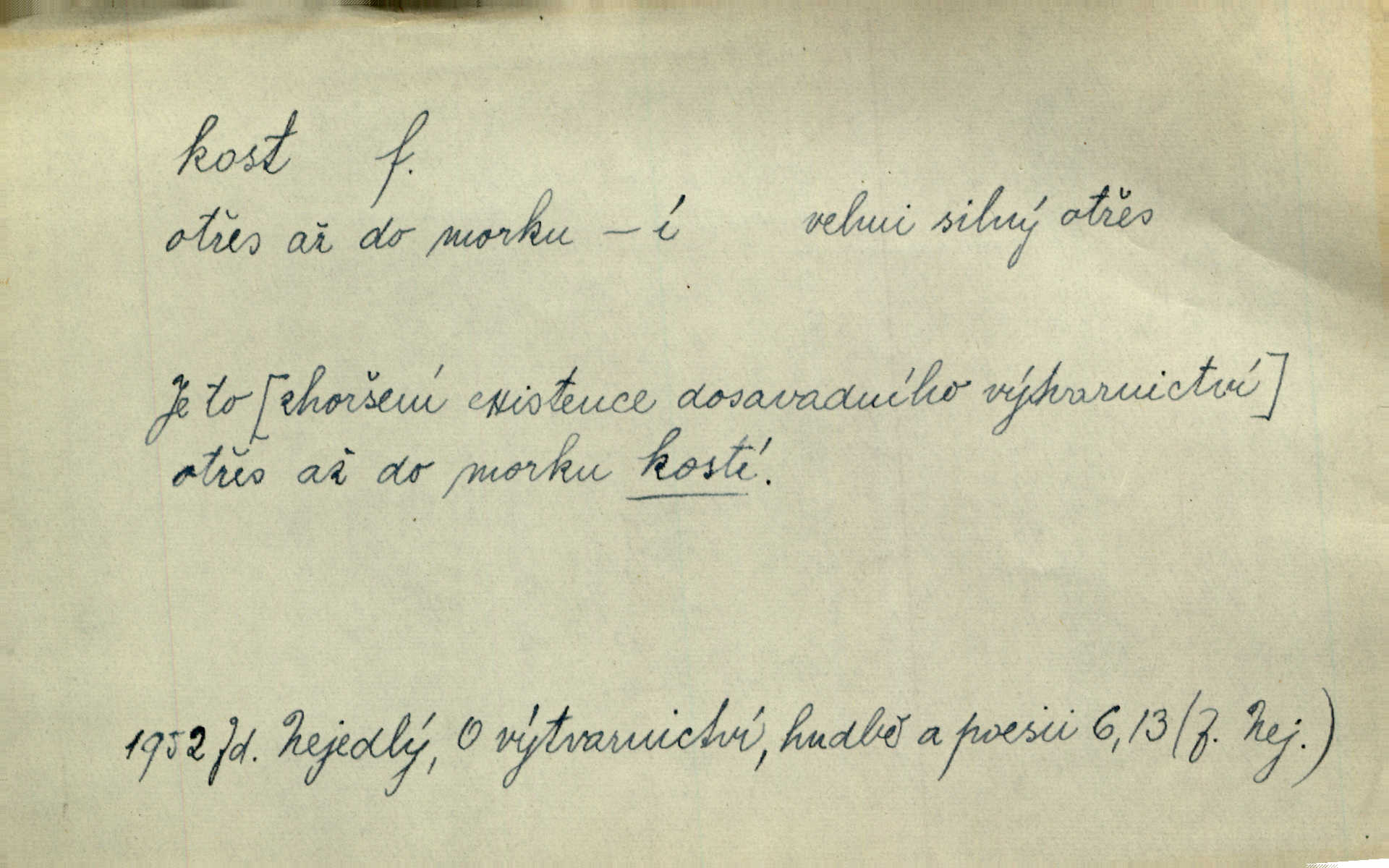 - kost, -i f. nejtvrdší pevná součást těl vyšších obratlovců. Anat. kost stehenní, ramenní, temenní, spánková, klíční a p. Jazyk bez kostí, ale kosti láme. Přísl. Tomu děvčeti kosti přelámu, pomyslí-li jen z daleka na Motyčku. Šmil. Objal ji přede všemi, až v ní kosti praskaly. Štol. Okolo psi se o kost rvou. Dyk. Ovocnému stromoví od večeře kosti. Erb. [Stařeček] radil, jak dobře prodat kosti, kopyta a kůži. A. Mrš. Kost od šunky kost se zbytkem uzeného masa. [Víly] hřebenem z rybích kostí češou svoje vlasy. V. Mrš. Uprostřed [zahrady] stál zámek ze slonové kosti. Něm. Okuláry černou kostí lemované. Jir. Rozřízl rychle bílou kostí složený arch novinářského formátu upravenou na nůž k rozřezávání. Baar. Ustál. spoj.: Cizí všude se mají nejlépe, a každý domácí, třeba že zachovalý a dobře umělý, aby kost ohlodával spokojoval se s odpadky, se zbytky. Jir. [Umělci] tvoří krásu — třeba hryzli kosti. Vrch. [Dubačka] vidí, že Sekerová je k práci lehtivá, že má v břichu kosti nerada se ohýbá. Jah. Ty člověče nemáš v břichu kosti jsi ohebný, mrštný. Prav. Starosti suší kosti. Rais. Jsem také jen z kosti a masa pouhý člověk. Šmil. Zejména tahle [osoba románu] je skvělá postava z masa i kostí životná. Přít. Muž vysoký, samá kost a sval. Jir. Sestárlé ženy, hnát a kost. Sova. Bylo ho trošek, pouhá kost a kůže byl vyhublý. Rais. Podivný muž, učiněná kost a kůže. Třeb. Starý, scvrklý, na kost a kůži vyschlý vápeník. Baar. Ruka byla na kost vyhublá. Šim. Je promrzlý na kost úplně. Kun. V té strašné nepohodě [žoldnéři] velmi promrzli a skřehli na kosť. Jir. Bylo umrzlo na kost, sucho tvrdě, do tvrda. Herrm. Země ztvrdlá na kosť pod nohou hřmotila jak dutá. A. Mrš. Jste mazaní, chytří až na kost skrz naskrz. Med. Zdřevěnělé, do těch kostí ztuhlé moje nohy nestačily běžet za ní. Klost. Je tam [venku] sychravo, až do kosti leze. Jir. Mráz projel až do kostí všem při tom pomyšlení. Herb. Mráz mu prolézal kosti. Rais. Je strašná zima, až mi kosti láme. Ner. Kapelníkův klarinet zaječel, až to do kostí projelo pronikavě. Rais. Zvuk, který projel kostmi až do morku a který by mrtvého musil vzbudit. Baar. Táhlý hvizd dřeň kostí pronikající. Čap. Ch. Dle starého zvyku, který mu přešel časem do kosti i krve, ještě před spaním zpytoval si [Cimbura] svoje svědomí. Baar. Kdo by se ubránil, když už to je v kostech a krvi. Jir. Až do kostí proniknuti jsme byli Palackého učením úplně, naveskrz. Herb. Obrátiti kacíře do kosti zkaženého nadobro. Lier. [Správce] měl na sedláky zvláštní zálusk, mysle, že je každý šelma od kosti. Něm. Šafář zdál se od kosti surový i nevlídný chlapík. E. Jel. Strýc rada je byrokrat od kosti. Šim. Benedek, voják od kosti. Mach. Bílek — jinak od kosti vlastenec — [na němčinu] přece si vždy postonal. A. Mrš. Farář byl dobrák od kosti, důvěřivý ke každému skrz naskrz. Herb. D Tech. kost odpadek při lití ingotů zdola. D V pl. tělo, tělesné pozůstatky. Cítil, že jsou [jeho děti] krev jeho krve a kost jeho kostí jeho pokrevní potomci. Baar. Právem-li se můžeme pokládat za dědice slávy otců svých a za kosť z kostí jejich? Herb. Až budeš mět tak staré kosti jako já, taky jim začneš hovět až budeš tak stár. Herb. On vysvlekne se beze studu a staré kosti vyhřívá. Mach. Veden dávnou náklonností, vláčel [muž] světem svoje staré kosti z boje v boj a bouř. O. Červ. Zdá se mi, že už nemáte mladé kosti nejste mladí. Svob. Pokud mám zdravé kosti pokud jsem tělesně zdráv. Šmil. Po práci jsou [rodiče] rádi, když kosti natáhnou odpočinou si. Rais. Občas si protáhnout kosti na peroně odpočinouti si, projíti se, protáhnouti se. K. Čap. [Teta k synovcovi:] Přec bych tě ráda, než natáhnu kosti, viděla v nějakém pořádku než zemru. Rais. Já bych přece ráda kosti svoje v domácí zemi složila byla pochována. Něm. Na ty dvě hlavy naše krev, až z našich kostí mstitel vstane. Bezr. D Lid. ženská, děvče. Každej pořádnej voják, když si odbude svoje věci a srovná si dle předpisu kavalec, jde se vohlídnout po nějaký kosti. Med. Naše markytánka není žádná kůstka — to je pevná, zralá kost — ale pro silné, zdravé zuby právě tak nejlepší. Tyl. D Lid. všech svatých kosti, svaté kosti druh pečiva. Půjde-li to tak dál, budou si lidé naposled v červenci do kávy drobit vánočky, kulaté „dušičky“ a „všech svatých kosti“ budou se válet beze všeho rozumu po celý rok. Ner. [Babička] uměla péci tak výborné vánočky, bochánky, martinské rohlíky, svaté kosti, Boží milosti. Svět.