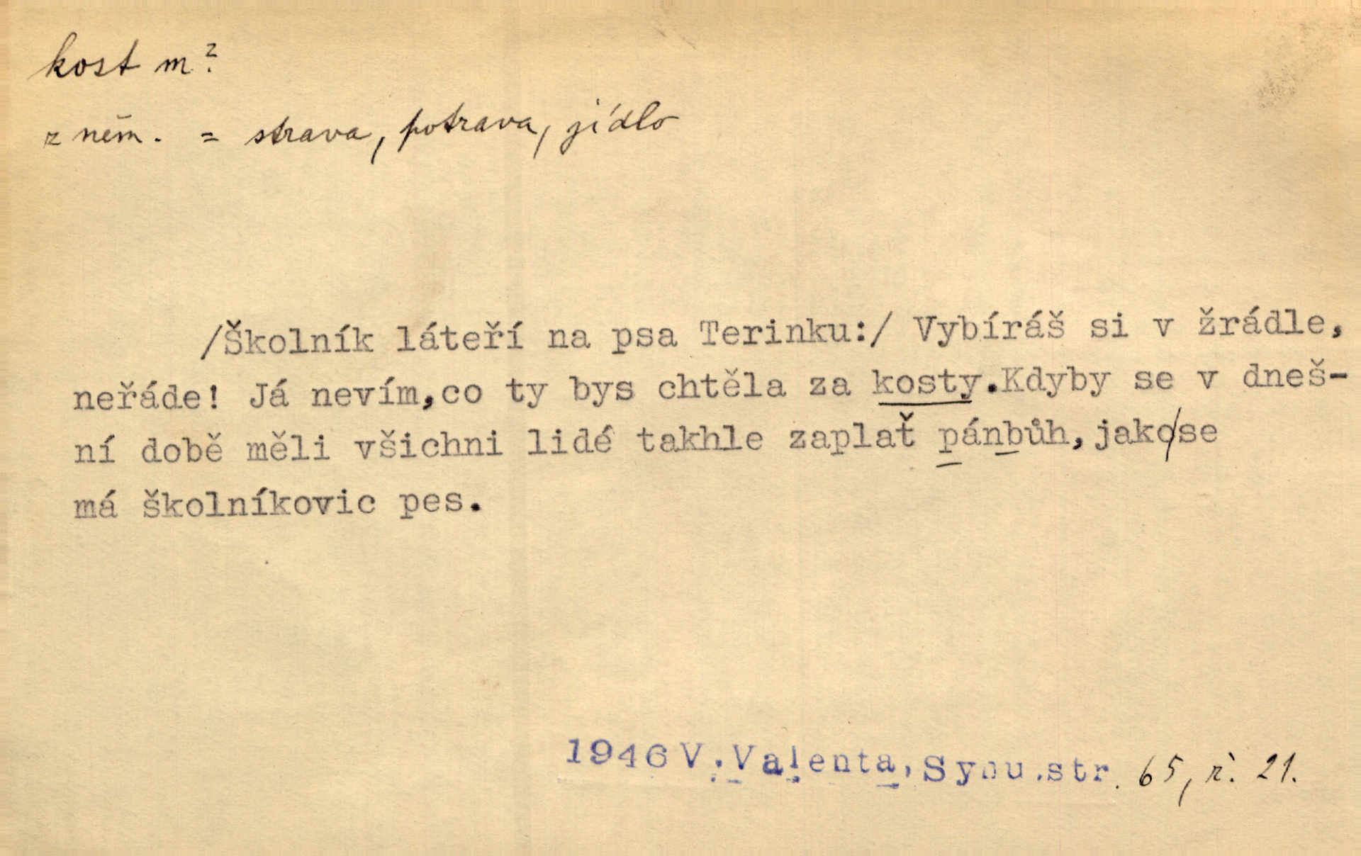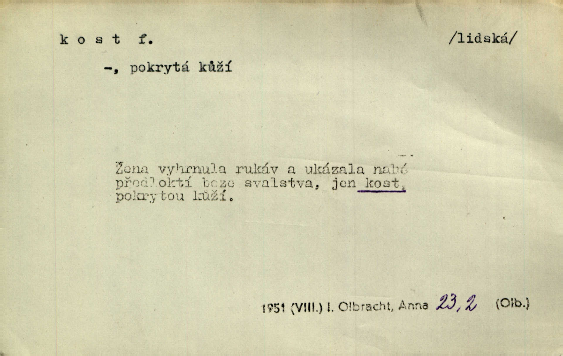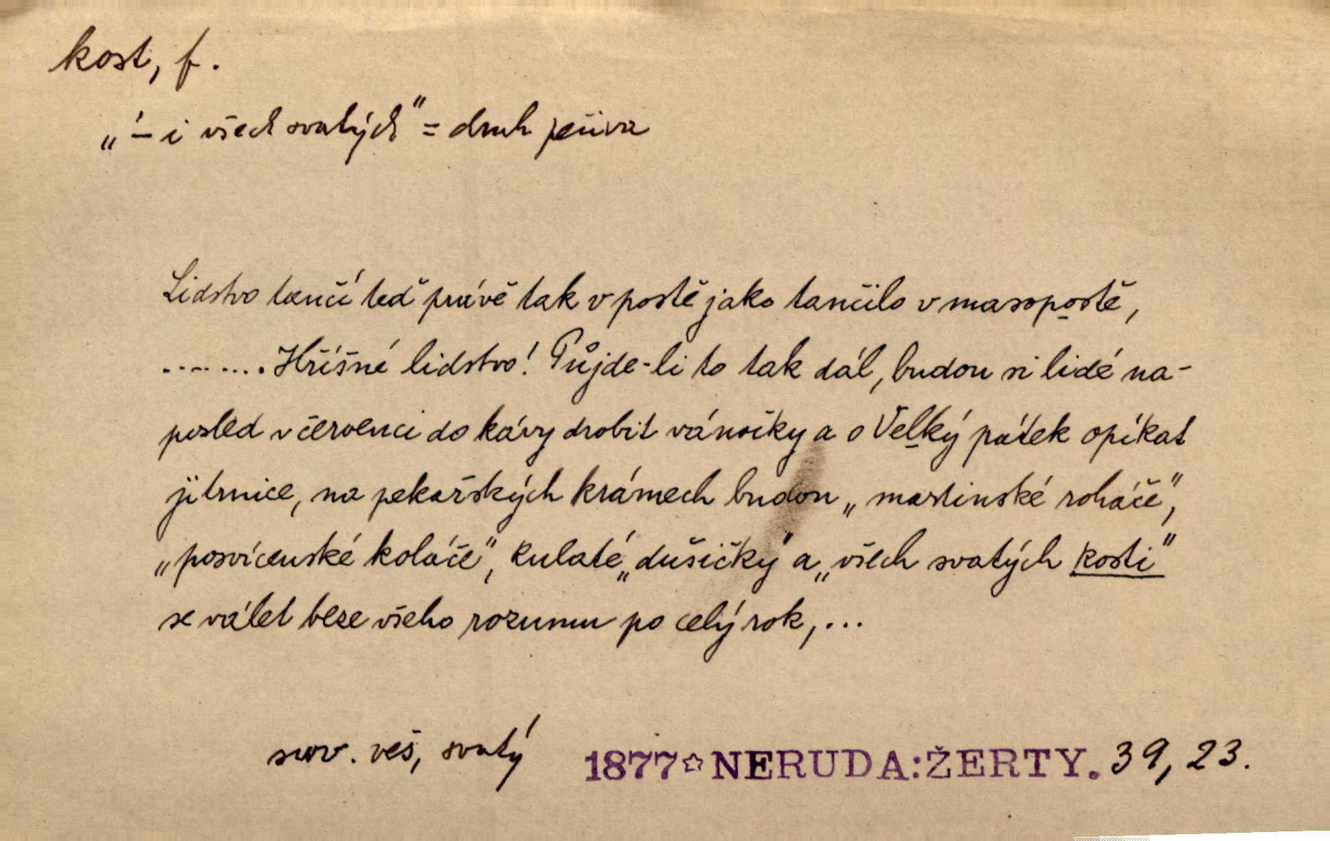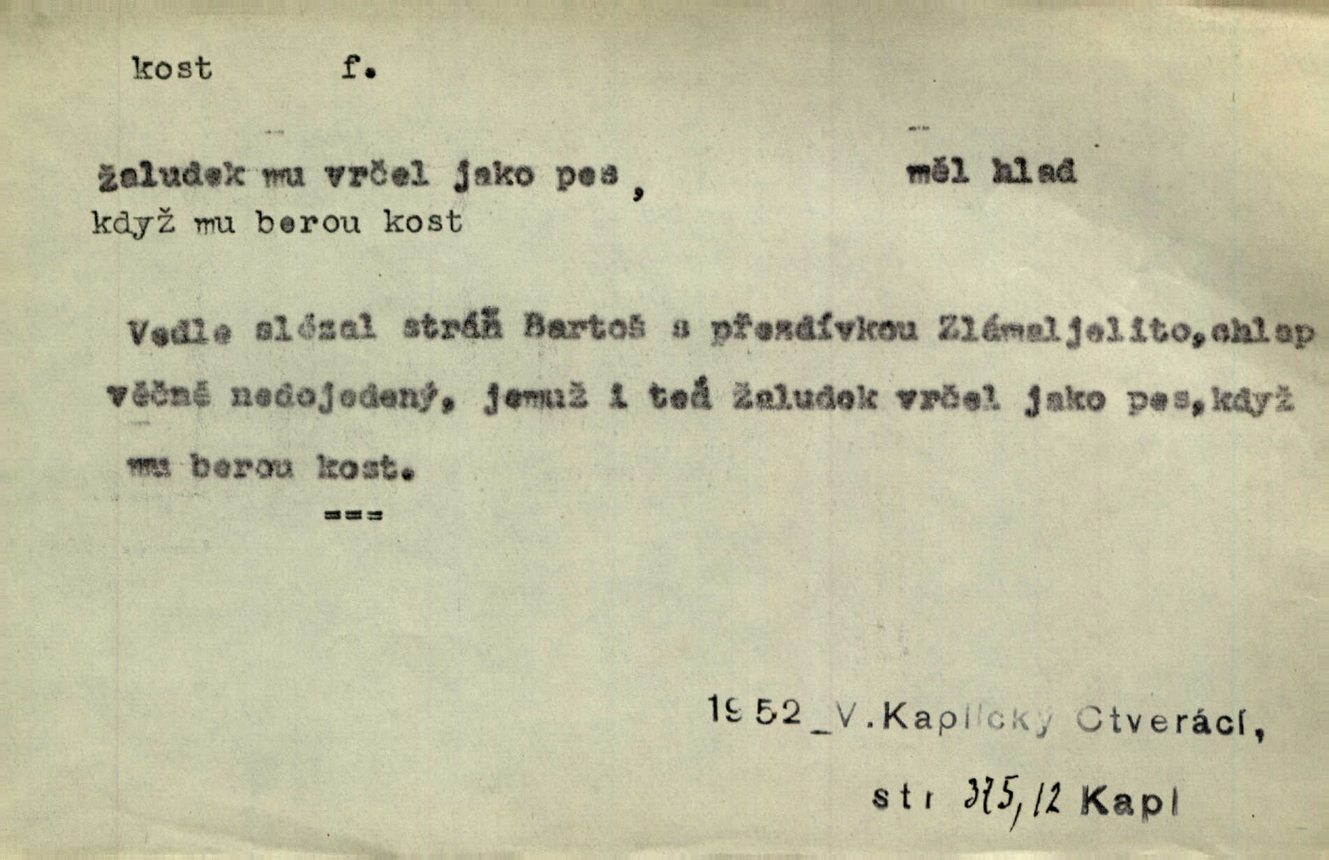 - kost, -i f. nejtvrdší pevná součást těl vyšších obratlovců. Anat. kost stehenní, ramenní, temenní, spánková, klíční a p. Jazyk bez kostí, ale kosti láme. Přísl. Tomu děvčeti kosti přelámu, pomyslí-li jen z daleka na Motyčku. Šmil. Objal ji přede všemi, až v ní kosti praskaly. Štol. Okolo psi se o kost rvou. Dyk. Ovocnému stromoví od večeře kosti. Erb. [Stařeček] radil, jak dobře prodat kosti, kopyta a kůži. A. Mrš. Kost od šunky kost se zbytkem uzeného masa. [Víly] hřebenem z rybích kostí češou svoje vlasy. V. Mrš. Uprostřed [zahrady] stál zámek ze slonové kosti. Něm. Okuláry černou kostí lemované. Jir. Rozřízl rychle bílou kostí složený arch novinářského formátu upravenou na nůž k rozřezávání. Baar. Ustál. spoj.: Cizí všude se mají nejlépe, a každý domácí, třeba že zachovalý a dobře umělý, aby kost ohlodával spokojoval se s odpadky, se zbytky. Jir. [Umělci] tvoří krásu — třeba hryzli kosti. Vrch. [Dubačka] vidí, že Sekerová je k práci lehtivá, že má v břichu kosti nerada se ohýbá. Jah. Ty člověče nemáš v břichu kosti jsi ohebný, mrštný. Prav. Starosti suší kosti. Rais. Jsem také jen z kosti a masa pouhý člověk. Šmil. Zejména tahle [osoba románu] je skvělá postava z masa i kostí životná. Přít. Muž vysoký, samá kost a sval. Jir. Sestárlé ženy, hnát a kost. Sova. Bylo ho trošek, pouhá kost a kůže byl vyhublý. Rais. Podivný muž, učiněná kost a kůže. Třeb. Starý, scvrklý, na kost a kůži vyschlý vápeník. Baar. Ruka byla na kost vyhublá. Šim. Je promrzlý na kost úplně. Kun. V té strašné nepohodě [žoldnéři] velmi promrzli a skřehli na kosť. Jir. Bylo umrzlo na kost, sucho tvrdě, do tvrda. Herrm. Země ztvrdlá na kosť pod nohou hřmotila jak dutá. A. Mrš. Jste mazaní, chytří až na kost skrz naskrz. Med. Zdřevěnělé, do těch kostí ztuhlé moje nohy nestačily běžet za ní. Klost. Je tam [venku] sychravo, až do kosti leze. Jir. Mráz projel až do kostí všem při tom pomyšlení. Herb. Mráz mu prolézal kosti. Rais. Je strašná zima, až mi kosti láme. Ner. Kapelníkův klarinet zaječel, až to do kostí projelo pronikavě. Rais. Zvuk, který projel kostmi až do morku a který by mrtvého musil vzbudit. Baar. Táhlý hvizd dřeň kostí pronikající. Čap. Ch. Dle starého zvyku, který mu přešel časem do kosti i krve, ještě před spaním zpytoval si [Cimbura] svoje svědomí. Baar. Kdo by se ubránil, když už to je v kostech a krvi. Jir. Až do kostí proniknuti jsme byli Palackého učením úplně, naveskrz. Herb. Obrátiti kacíře do kosti zkaženého nadobro. Lier. [Správce] měl na sedláky zvláštní zálusk, mysle, že je každý šelma od kosti. Něm. Šafář zdál se od kosti surový i nevlídný chlapík. E. Jel. Strýc rada je byrokrat od kosti. Šim. Benedek, voják od kosti. Mach. Bílek — jinak od kosti vlastenec — [na němčinu] přece si vždy postonal. A. Mrš. Farář byl dobrák od kosti, důvěřivý ke každému skrz naskrz. Herb. D Tech. kost odpadek při lití ingotů zdola. D V pl. tělo, tělesné pozůstatky. Cítil, že jsou [jeho děti] krev jeho krve a kost jeho kostí jeho pokrevní potomci. Baar. Právem-li se můžeme pokládat za dědice slávy otců svých a za kosť z kostí jejich? Herb. Až budeš mět tak staré kosti jako já, taky jim začneš hovět až budeš tak stár. Herb. On vysvlekne se beze studu a staré kosti vyhřívá. Mach. Veden dávnou náklonností, vláčel [muž] světem svoje staré kosti z boje v boj a bouř. O. Červ. Zdá se mi, že už nemáte mladé kosti nejste mladí. Svob. Pokud mám zdravé kosti pokud jsem tělesně zdráv. Šmil. Po práci jsou [rodiče] rádi, když kosti natáhnou odpočinou si. Rais. Občas si protáhnout kosti na peroně odpočinouti si, projíti se, protáhnouti se. K. Čap. [Teta k synovcovi:] Přec bych tě ráda, než natáhnu kosti, viděla v nějakém pořádku než zemru. Rais. Já bych přece ráda kosti svoje v domácí zemi složila byla pochována. Něm. Na ty dvě hlavy naše krev, až z našich kostí mstitel vstane. Bezr. D Lid. ženská, děvče. Každej pořádnej voják, když si odbude svoje věci a srovná si dle předpisu kavalec, jde se vohlídnout po nějaký kosti. Med. Naše markytánka není žádná kůstka — to je pevná, zralá kost — ale pro silné, zdravé zuby právě tak nejlepší. Tyl. D Lid. všech svatých kosti, svaté kosti druh pečiva. Půjde-li to tak dál, budou si lidé naposled v červenci do kávy drobit vánočky, kulaté „dušičky“ a „všech svatých kosti“ budou se válet beze všeho rozumu po celý rok. Ner. [Babička] uměla péci tak výborné vánočky, bochánky, martinské rohlíky, svaté kosti, Boží milosti. Svět.