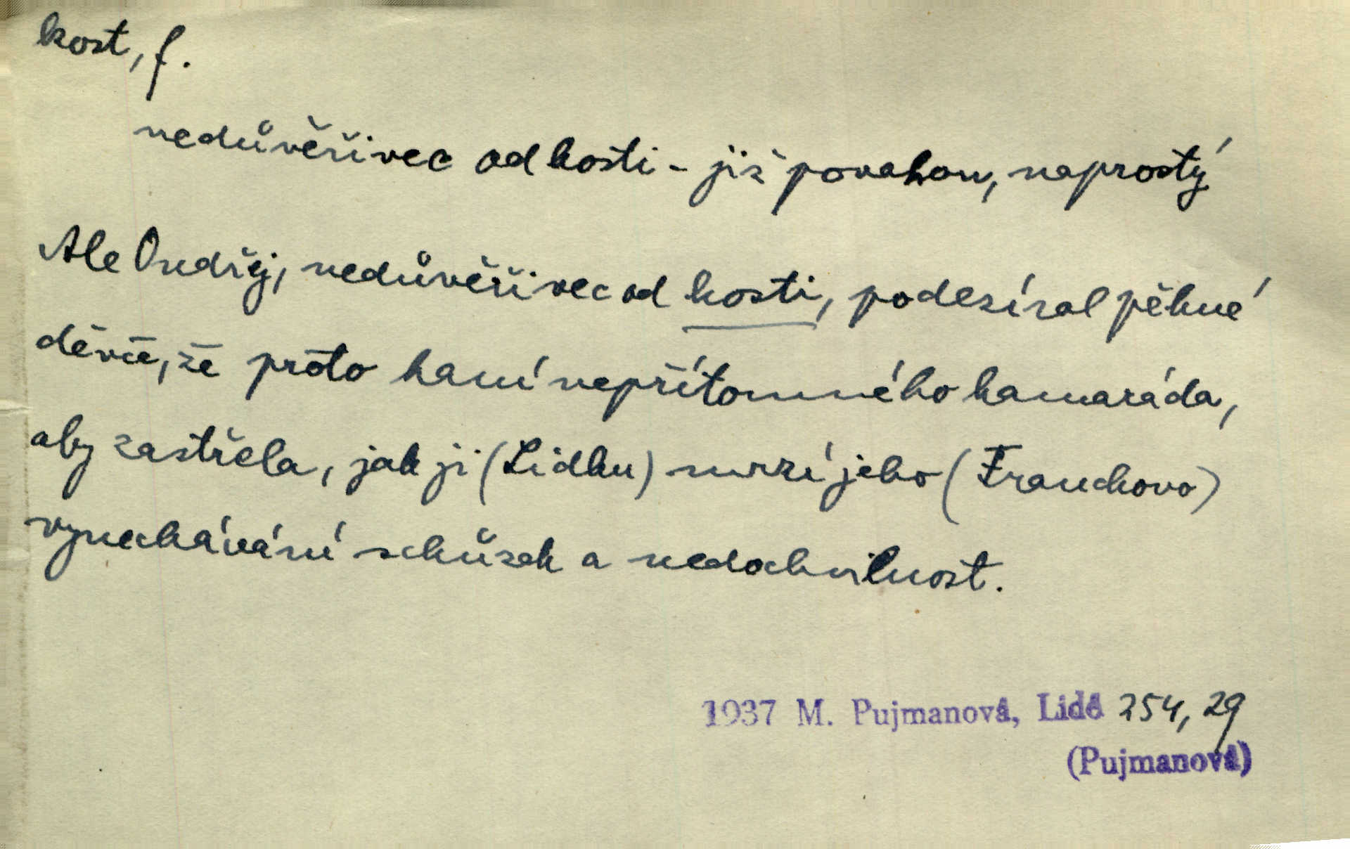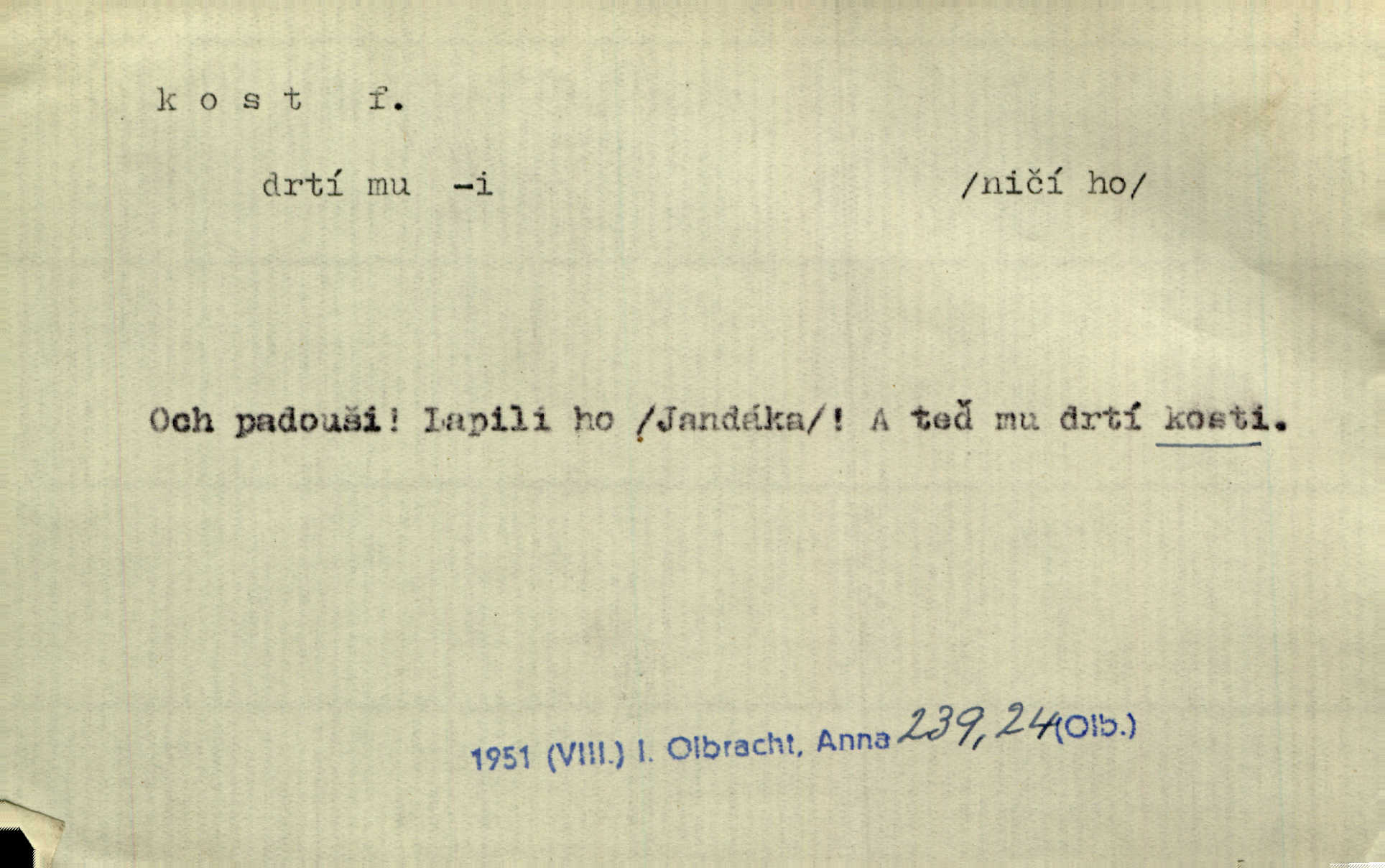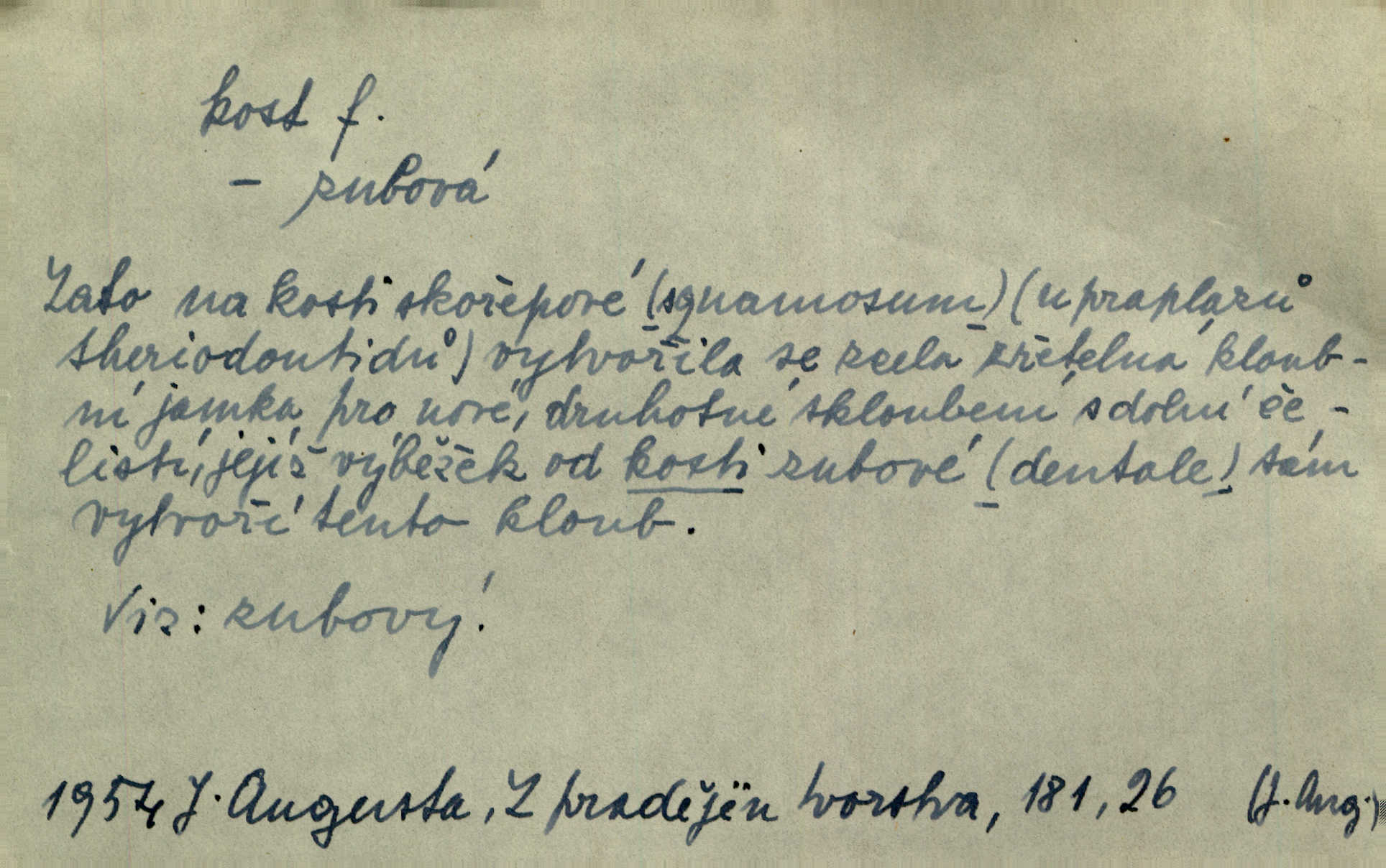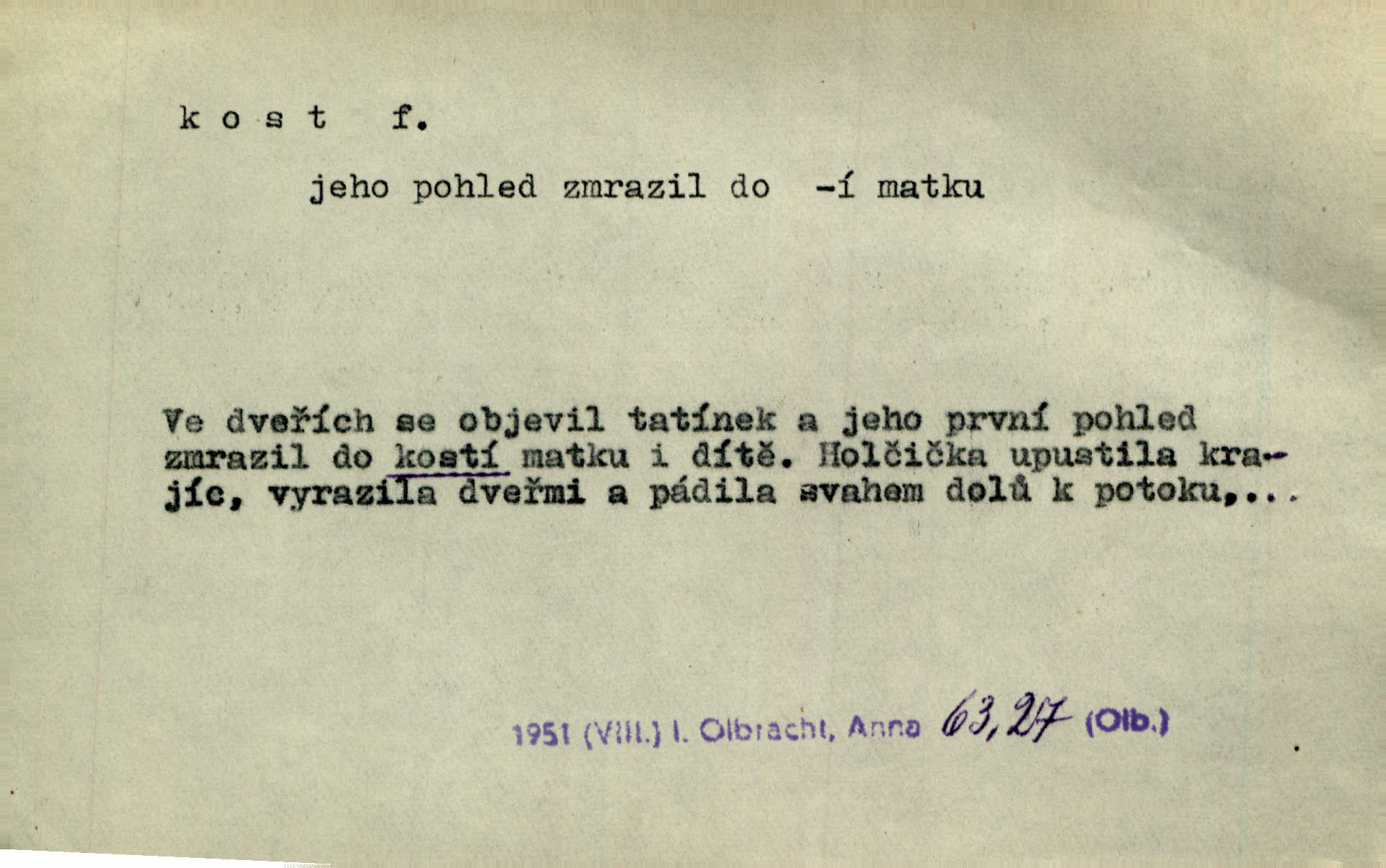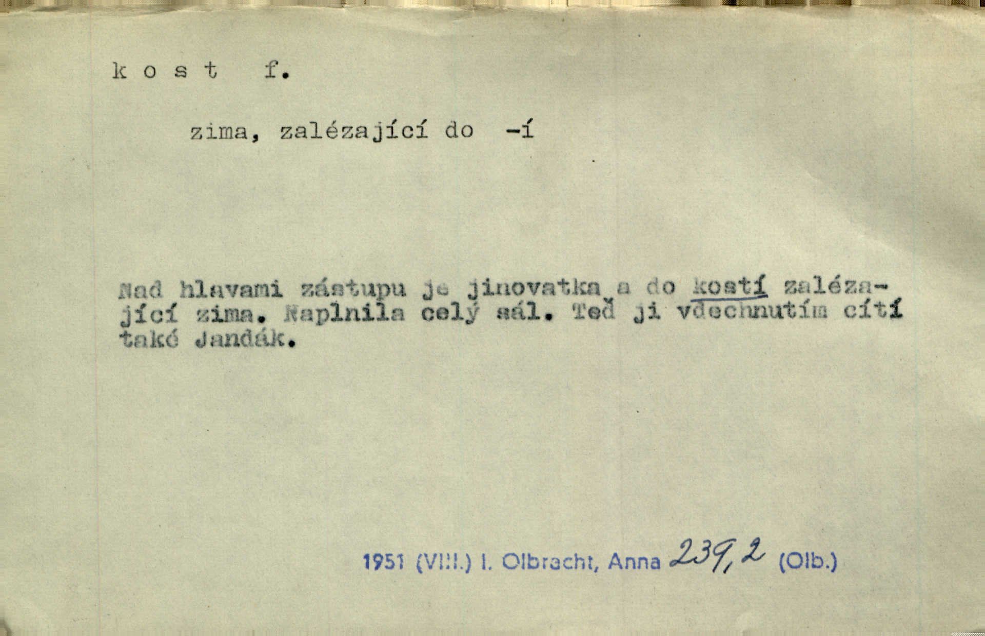 - kost, -i f. nejtvrdší pevná součást těl vyšších obratlovců. Anat. kost stehenní, ramenní, temenní, spánková, klíční a p. Jazyk bez kostí, ale kosti láme. Přísl. Tomu děvčeti kosti přelámu, pomyslí-li jen z daleka na Motyčku. Šmil. Objal ji přede všemi, až v ní kosti praskaly. Štol. Okolo psi se o kost rvou. Dyk. Ovocnému stromoví od večeře kosti. Erb. [Stařeček] radil, jak dobře prodat kosti, kopyta a kůži. A. Mrš. Kost od šunky kost se zbytkem uzeného masa. [Víly] hřebenem z rybích kostí češou svoje vlasy. V. Mrš. Uprostřed [zahrady] stál zámek ze slonové kosti. Něm. Okuláry černou kostí lemované. Jir. Rozřízl rychle bílou kostí složený arch novinářského formátu upravenou na nůž k rozřezávání. Baar. Ustál. spoj.: Cizí všude se mají nejlépe, a každý domácí, třeba že zachovalý a dobře umělý, aby kost ohlodával spokojoval se s odpadky, se zbytky. Jir. [Umělci] tvoří krásu — třeba hryzli kosti. Vrch. [Dubačka] vidí, že Sekerová je k práci lehtivá, že má v břichu kosti nerada se ohýbá. Jah. Ty člověče nemáš v břichu kosti jsi ohebný, mrštný. Prav. Starosti suší kosti. Rais. Jsem také jen z kosti a masa pouhý člověk. Šmil. Zejména tahle [osoba románu] je skvělá postava z masa i kostí životná. Přít. Muž vysoký, samá kost a sval. Jir. Sestárlé ženy, hnát a kost. Sova. Bylo ho trošek, pouhá kost a kůže byl vyhublý. Rais. Podivný muž, učiněná kost a kůže. Třeb. Starý, scvrklý, na kost a kůži vyschlý vápeník. Baar. Ruka byla na kost vyhublá. Šim. Je promrzlý na kost úplně. Kun. V té strašné nepohodě [žoldnéři] velmi promrzli a skřehli na kosť. Jir. Bylo umrzlo na kost, sucho tvrdě, do tvrda. Herrm. Země ztvrdlá na kosť pod nohou hřmotila jak dutá. A. Mrš. Jste mazaní, chytří až na kost skrz naskrz. Med. Zdřevěnělé, do těch kostí ztuhlé moje nohy nestačily běžet za ní. Klost. Je tam [venku] sychravo, až do kosti leze. Jir. Mráz projel až do kostí všem při tom pomyšlení. Herb. Mráz mu prolézal kosti. Rais. Je strašná zima, až mi kosti láme. Ner. Kapelníkův klarinet zaječel, až to do kostí projelo pronikavě. Rais. Zvuk, který projel kostmi až do morku a který by mrtvého musil vzbudit. Baar. Táhlý hvizd dřeň kostí pronikající. Čap. Ch. Dle starého zvyku, který mu přešel časem do kosti i krve, ještě před spaním zpytoval si [Cimbura] svoje svědomí. Baar. Kdo by se ubránil, když už to je v kostech a krvi. Jir. Až do kostí proniknuti jsme byli Palackého učením úplně, naveskrz. Herb. Obrátiti kacíře do kosti zkaženého nadobro. Lier. [Správce] měl na sedláky zvláštní zálusk, mysle, že je každý šelma od kosti. Něm. Šafář zdál se od kosti surový i nevlídný chlapík. E. Jel. Strýc rada je byrokrat od kosti. Šim. Benedek, voják od kosti. Mach. Bílek — jinak od kosti vlastenec — [na němčinu] přece si vždy postonal. A. Mrš. Farář byl dobrák od kosti, důvěřivý ke každému skrz naskrz. Herb. D Tech. kost odpadek při lití ingotů zdola. D V pl. tělo, tělesné pozůstatky. Cítil, že jsou [jeho děti] krev jeho krve a kost jeho kostí jeho pokrevní potomci. Baar. Právem-li se můžeme pokládat za dědice slávy otců svých a za kosť z kostí jejich? Herb. Až budeš mět tak staré kosti jako já, taky jim začneš hovět až budeš tak stár. Herb. On vysvlekne se beze studu a staré kosti vyhřívá. Mach. Veden dávnou náklonností, vláčel [muž] světem svoje staré kosti z boje v boj a bouř. O. Červ. Zdá se mi, že už nemáte mladé kosti nejste mladí. Svob. Pokud mám zdravé kosti pokud jsem tělesně zdráv. Šmil. Po práci jsou [rodiče] rádi, když kosti natáhnou odpočinou si. Rais. Občas si protáhnout kosti na peroně odpočinouti si, projíti se, protáhnouti se. K. Čap. [Teta k synovcovi:] Přec bych tě ráda, než natáhnu kosti, viděla v nějakém pořádku než zemru. Rais. Já bych přece ráda kosti svoje v domácí zemi složila byla pochována. Něm. Na ty dvě hlavy naše krev, až z našich kostí mstitel vstane. Bezr. D Lid. ženská, děvče. Každej pořádnej voják, když si odbude svoje věci a srovná si dle předpisu kavalec, jde se vohlídnout po nějaký kosti. Med. Naše markytánka není žádná kůstka — to je pevná, zralá kost — ale pro silné, zdravé zuby právě tak nejlepší. Tyl. D Lid. všech svatých kosti, svaté kosti druh pečiva. Půjde-li to tak dál, budou si lidé naposled v červenci do kávy drobit vánočky, kulaté „dušičky“ a „všech svatých kosti“ budou se válet beze všeho rozumu po celý rok. Ner. [Babička] uměla péci tak výborné vánočky, bochánky, martinské rohlíky, svaté kosti, Boží milosti. Svět.