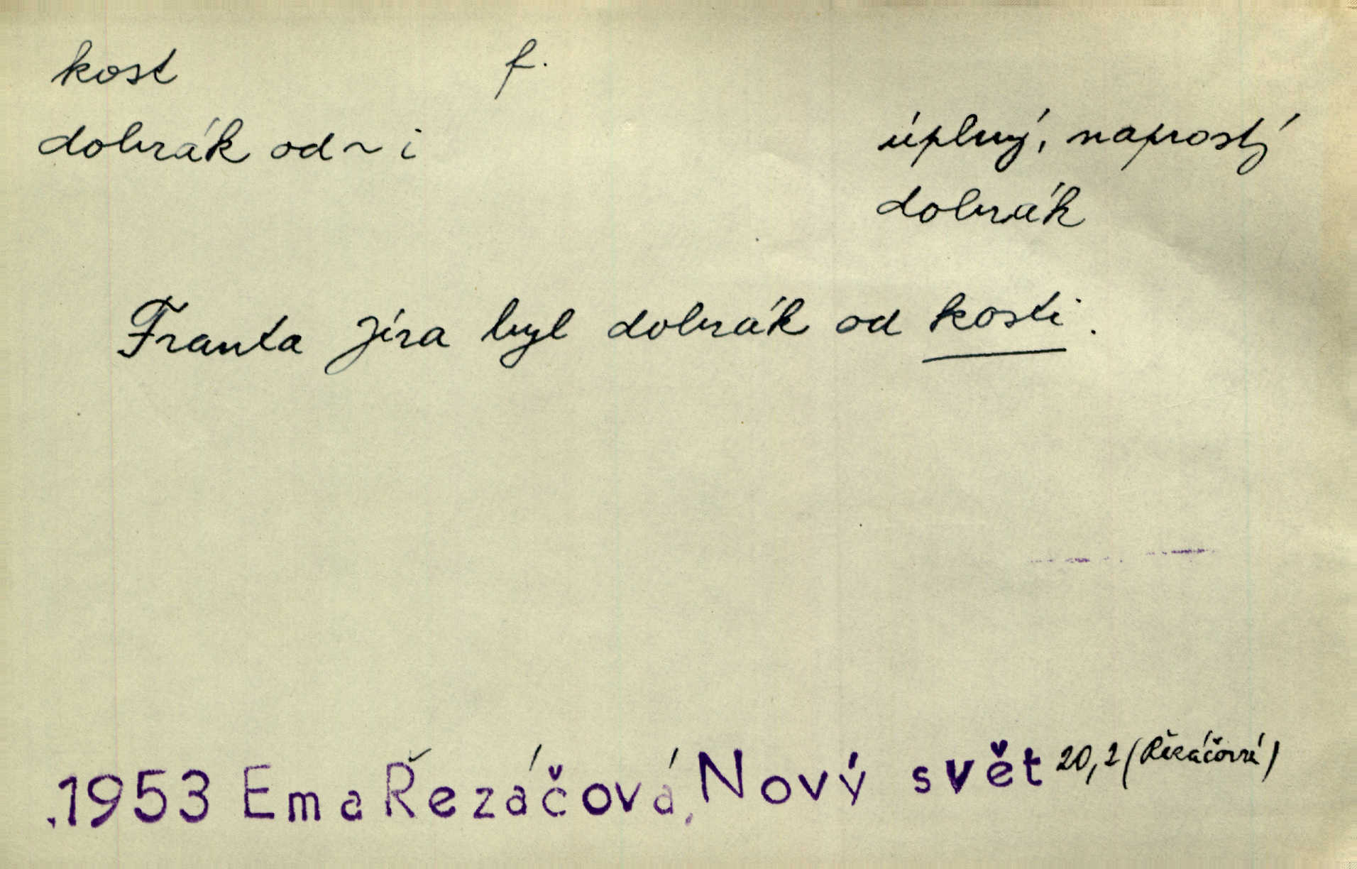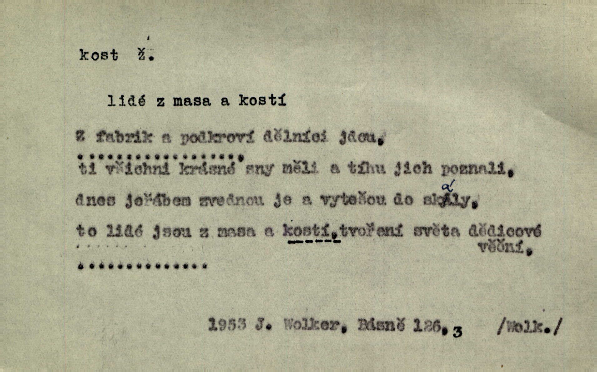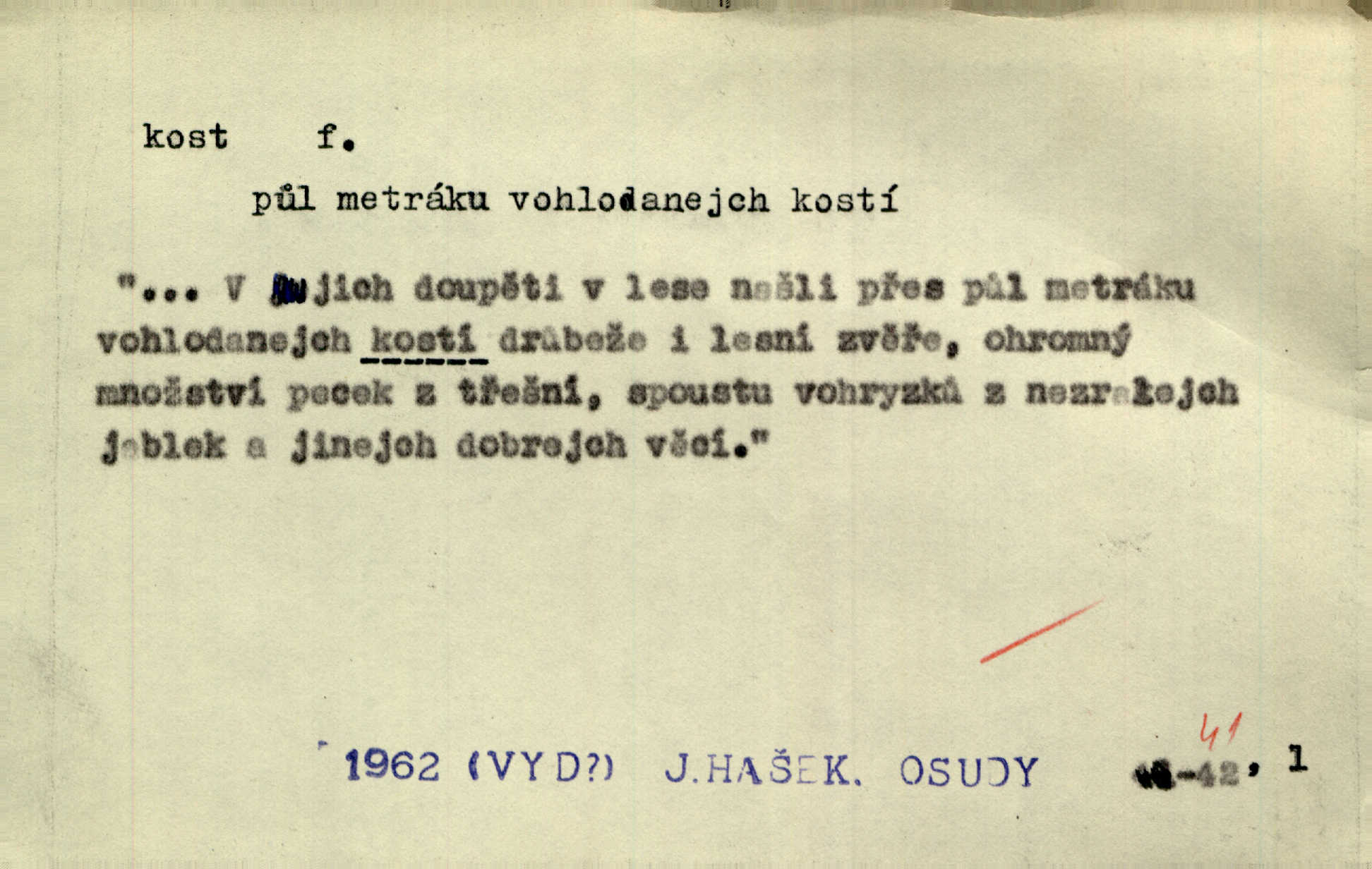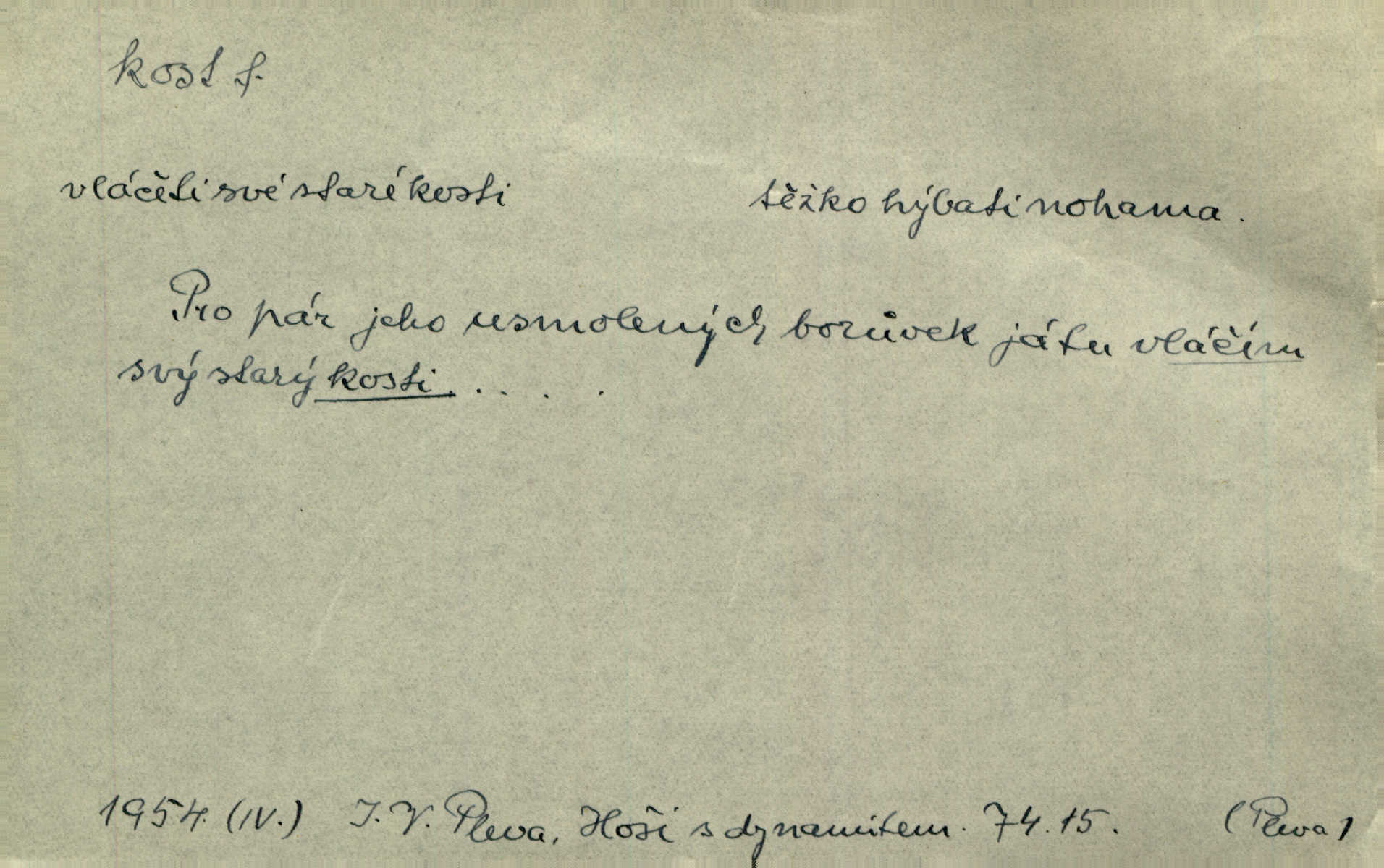 - kost, -i f. nejtvrdší pevná součást těl vyšších obratlovců. Anat. kost stehenní, ramenní, temenní, spánková, klíční a p. Jazyk bez kostí, ale kosti láme. Přísl. Tomu děvčeti kosti přelámu, pomyslí-li jen z daleka na Motyčku. Šmil. Objal ji přede všemi, až v ní kosti praskaly. Štol. Okolo psi se o kost rvou. Dyk. Ovocnému stromoví od večeře kosti. Erb. [Stařeček] radil, jak dobře prodat kosti, kopyta a kůži. A. Mrš. Kost od šunky kost se zbytkem uzeného masa. [Víly] hřebenem z rybích kostí češou svoje vlasy. V. Mrš. Uprostřed [zahrady] stál zámek ze slonové kosti. Něm. Okuláry černou kostí lemované. Jir. Rozřízl rychle bílou kostí složený arch novinářského formátu upravenou na nůž k rozřezávání. Baar. Ustál. spoj.: Cizí všude se mají nejlépe, a každý domácí, třeba že zachovalý a dobře umělý, aby kost ohlodával spokojoval se s odpadky, se zbytky. Jir. [Umělci] tvoří krásu — třeba hryzli kosti. Vrch. [Dubačka] vidí, že Sekerová je k práci lehtivá, že má v břichu kosti nerada se ohýbá. Jah. Ty člověče nemáš v břichu kosti jsi ohebný, mrštný. Prav. Starosti suší kosti. Rais. Jsem také jen z kosti a masa pouhý člověk. Šmil. Zejména tahle [osoba románu] je skvělá postava z masa i kostí životná. Přít. Muž vysoký, samá kost a sval. Jir. Sestárlé ženy, hnát a kost. Sova. Bylo ho trošek, pouhá kost a kůže byl vyhublý. Rais. Podivný muž, učiněná kost a kůže. Třeb. Starý, scvrklý, na kost a kůži vyschlý vápeník. Baar. Ruka byla na kost vyhublá. Šim. Je promrzlý na kost úplně. Kun. V té strašné nepohodě [žoldnéři] velmi promrzli a skřehli na kosť. Jir. Bylo umrzlo na kost, sucho tvrdě, do tvrda. Herrm. Země ztvrdlá na kosť pod nohou hřmotila jak dutá. A. Mrš. Jste mazaní, chytří až na kost skrz naskrz. Med. Zdřevěnělé, do těch kostí ztuhlé moje nohy nestačily běžet za ní. Klost. Je tam [venku] sychravo, až do kosti leze. Jir. Mráz projel až do kostí všem při tom pomyšlení. Herb. Mráz mu prolézal kosti. Rais. Je strašná zima, až mi kosti láme. Ner. Kapelníkův klarinet zaječel, až to do kostí projelo pronikavě. Rais. Zvuk, který projel kostmi až do morku a který by mrtvého musil vzbudit. Baar. Táhlý hvizd dřeň kostí pronikající. Čap. Ch. Dle starého zvyku, který mu přešel časem do kosti i krve, ještě před spaním zpytoval si [Cimbura] svoje svědomí. Baar. Kdo by se ubránil, když už to je v kostech a krvi. Jir. Až do kostí proniknuti jsme byli Palackého učením úplně, naveskrz. Herb. Obrátiti kacíře do kosti zkaženého nadobro. Lier. [Správce] měl na sedláky zvláštní zálusk, mysle, že je každý šelma od kosti. Něm. Šafář zdál se od kosti surový i nevlídný chlapík. E. Jel. Strýc rada je byrokrat od kosti. Šim. Benedek, voják od kosti. Mach. Bílek — jinak od kosti vlastenec — [na němčinu] přece si vždy postonal. A. Mrš. Farář byl dobrák od kosti, důvěřivý ke každému skrz naskrz. Herb. D Tech. kost odpadek při lití ingotů zdola. D V pl. tělo, tělesné pozůstatky. Cítil, že jsou [jeho děti] krev jeho krve a kost jeho kostí jeho pokrevní potomci. Baar. Právem-li se můžeme pokládat za dědice slávy otců svých a za kosť z kostí jejich? Herb. Až budeš mět tak staré kosti jako já, taky jim začneš hovět až budeš tak stár. Herb. On vysvlekne se beze studu a staré kosti vyhřívá. Mach. Veden dávnou náklonností, vláčel [muž] světem svoje staré kosti z boje v boj a bouř. O. Červ. Zdá se mi, že už nemáte mladé kosti nejste mladí. Svob. Pokud mám zdravé kosti pokud jsem tělesně zdráv. Šmil. Po práci jsou [rodiče] rádi, když kosti natáhnou odpočinou si. Rais. Občas si protáhnout kosti na peroně odpočinouti si, projíti se, protáhnouti se. K. Čap. [Teta k synovcovi:] Přec bych tě ráda, než natáhnu kosti, viděla v nějakém pořádku než zemru. Rais. Já bych přece ráda kosti svoje v domácí zemi složila byla pochována. Něm. Na ty dvě hlavy naše krev, až z našich kostí mstitel vstane. Bezr. D Lid. ženská, děvče. Každej pořádnej voják, když si odbude svoje věci a srovná si dle předpisu kavalec, jde se vohlídnout po nějaký kosti. Med. Naše markytánka není žádná kůstka — to je pevná, zralá kost — ale pro silné, zdravé zuby právě tak nejlepší. Tyl. D Lid. všech svatých kosti, svaté kosti druh pečiva. Půjde-li to tak dál, budou si lidé naposled v červenci do kávy drobit vánočky, kulaté „dušičky“ a „všech svatých kosti“ budou se válet beze všeho rozumu po celý rok. Ner. [Babička] uměla péci tak výborné vánočky, bochánky, martinské rohlíky, svaté kosti, Boží milosti. Svět.