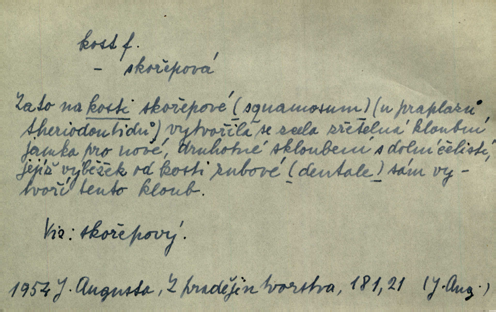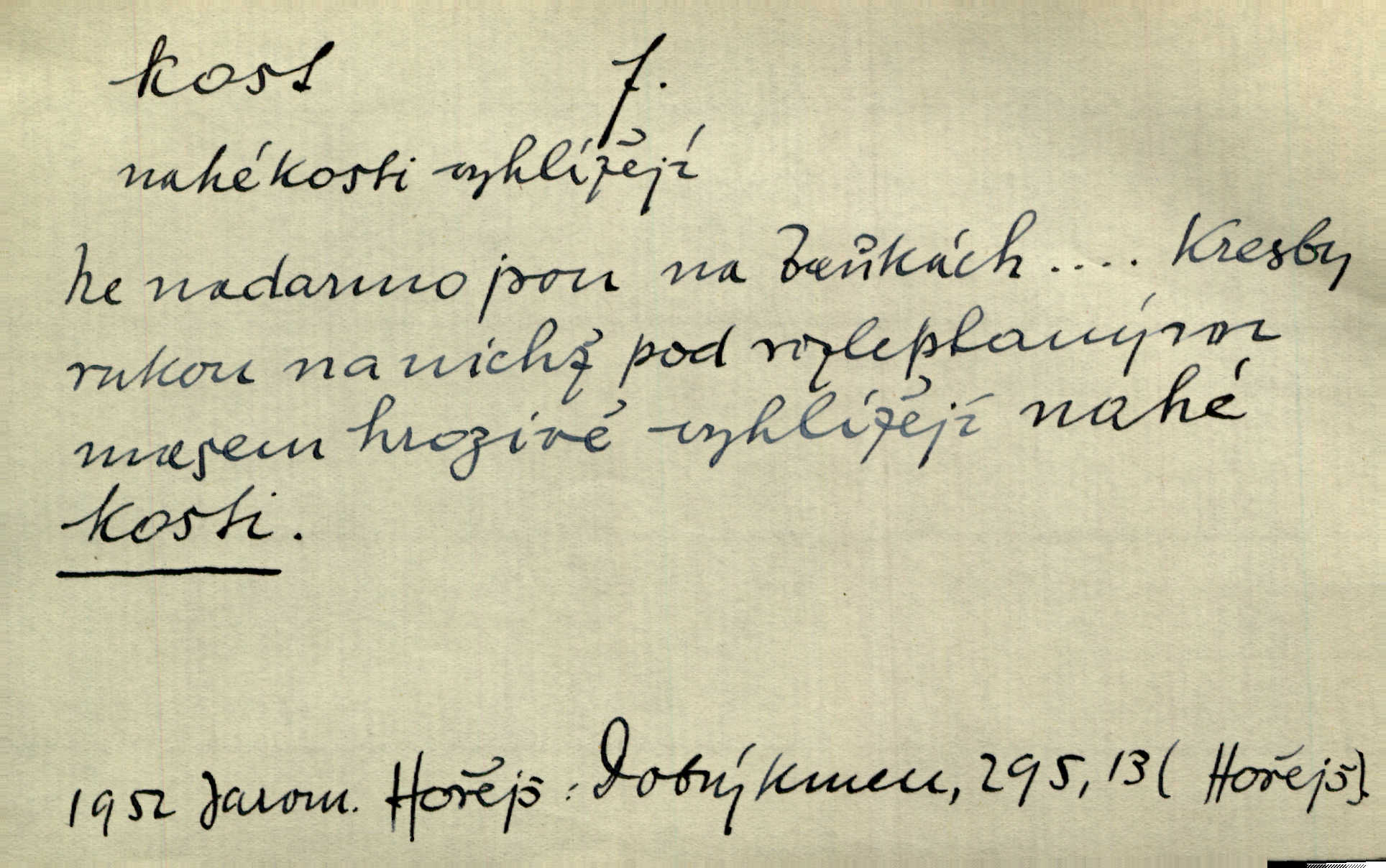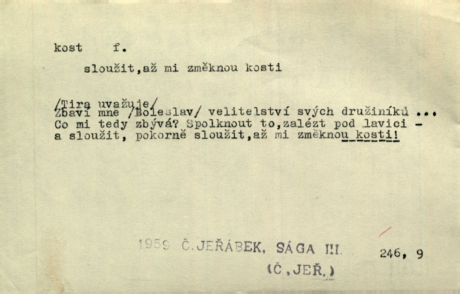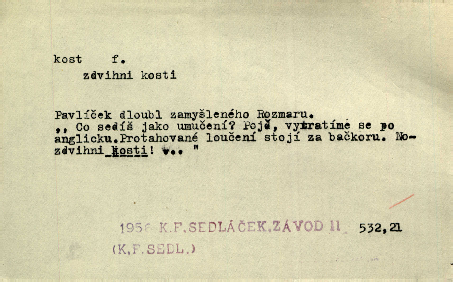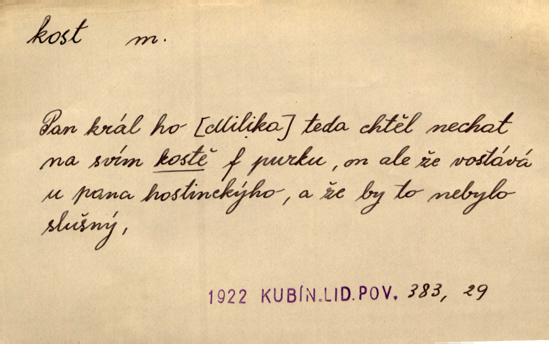 - kost, -i f. nejtvrdší pevná součást těl vyšších obratlovců. Anat. kost stehenní, ramenní, temenní, spánková, klíční a p. Jazyk bez kostí, ale kosti láme. Přísl. Tomu děvčeti kosti přelámu, pomyslí-li jen z daleka na Motyčku. Šmil. Objal ji přede všemi, až v ní kosti praskaly. Štol. Okolo psi se o kost rvou. Dyk. Ovocnému stromoví od večeře kosti. Erb. [Stařeček] radil, jak dobře prodat kosti, kopyta a kůži. A. Mrš. Kost od šunky kost se zbytkem uzeného masa. [Víly] hřebenem z rybích kostí češou svoje vlasy. V. Mrš. Uprostřed [zahrady] stál zámek ze slonové kosti. Něm. Okuláry černou kostí lemované. Jir. Rozřízl rychle bílou kostí složený arch novinářského formátu upravenou na nůž k rozřezávání. Baar. Ustál. spoj.: Cizí všude se mají nejlépe, a každý domácí, třeba že zachovalý a dobře umělý, aby kost ohlodával spokojoval se s odpadky, se zbytky. Jir. [Umělci] tvoří krásu — třeba hryzli kosti. Vrch. [Dubačka] vidí, že Sekerová je k práci lehtivá, že má v břichu kosti nerada se ohýbá. Jah. Ty člověče nemáš v břichu kosti jsi ohebný, mrštný. Prav. Starosti suší kosti. Rais. Jsem také jen z kosti a masa pouhý člověk. Šmil. Zejména tahle [osoba románu] je skvělá postava z masa i kostí životná. Přít. Muž vysoký, samá kost a sval. Jir. Sestárlé ženy, hnát a kost. Sova. Bylo ho trošek, pouhá kost a kůže byl vyhublý. Rais. Podivný muž, učiněná kost a kůže. Třeb. Starý, scvrklý, na kost a kůži vyschlý vápeník. Baar. Ruka byla na kost vyhublá. Šim. Je promrzlý na kost úplně. Kun. V té strašné nepohodě [žoldnéři] velmi promrzli a skřehli na kosť. Jir. Bylo umrzlo na kost, sucho tvrdě, do tvrda. Herrm. Země ztvrdlá na kosť pod nohou hřmotila jak dutá. A. Mrš. Jste mazaní, chytří až na kost skrz naskrz. Med. Zdřevěnělé, do těch kostí ztuhlé moje nohy nestačily běžet za ní. Klost. Je tam [venku] sychravo, až do kosti leze. Jir. Mráz projel až do kostí všem při tom pomyšlení. Herb. Mráz mu prolézal kosti. Rais. Je strašná zima, až mi kosti láme. Ner. Kapelníkův klarinet zaječel, až to do kostí projelo pronikavě. Rais. Zvuk, který projel kostmi až do morku a který by mrtvého musil vzbudit. Baar. Táhlý hvizd dřeň kostí pronikající. Čap. Ch. Dle starého zvyku, který mu přešel časem do kosti i krve, ještě před spaním zpytoval si [Cimbura] svoje svědomí. Baar. Kdo by se ubránil, když už to je v kostech a krvi. Jir. Až do kostí proniknuti jsme byli Palackého učením úplně, naveskrz. Herb. Obrátiti kacíře do kosti zkaženého nadobro. Lier. [Správce] měl na sedláky zvláštní zálusk, mysle, že je každý šelma od kosti. Něm. Šafář zdál se od kosti surový i nevlídný chlapík. E. Jel. Strýc rada je byrokrat od kosti. Šim. Benedek, voják od kosti. Mach. Bílek — jinak od kosti vlastenec — [na němčinu] přece si vždy postonal. A. Mrš. Farář byl dobrák od kosti, důvěřivý ke každému skrz naskrz. Herb. D Tech. kost odpadek při lití ingotů zdola. D V pl. tělo, tělesné pozůstatky. Cítil, že jsou [jeho děti] krev jeho krve a kost jeho kostí jeho pokrevní potomci. Baar. Právem-li se můžeme pokládat za dědice slávy otců svých a za kosť z kostí jejich? Herb. Až budeš mět tak staré kosti jako já, taky jim začneš hovět až budeš tak stár. Herb. On vysvlekne se beze studu a staré kosti vyhřívá. Mach. Veden dávnou náklonností, vláčel [muž] světem svoje staré kosti z boje v boj a bouř. O. Červ. Zdá se mi, že už nemáte mladé kosti nejste mladí. Svob. Pokud mám zdravé kosti pokud jsem tělesně zdráv. Šmil. Po práci jsou [rodiče] rádi, když kosti natáhnou odpočinou si. Rais. Občas si protáhnout kosti na peroně odpočinouti si, projíti se, protáhnouti se. K. Čap. [Teta k synovcovi:] Přec bych tě ráda, než natáhnu kosti, viděla v nějakém pořádku než zemru. Rais. Já bych přece ráda kosti svoje v domácí zemi složila byla pochována. Něm. Na ty dvě hlavy naše krev, až z našich kostí mstitel vstane. Bezr. D Lid. ženská, děvče. Každej pořádnej voják, když si odbude svoje věci a srovná si dle předpisu kavalec, jde se vohlídnout po nějaký kosti. Med. Naše markytánka není žádná kůstka — to je pevná, zralá kost — ale pro silné, zdravé zuby právě tak nejlepší. Tyl. D Lid. všech svatých kosti, svaté kosti druh pečiva. Půjde-li to tak dál, budou si lidé naposled v červenci do kávy drobit vánočky, kulaté „dušičky“ a „všech svatých kosti“ budou se válet beze všeho rozumu po celý rok. Ner. [Babička] uměla péci tak výborné vánočky, bochánky, martinské rohlíky, svaté kosti, Boží milosti. Svět.