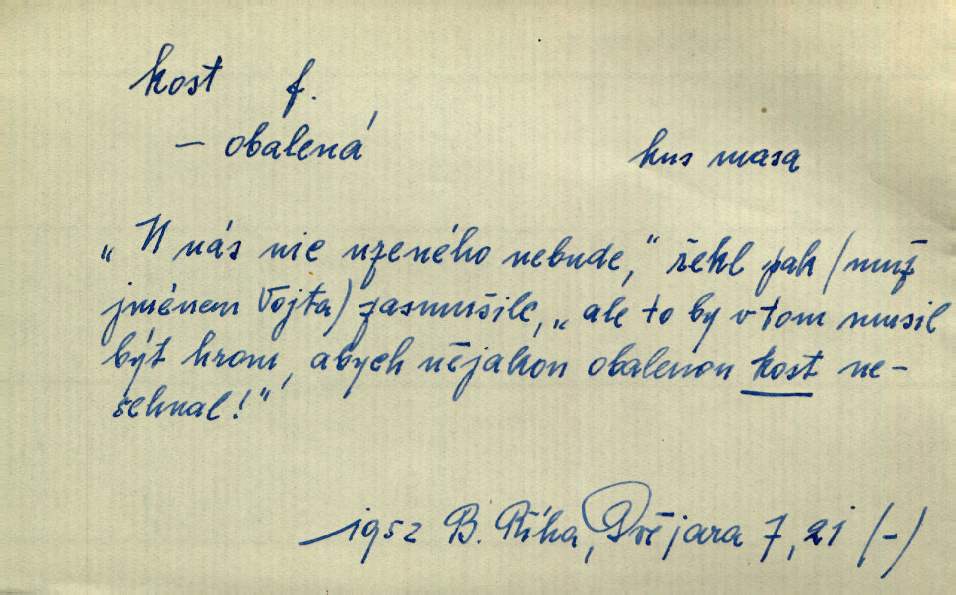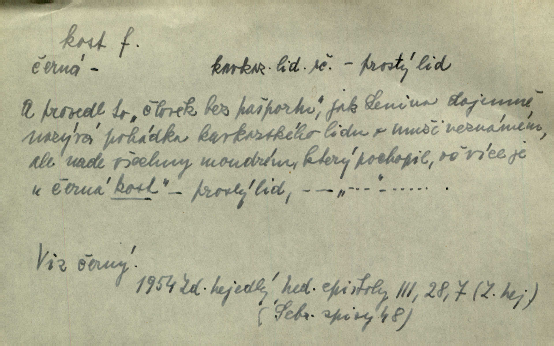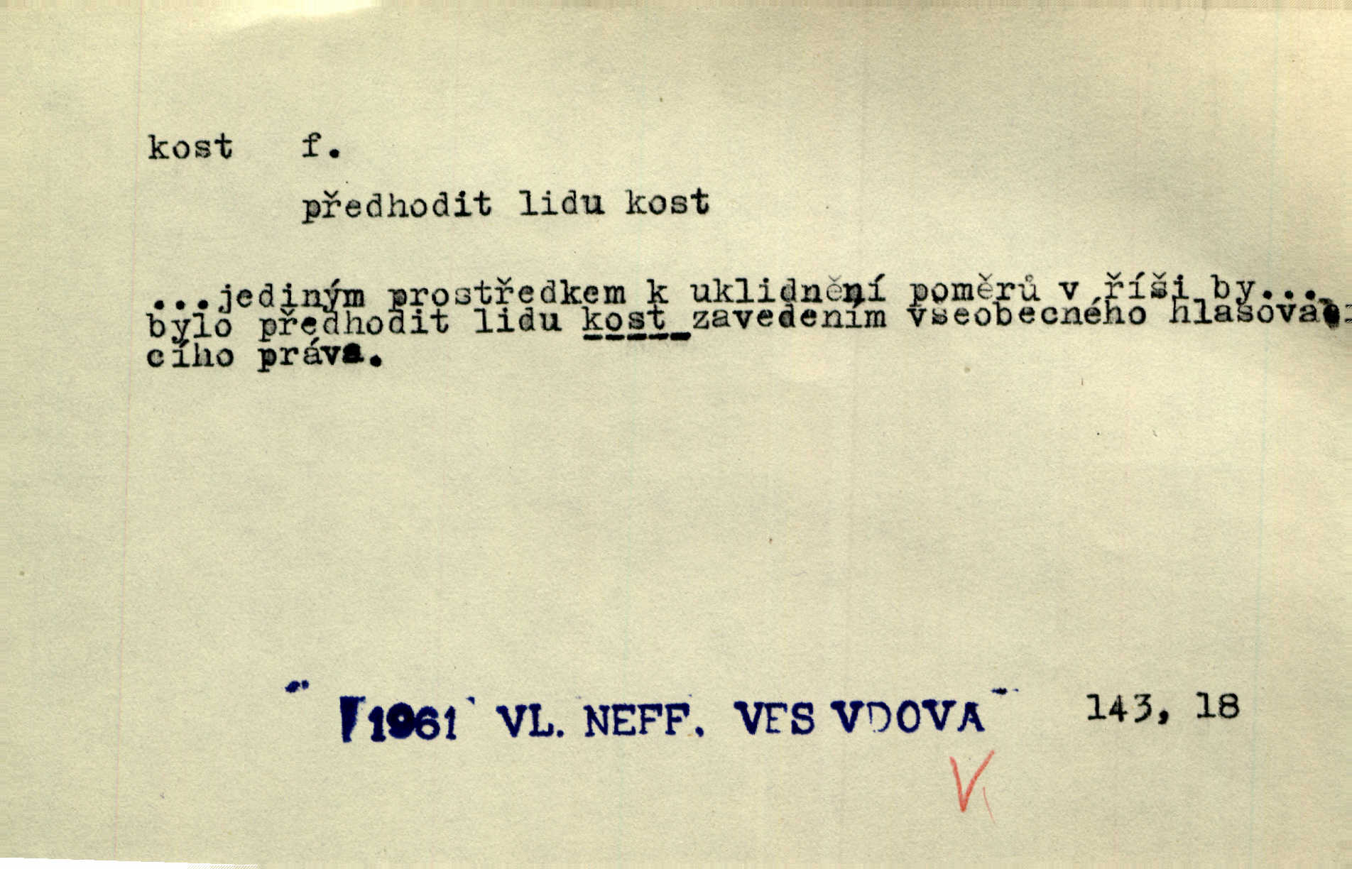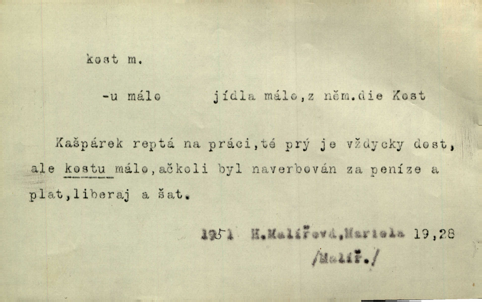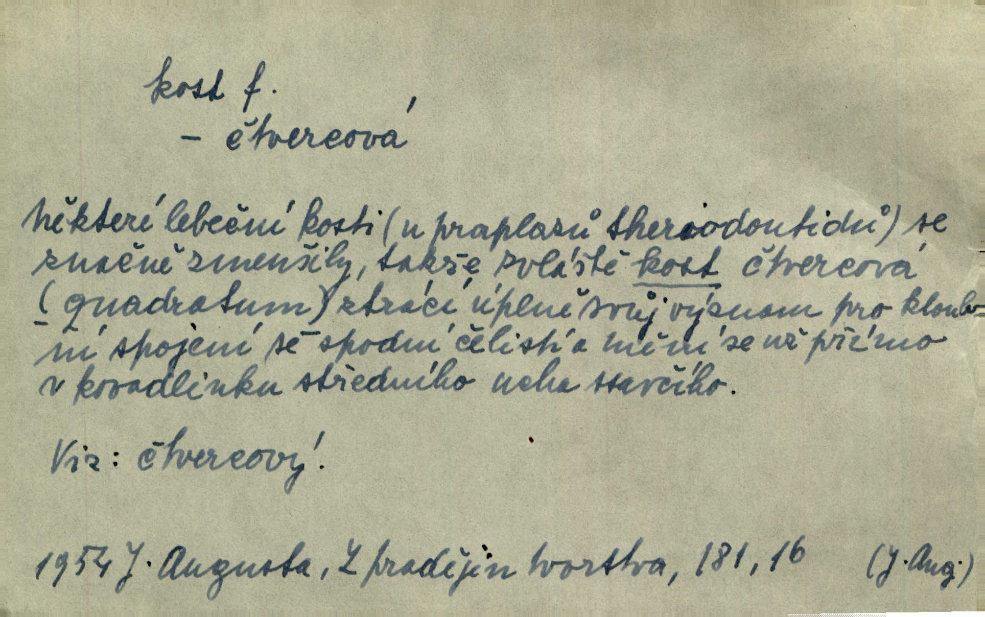 - kost, -i f. nejtvrdší pevná součást těl vyšších obratlovců. Anat. kost stehenní, ramenní, temenní, spánková, klíční a p. Jazyk bez kostí, ale kosti láme. Přísl. Tomu děvčeti kosti přelámu, pomyslí-li jen z daleka na Motyčku. Šmil. Objal ji přede všemi, až v ní kosti praskaly. Štol. Okolo psi se o kost rvou. Dyk. Ovocnému stromoví od večeře kosti. Erb. [Stařeček] radil, jak dobře prodat kosti, kopyta a kůži. A. Mrš. Kost od šunky kost se zbytkem uzeného masa. [Víly] hřebenem z rybích kostí češou svoje vlasy. V. Mrš. Uprostřed [zahrady] stál zámek ze slonové kosti. Něm. Okuláry černou kostí lemované. Jir. Rozřízl rychle bílou kostí složený arch novinářského formátu upravenou na nůž k rozřezávání. Baar. Ustál. spoj.: Cizí všude se mají nejlépe, a každý domácí, třeba že zachovalý a dobře umělý, aby kost ohlodával spokojoval se s odpadky, se zbytky. Jir. [Umělci] tvoří krásu — třeba hryzli kosti. Vrch. [Dubačka] vidí, že Sekerová je k práci lehtivá, že má v břichu kosti nerada se ohýbá. Jah. Ty člověče nemáš v břichu kosti jsi ohebný, mrštný. Prav. Starosti suší kosti. Rais. Jsem také jen z kosti a masa pouhý člověk. Šmil. Zejména tahle [osoba románu] je skvělá postava z masa i kostí životná. Přít. Muž vysoký, samá kost a sval. Jir. Sestárlé ženy, hnát a kost. Sova. Bylo ho trošek, pouhá kost a kůže byl vyhublý. Rais. Podivný muž, učiněná kost a kůže. Třeb. Starý, scvrklý, na kost a kůži vyschlý vápeník. Baar. Ruka byla na kost vyhublá. Šim. Je promrzlý na kost úplně. Kun. V té strašné nepohodě [žoldnéři] velmi promrzli a skřehli na kosť. Jir. Bylo umrzlo na kost, sucho tvrdě, do tvrda. Herrm. Země ztvrdlá na kosť pod nohou hřmotila jak dutá. A. Mrš. Jste mazaní, chytří až na kost skrz naskrz. Med. Zdřevěnělé, do těch kostí ztuhlé moje nohy nestačily běžet za ní. Klost. Je tam [venku] sychravo, až do kosti leze. Jir. Mráz projel až do kostí všem při tom pomyšlení. Herb. Mráz mu prolézal kosti. Rais. Je strašná zima, až mi kosti láme. Ner. Kapelníkův klarinet zaječel, až to do kostí projelo pronikavě. Rais. Zvuk, který projel kostmi až do morku a který by mrtvého musil vzbudit. Baar. Táhlý hvizd dřeň kostí pronikající. Čap. Ch. Dle starého zvyku, který mu přešel časem do kosti i krve, ještě před spaním zpytoval si [Cimbura] svoje svědomí. Baar. Kdo by se ubránil, když už to je v kostech a krvi. Jir. Až do kostí proniknuti jsme byli Palackého učením úplně, naveskrz. Herb. Obrátiti kacíře do kosti zkaženého nadobro. Lier. [Správce] měl na sedláky zvláštní zálusk, mysle, že je každý šelma od kosti. Něm. Šafář zdál se od kosti surový i nevlídný chlapík. E. Jel. Strýc rada je byrokrat od kosti. Šim. Benedek, voják od kosti. Mach. Bílek — jinak od kosti vlastenec — [na němčinu] přece si vždy postonal. A. Mrš. Farář byl dobrák od kosti, důvěřivý ke každému skrz naskrz. Herb. D Tech. kost odpadek při lití ingotů zdola. D V pl. tělo, tělesné pozůstatky. Cítil, že jsou [jeho děti] krev jeho krve a kost jeho kostí jeho pokrevní potomci. Baar. Právem-li se můžeme pokládat za dědice slávy otců svých a za kosť z kostí jejich? Herb. Až budeš mět tak staré kosti jako já, taky jim začneš hovět až budeš tak stár. Herb. On vysvlekne se beze studu a staré kosti vyhřívá. Mach. Veden dávnou náklonností, vláčel [muž] světem svoje staré kosti z boje v boj a bouř. O. Červ. Zdá se mi, že už nemáte mladé kosti nejste mladí. Svob. Pokud mám zdravé kosti pokud jsem tělesně zdráv. Šmil. Po práci jsou [rodiče] rádi, když kosti natáhnou odpočinou si. Rais. Občas si protáhnout kosti na peroně odpočinouti si, projíti se, protáhnouti se. K. Čap. [Teta k synovcovi:] Přec bych tě ráda, než natáhnu kosti, viděla v nějakém pořádku než zemru. Rais. Já bych přece ráda kosti svoje v domácí zemi složila byla pochována. Něm. Na ty dvě hlavy naše krev, až z našich kostí mstitel vstane. Bezr. D Lid. ženská, děvče. Každej pořádnej voják, když si odbude svoje věci a srovná si dle předpisu kavalec, jde se vohlídnout po nějaký kosti. Med. Naše markytánka není žádná kůstka — to je pevná, zralá kost — ale pro silné, zdravé zuby právě tak nejlepší. Tyl. D Lid. všech svatých kosti, svaté kosti druh pečiva. Půjde-li to tak dál, budou si lidé naposled v červenci do kávy drobit vánočky, kulaté „dušičky“ a „všech svatých kosti“ budou se válet beze všeho rozumu po celý rok. Ner. [Babička] uměla péci tak výborné vánočky, bochánky, martinské rohlíky, svaté kosti, Boží milosti. Svět.