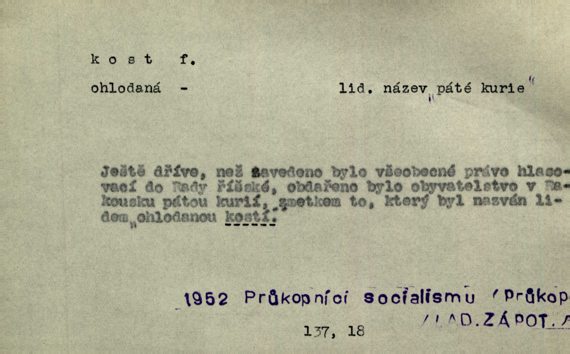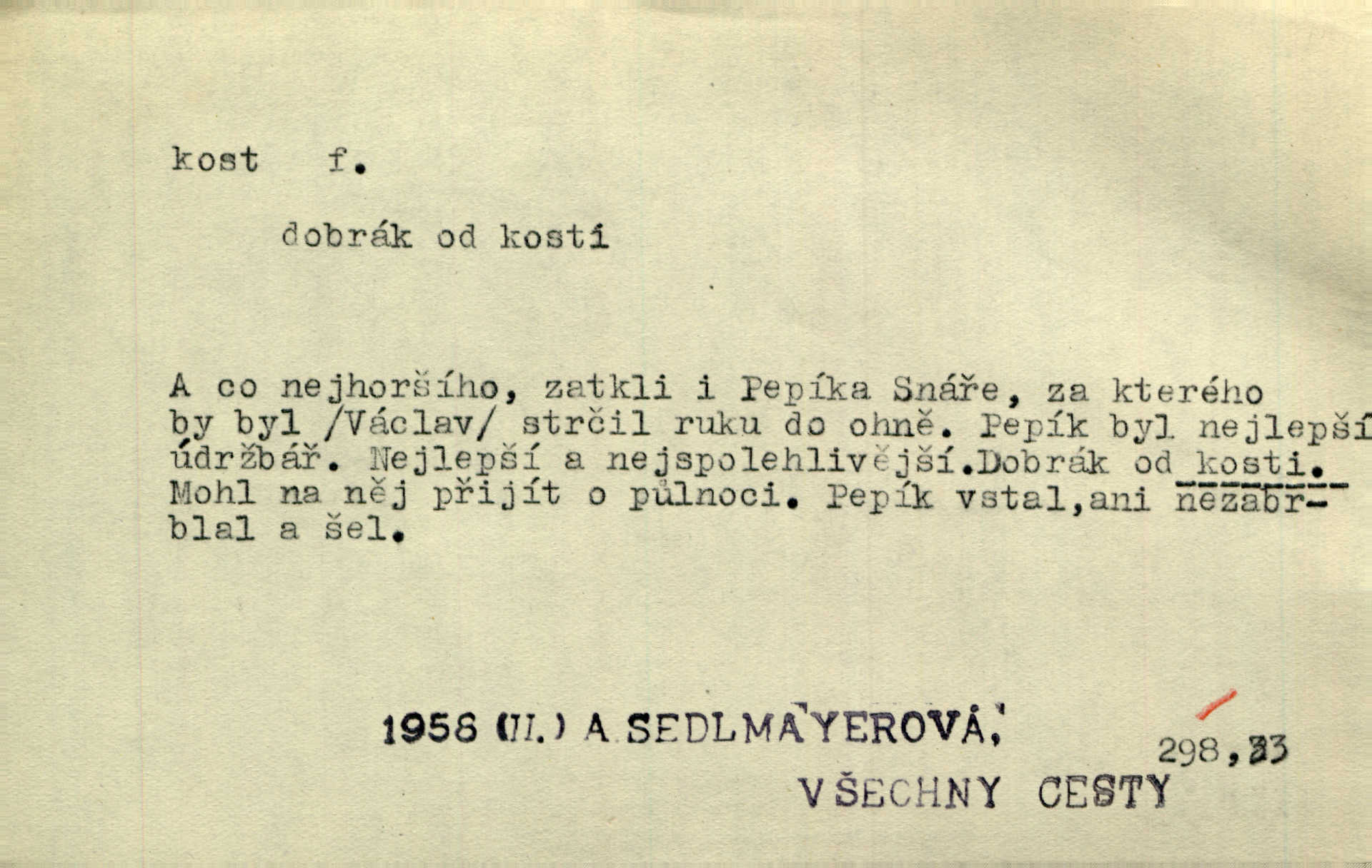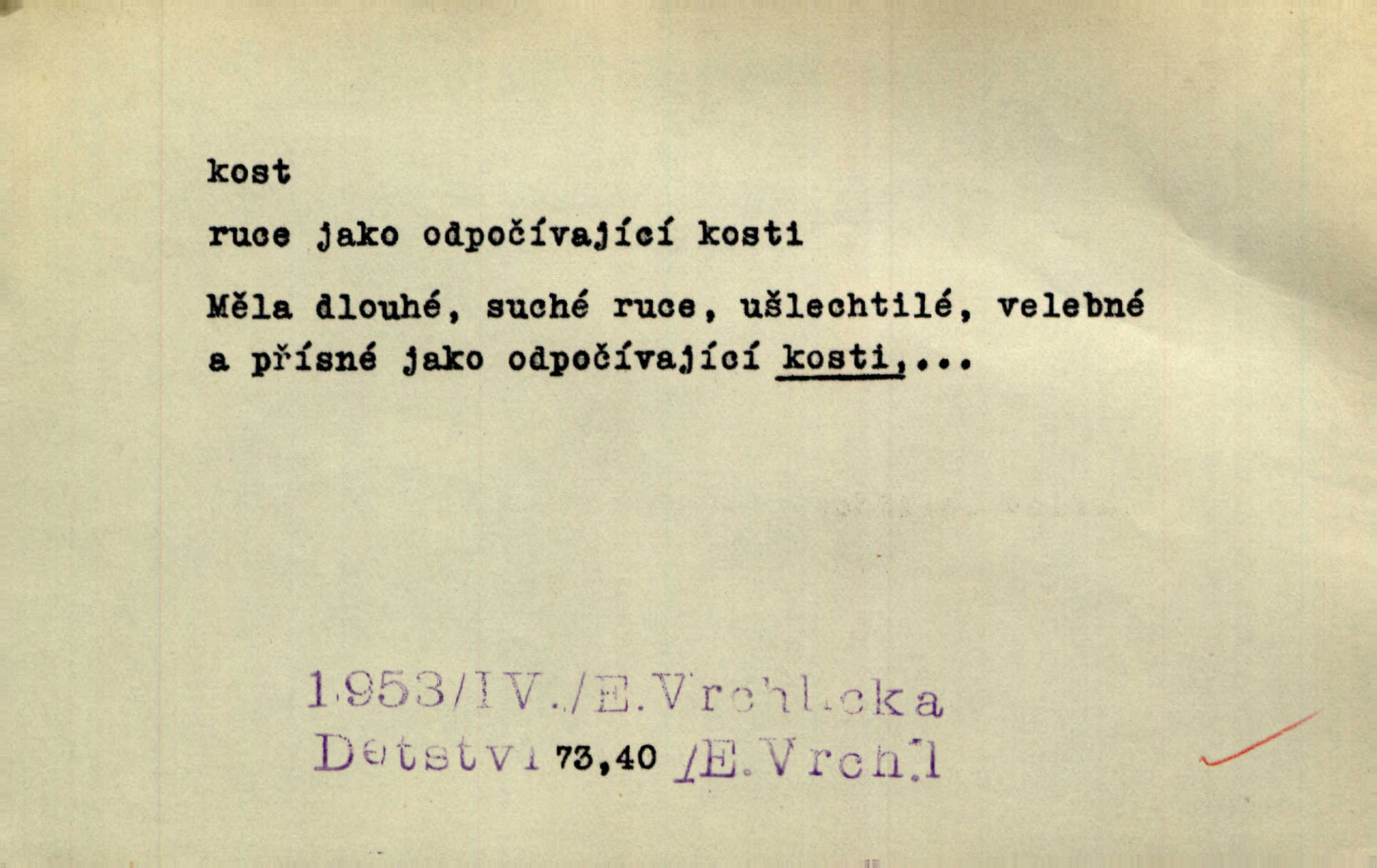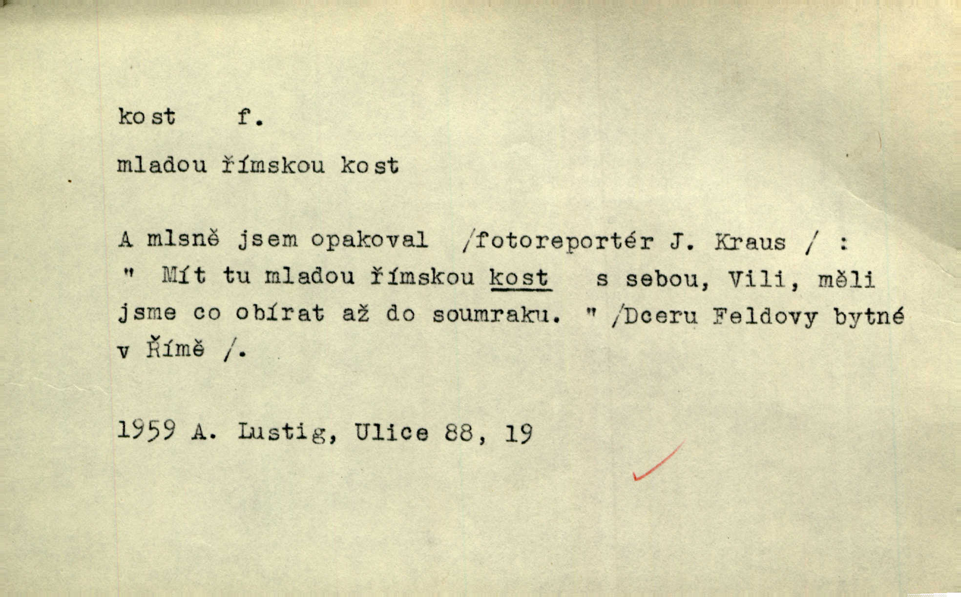 - kost, -i f. nejtvrdší pevná součást těl vyšších obratlovců. Anat. kost stehenní, ramenní, temenní, spánková, klíční a p. Jazyk bez kostí, ale kosti láme. Přísl. Tomu děvčeti kosti přelámu, pomyslí-li jen z daleka na Motyčku. Šmil. Objal ji přede všemi, až v ní kosti praskaly. Štol. Okolo psi se o kost rvou. Dyk. Ovocnému stromoví od večeře kosti. Erb. [Stařeček] radil, jak dobře prodat kosti, kopyta a kůži. A. Mrš. Kost od šunky kost se zbytkem uzeného masa. [Víly] hřebenem z rybích kostí češou svoje vlasy. V. Mrš. Uprostřed [zahrady] stál zámek ze slonové kosti. Něm. Okuláry černou kostí lemované. Jir. Rozřízl rychle bílou kostí složený arch novinářského formátu upravenou na nůž k rozřezávání. Baar. Ustál. spoj.: Cizí všude se mají nejlépe, a každý domácí, třeba že zachovalý a dobře umělý, aby kost ohlodával spokojoval se s odpadky, se zbytky. Jir. [Umělci] tvoří krásu — třeba hryzli kosti. Vrch. [Dubačka] vidí, že Sekerová je k práci lehtivá, že má v břichu kosti nerada se ohýbá. Jah. Ty člověče nemáš v břichu kosti jsi ohebný, mrštný. Prav. Starosti suší kosti. Rais. Jsem také jen z kosti a masa pouhý člověk. Šmil. Zejména tahle [osoba románu] je skvělá postava z masa i kostí životná. Přít. Muž vysoký, samá kost a sval. Jir. Sestárlé ženy, hnát a kost. Sova. Bylo ho trošek, pouhá kost a kůže byl vyhublý. Rais. Podivný muž, učiněná kost a kůže. Třeb. Starý, scvrklý, na kost a kůži vyschlý vápeník. Baar. Ruka byla na kost vyhublá. Šim. Je promrzlý na kost úplně. Kun. V té strašné nepohodě [žoldnéři] velmi promrzli a skřehli na kosť. Jir. Bylo umrzlo na kost, sucho tvrdě, do tvrda. Herrm. Země ztvrdlá na kosť pod nohou hřmotila jak dutá. A. Mrš. Jste mazaní, chytří až na kost skrz naskrz. Med. Zdřevěnělé, do těch kostí ztuhlé moje nohy nestačily běžet za ní. Klost. Je tam [venku] sychravo, až do kosti leze. Jir. Mráz projel až do kostí všem při tom pomyšlení. Herb. Mráz mu prolézal kosti. Rais. Je strašná zima, až mi kosti láme. Ner. Kapelníkův klarinet zaječel, až to do kostí projelo pronikavě. Rais. Zvuk, který projel kostmi až do morku a který by mrtvého musil vzbudit. Baar. Táhlý hvizd dřeň kostí pronikající. Čap. Ch. Dle starého zvyku, který mu přešel časem do kosti i krve, ještě před spaním zpytoval si [Cimbura] svoje svědomí. Baar. Kdo by se ubránil, když už to je v kostech a krvi. Jir. Až do kostí proniknuti jsme byli Palackého učením úplně, naveskrz. Herb. Obrátiti kacíře do kosti zkaženého nadobro. Lier. [Správce] měl na sedláky zvláštní zálusk, mysle, že je každý šelma od kosti. Něm. Šafář zdál se od kosti surový i nevlídný chlapík. E. Jel. Strýc rada je byrokrat od kosti. Šim. Benedek, voják od kosti. Mach. Bílek — jinak od kosti vlastenec — [na němčinu] přece si vždy postonal. A. Mrš. Farář byl dobrák od kosti, důvěřivý ke každému skrz naskrz. Herb. D Tech. kost odpadek při lití ingotů zdola. D V pl. tělo, tělesné pozůstatky. Cítil, že jsou [jeho děti] krev jeho krve a kost jeho kostí jeho pokrevní potomci. Baar. Právem-li se můžeme pokládat za dědice slávy otců svých a za kosť z kostí jejich? Herb. Až budeš mět tak staré kosti jako já, taky jim začneš hovět až budeš tak stár. Herb. On vysvlekne se beze studu a staré kosti vyhřívá. Mach. Veden dávnou náklonností, vláčel [muž] světem svoje staré kosti z boje v boj a bouř. O. Červ. Zdá se mi, že už nemáte mladé kosti nejste mladí. Svob. Pokud mám zdravé kosti pokud jsem tělesně zdráv. Šmil. Po práci jsou [rodiče] rádi, když kosti natáhnou odpočinou si. Rais. Občas si protáhnout kosti na peroně odpočinouti si, projíti se, protáhnouti se. K. Čap. [Teta k synovcovi:] Přec bych tě ráda, než natáhnu kosti, viděla v nějakém pořádku než zemru. Rais. Já bych přece ráda kosti svoje v domácí zemi složila byla pochována. Něm. Na ty dvě hlavy naše krev, až z našich kostí mstitel vstane. Bezr. D Lid. ženská, děvče. Každej pořádnej voják, když si odbude svoje věci a srovná si dle předpisu kavalec, jde se vohlídnout po nějaký kosti. Med. Naše markytánka není žádná kůstka — to je pevná, zralá kost — ale pro silné, zdravé zuby právě tak nejlepší. Tyl. D Lid. všech svatých kosti, svaté kosti druh pečiva. Půjde-li to tak dál, budou si lidé naposled v červenci do kávy drobit vánočky, kulaté „dušičky“ a „všech svatých kosti“ budou se válet beze všeho rozumu po celý rok. Ner. [Babička] uměla péci tak výborné vánočky, bochánky, martinské rohlíky, svaté kosti, Boží milosti. Svět.