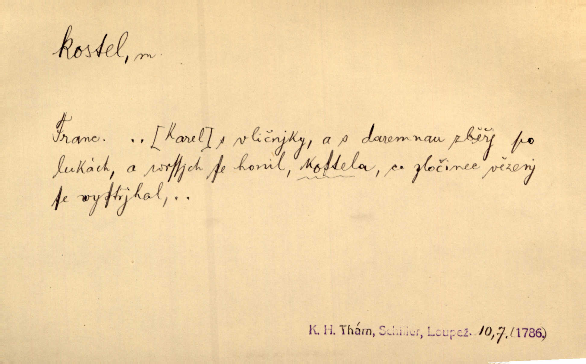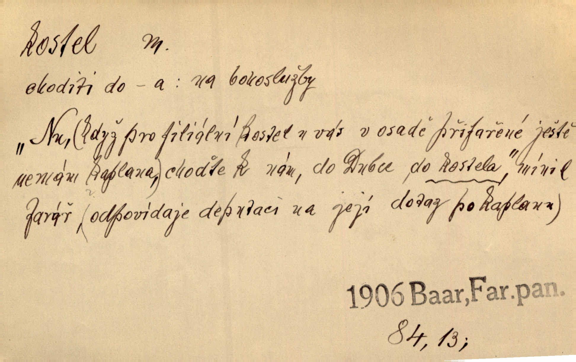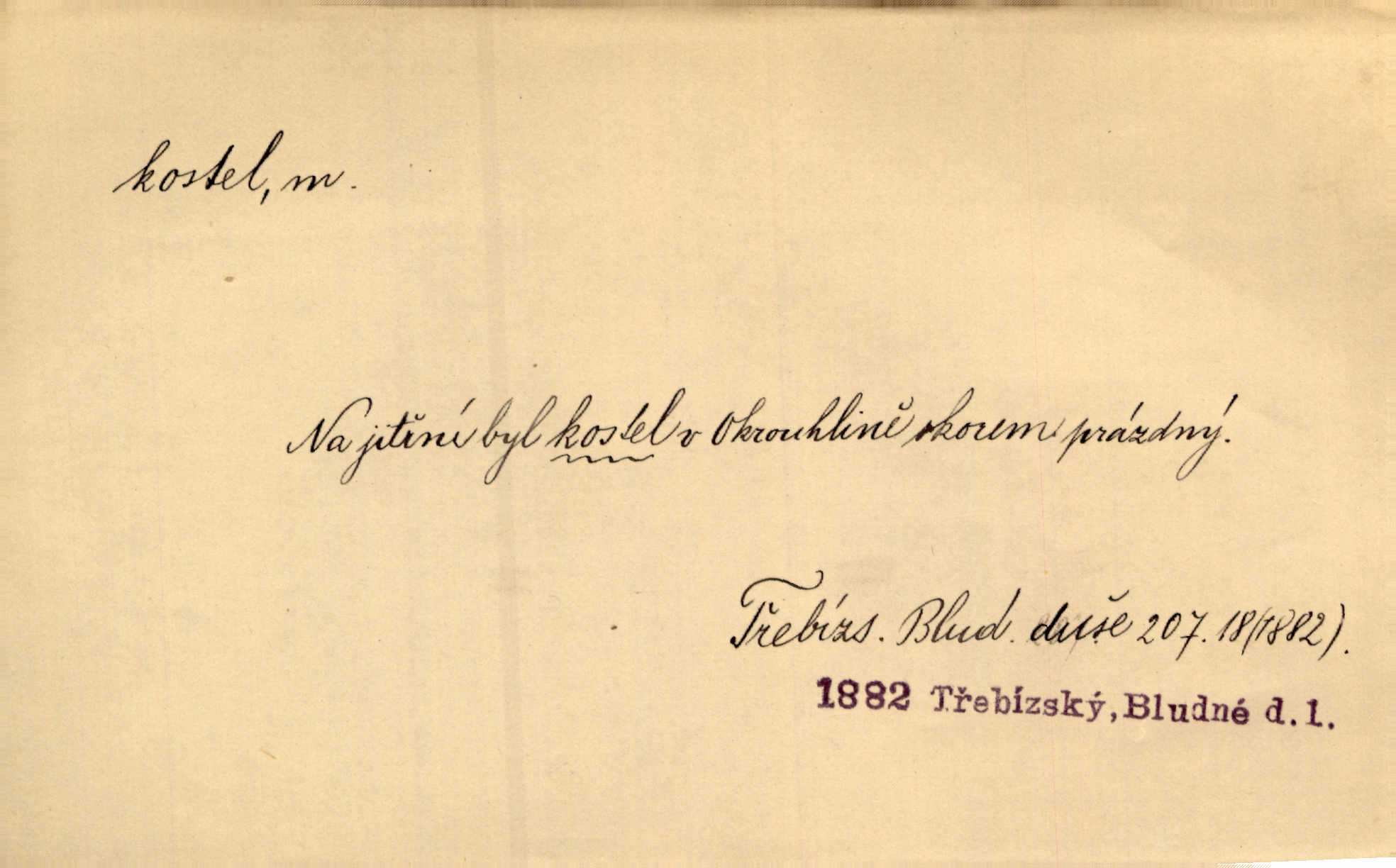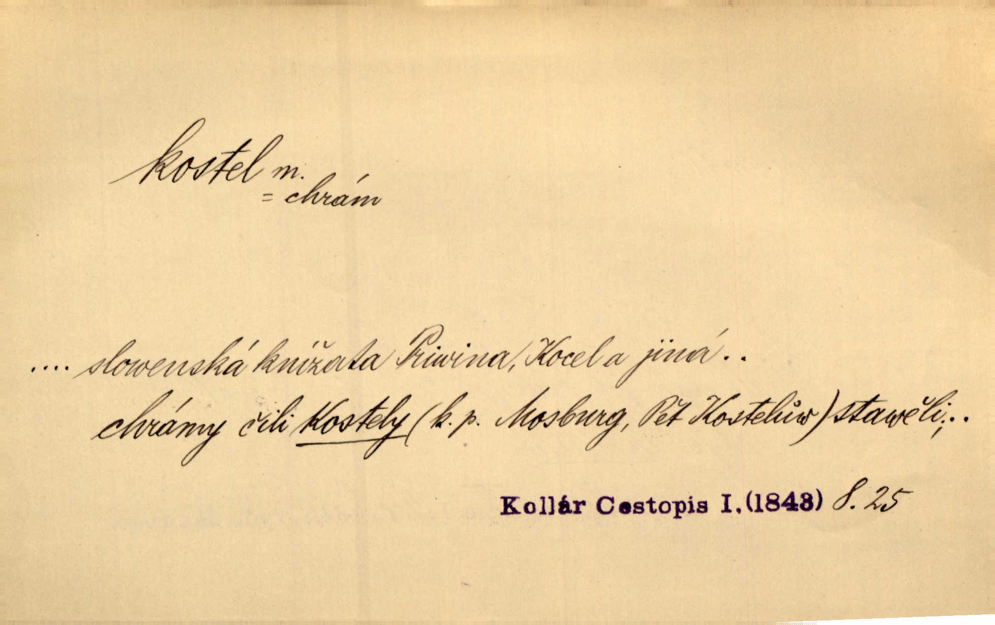 - kostel, -a m. budova pro křesťanskou bohoslužbu. Kolem kostela rozkládal se hřbitov, hrazený zdí. Jir. Nad kostelem velké zvony do vůkolí zvoní. Ner. Kostel sv. Víta, sv. Václava, sv. Jiří atd. Kostel farní, filiální, katedrální, klášterní, poutní a p. Když pak začalo slunce za horami vycházet, bývalo mi vždy, jak bych v kostele stála nábožně, velebně. Něm. Zde [na přednášce] jsme seděli zbožně jako v kostele, rozechvěni, blaženi. Ner. Většina [žáků] poslouchala slova učitelova jako v kostele nábožně, v nábožném tichu, pozorně. Herb. V olších u potoka to utichlo jako v kostele. Svět. Když potom pomocník zpíval, bylo [v sále] zase jako v kostele naprosté, nábožné ticho. Rais. Ve světnici naší čisto jako v kostele. Kos. Lidé putovali pro ně [zemančiny léky] na Luhov jako do kostela houfně. Svět. Ne všickni jsou svati, co si otírají o kostel paty tváří se jako pobožní lidé. Přísl. Já si myslím, že půjdem s kostelem okolo kříže budeme si počínati převráceně. Tyl. Naučím tě v kostele hvízdati pohrůžka trestem. Pořek. Chtěl bych, až jednou budu vcházeti po zádech do kostela, aby se mnou šli chlapi v zástěrách a nesli svůj prapor až budu mít pohřeb. Vanč. D mše, služby boží. Po kostele zastavili se [rodiče] obyčejně u Stupartů na sklenici vína po mši. Svět. Ta naše holka v dnešní den i kostel zaspala. Hol. [Frantík] rád chodil do kostela na služby boží. Jir. Dědeček přinesl z kostela za krejcar preclík. Rais. D věřící shromáždění při mši. Při české modlitbě odpovídal [knězi] celý kostel. Rais. Hlavy celého kostela se po ní ohlížely. Baar. D církev. Kostel [u Slovanů v Istrii] je dosud čistě národní. Ner. D Dial. náboženské vyznání. Za ten jiný kostel žádný z vás [Eva ani Mánek] nemohl. Preis.
