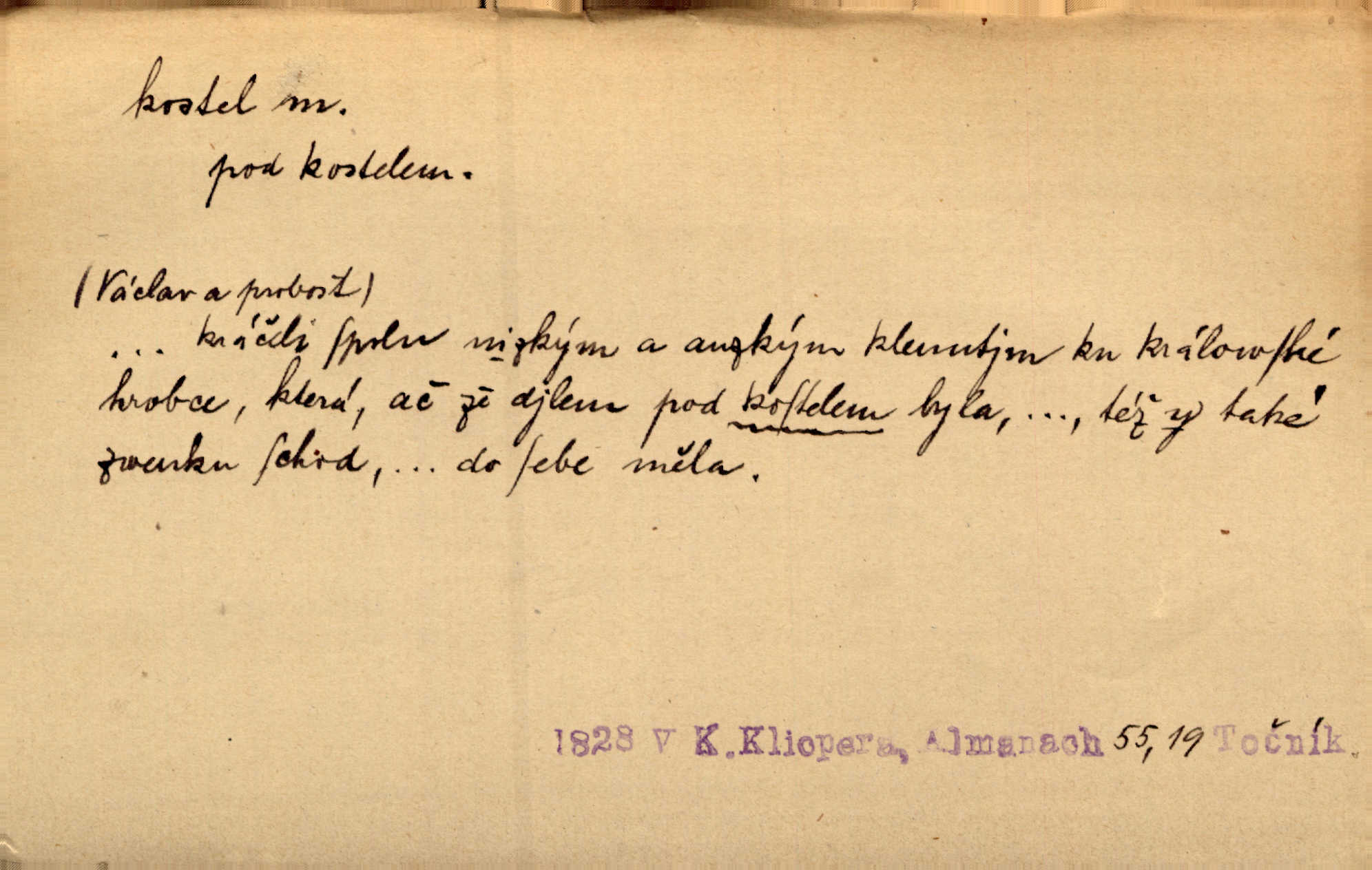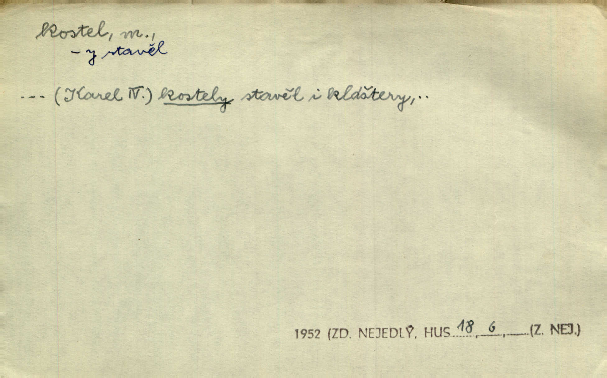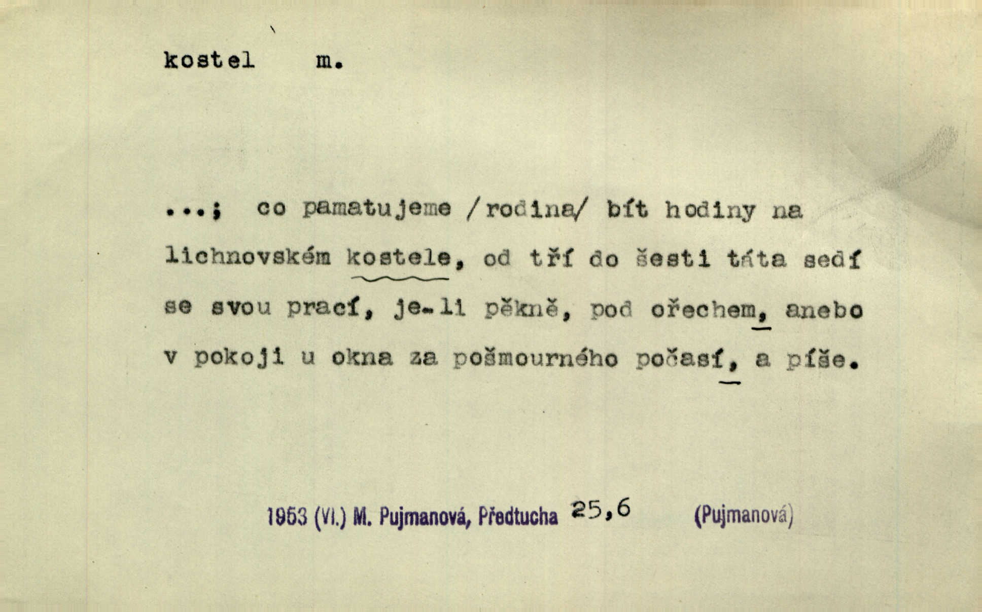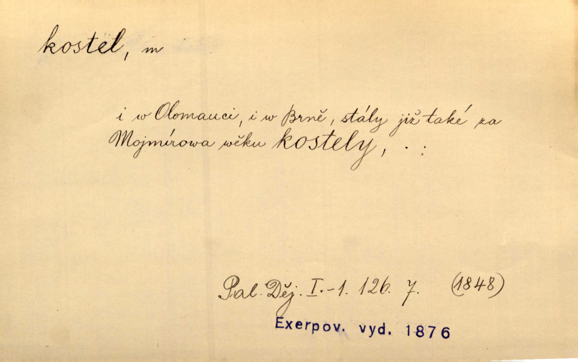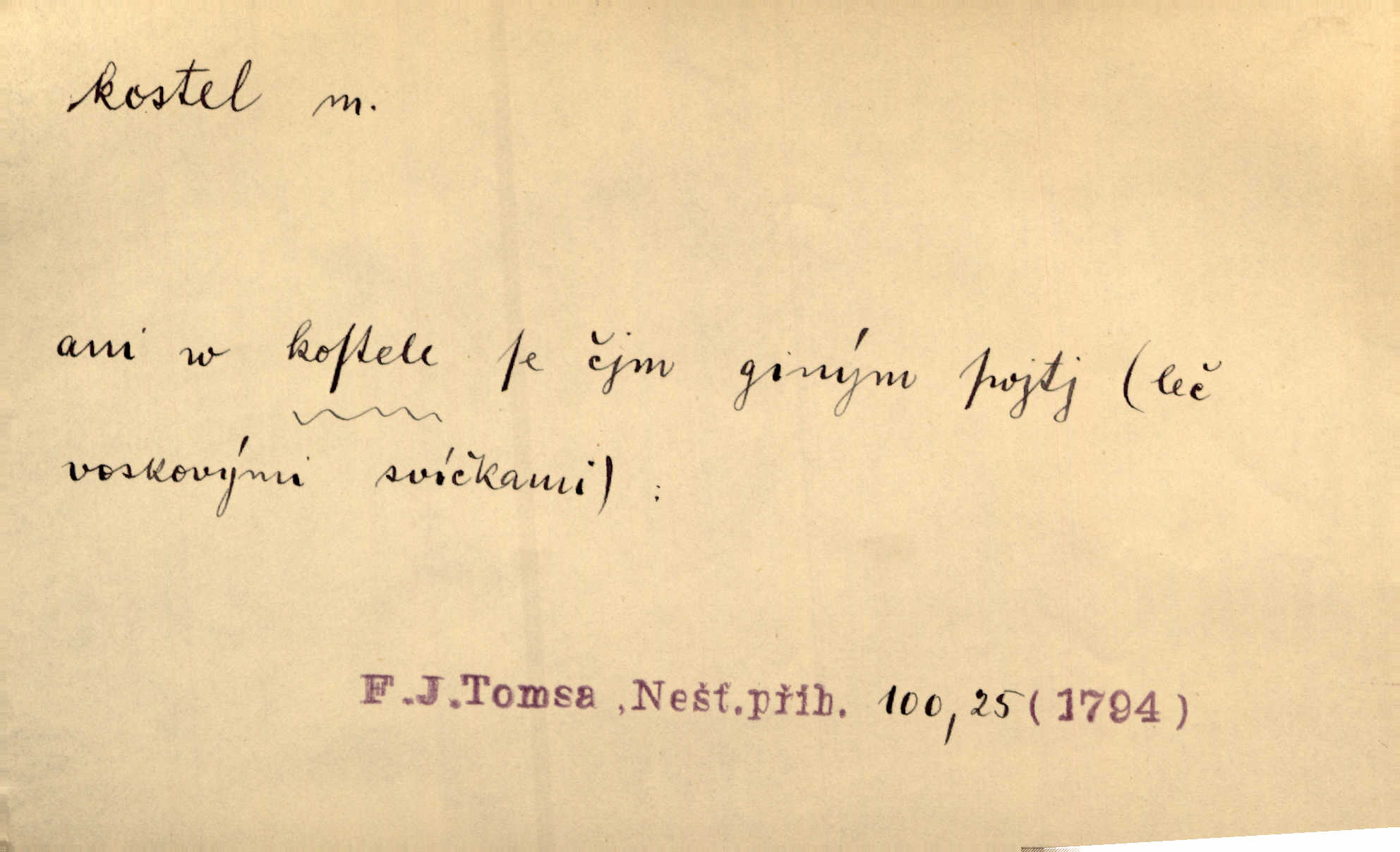 - kostel, -a m. budova pro křesťanskou bohoslužbu. Kolem kostela rozkládal se hřbitov, hrazený zdí. Jir. Nad kostelem velké zvony do vůkolí zvoní. Ner. Kostel sv. Víta, sv. Václava, sv. Jiří atd. Kostel farní, filiální, katedrální, klášterní, poutní a p. Když pak začalo slunce za horami vycházet, bývalo mi vždy, jak bych v kostele stála nábožně, velebně. Něm. Zde [na přednášce] jsme seděli zbožně jako v kostele, rozechvěni, blaženi. Ner. Většina [žáků] poslouchala slova učitelova jako v kostele nábožně, v nábožném tichu, pozorně. Herb. V olších u potoka to utichlo jako v kostele. Svět. Když potom pomocník zpíval, bylo [v sále] zase jako v kostele naprosté, nábožné ticho. Rais. Ve světnici naší čisto jako v kostele. Kos. Lidé putovali pro ně [zemančiny léky] na Luhov jako do kostela houfně. Svět. Ne všickni jsou svati, co si otírají o kostel paty tváří se jako pobožní lidé. Přísl. Já si myslím, že půjdem s kostelem okolo kříže budeme si počínati převráceně. Tyl. Naučím tě v kostele hvízdati pohrůžka trestem. Pořek. Chtěl bych, až jednou budu vcházeti po zádech do kostela, aby se mnou šli chlapi v zástěrách a nesli svůj prapor až budu mít pohřeb. Vanč. D mše, služby boží. Po kostele zastavili se [rodiče] obyčejně u Stupartů na sklenici vína po mši. Svět. Ta naše holka v dnešní den i kostel zaspala. Hol. [Frantík] rád chodil do kostela na služby boží. Jir. Dědeček přinesl z kostela za krejcar preclík. Rais. D věřící shromáždění při mši. Při české modlitbě odpovídal [knězi] celý kostel. Rais. Hlavy celého kostela se po ní ohlížely. Baar. D církev. Kostel [u Slovanů v Istrii] je dosud čistě národní. Ner. D Dial. náboženské vyznání. Za ten jiný kostel žádný z vás [Eva ani Mánek] nemohl. Preis.
