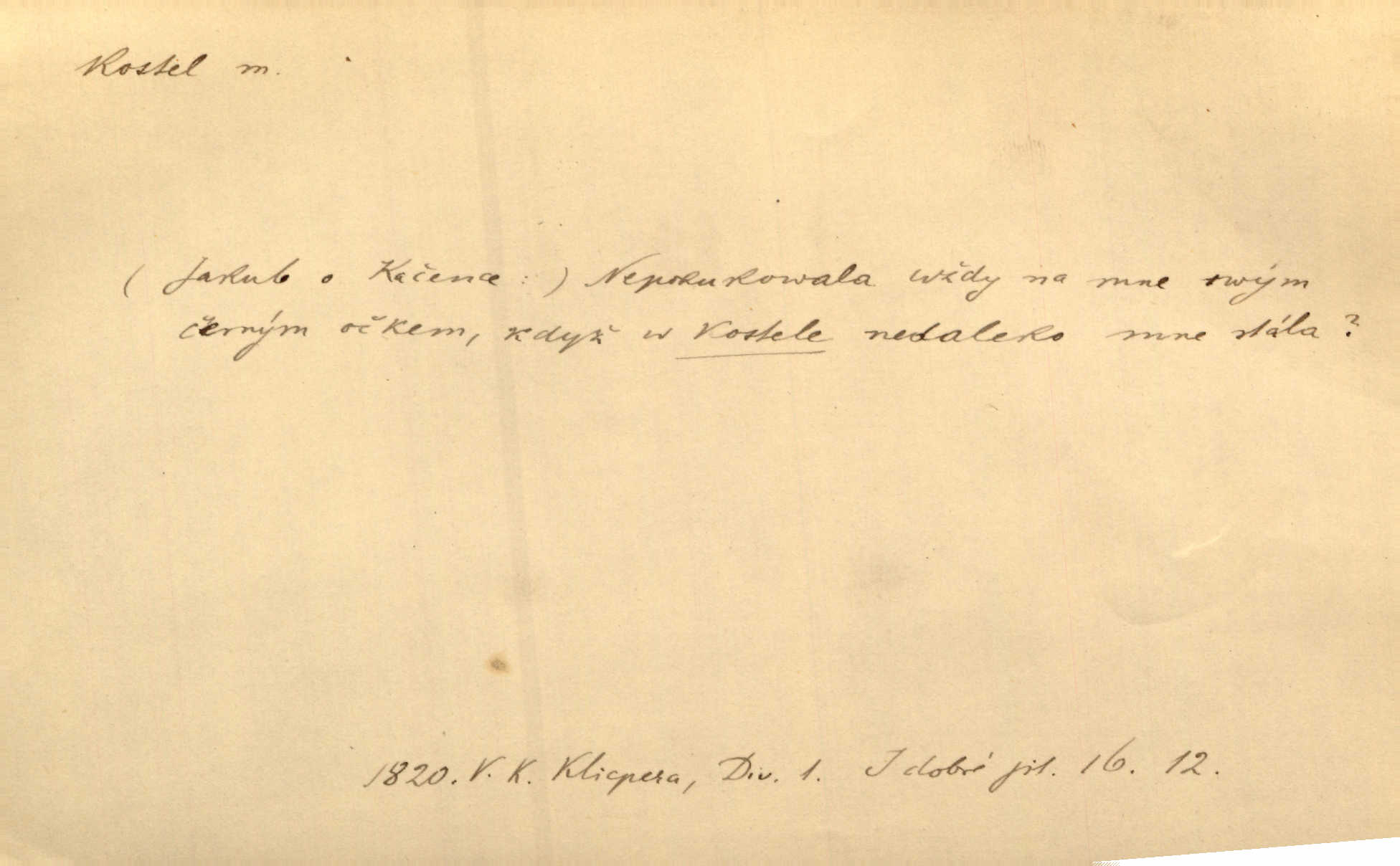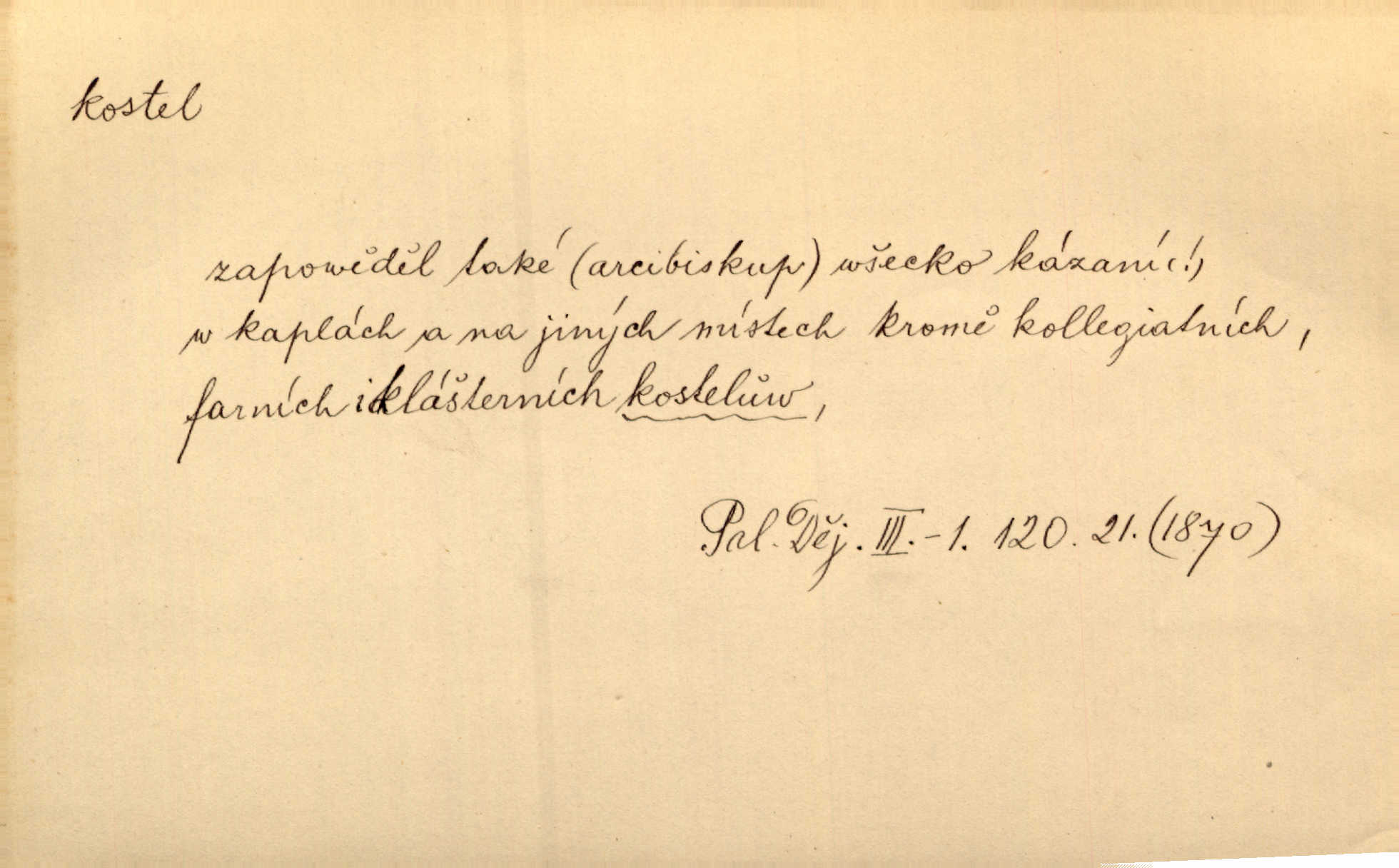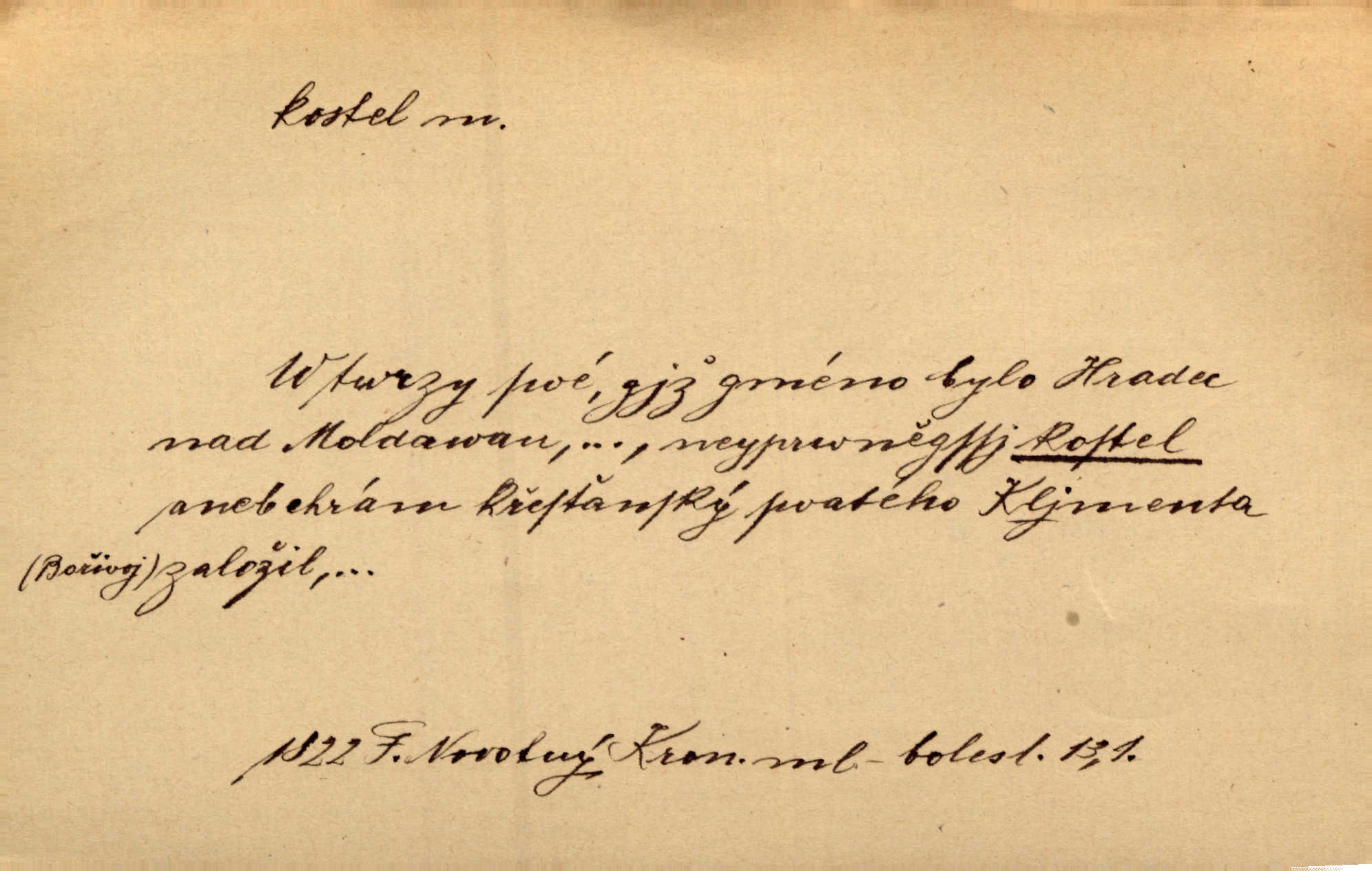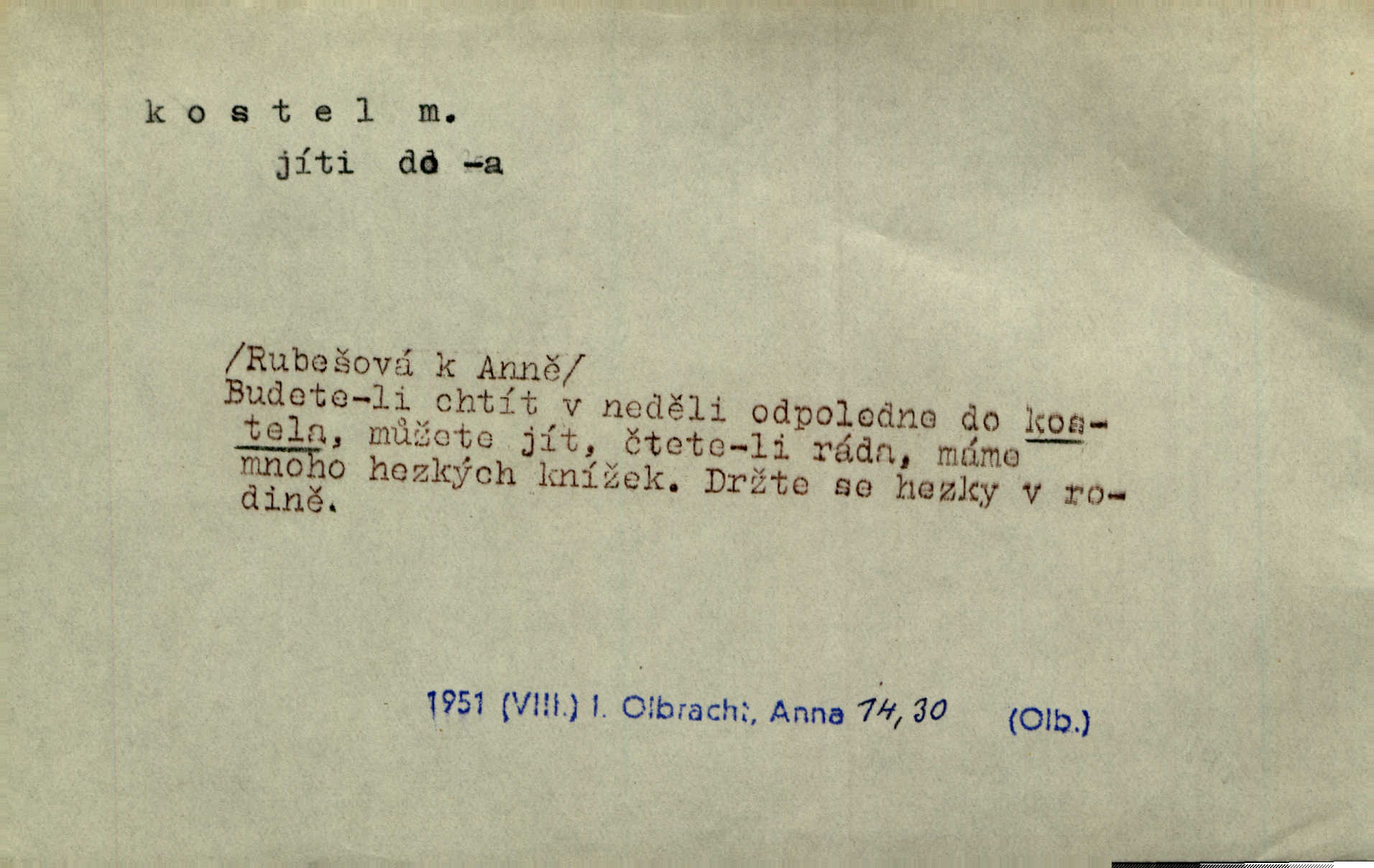 - kostel, -a m. budova pro křesťanskou bohoslužbu. Kolem kostela rozkládal se hřbitov, hrazený zdí. Jir. Nad kostelem velké zvony do vůkolí zvoní. Ner. Kostel sv. Víta, sv. Václava, sv. Jiří atd. Kostel farní, filiální, katedrální, klášterní, poutní a p. Když pak začalo slunce za horami vycházet, bývalo mi vždy, jak bych v kostele stála nábožně, velebně. Něm. Zde [na přednášce] jsme seděli zbožně jako v kostele, rozechvěni, blaženi. Ner. Většina [žáků] poslouchala slova učitelova jako v kostele nábožně, v nábožném tichu, pozorně. Herb. V olších u potoka to utichlo jako v kostele. Svět. Když potom pomocník zpíval, bylo [v sále] zase jako v kostele naprosté, nábožné ticho. Rais. Ve světnici naší čisto jako v kostele. Kos. Lidé putovali pro ně [zemančiny léky] na Luhov jako do kostela houfně. Svět. Ne všickni jsou svati, co si otírají o kostel paty tváří se jako pobožní lidé. Přísl. Já si myslím, že půjdem s kostelem okolo kříže budeme si počínati převráceně. Tyl. Naučím tě v kostele hvízdati pohrůžka trestem. Pořek. Chtěl bych, až jednou budu vcházeti po zádech do kostela, aby se mnou šli chlapi v zástěrách a nesli svůj prapor až budu mít pohřeb. Vanč. D mše, služby boží. Po kostele zastavili se [rodiče] obyčejně u Stupartů na sklenici vína po mši. Svět. Ta naše holka v dnešní den i kostel zaspala. Hol. [Frantík] rád chodil do kostela na služby boží. Jir. Dědeček přinesl z kostela za krejcar preclík. Rais. D věřící shromáždění při mši. Při české modlitbě odpovídal [knězi] celý kostel. Rais. Hlavy celého kostela se po ní ohlížely. Baar. D církev. Kostel [u Slovanů v Istrii] je dosud čistě národní. Ner. D Dial. náboženské vyznání. Za ten jiný kostel žádný z vás [Eva ani Mánek] nemohl. Preis.