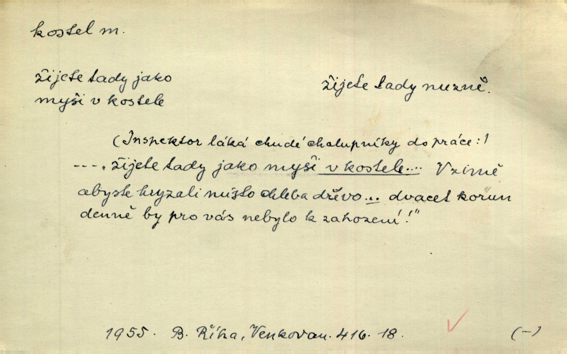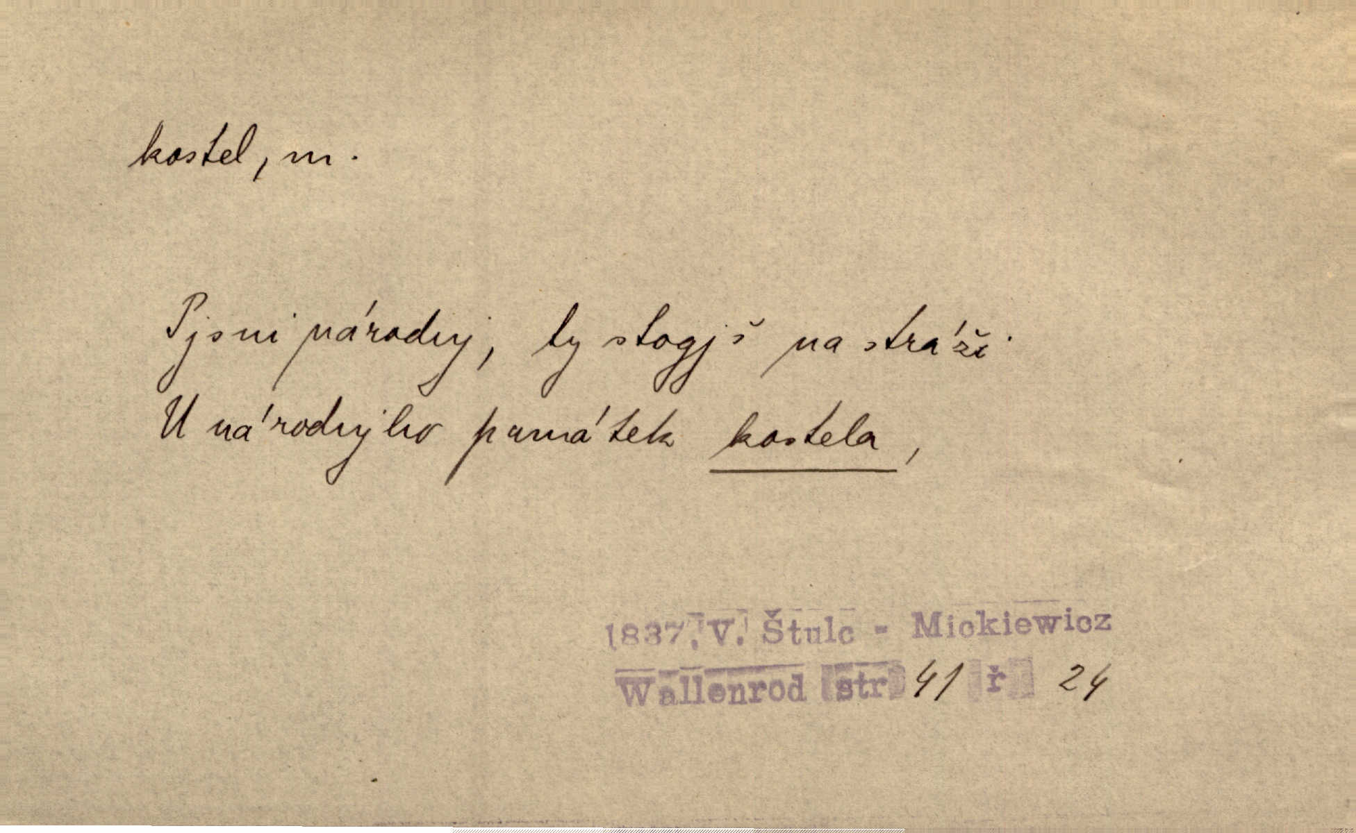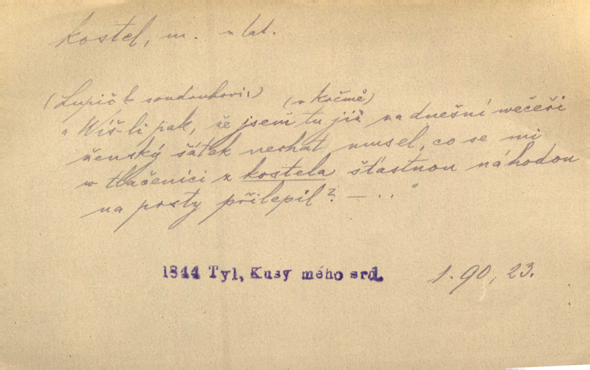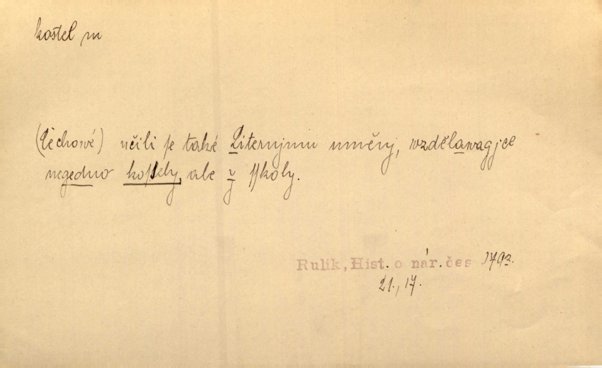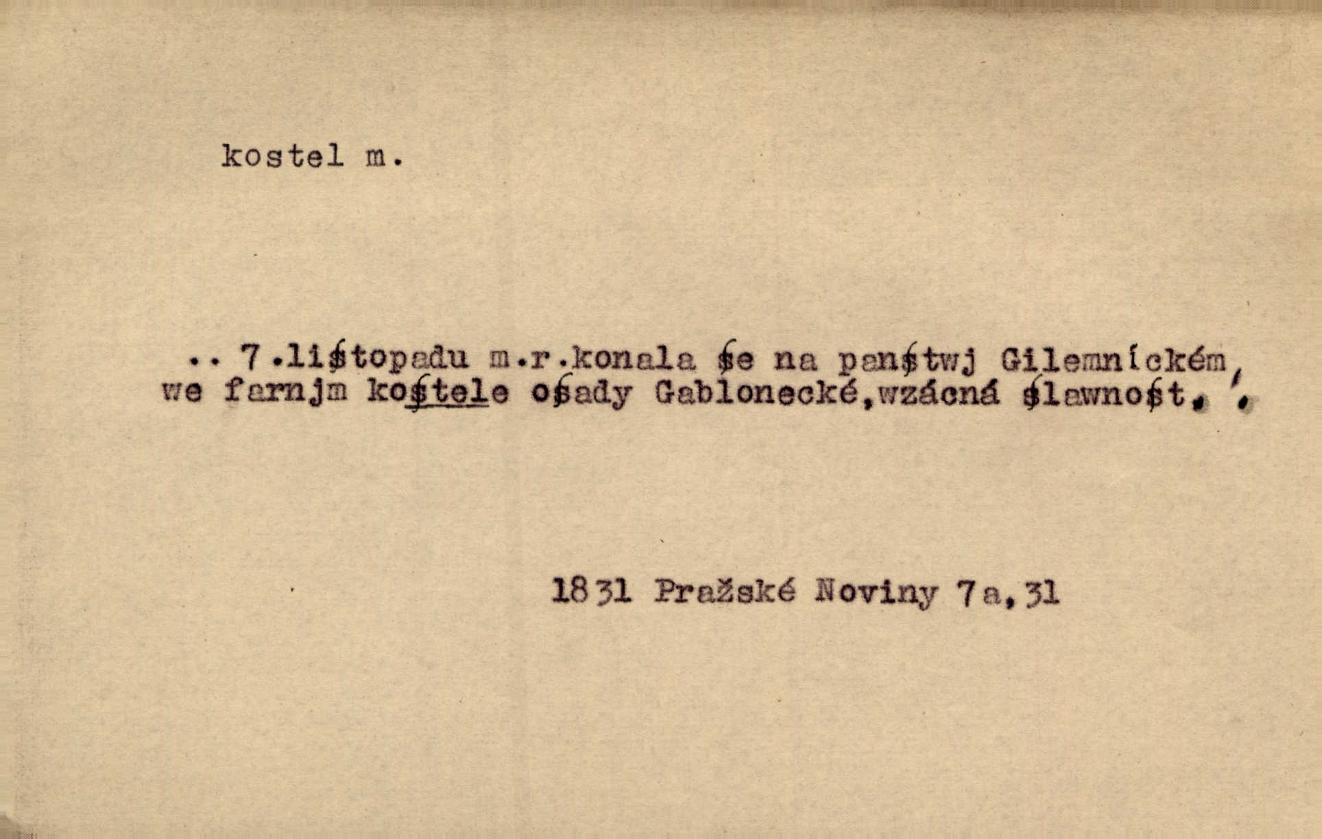- kostel, -a m. budova pro křesťanskou bohoslužbu. Kolem kostela rozkládal se hřbitov, hrazený zdí. Jir. Nad kostelem velké zvony do vůkolí zvoní. Ner. Kostel sv. Víta, sv. Václava, sv. Jiří atd. Kostel farní, filiální, katedrální, klášterní, poutní a p. Když pak začalo slunce za horami vycházet, bývalo mi vždy, jak bych v kostele stála nábožně, velebně. Něm. Zde [na přednášce] jsme seděli zbožně jako v kostele, rozechvěni, blaženi. Ner. Většina [žáků] poslouchala slova učitelova jako v kostele nábožně, v nábožném tichu, pozorně. Herb. V olších u potoka to utichlo jako v kostele. Svět. Když potom pomocník zpíval, bylo [v sále] zase jako v kostele naprosté, nábožné ticho. Rais. Ve světnici naší čisto jako v kostele. Kos. Lidé putovali pro ně [zemančiny léky] na Luhov jako do kostela houfně. Svět. Ne všickni jsou svati, co si otírají o kostel paty tváří se jako pobožní lidé. Přísl. Já si myslím, že půjdem s kostelem okolo kříže budeme si počínati převráceně. Tyl. Naučím tě v kostele hvízdati pohrůžka trestem. Pořek. Chtěl bych, až jednou budu vcházeti po zádech do kostela, aby se mnou šli chlapi v zástěrách a nesli svůj prapor až budu mít pohřeb. Vanč. D mše, služby boží. Po kostele zastavili se [rodiče] obyčejně u Stupartů na sklenici vína po mši. Svět. Ta naše holka v dnešní den i kostel zaspala. Hol. [Frantík] rád chodil do kostela na služby boží. Jir. Dědeček přinesl z kostela za krejcar preclík. Rais. D věřící shromáždění při mši. Při české modlitbě odpovídal [knězi] celý kostel. Rais. Hlavy celého kostela se po ní ohlížely. Baar. D církev. Kostel [u Slovanů v Istrii] je dosud čistě národní. Ner. D Dial. náboženské vyznání. Za ten jiný kostel žádný z vás [Eva ani Mánek] nemohl. Preis.