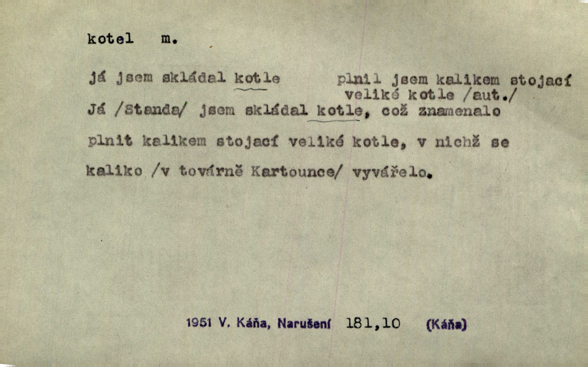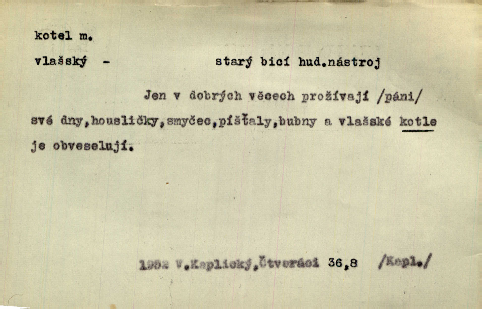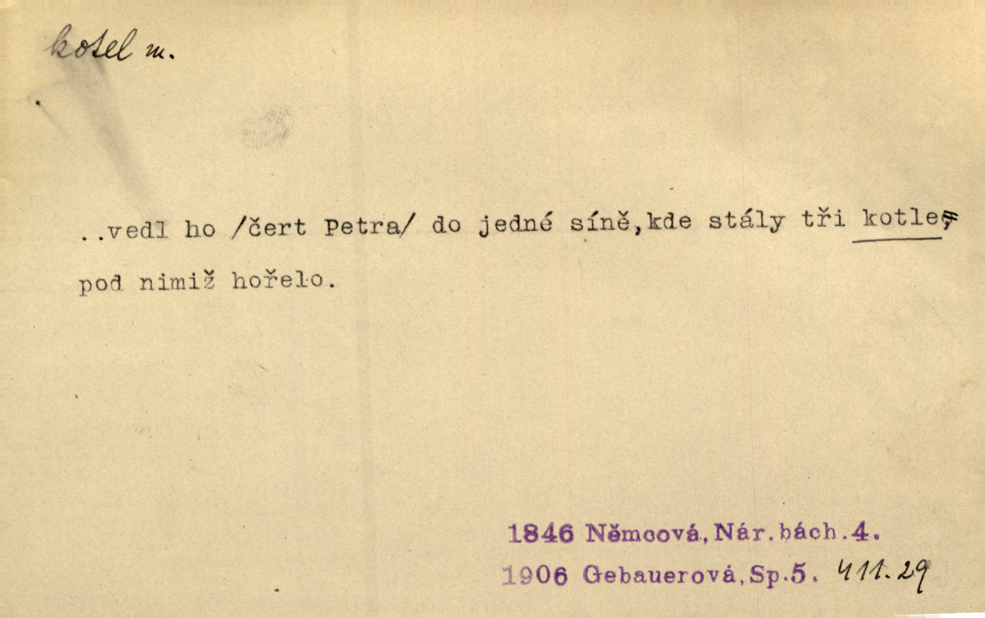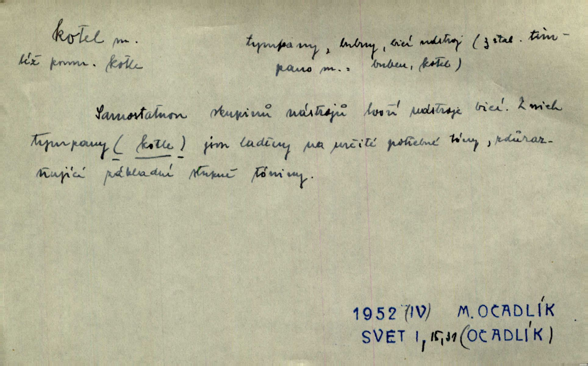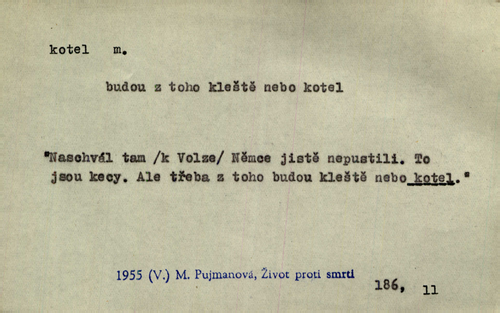- kotel, -tle, řidč. -tlu m. větší nádoba, vespod zaobleného tvaru, k vaření n. ohřívání, upevňovaná přímo nad plameny. Na ohništi hořel oheň, nad nímž visel kotel. Jir. Domácí pán měl v kuchyni zazděný kotel měděný. Ritt. Vedl ho [čert Petra] do jedné síně, kde stály tři kotle, pod nimiž hořelo. Něm. Vytahoval [učedník] z kotlu uzenky. Šim. Tam dole [pod vodopádem] vřelo to jako v kotli. Mah. Tech. parní kotel válcovitá nádoba, v níž se vyrábí pára vyššího tlaku než atmosférického; celé zařízení na výrobu páry. D bicí nástroj hudební, tympan. Hudebníci s kotli a troubami. Schulz. Kotly vířily, trouby zvučely. Jir. D Mysl. zvířecí pelech, hlavní část doupěte. Geol. kotel ledovcový kar, březno. D Vulg. zadnice. Tak mi vyliž kotel. Trn.