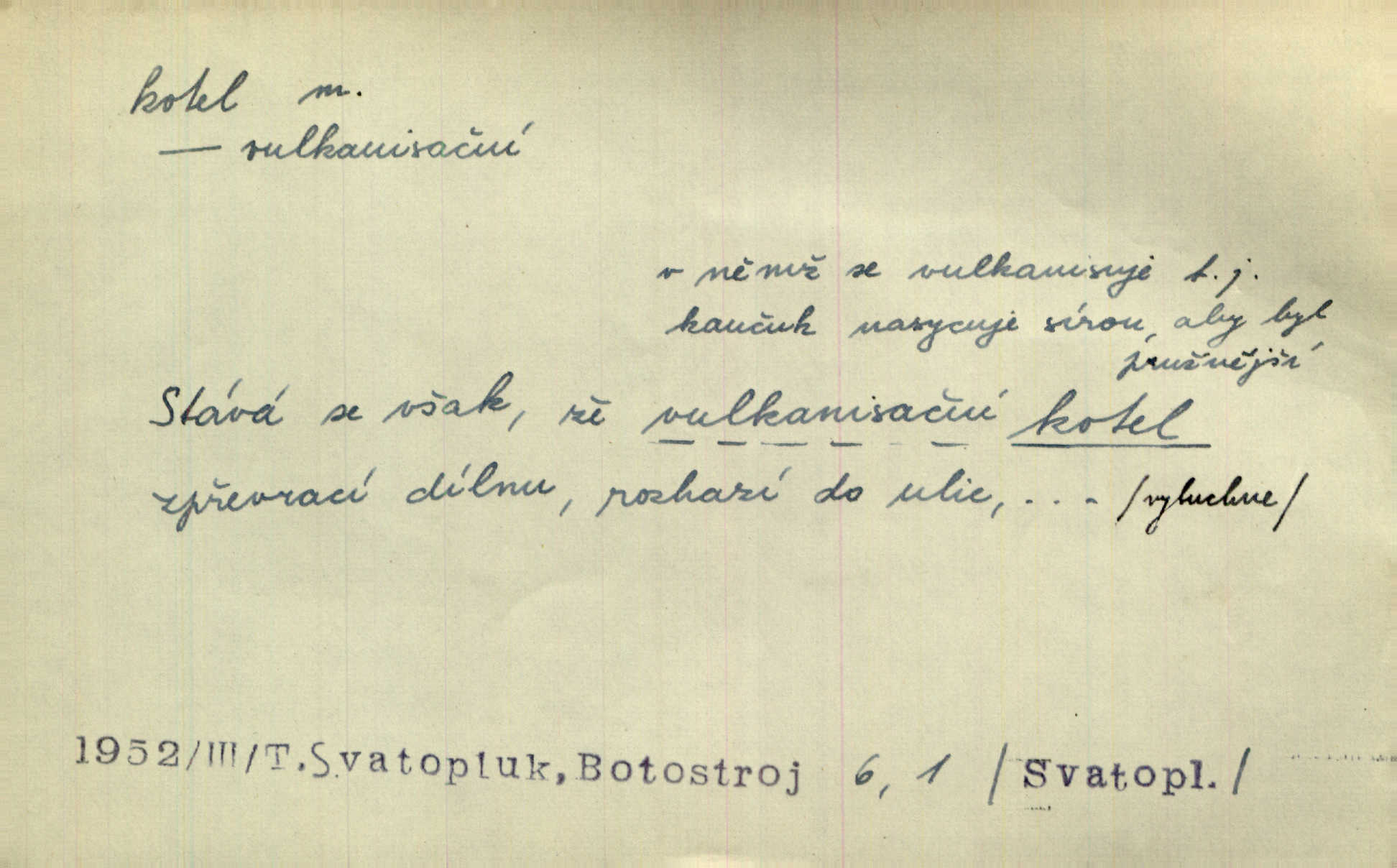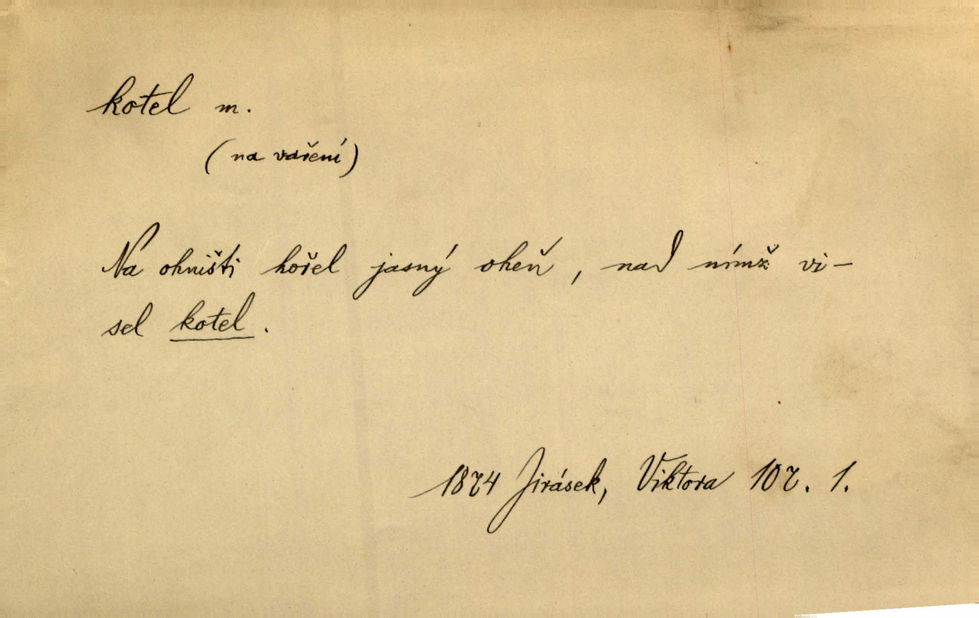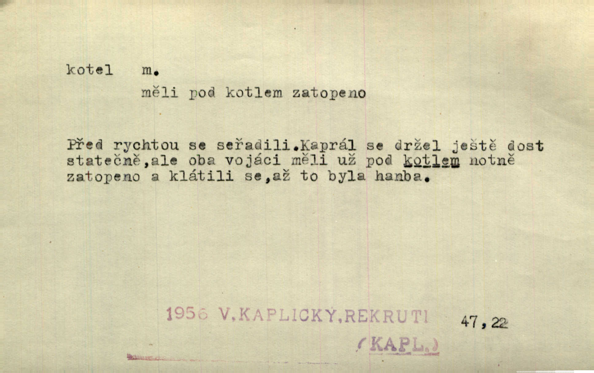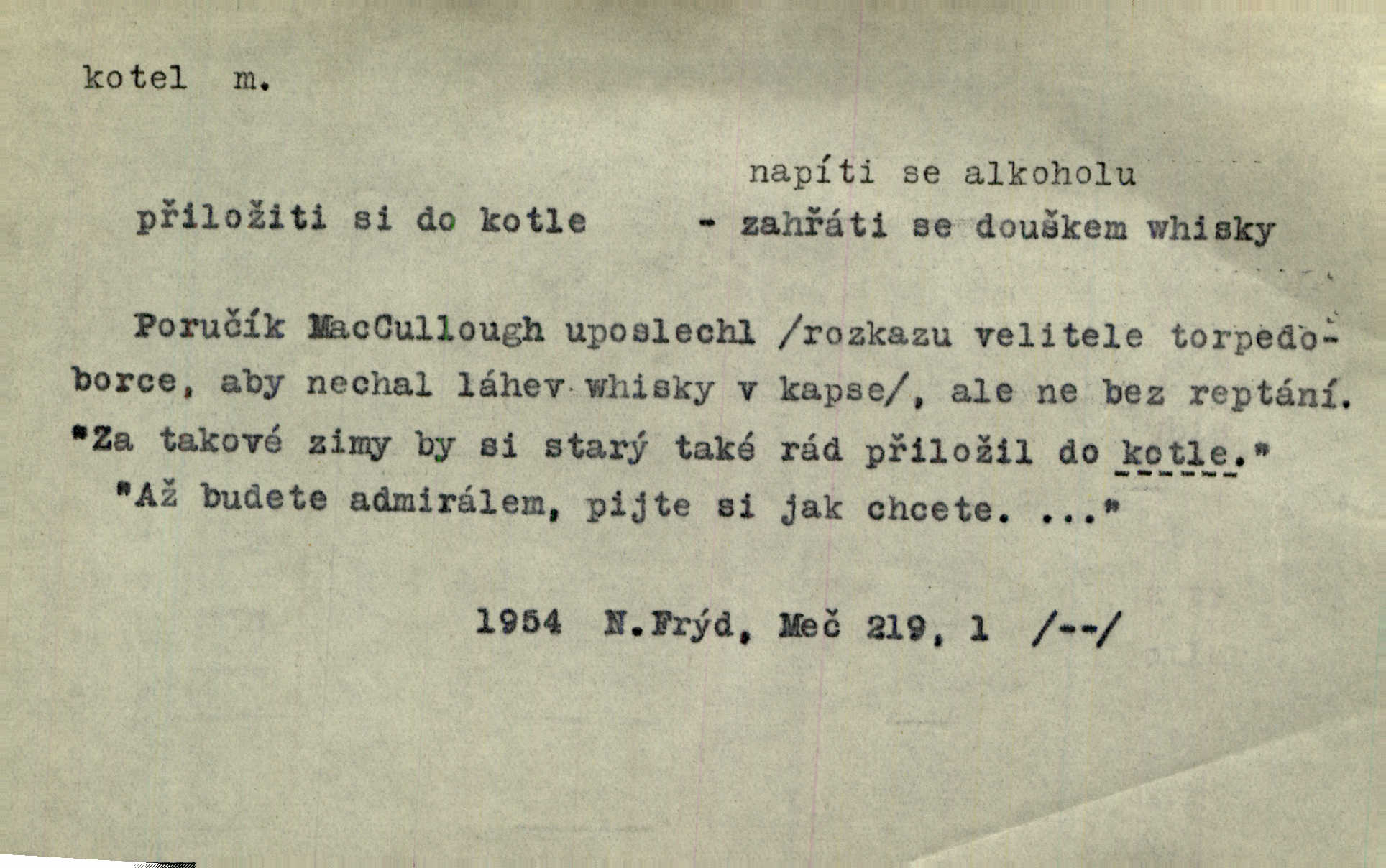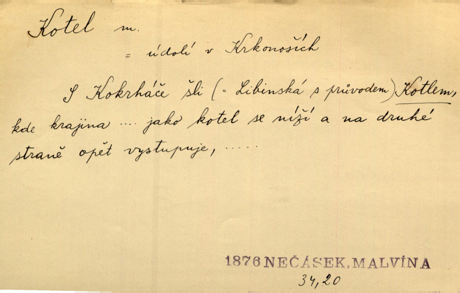 - kotel, -tle, řidč. -tlu m. větší nádoba, vespod zaobleného tvaru, k vaření n. ohřívání, upevňovaná přímo nad plameny. Na ohništi hořel oheň, nad nímž visel kotel. Jir. Domácí pán měl v kuchyni zazděný kotel měděný. Ritt. Vedl ho [čert Petra] do jedné síně, kde stály tři kotle, pod nimiž hořelo. Něm. Vytahoval [učedník] z kotlu uzenky. Šim. Tam dole [pod vodopádem] vřelo to jako v kotli. Mah. Tech. parní kotel válcovitá nádoba, v níž se vyrábí pára vyššího tlaku než atmosférického; celé zařízení na výrobu páry. D bicí nástroj hudební, tympan. Hudebníci s kotli a troubami. Schulz. Kotly vířily, trouby zvučely. Jir. D Mysl. zvířecí pelech, hlavní část doupěte. Geol. kotel ledovcový kar, březno. D Vulg. zadnice. Tak mi vyliž kotel. Trn.