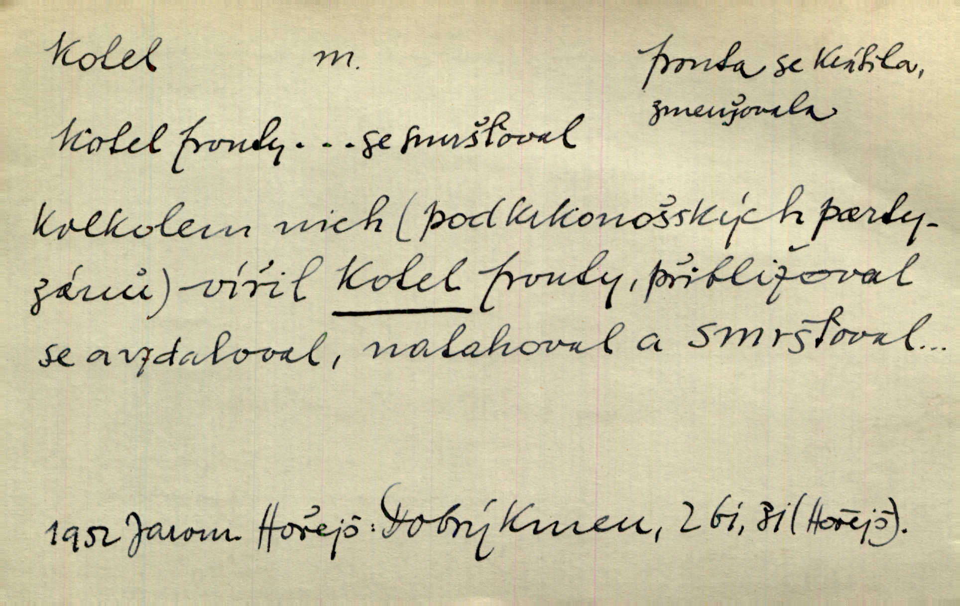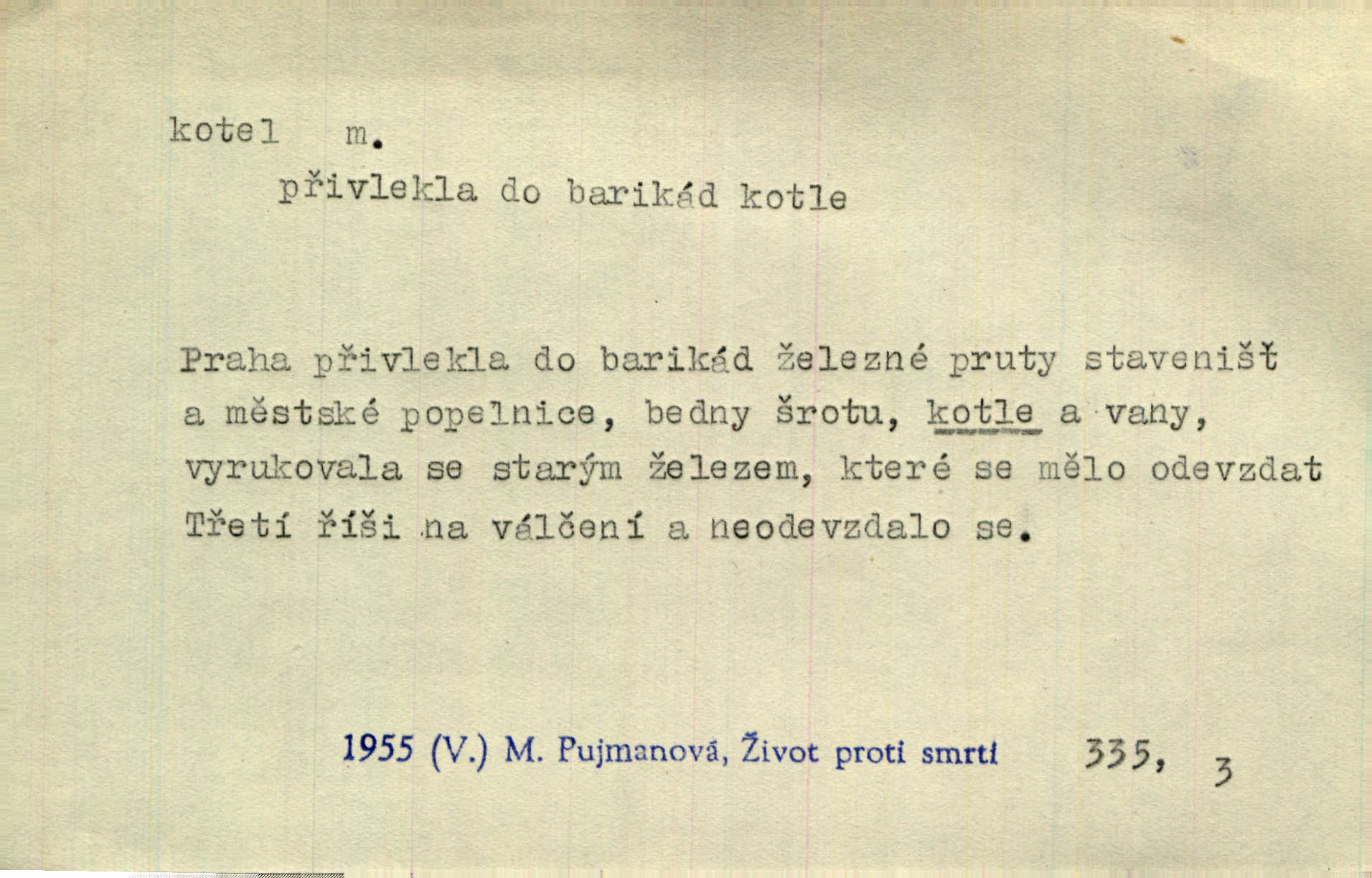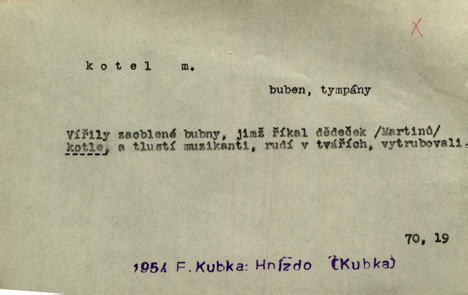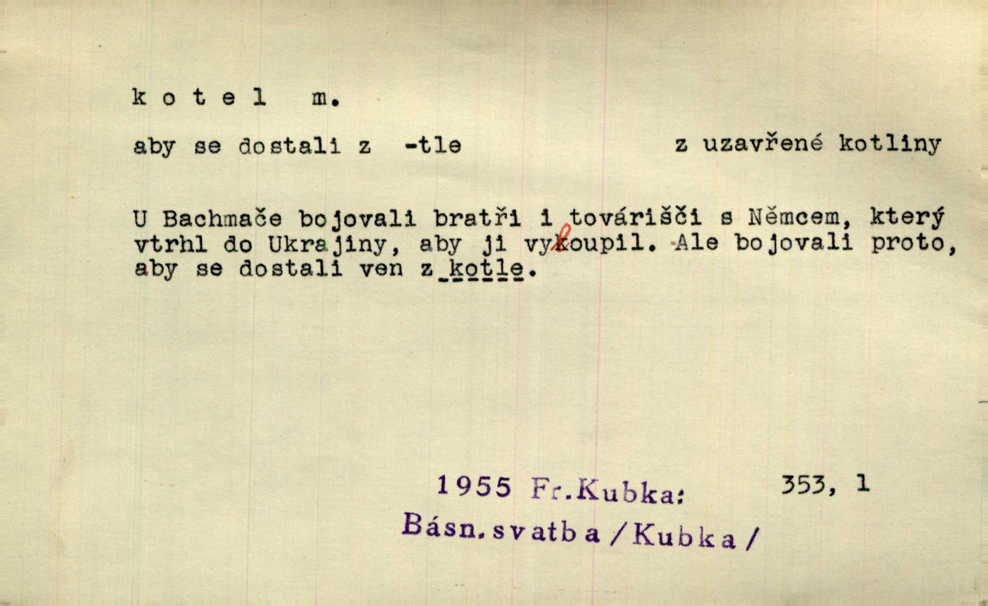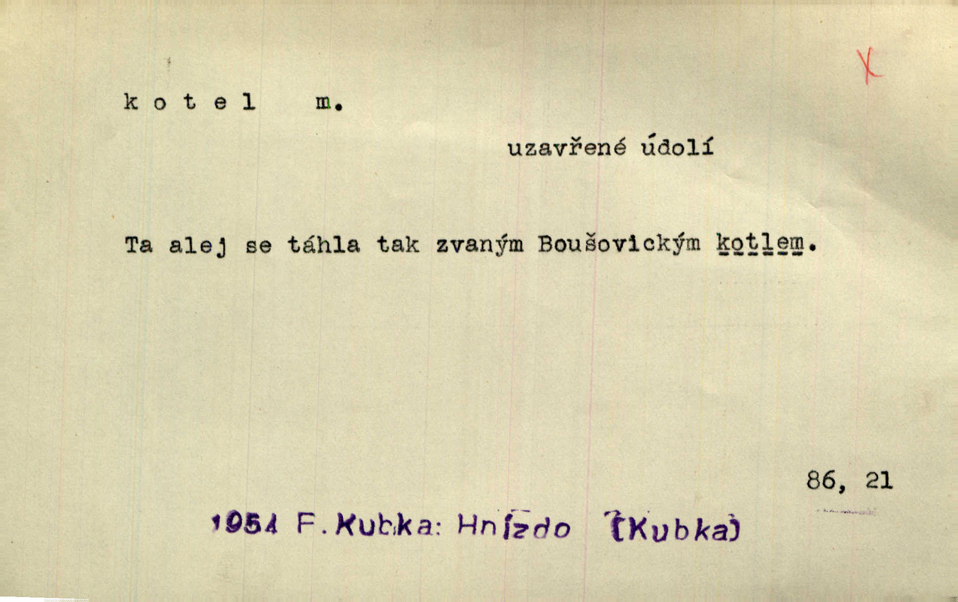 - kotel, -tle, řidč. -tlu m. větší nádoba, vespod zaobleného tvaru, k vaření n. ohřívání, upevňovaná přímo nad plameny. Na ohništi hořel oheň, nad nímž visel kotel. Jir. Domácí pán měl v kuchyni zazděný kotel měděný. Ritt. Vedl ho [čert Petra] do jedné síně, kde stály tři kotle, pod nimiž hořelo. Něm. Vytahoval [učedník] z kotlu uzenky. Šim. Tam dole [pod vodopádem] vřelo to jako v kotli. Mah. Tech. parní kotel válcovitá nádoba, v níž se vyrábí pára vyššího tlaku než atmosférického; celé zařízení na výrobu páry. D bicí nástroj hudební, tympan. Hudebníci s kotli a troubami. Schulz. Kotly vířily, trouby zvučely. Jir. D Mysl. zvířecí pelech, hlavní část doupěte. Geol. kotel ledovcový kar, březno. D Vulg. zadnice. Tak mi vyliž kotel. Trn.