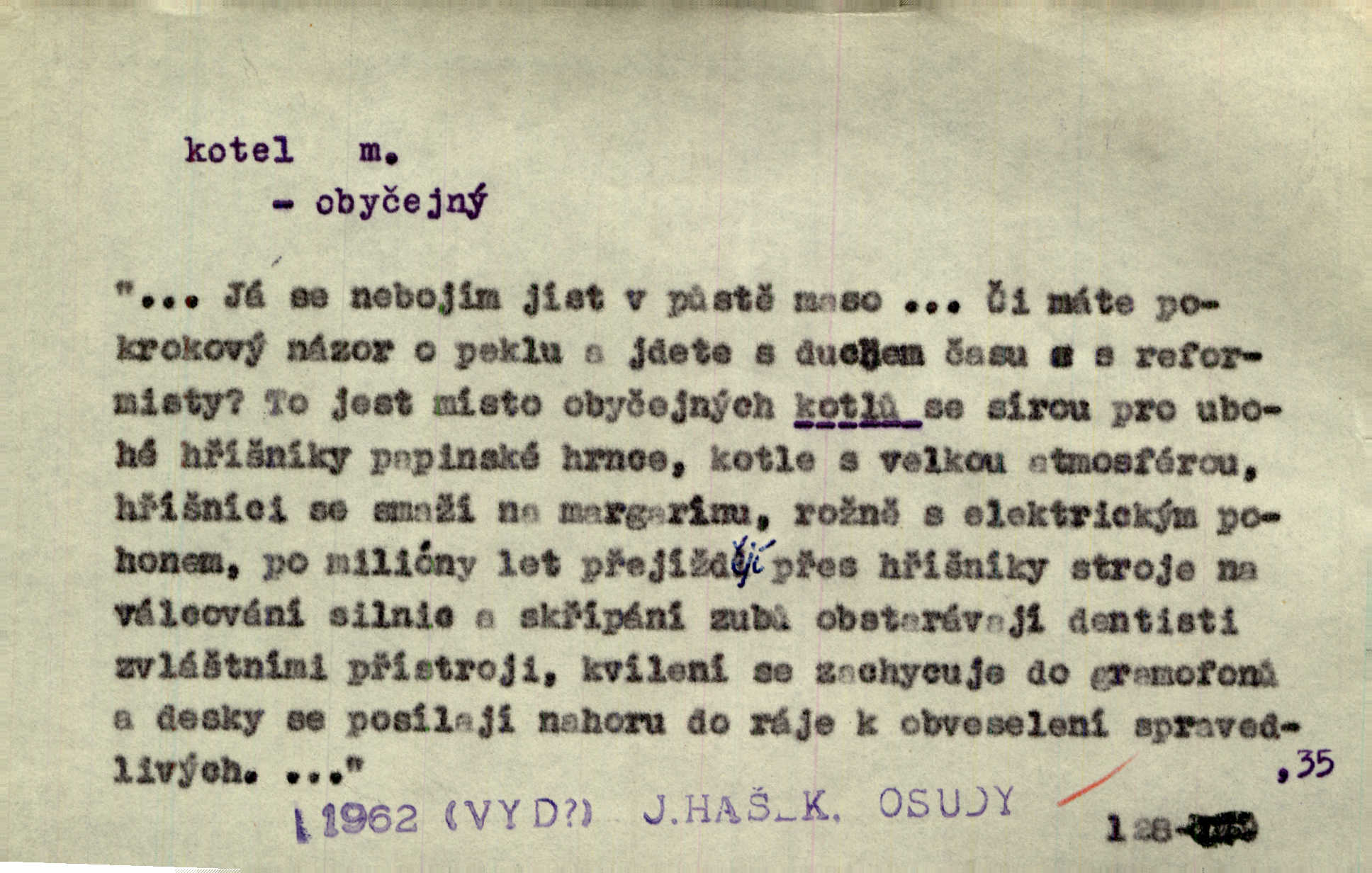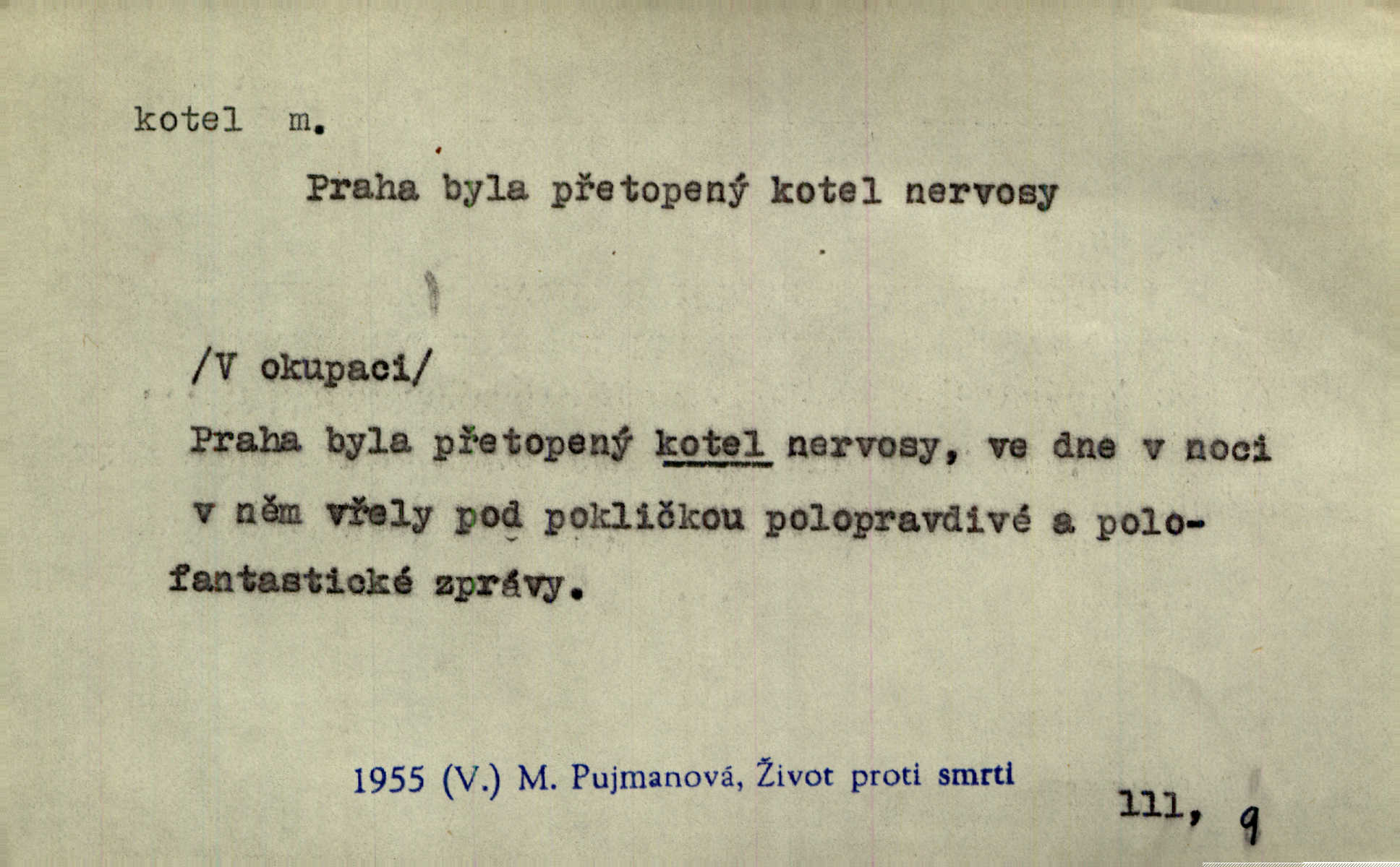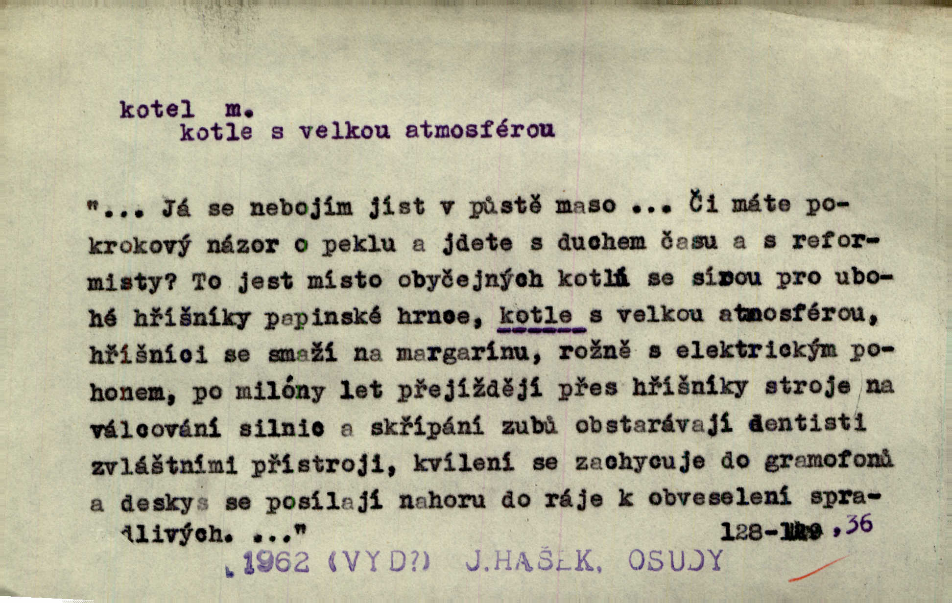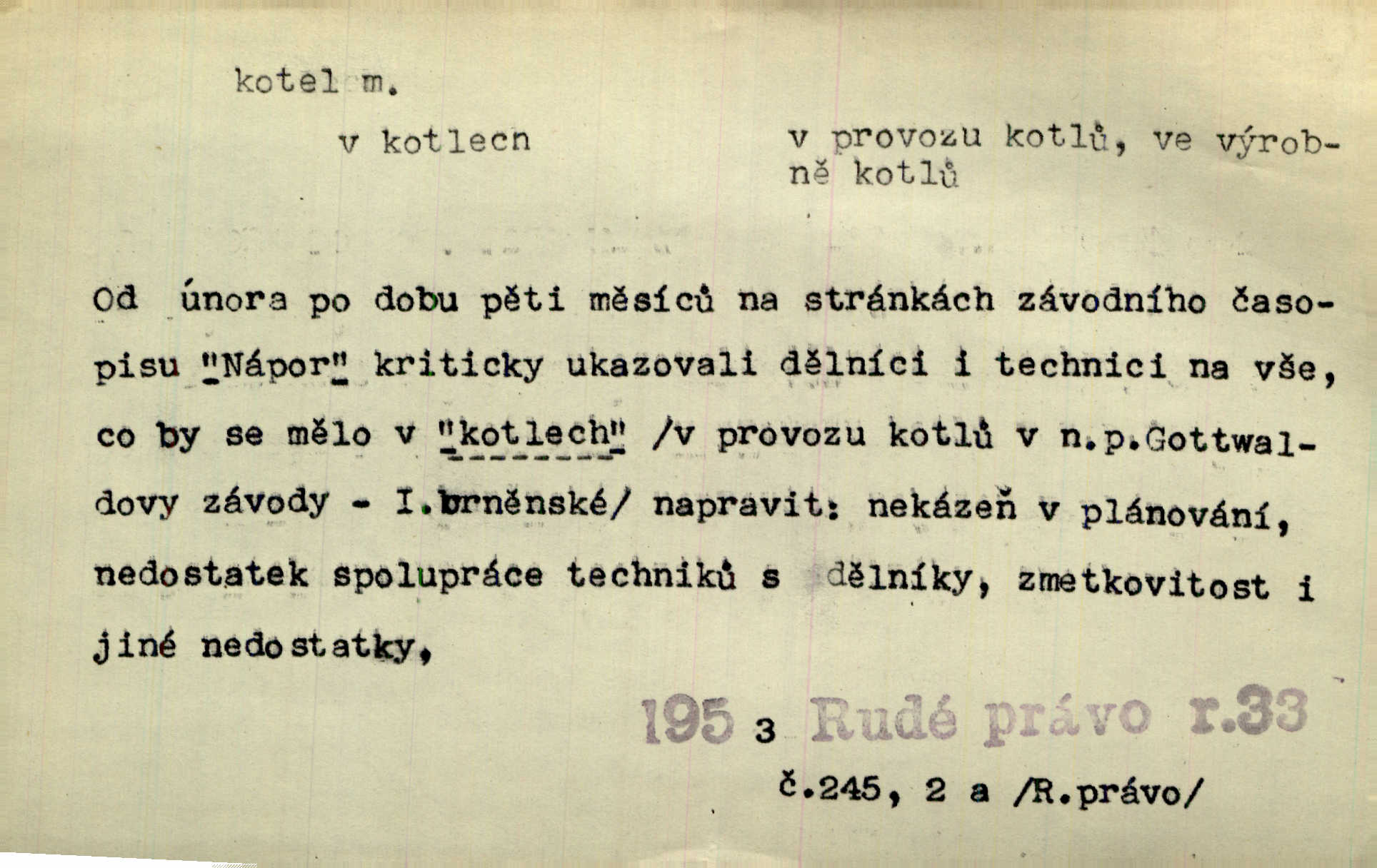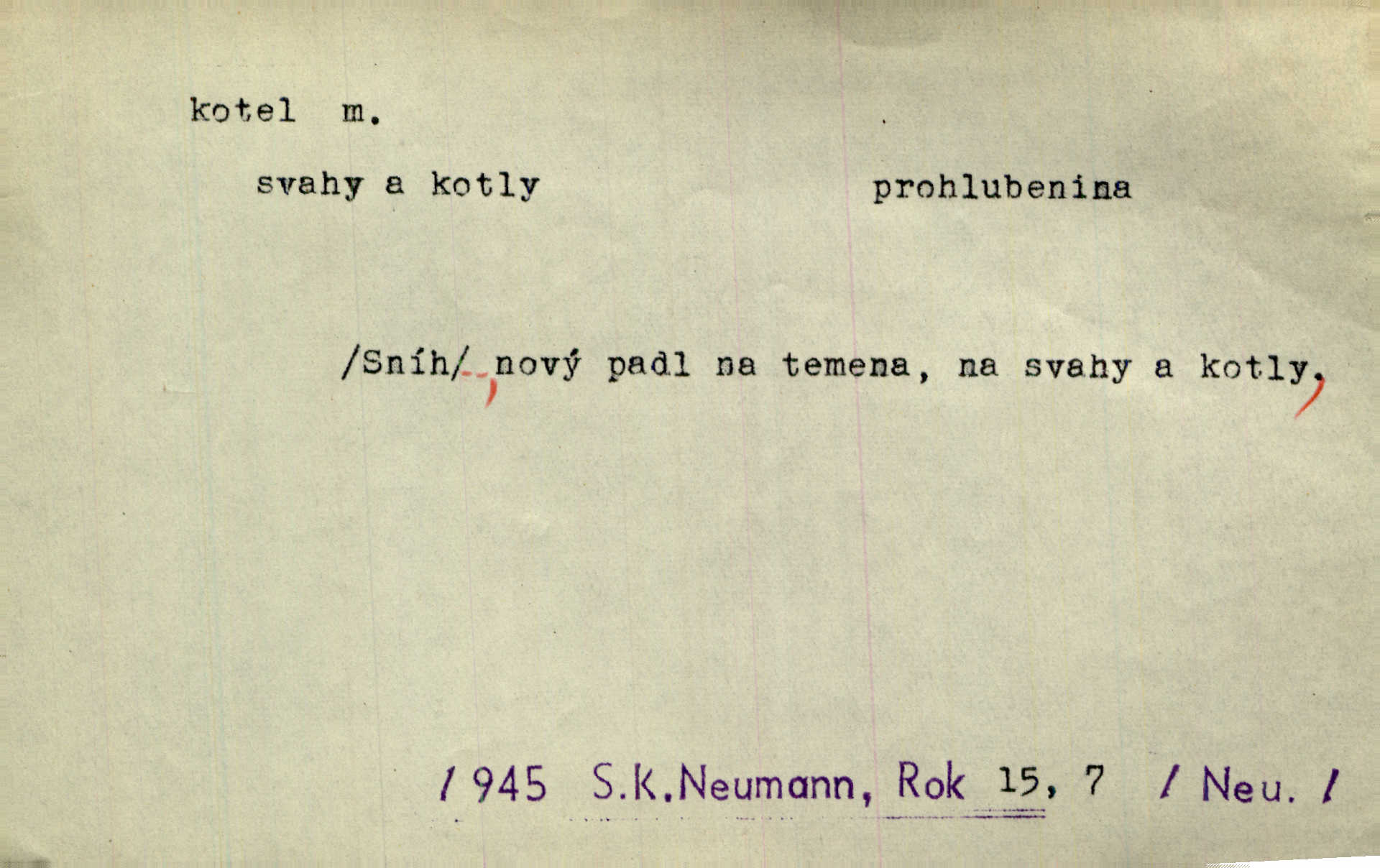 - kotel, -tle, řidč. -tlu m. větší nádoba, vespod zaobleného tvaru, k vaření n. ohřívání, upevňovaná přímo nad plameny. Na ohništi hořel oheň, nad nímž visel kotel. Jir. Domácí pán měl v kuchyni zazděný kotel měděný. Ritt. Vedl ho [čert Petra] do jedné síně, kde stály tři kotle, pod nimiž hořelo. Něm. Vytahoval [učedník] z kotlu uzenky. Šim. Tam dole [pod vodopádem] vřelo to jako v kotli. Mah. Tech. parní kotel válcovitá nádoba, v níž se vyrábí pára vyššího tlaku než atmosférického; celé zařízení na výrobu páry. D bicí nástroj hudební, tympan. Hudebníci s kotli a troubami. Schulz. Kotly vířily, trouby zvučely. Jir. D Mysl. zvířecí pelech, hlavní část doupěte. Geol. kotel ledovcový kar, březno. D Vulg. zadnice. Tak mi vyliž kotel. Trn.