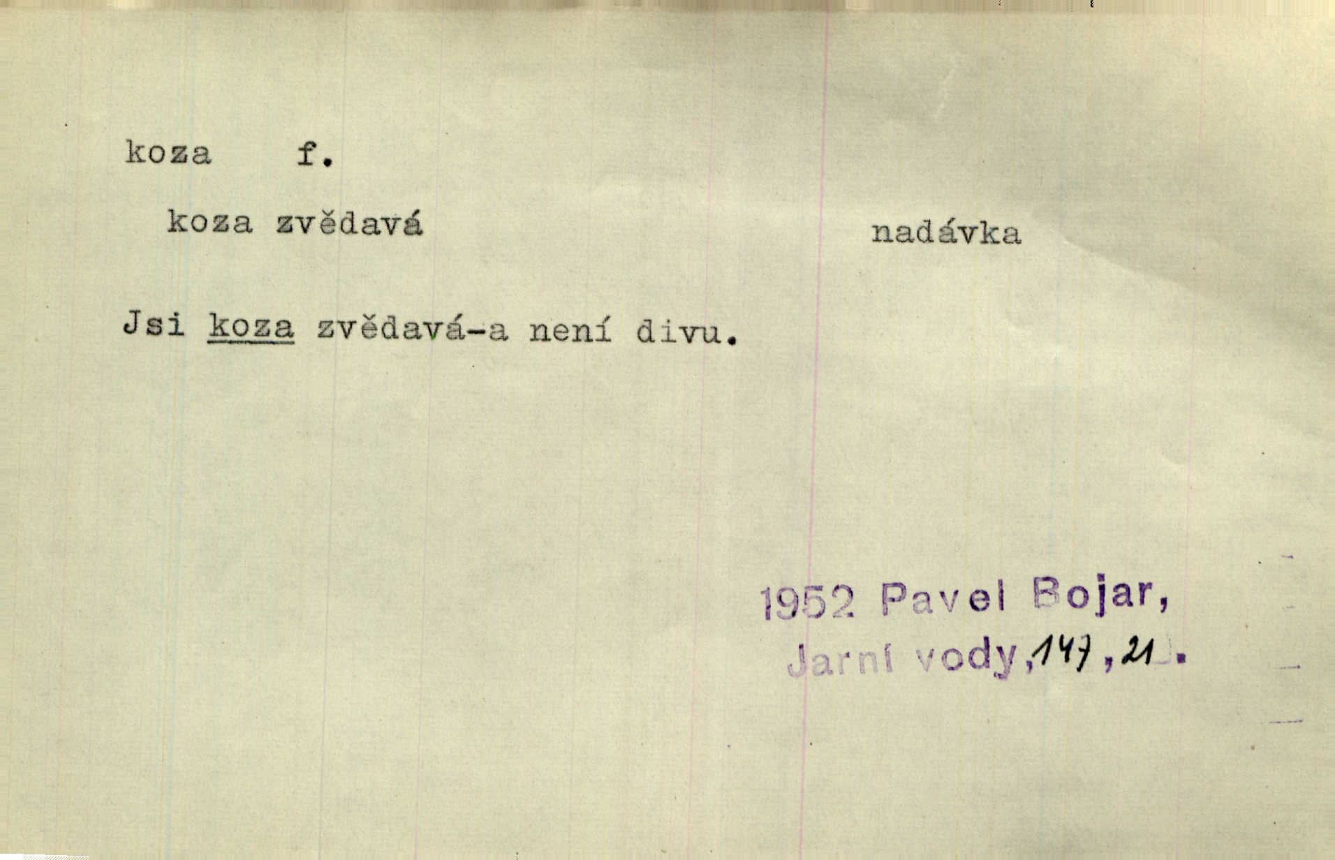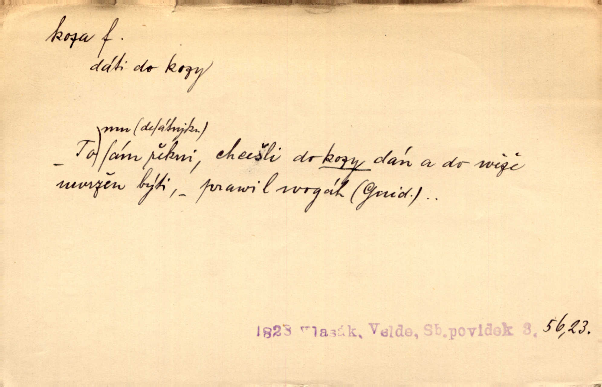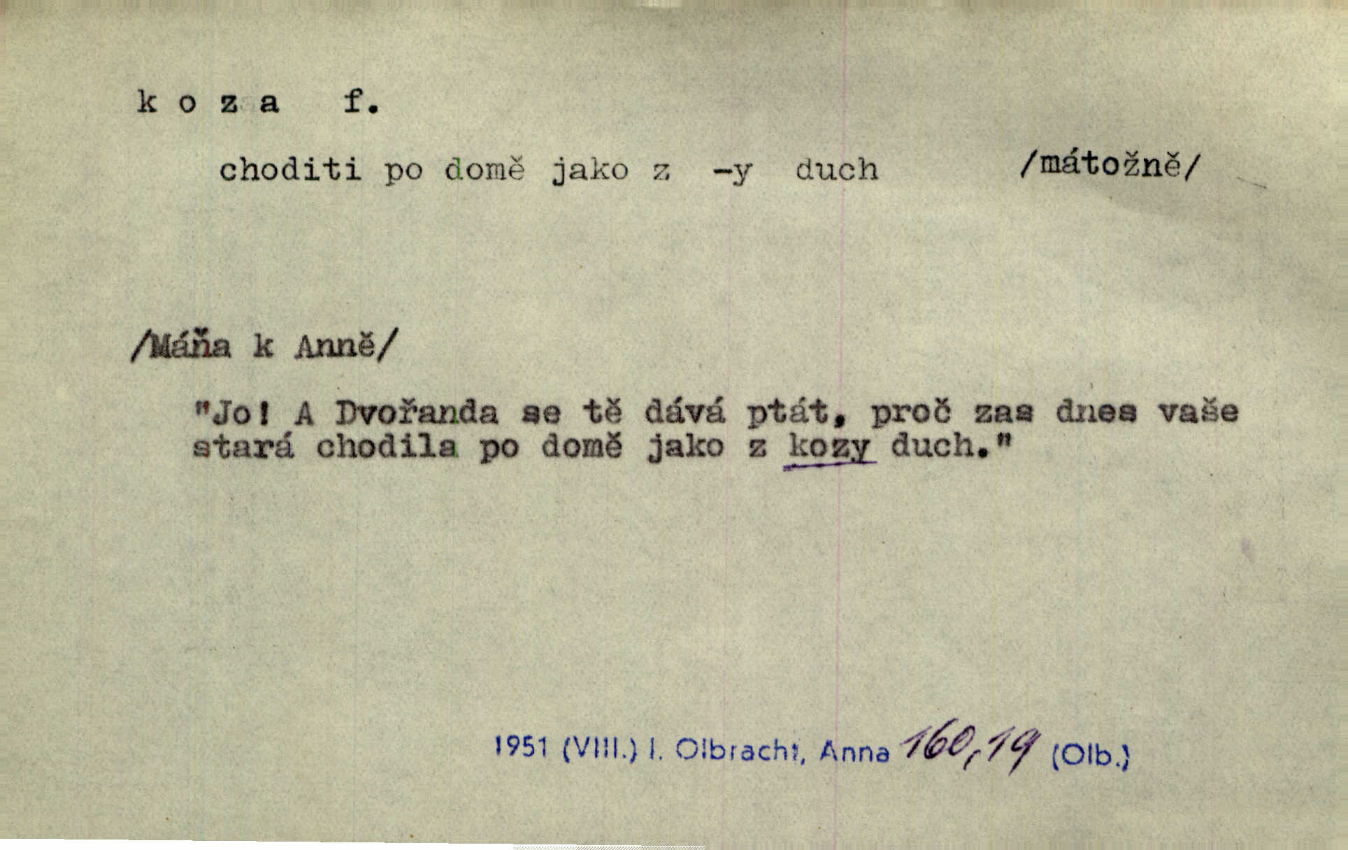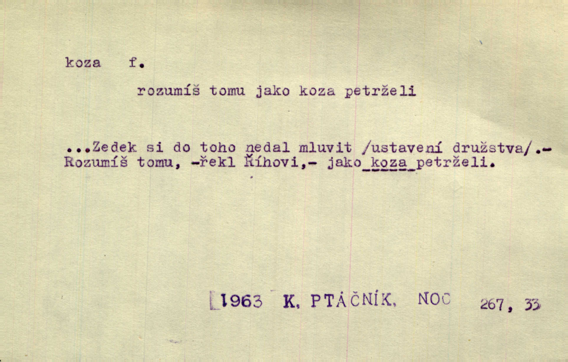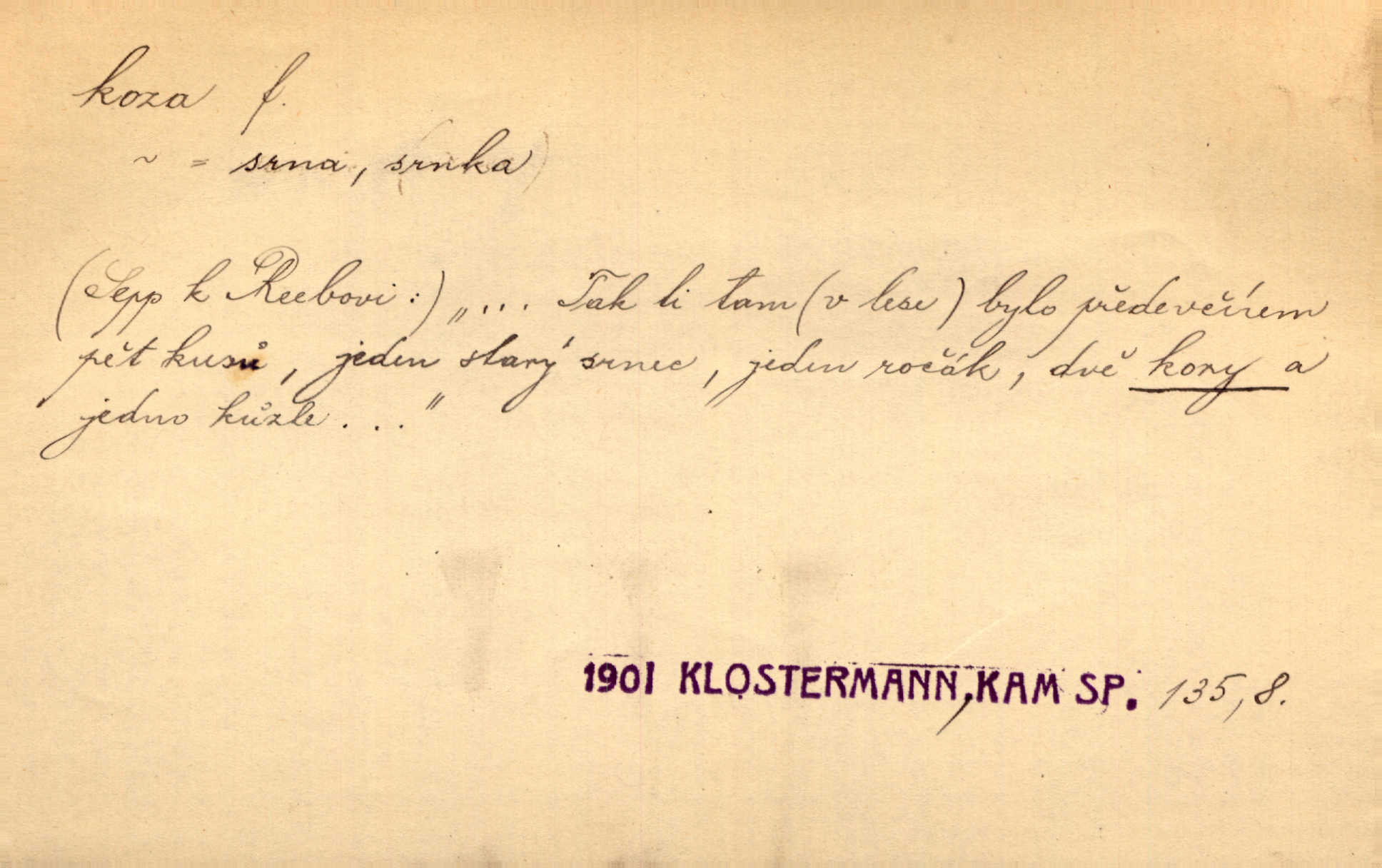 - koza, -y f. po domácku chovaný ssavec přežvýkavý s dutými rohy a vousatou bradou; obyč. samice tohoto ssavce. Měl [kantor] deputát a kravku, kozu, pole. Mach. Držel jsem v chlívě kozu, která mi mléko dávala. Zschokke. Kozy v chlívku mečely. Erb. Přijížděli panoši na vousatých kozách. Lada N. Ustál. sp. Mlsný jako koza. Rozumíte tomu jako koza petrželi. špatně. Kosm. Zanedbával pole i dům — slovem: hospodařil s krávy na kozu pořád hůř. Kosm. Aby se vlk nažral a koza zůstala celá uspokojiti obě strany. Pořek. Zařídí svoje počínání tak opatrně, aby byl vlk syt a koza celá. Herb. Vidí do nich do všech a do celého světa jako do hubené kozy dobře. Knap. Ale zkusím to s ní [řepou] příštím rokem zas, kdyby čert na koze jezdil přese všechny překážky a nezdary. Knap. „Je držgrešle a pro krejcar by na koze jezdil všeho se odvážil. Křel. Starý Pondělek by byl pro groš s kozou v louži tancoval byl lakomý. Šmil. Už jsem natrženej — to to mělnické — půjdu jako koza po ledě! nejistě, škobrtavě. Rais. My o koze, ty o voze každý o něčem jiném. Pořek. V lidové řeči se tomu říká: — Já o koze, on o kose! Čap. Ch. Možná, že ani v Praze nevědí, čím v pátek koza bzdí jsou hloupí. Jah. O tom [člověku] směle říci se může, že mu koza jako ryba nedovede nic rozeznat. Kos. Ale což, ona se stydí jako koza v zelí docela nic se nestydí. Jir. Je jako posedlý, ženich takový, kdyby koze uvázal plínku na hlavu, poběží za ní. Baar. Tváří se jako koza před smrtí velmi utrápeně. Šlej. Mluví jako koza před smrtí hloupě. Pořek. Nechce se jí do toho, jako by kozu na led tlačil! Baar. Ty jseš jenerál s kozy spad’ směšný zbabělec. Jir. Kužela byl dobrý člověk, ale pořád jen jako z kozy duch neduživec. Rais. Příštího jara dali hochovi kozu přestali ho kojit. Jir. D Přezdívky. Fifleno, vychrtlá kozo, hlade. Čap. Komorná, potřeštěná koza, se třásla pod peřinou strachy. K. Čap. Já ti dám Amásii, kozo mlsná! Jir. Před rokem řekla mi, vy stará kozo. Poláč. Živé jiné duše nepřišlo [na ranní mši]. Ani ty známé nebeské kozy pobožnůstkářky. Šlej. Jak se ta malá mašina, jenom taková „koza“, nadýmá. Mart. D Zool. kozy podčeleď ssavců dutorohých, Caprinae. Koza angorská, bezoárová, kašmírská. Mysl. běžné pojmenování samice srnčí zvěře, srna; samice kamzíka, kozorožce. D vousy na bradě upravené do špičky. Starý pán o holi. Mastné šedivé vlasy, knír a kozu. Svob. D Těl. druh tělocvičného nářadí k přeskoku. Mysl. ručnice s brokovými hlavněmi nad sebou. Dial. název při hře. Dva, tři i čtyři [chlapci], kteří se zohnou a drží se jeden druhého pevně, přitlačeni jsouce ke sloupu, slují kozy. Herb. Stav. podstavec z trámů k postavení lešení, k podepření krovu, k ochraně mostních pilířů a p. Ledy jdou, o kozy [mostu] se tříští. Baar. Přistavil jsem nyní k vikýři starou zednickou kozu. Herrm. Vyndal z dřevníku pílu, kozu na řezání. Peč. D druh někdejšího trestního nářadí. Na kozu s ním [kovářem]‚ však on změkne! F. S. Proch. D Vulg. kozy ženské prsy.