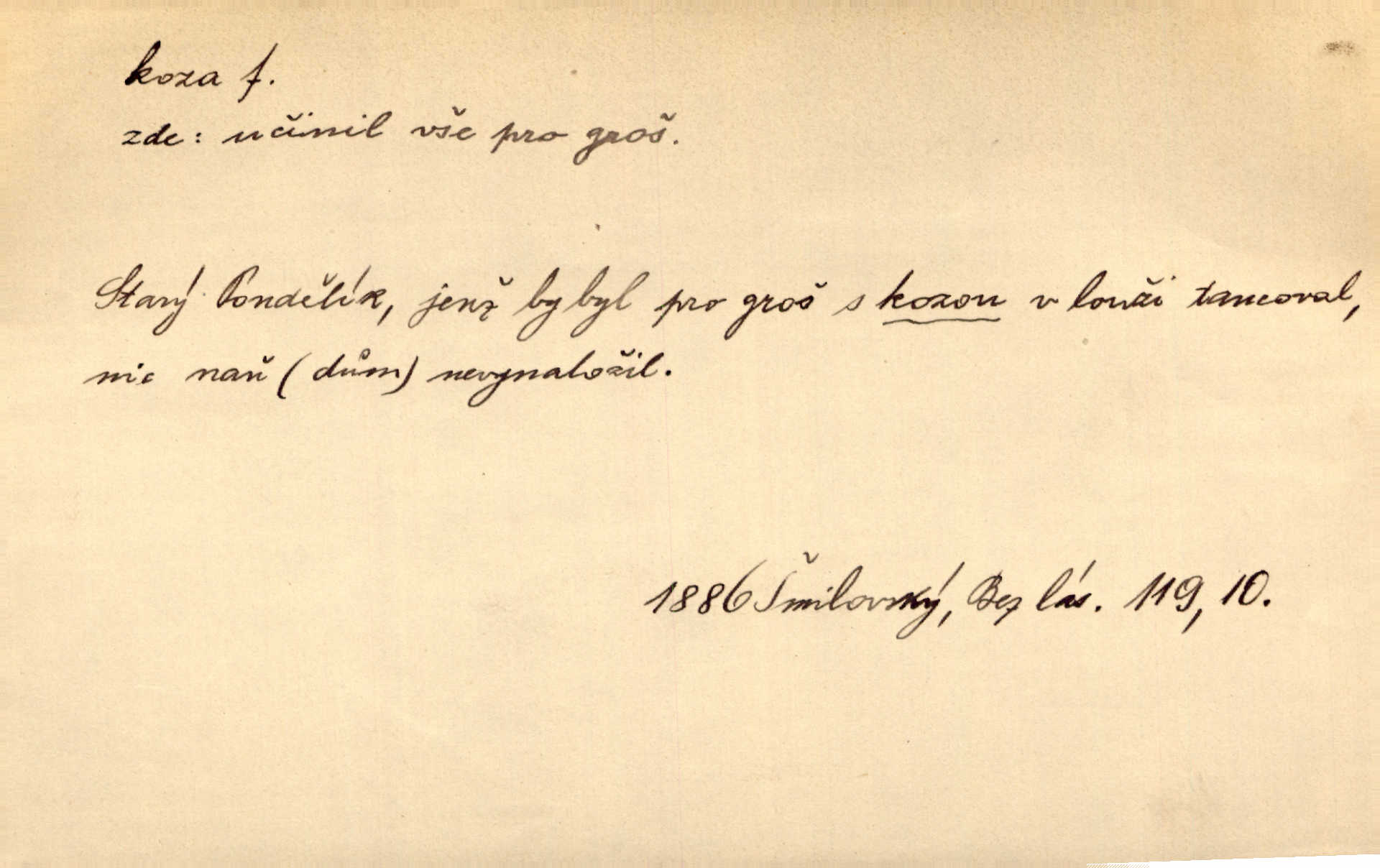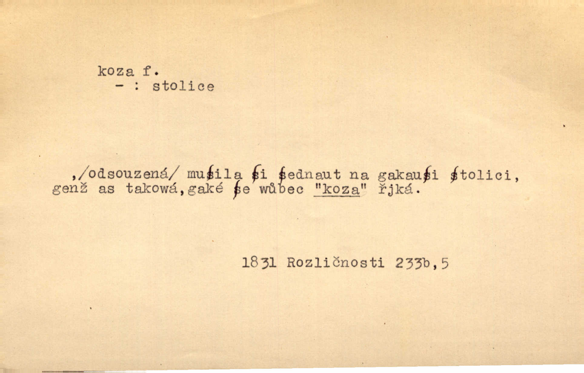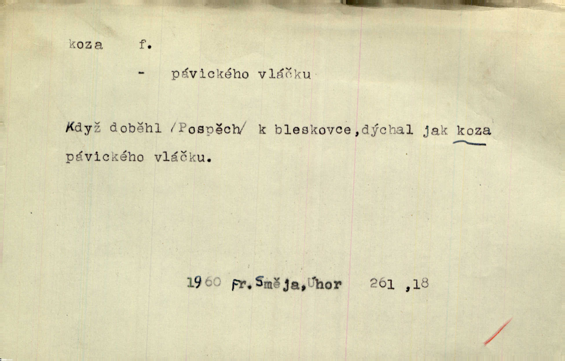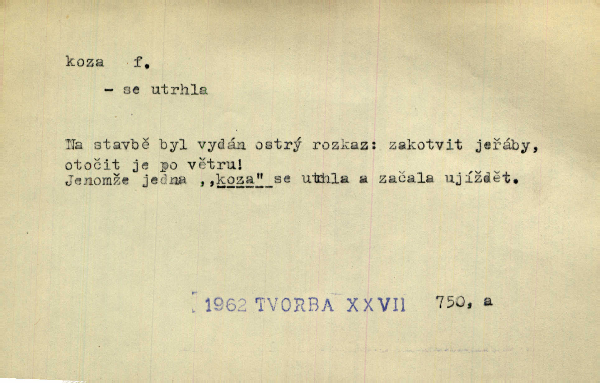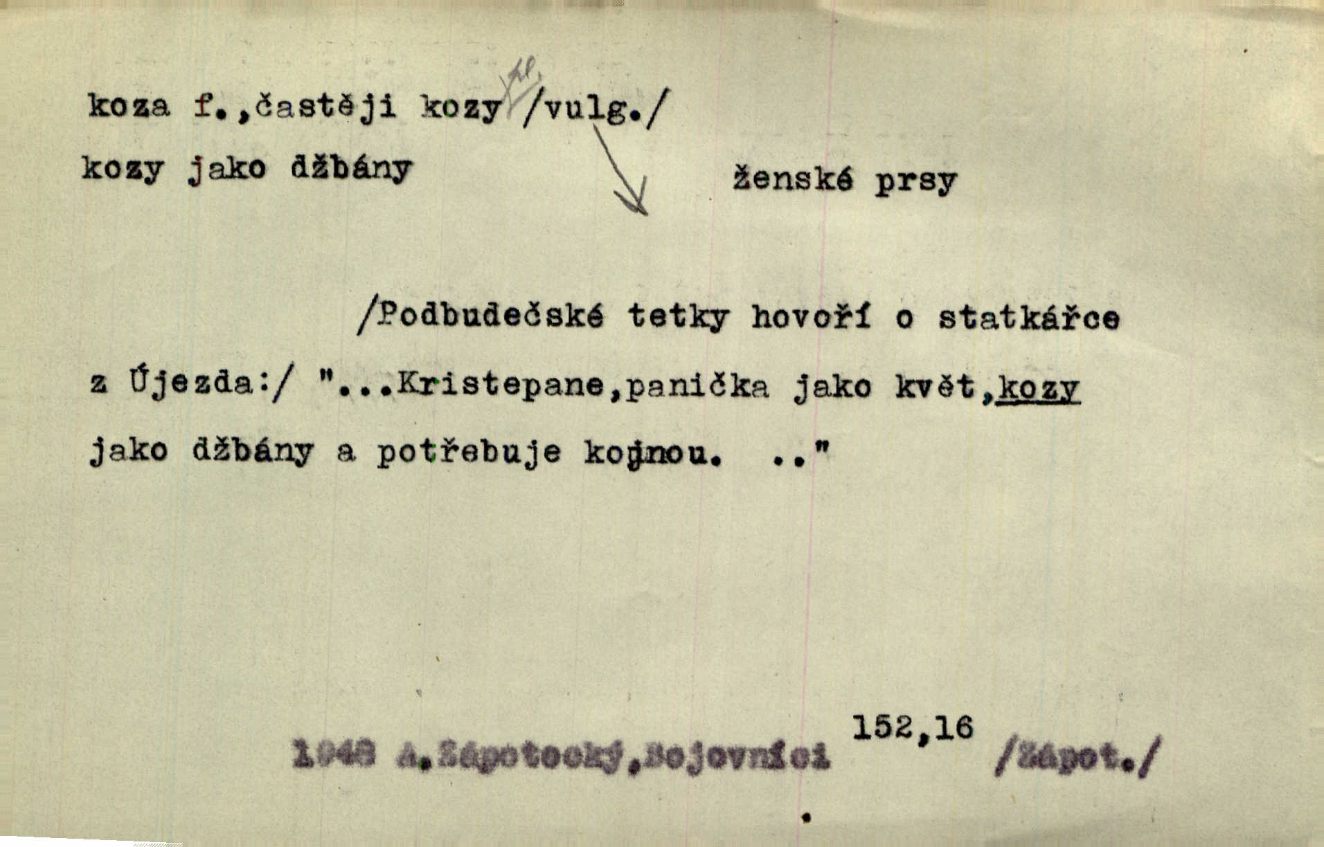 - koza, -y f. po domácku chovaný ssavec přežvýkavý s dutými rohy a vousatou bradou; obyč. samice tohoto ssavce. Měl [kantor] deputát a kravku, kozu, pole. Mach. Držel jsem v chlívě kozu, která mi mléko dávala. Zschokke. Kozy v chlívku mečely. Erb. Přijížděli panoši na vousatých kozách. Lada N. Ustál. sp. Mlsný jako koza. Rozumíte tomu jako koza petrželi. špatně. Kosm. Zanedbával pole i dům — slovem: hospodařil s krávy na kozu pořád hůř. Kosm. Aby se vlk nažral a koza zůstala celá uspokojiti obě strany. Pořek. Zařídí svoje počínání tak opatrně, aby byl vlk syt a koza celá. Herb. Vidí do nich do všech a do celého světa jako do hubené kozy dobře. Knap. Ale zkusím to s ní [řepou] příštím rokem zas, kdyby čert na koze jezdil přese všechny překážky a nezdary. Knap. „Je držgrešle a pro krejcar by na koze jezdil všeho se odvážil. Křel. Starý Pondělek by byl pro groš s kozou v louži tancoval byl lakomý. Šmil. Už jsem natrženej — to to mělnické — půjdu jako koza po ledě! nejistě, škobrtavě. Rais. My o koze, ty o voze každý o něčem jiném. Pořek. V lidové řeči se tomu říká: — Já o koze, on o kose! Čap. Ch. Možná, že ani v Praze nevědí, čím v pátek koza bzdí jsou hloupí. Jah. O tom [člověku] směle říci se může, že mu koza jako ryba nedovede nic rozeznat. Kos. Ale což, ona se stydí jako koza v zelí docela nic se nestydí. Jir. Je jako posedlý, ženich takový, kdyby koze uvázal plínku na hlavu, poběží za ní. Baar. Tváří se jako koza před smrtí velmi utrápeně. Šlej. Mluví jako koza před smrtí hloupě. Pořek. Nechce se jí do toho, jako by kozu na led tlačil! Baar. Ty jseš jenerál s kozy spad’ směšný zbabělec. Jir. Kužela byl dobrý člověk, ale pořád jen jako z kozy duch neduživec. Rais. Příštího jara dali hochovi kozu přestali ho kojit. Jir. D Přezdívky. Fifleno, vychrtlá kozo, hlade. Čap. Komorná, potřeštěná koza, se třásla pod peřinou strachy. K. Čap. Já ti dám Amásii, kozo mlsná! Jir. Před rokem řekla mi, vy stará kozo. Poláč. Živé jiné duše nepřišlo [na ranní mši]. Ani ty známé nebeské kozy pobožnůstkářky. Šlej. Jak se ta malá mašina, jenom taková „koza“, nadýmá. Mart. D Zool. kozy podčeleď ssavců dutorohých, Caprinae. Koza angorská, bezoárová, kašmírská. Mysl. běžné pojmenování samice srnčí zvěře, srna; samice kamzíka, kozorožce. D vousy na bradě upravené do špičky. Starý pán o holi. Mastné šedivé vlasy, knír a kozu. Svob. D Těl. druh tělocvičného nářadí k přeskoku. Mysl. ručnice s brokovými hlavněmi nad sebou. Dial. název při hře. Dva, tři i čtyři [chlapci], kteří se zohnou a drží se jeden druhého pevně, přitlačeni jsouce ke sloupu, slují kozy. Herb. Stav. podstavec z trámů k postavení lešení, k podepření krovu, k ochraně mostních pilířů a p. Ledy jdou, o kozy [mostu] se tříští. Baar. Přistavil jsem nyní k vikýři starou zednickou kozu. Herrm. Vyndal z dřevníku pílu, kozu na řezání. Peč. D druh někdejšího trestního nářadí. Na kozu s ním [kovářem]‚ však on změkne! F. S. Proch. D Vulg. kozy ženské prsy.