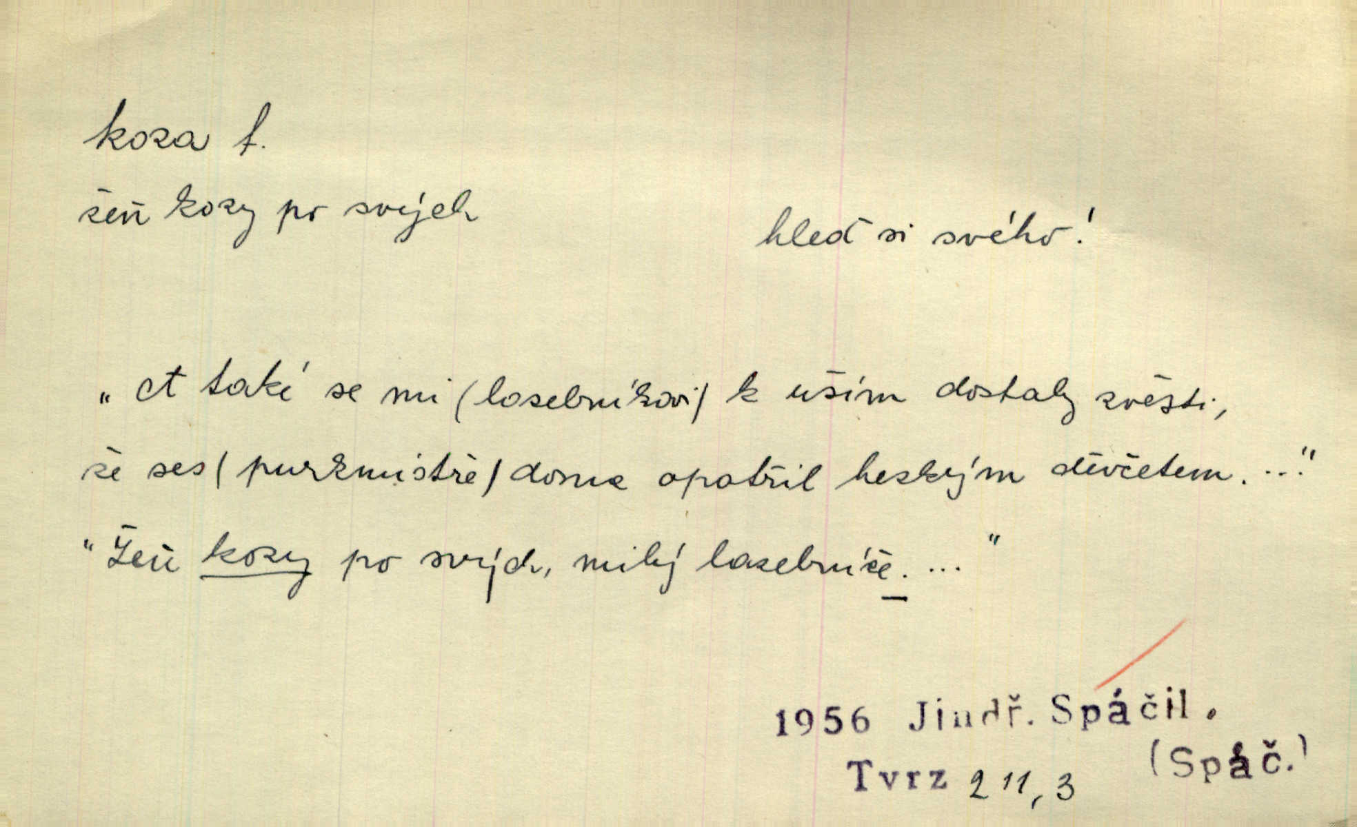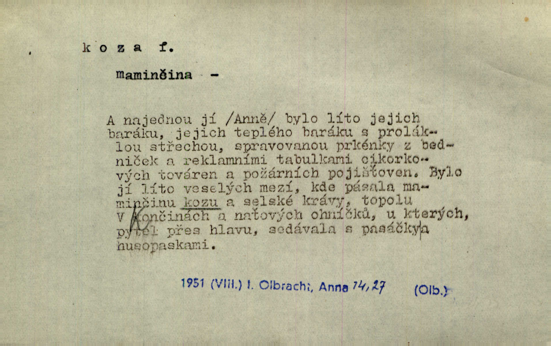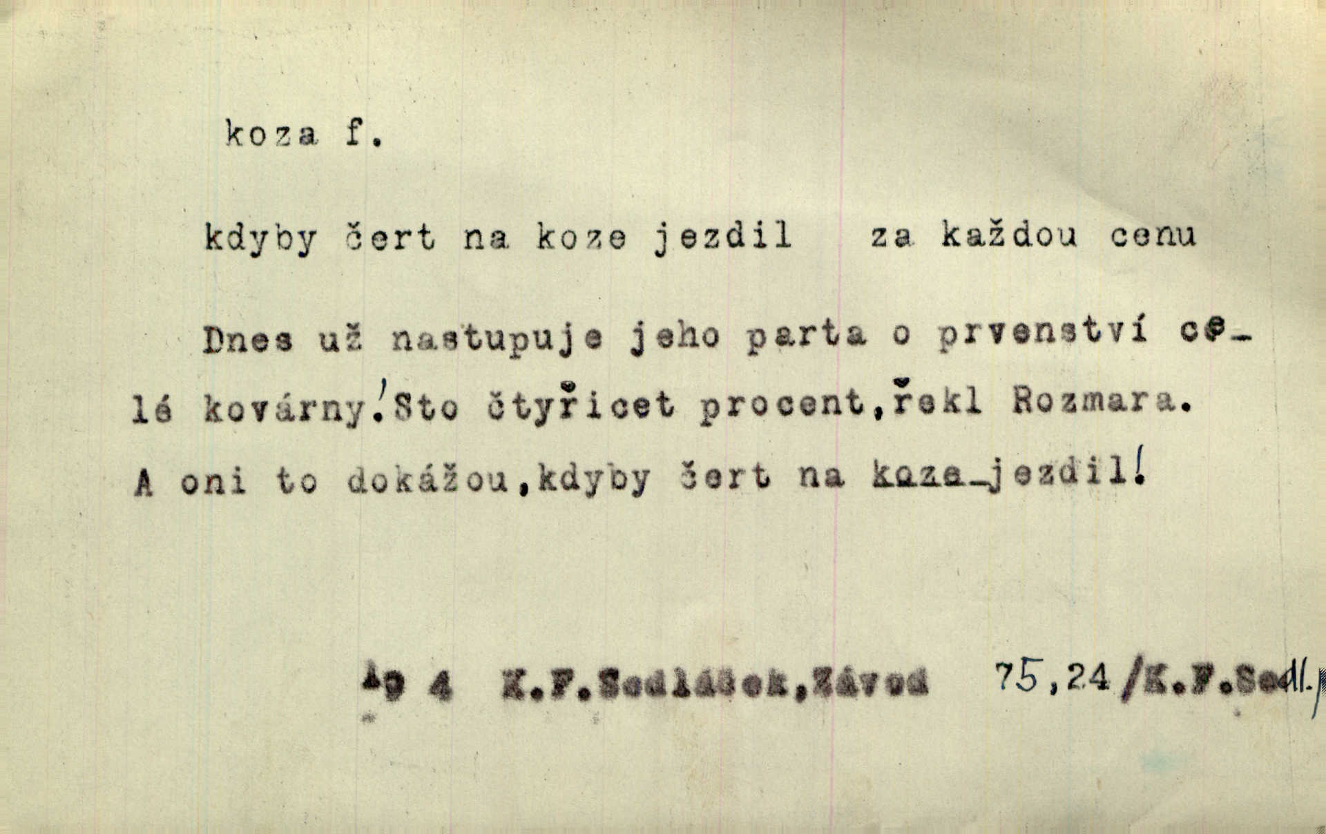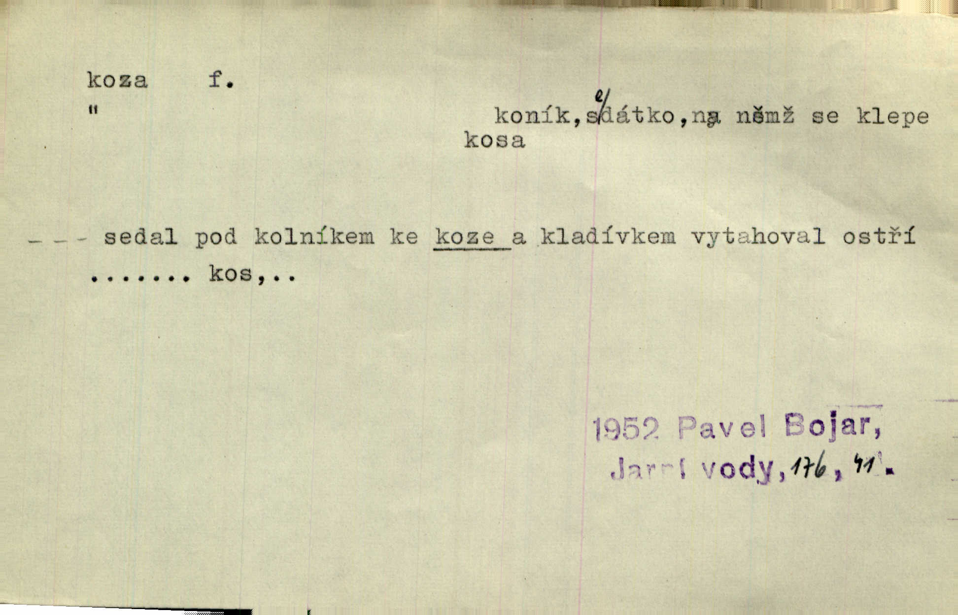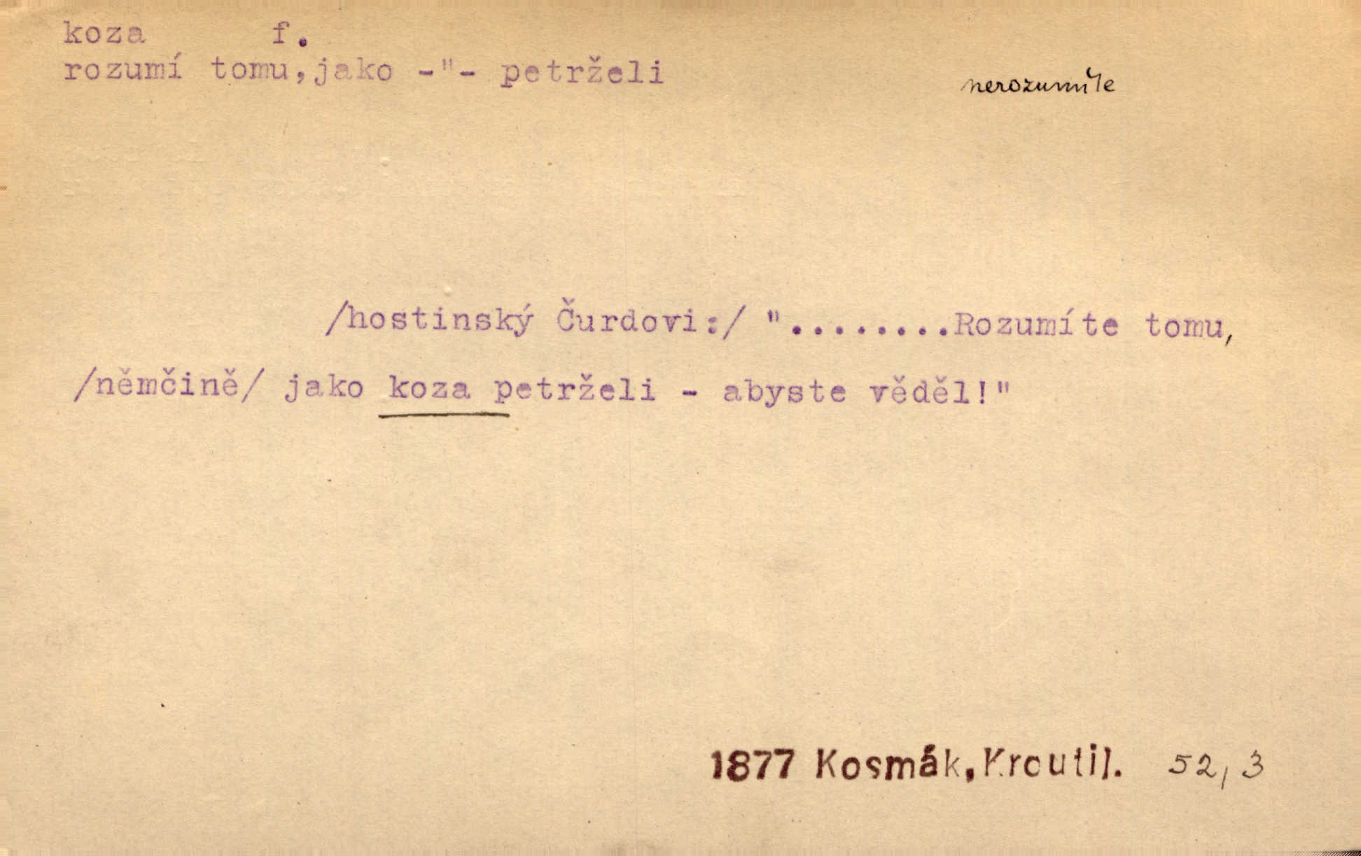 - koza, -y f. po domácku chovaný ssavec přežvýkavý s dutými rohy a vousatou bradou; obyč. samice tohoto ssavce. Měl [kantor] deputát a kravku, kozu, pole. Mach. Držel jsem v chlívě kozu, která mi mléko dávala. Zschokke. Kozy v chlívku mečely. Erb. Přijížděli panoši na vousatých kozách. Lada N. Ustál. sp. Mlsný jako koza. Rozumíte tomu jako koza petrželi. špatně. Kosm. Zanedbával pole i dům — slovem: hospodařil s krávy na kozu pořád hůř. Kosm. Aby se vlk nažral a koza zůstala celá uspokojiti obě strany. Pořek. Zařídí svoje počínání tak opatrně, aby byl vlk syt a koza celá. Herb. Vidí do nich do všech a do celého světa jako do hubené kozy dobře. Knap. Ale zkusím to s ní [řepou] příštím rokem zas, kdyby čert na koze jezdil přese všechny překážky a nezdary. Knap. „Je držgrešle a pro krejcar by na koze jezdil všeho se odvážil. Křel. Starý Pondělek by byl pro groš s kozou v louži tancoval byl lakomý. Šmil. Už jsem natrženej — to to mělnické — půjdu jako koza po ledě! nejistě, škobrtavě. Rais. My o koze, ty o voze každý o něčem jiném. Pořek. V lidové řeči se tomu říká: — Já o koze, on o kose! Čap. Ch. Možná, že ani v Praze nevědí, čím v pátek koza bzdí jsou hloupí. Jah. O tom [člověku] směle říci se může, že mu koza jako ryba nedovede nic rozeznat. Kos. Ale což, ona se stydí jako koza v zelí docela nic se nestydí. Jir. Je jako posedlý, ženich takový, kdyby koze uvázal plínku na hlavu, poběží za ní. Baar. Tváří se jako koza před smrtí velmi utrápeně. Šlej. Mluví jako koza před smrtí hloupě. Pořek. Nechce se jí do toho, jako by kozu na led tlačil! Baar. Ty jseš jenerál s kozy spad’ směšný zbabělec. Jir. Kužela byl dobrý člověk, ale pořád jen jako z kozy duch neduživec. Rais. Příštího jara dali hochovi kozu přestali ho kojit. Jir. D Přezdívky. Fifleno, vychrtlá kozo, hlade. Čap. Komorná, potřeštěná koza, se třásla pod peřinou strachy. K. Čap. Já ti dám Amásii, kozo mlsná! Jir. Před rokem řekla mi, vy stará kozo. Poláč. Živé jiné duše nepřišlo [na ranní mši]. Ani ty známé nebeské kozy pobožnůstkářky. Šlej. Jak se ta malá mašina, jenom taková „koza“, nadýmá. Mart. D Zool. kozy podčeleď ssavců dutorohých, Caprinae. Koza angorská, bezoárová, kašmírská. Mysl. běžné pojmenování samice srnčí zvěře, srna; samice kamzíka, kozorožce. D vousy na bradě upravené do špičky. Starý pán o holi. Mastné šedivé vlasy, knír a kozu. Svob. D Těl. druh tělocvičného nářadí k přeskoku. Mysl. ručnice s brokovými hlavněmi nad sebou. Dial. název při hře. Dva, tři i čtyři [chlapci], kteří se zohnou a drží se jeden druhého pevně, přitlačeni jsouce ke sloupu, slují kozy. Herb. Stav. podstavec z trámů k postavení lešení, k podepření krovu, k ochraně mostních pilířů a p. Ledy jdou, o kozy [mostu] se tříští. Baar. Přistavil jsem nyní k vikýři starou zednickou kozu. Herrm. Vyndal z dřevníku pílu, kozu na řezání. Peč. D druh někdejšího trestního nářadí. Na kozu s ním [kovářem]‚ však on změkne! F. S. Proch. D Vulg. kozy ženské prsy.