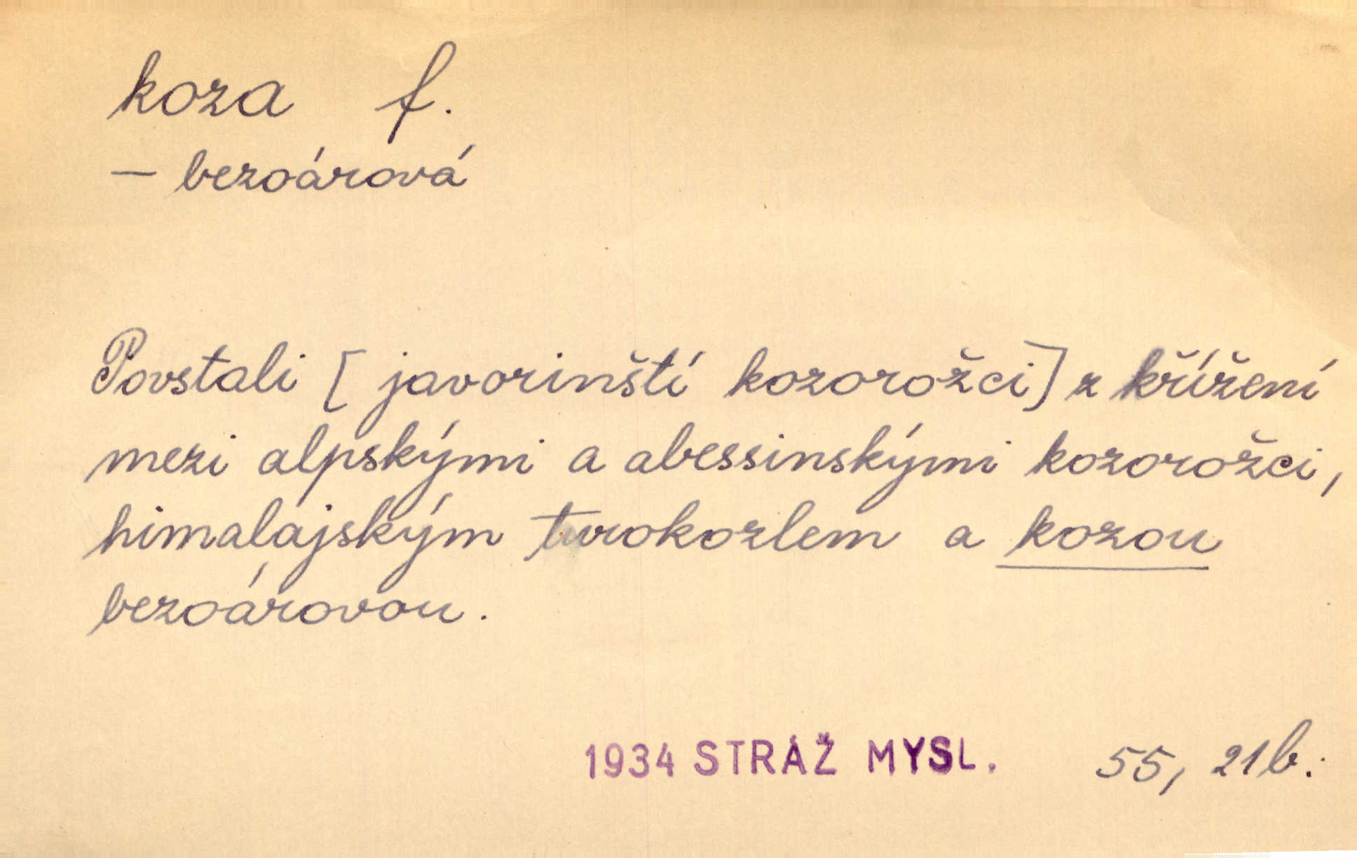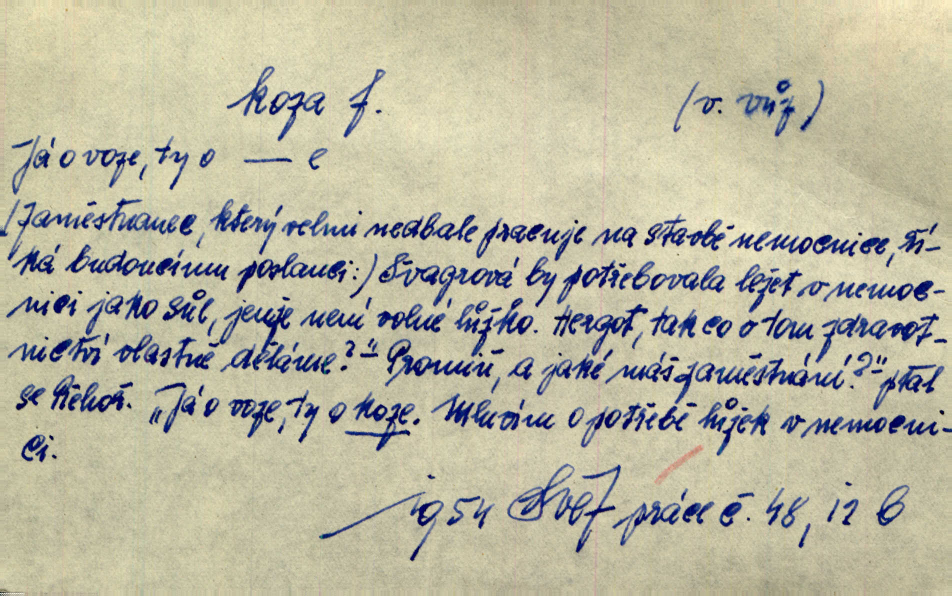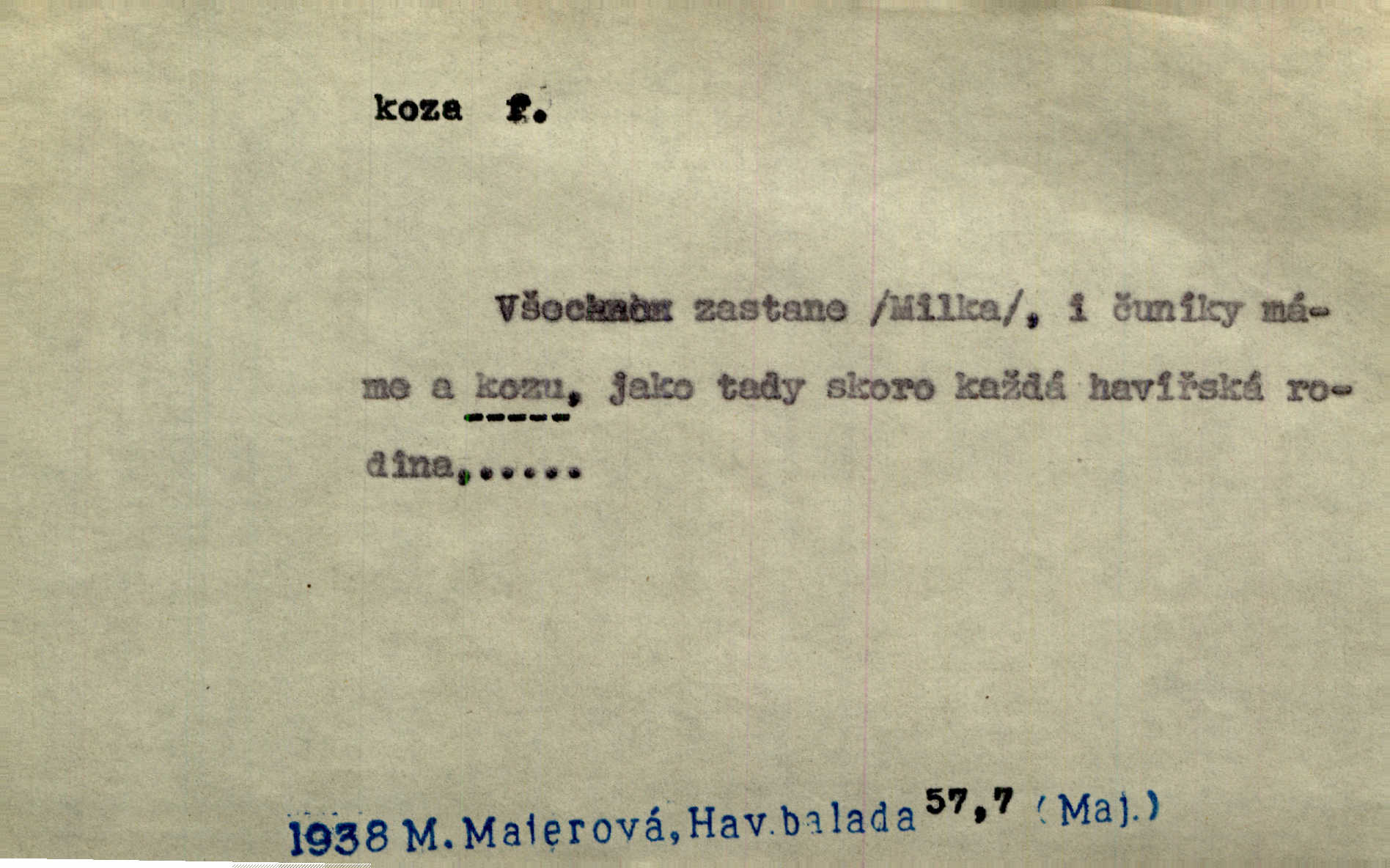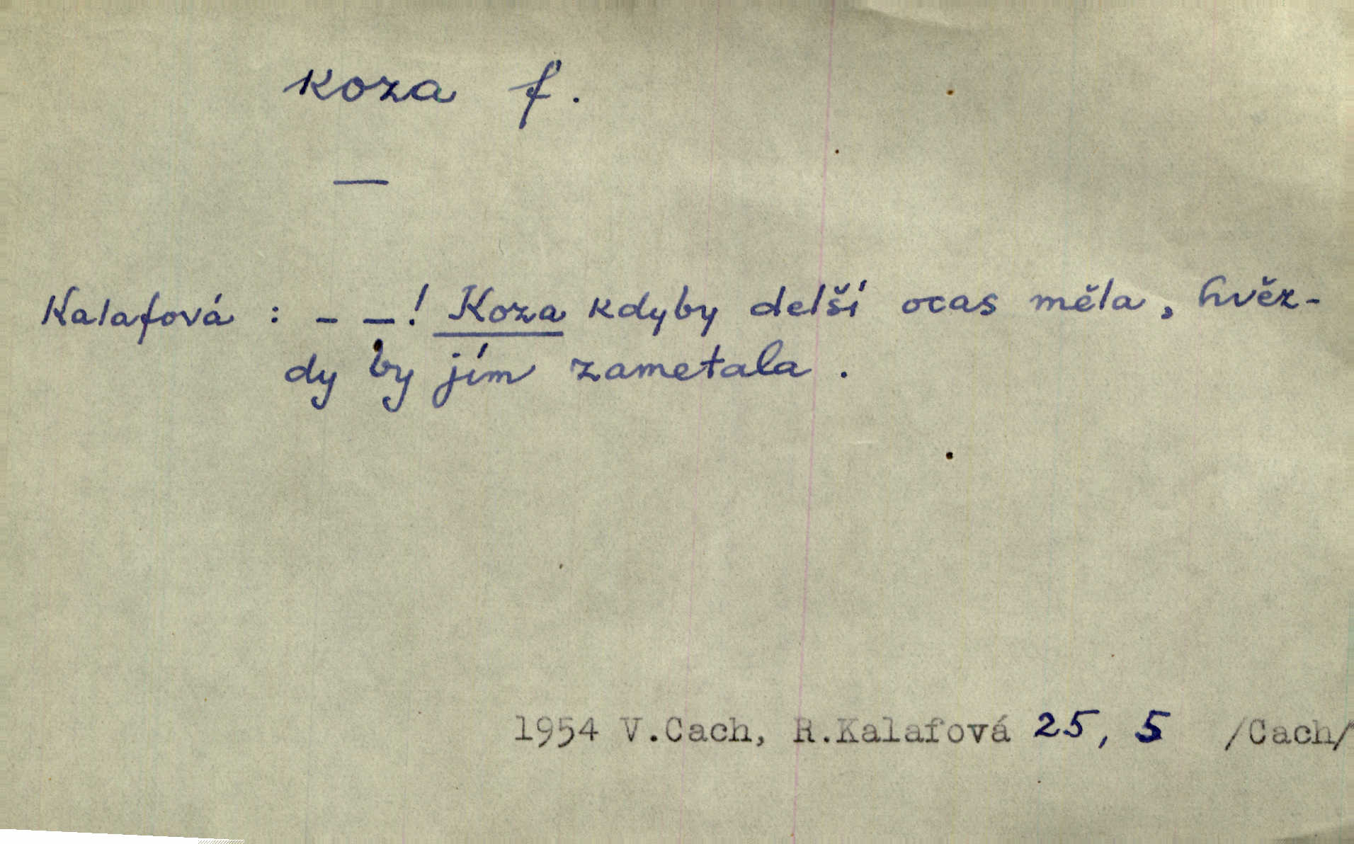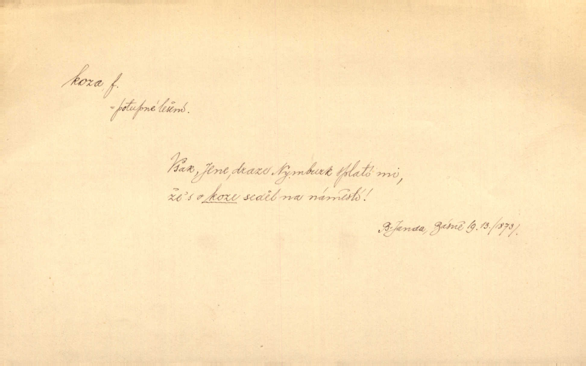 - koza, -y f. po domácku chovaný ssavec přežvýkavý s dutými rohy a vousatou bradou; obyč. samice tohoto ssavce. Měl [kantor] deputát a kravku, kozu, pole. Mach. Držel jsem v chlívě kozu, která mi mléko dávala. Zschokke. Kozy v chlívku mečely. Erb. Přijížděli panoši na vousatých kozách. Lada N. Ustál. sp. Mlsný jako koza. Rozumíte tomu jako koza petrželi. špatně. Kosm. Zanedbával pole i dům — slovem: hospodařil s krávy na kozu pořád hůř. Kosm. Aby se vlk nažral a koza zůstala celá uspokojiti obě strany. Pořek. Zařídí svoje počínání tak opatrně, aby byl vlk syt a koza celá. Herb. Vidí do nich do všech a do celého světa jako do hubené kozy dobře. Knap. Ale zkusím to s ní [řepou] příštím rokem zas, kdyby čert na koze jezdil přese všechny překážky a nezdary. Knap. „Je držgrešle a pro krejcar by na koze jezdil všeho se odvážil. Křel. Starý Pondělek by byl pro groš s kozou v louži tancoval byl lakomý. Šmil. Už jsem natrženej — to to mělnické — půjdu jako koza po ledě! nejistě, škobrtavě. Rais. My o koze, ty o voze každý o něčem jiném. Pořek. V lidové řeči se tomu říká: — Já o koze, on o kose! Čap. Ch. Možná, že ani v Praze nevědí, čím v pátek koza bzdí jsou hloupí. Jah. O tom [člověku] směle říci se může, že mu koza jako ryba nedovede nic rozeznat. Kos. Ale což, ona se stydí jako koza v zelí docela nic se nestydí. Jir. Je jako posedlý, ženich takový, kdyby koze uvázal plínku na hlavu, poběží za ní. Baar. Tváří se jako koza před smrtí velmi utrápeně. Šlej. Mluví jako koza před smrtí hloupě. Pořek. Nechce se jí do toho, jako by kozu na led tlačil! Baar. Ty jseš jenerál s kozy spad’ směšný zbabělec. Jir. Kužela byl dobrý člověk, ale pořád jen jako z kozy duch neduživec. Rais. Příštího jara dali hochovi kozu přestali ho kojit. Jir. D Přezdívky. Fifleno, vychrtlá kozo, hlade. Čap. Komorná, potřeštěná koza, se třásla pod peřinou strachy. K. Čap. Já ti dám Amásii, kozo mlsná! Jir. Před rokem řekla mi, vy stará kozo. Poláč. Živé jiné duše nepřišlo [na ranní mši]. Ani ty známé nebeské kozy pobožnůstkářky. Šlej. Jak se ta malá mašina, jenom taková „koza“, nadýmá. Mart. D Zool. kozy podčeleď ssavců dutorohých, Caprinae. Koza angorská, bezoárová, kašmírská. Mysl. běžné pojmenování samice srnčí zvěře, srna; samice kamzíka, kozorožce. D vousy na bradě upravené do špičky. Starý pán o holi. Mastné šedivé vlasy, knír a kozu. Svob. D Těl. druh tělocvičného nářadí k přeskoku. Mysl. ručnice s brokovými hlavněmi nad sebou. Dial. název při hře. Dva, tři i čtyři [chlapci], kteří se zohnou a drží se jeden druhého pevně, přitlačeni jsouce ke sloupu, slují kozy. Herb. Stav. podstavec z trámů k postavení lešení, k podepření krovu, k ochraně mostních pilířů a p. Ledy jdou, o kozy [mostu] se tříští. Baar. Přistavil jsem nyní k vikýři starou zednickou kozu. Herrm. Vyndal z dřevníku pílu, kozu na řezání. Peč. D druh někdejšího trestního nářadí. Na kozu s ním [kovářem]‚ však on změkne! F. S. Proch. D Vulg. kozy ženské prsy.