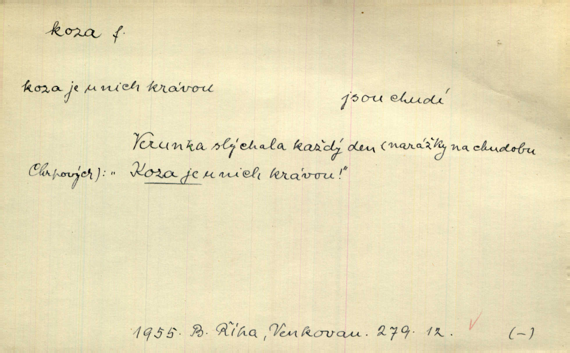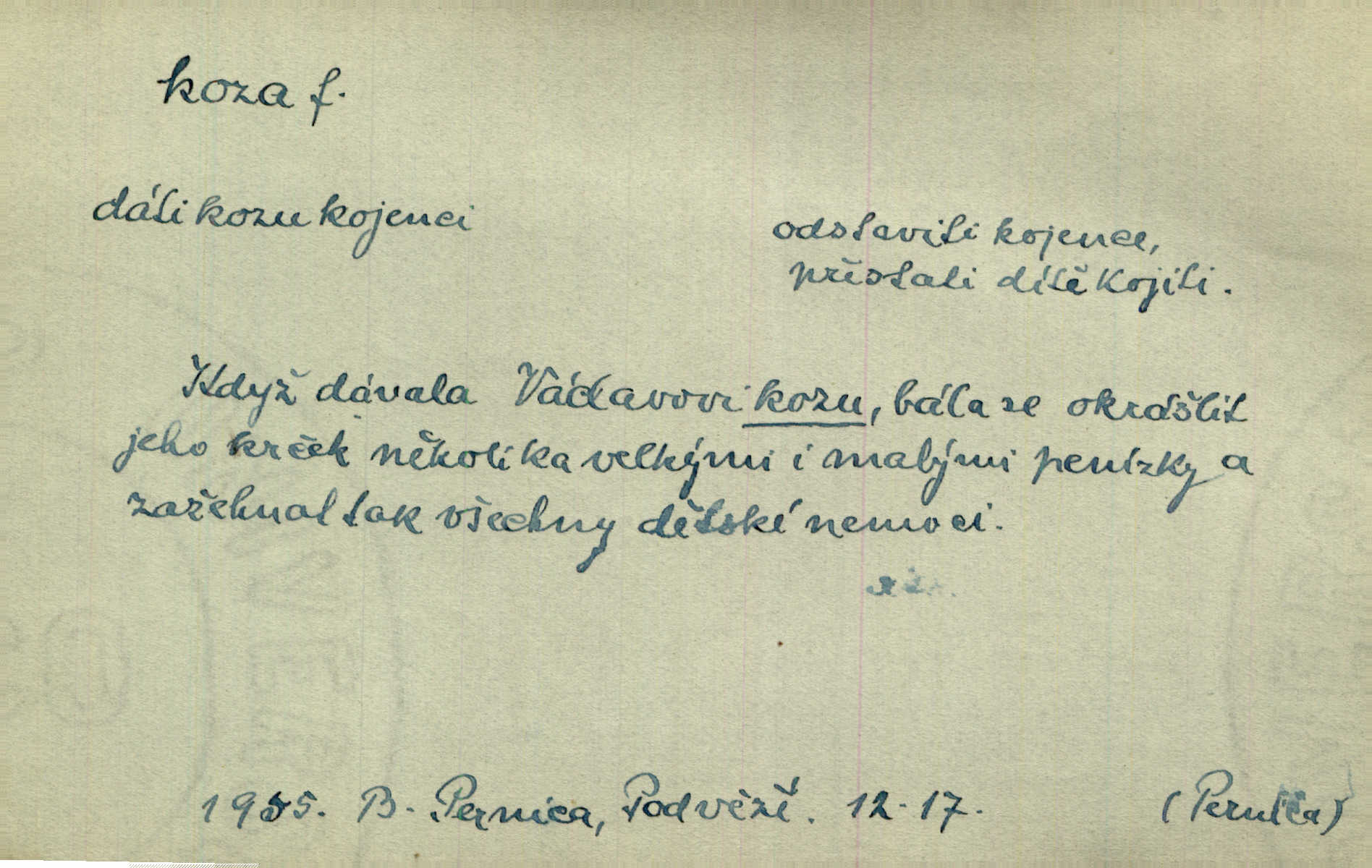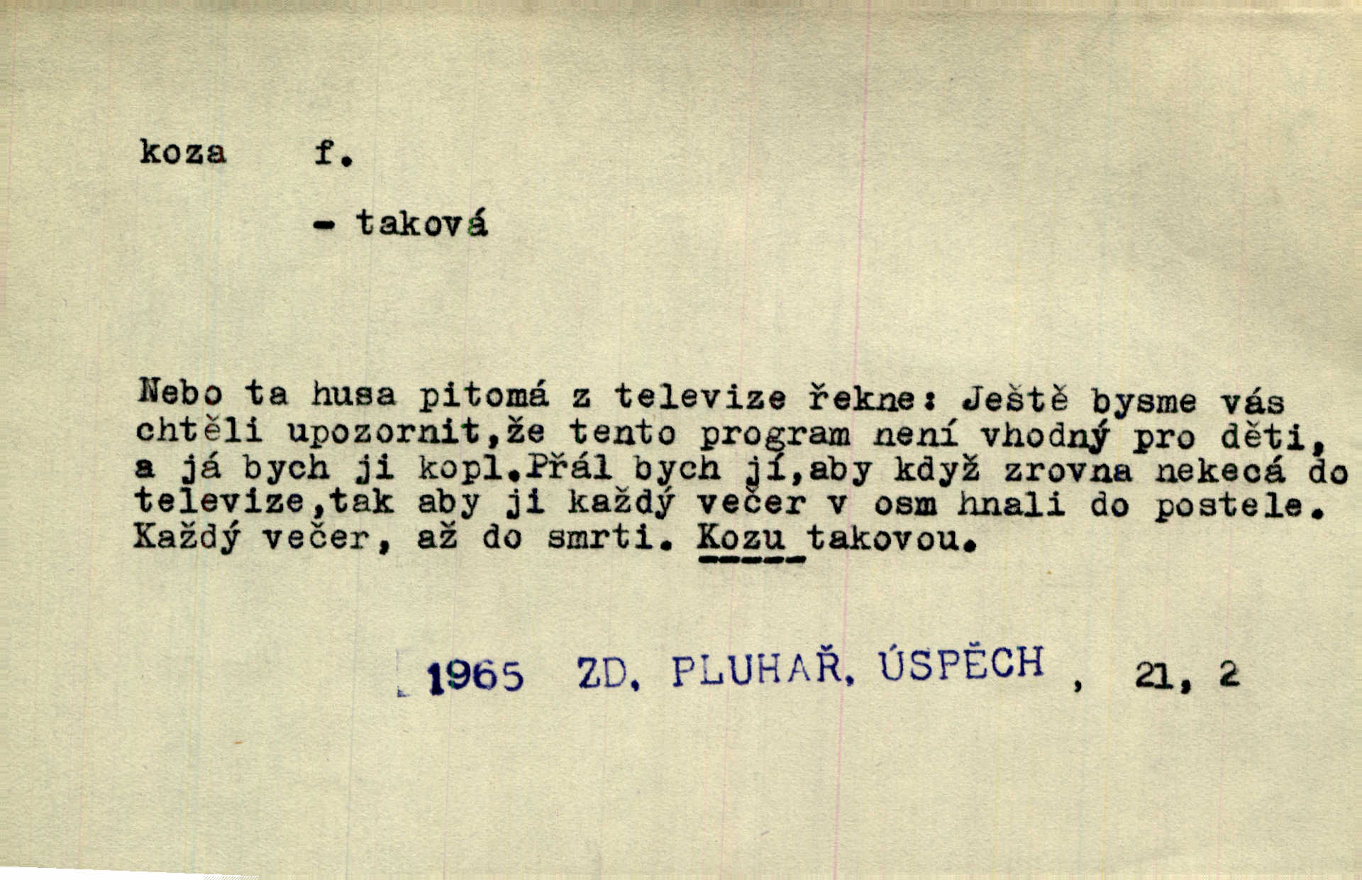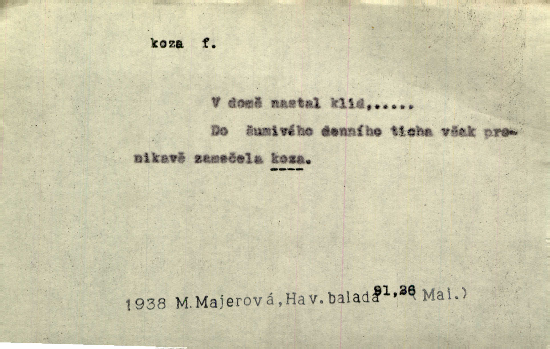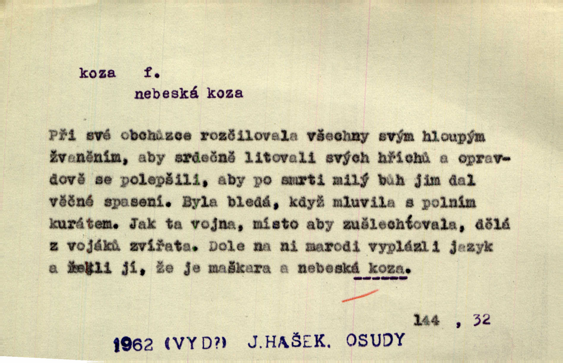 - koza, -y f. po domácku chovaný ssavec přežvýkavý s dutými rohy a vousatou bradou; obyč. samice tohoto ssavce. Měl [kantor] deputát a kravku, kozu, pole. Mach. Držel jsem v chlívě kozu, která mi mléko dávala. Zschokke. Kozy v chlívku mečely. Erb. Přijížděli panoši na vousatých kozách. Lada N. Ustál. sp. Mlsný jako koza. Rozumíte tomu jako koza petrželi. špatně. Kosm. Zanedbával pole i dům — slovem: hospodařil s krávy na kozu pořád hůř. Kosm. Aby se vlk nažral a koza zůstala celá uspokojiti obě strany. Pořek. Zařídí svoje počínání tak opatrně, aby byl vlk syt a koza celá. Herb. Vidí do nich do všech a do celého světa jako do hubené kozy dobře. Knap. Ale zkusím to s ní [řepou] příštím rokem zas, kdyby čert na koze jezdil přese všechny překážky a nezdary. Knap. „Je držgrešle a pro krejcar by na koze jezdil všeho se odvážil. Křel. Starý Pondělek by byl pro groš s kozou v louži tancoval byl lakomý. Šmil. Už jsem natrženej — to to mělnické — půjdu jako koza po ledě! nejistě, škobrtavě. Rais. My o koze, ty o voze každý o něčem jiném. Pořek. V lidové řeči se tomu říká: — Já o koze, on o kose! Čap. Ch. Možná, že ani v Praze nevědí, čím v pátek koza bzdí jsou hloupí. Jah. O tom [člověku] směle říci se může, že mu koza jako ryba nedovede nic rozeznat. Kos. Ale což, ona se stydí jako koza v zelí docela nic se nestydí. Jir. Je jako posedlý, ženich takový, kdyby koze uvázal plínku na hlavu, poběží za ní. Baar. Tváří se jako koza před smrtí velmi utrápeně. Šlej. Mluví jako koza před smrtí hloupě. Pořek. Nechce se jí do toho, jako by kozu na led tlačil! Baar. Ty jseš jenerál s kozy spad’ směšný zbabělec. Jir. Kužela byl dobrý člověk, ale pořád jen jako z kozy duch neduživec. Rais. Příštího jara dali hochovi kozu přestali ho kojit. Jir. D Přezdívky. Fifleno, vychrtlá kozo, hlade. Čap. Komorná, potřeštěná koza, se třásla pod peřinou strachy. K. Čap. Já ti dám Amásii, kozo mlsná! Jir. Před rokem řekla mi, vy stará kozo. Poláč. Živé jiné duše nepřišlo [na ranní mši]. Ani ty známé nebeské kozy pobožnůstkářky. Šlej. Jak se ta malá mašina, jenom taková „koza“, nadýmá. Mart. D Zool. kozy podčeleď ssavců dutorohých, Caprinae. Koza angorská, bezoárová, kašmírská. Mysl. běžné pojmenování samice srnčí zvěře, srna; samice kamzíka, kozorožce. D vousy na bradě upravené do špičky. Starý pán o holi. Mastné šedivé vlasy, knír a kozu. Svob. D Těl. druh tělocvičného nářadí k přeskoku. Mysl. ručnice s brokovými hlavněmi nad sebou. Dial. název při hře. Dva, tři i čtyři [chlapci], kteří se zohnou a drží se jeden druhého pevně, přitlačeni jsouce ke sloupu, slují kozy. Herb. Stav. podstavec z trámů k postavení lešení, k podepření krovu, k ochraně mostních pilířů a p. Ledy jdou, o kozy [mostu] se tříští. Baar. Přistavil jsem nyní k vikýři starou zednickou kozu. Herrm. Vyndal z dřevníku pílu, kozu na řezání. Peč. D druh někdejšího trestního nářadí. Na kozu s ním [kovářem]‚ však on změkne! F. S. Proch. D Vulg. kozy ženské prsy.