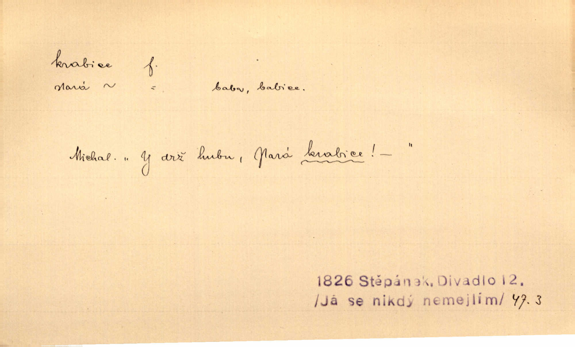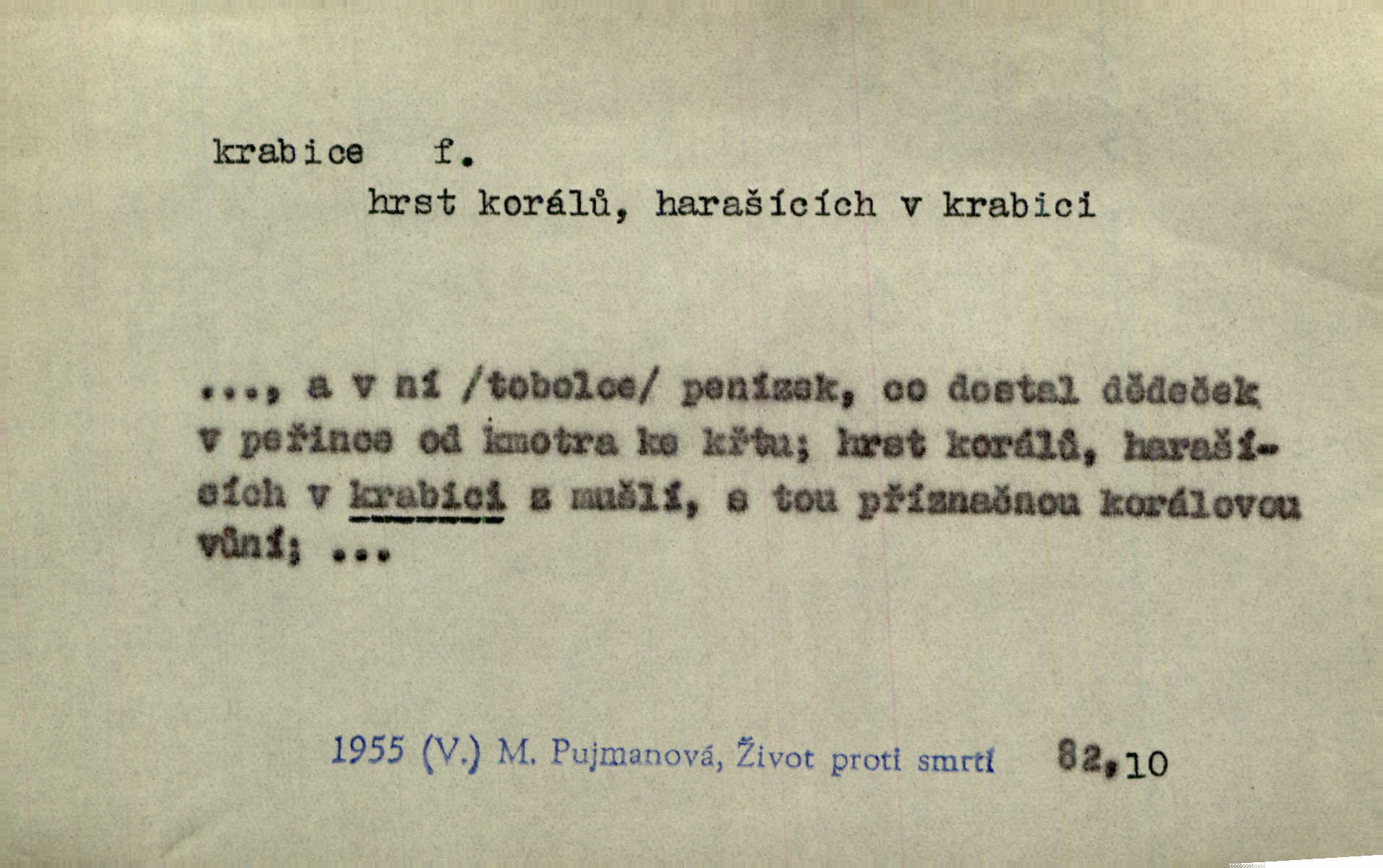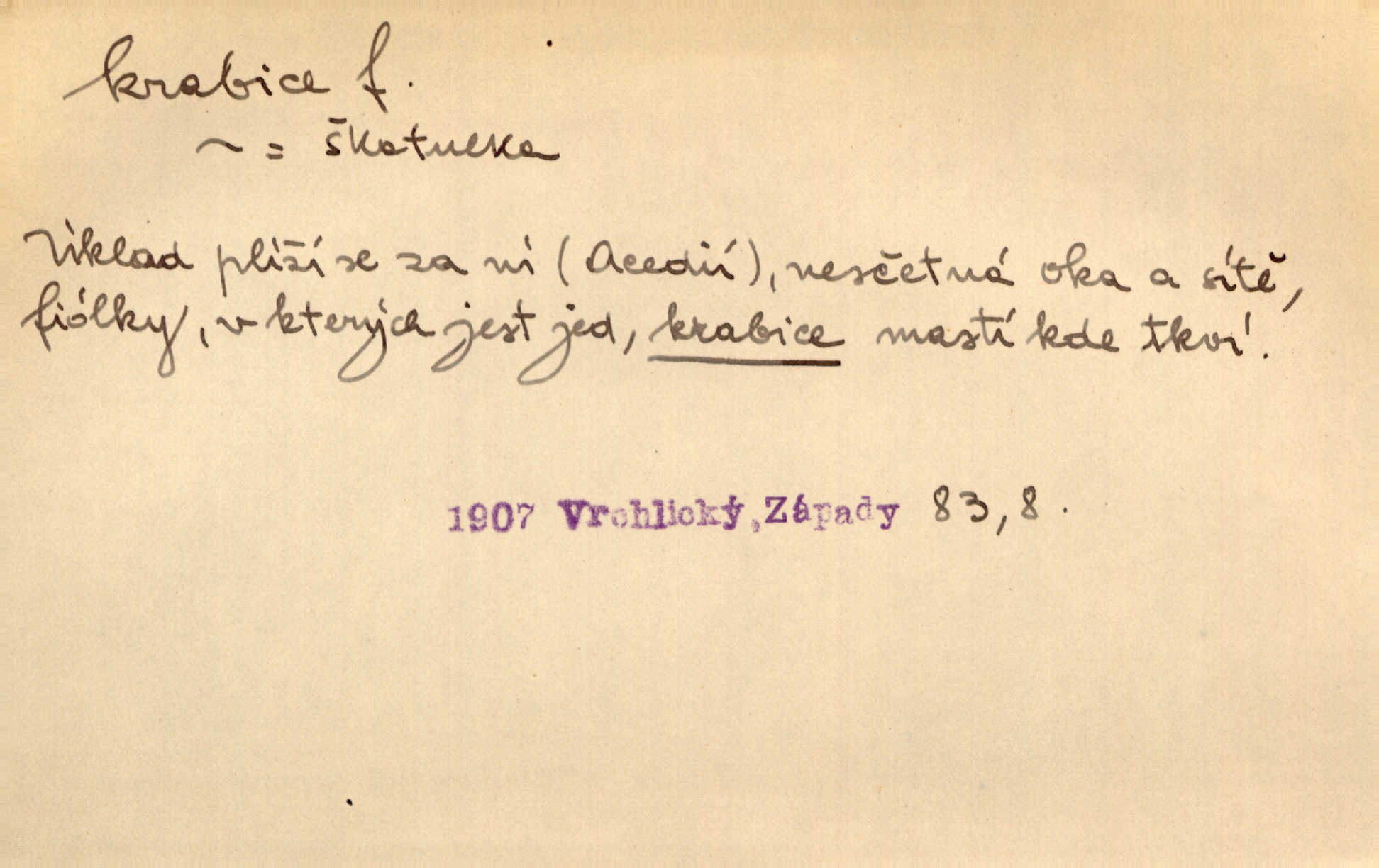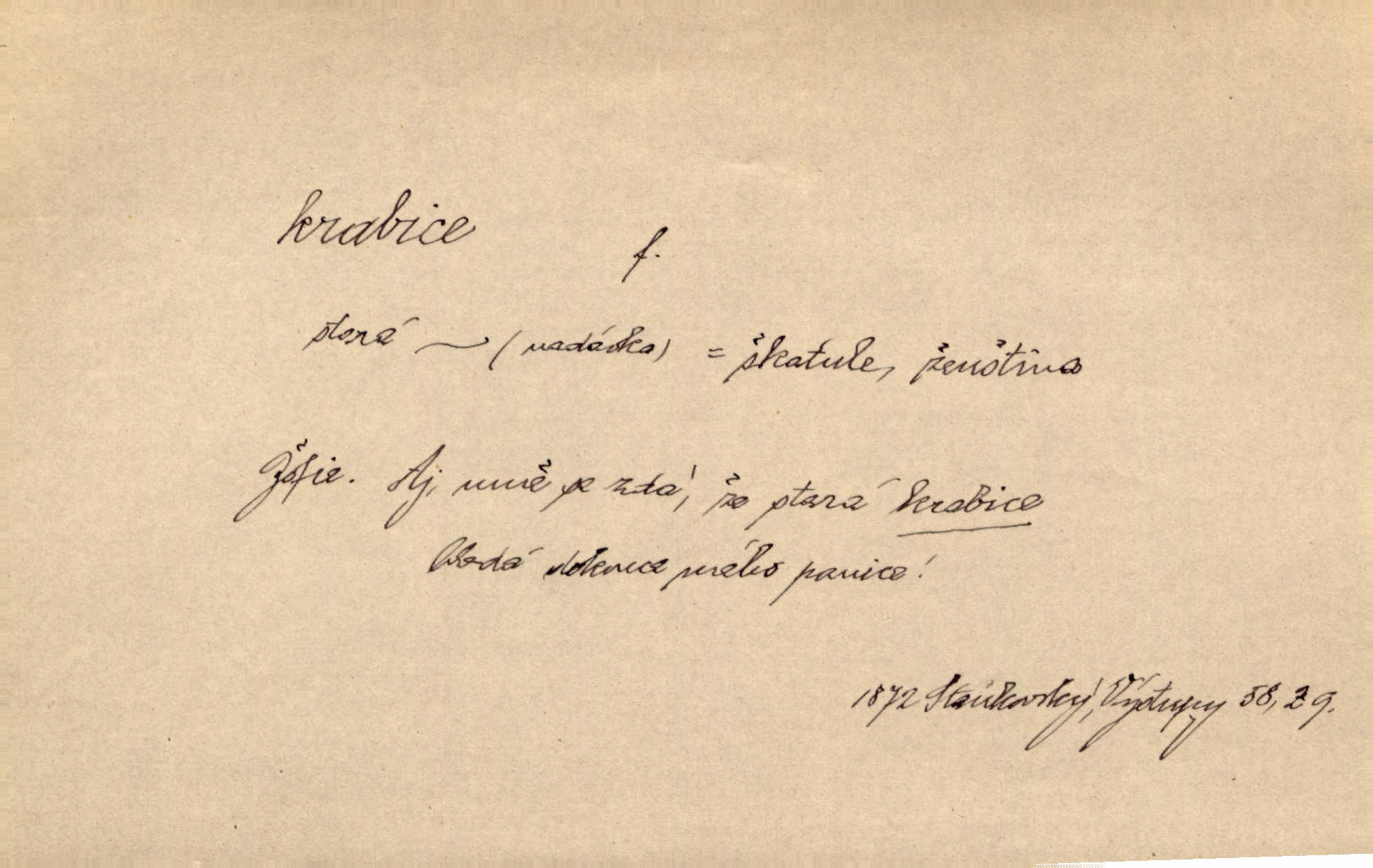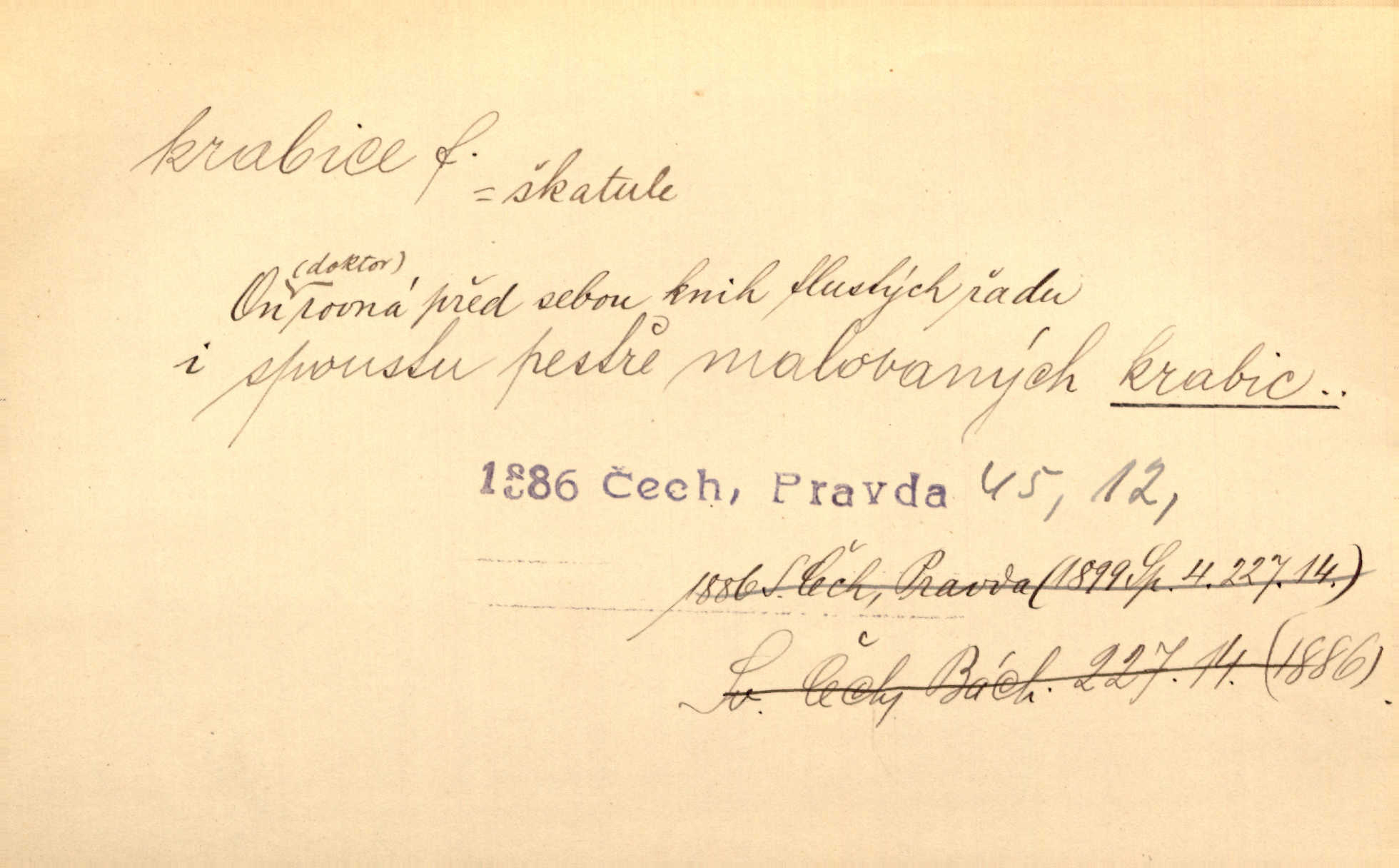 - krabice, -e f. škatule, schránka, skřínka. Hledá, otvírá šuple po šupleti, prohlíží schránky, krabice a skříně. Prav. Píchal [akcizák] do krabic s dorty. Vach. Přibral krabici olejových sardinek. Herrm. Vytáhla ze skříně krabici hedvábí. Ner. Krabice na klobouky. El. tech. odbočná krabice kruhová n. čtvercová skřínka s víkem, v níž se dráty spojují n. odbočují. D nadávka staré ženě, škatule. Čím pak může být taková stará krabice ve vašem spolku? Šamb.